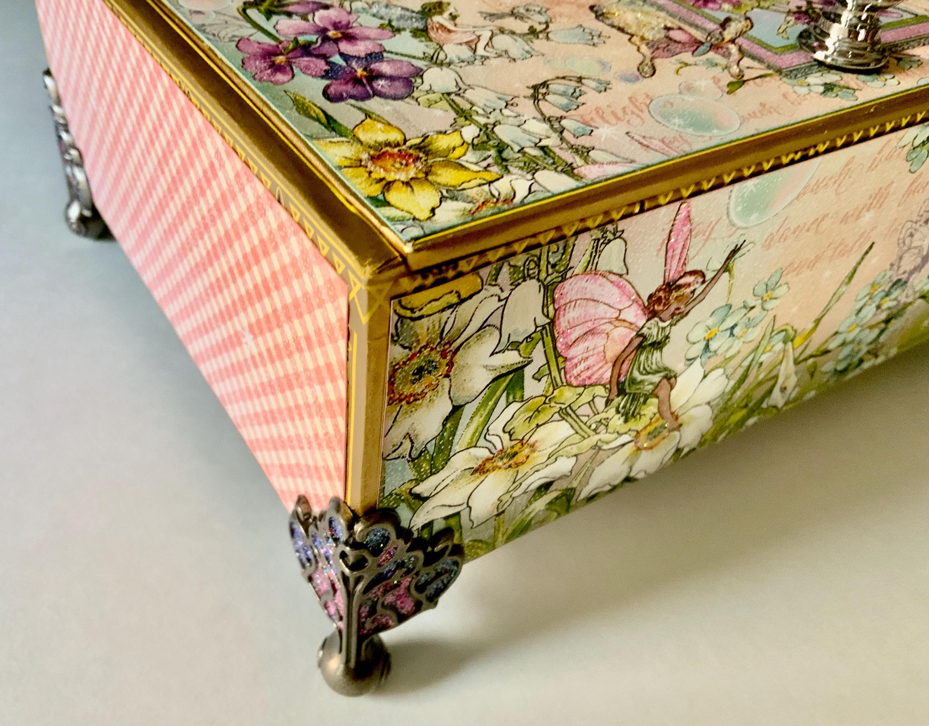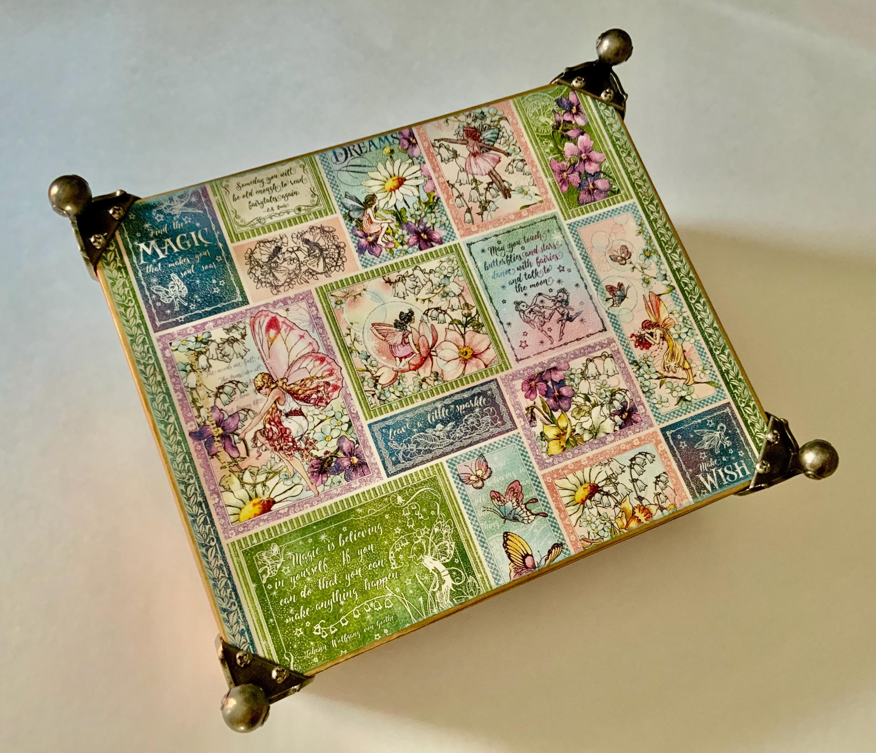 This handcrafted box captures the joy of spring and the sparkle of fairy tales. Decorated with Graphic 45’s “Fairie Wings” paper, it features soft florals, floating fairies, pastel butterflies, and bubble-kissed scenes. Topped with a faceted pink jewel knob, it’s a charming storage piece and magical gift for anyone enchanted by whimsy and wonder.