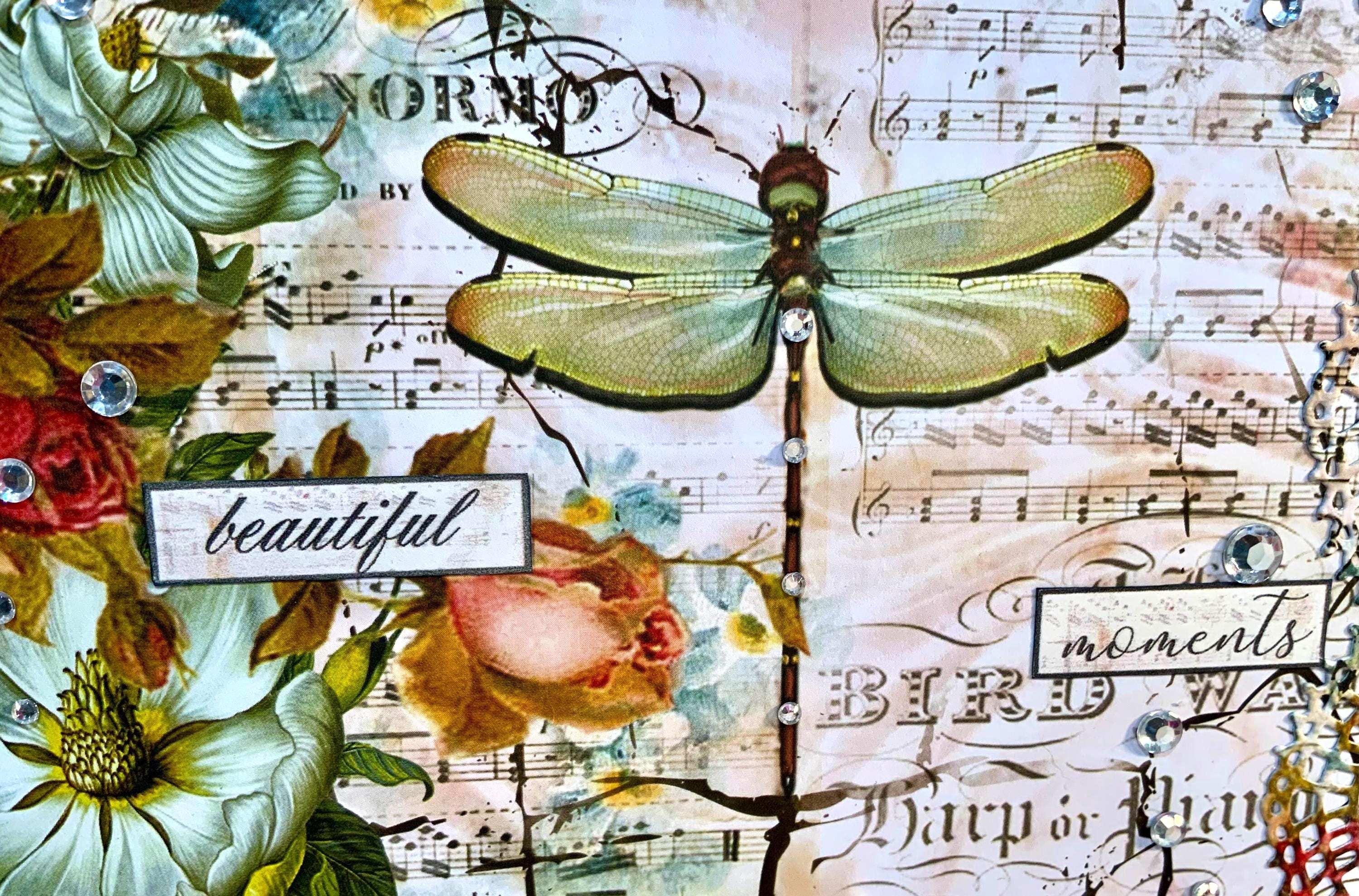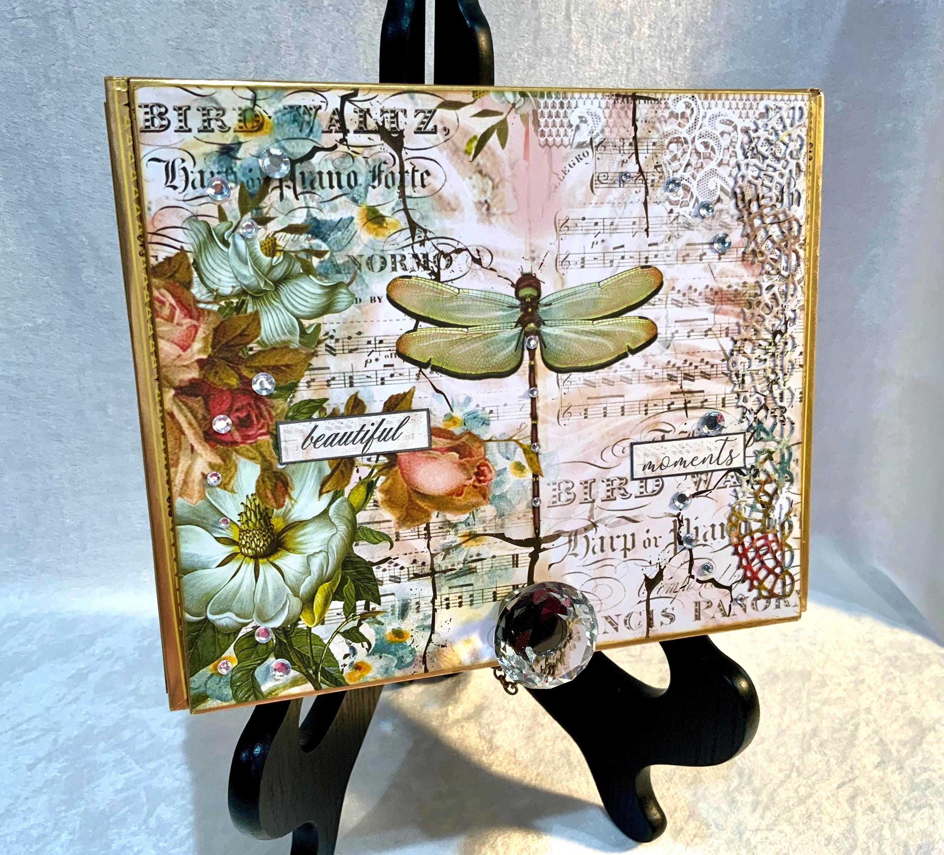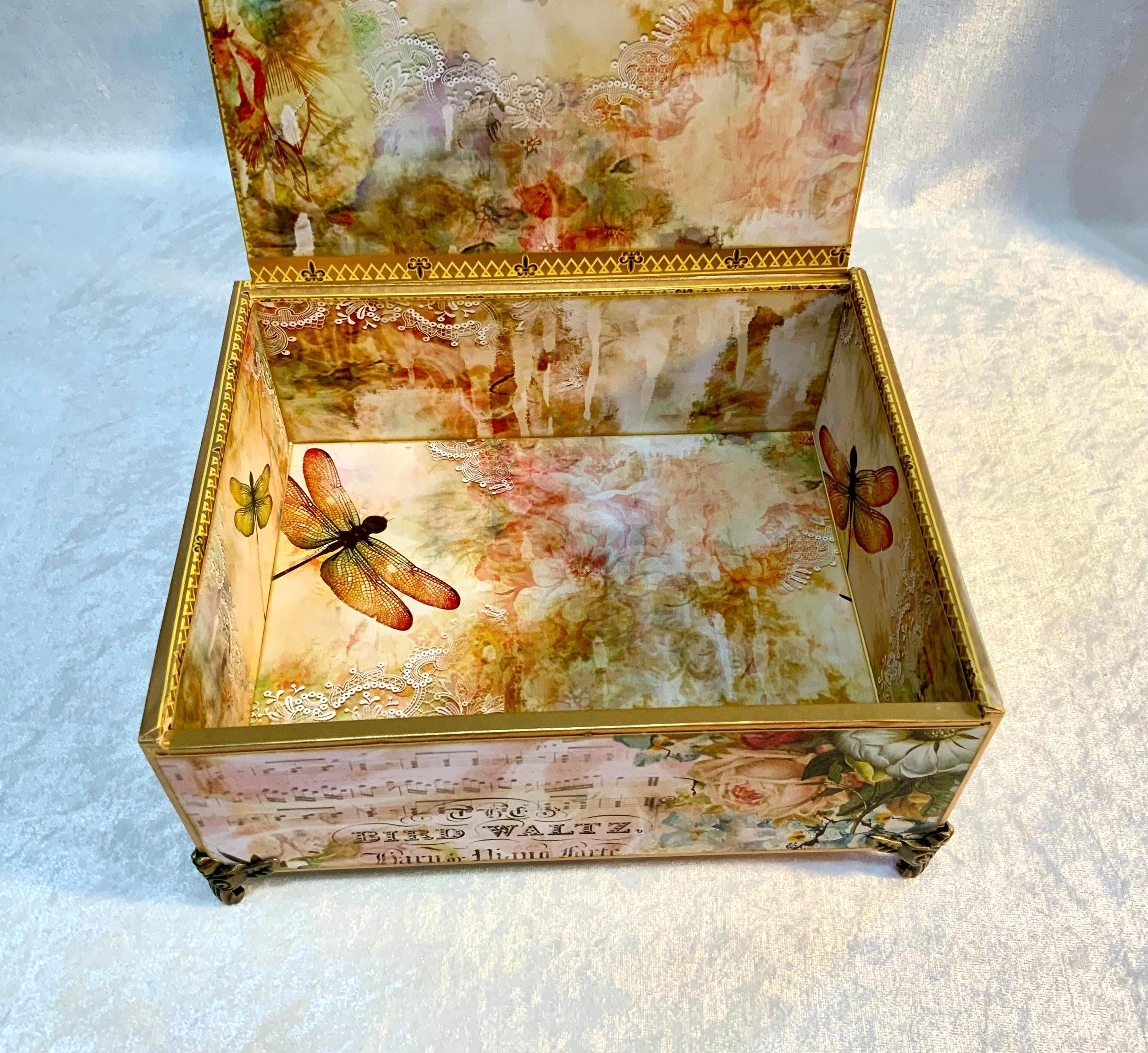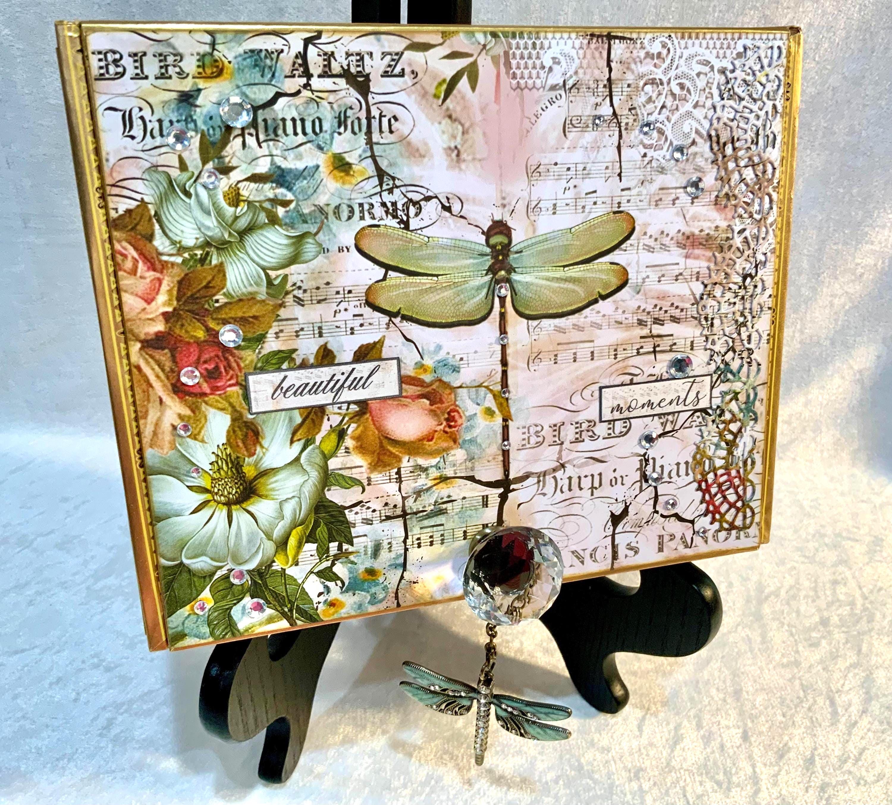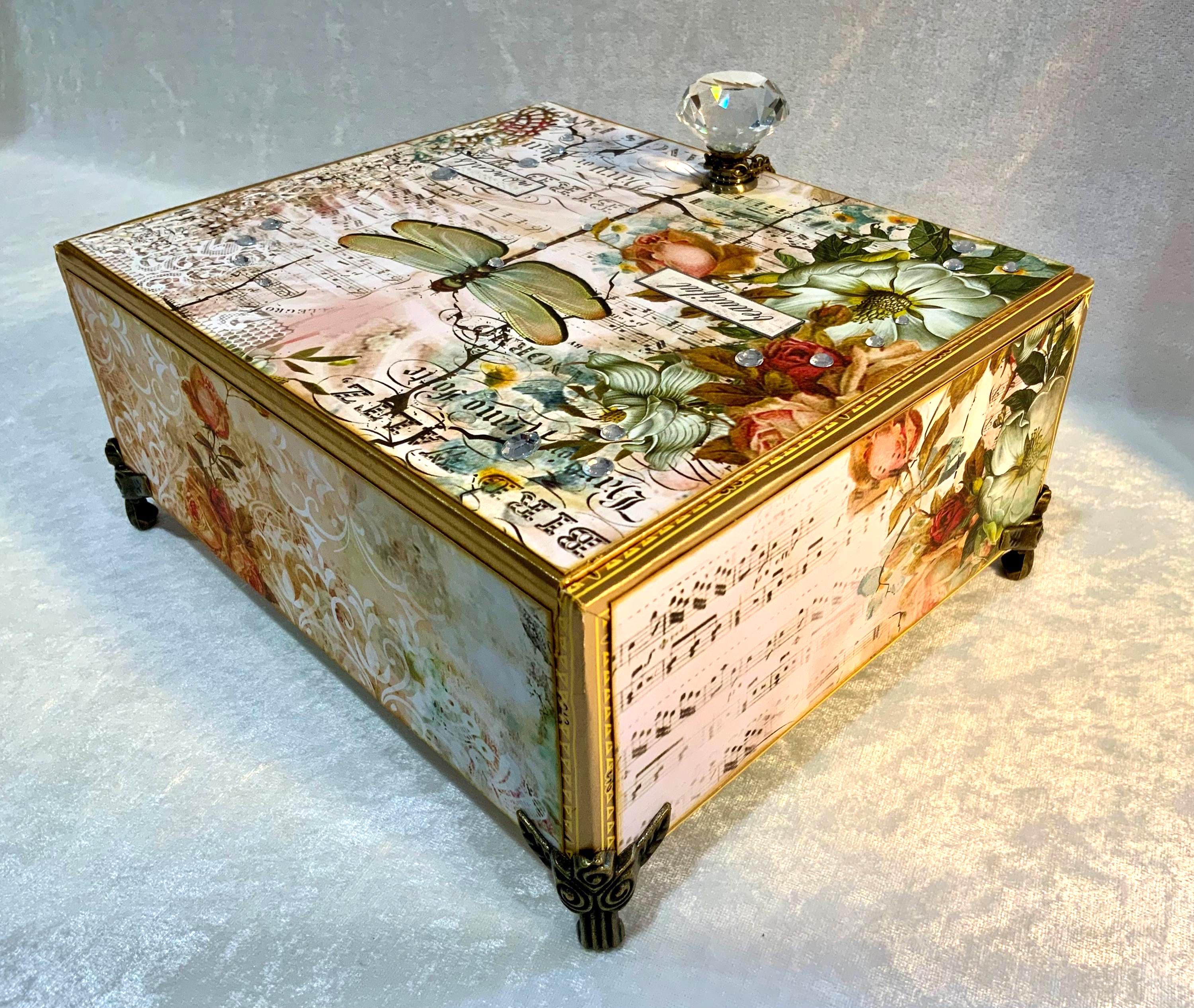This romantic keepsake box is part of my bestselling series, featuring elegant dragonfly art from Blue Fern Studios. The design is layered with soft florals, vintage music script, and a delicate dragonfly charm suspended from a sparkling crystal knob.
