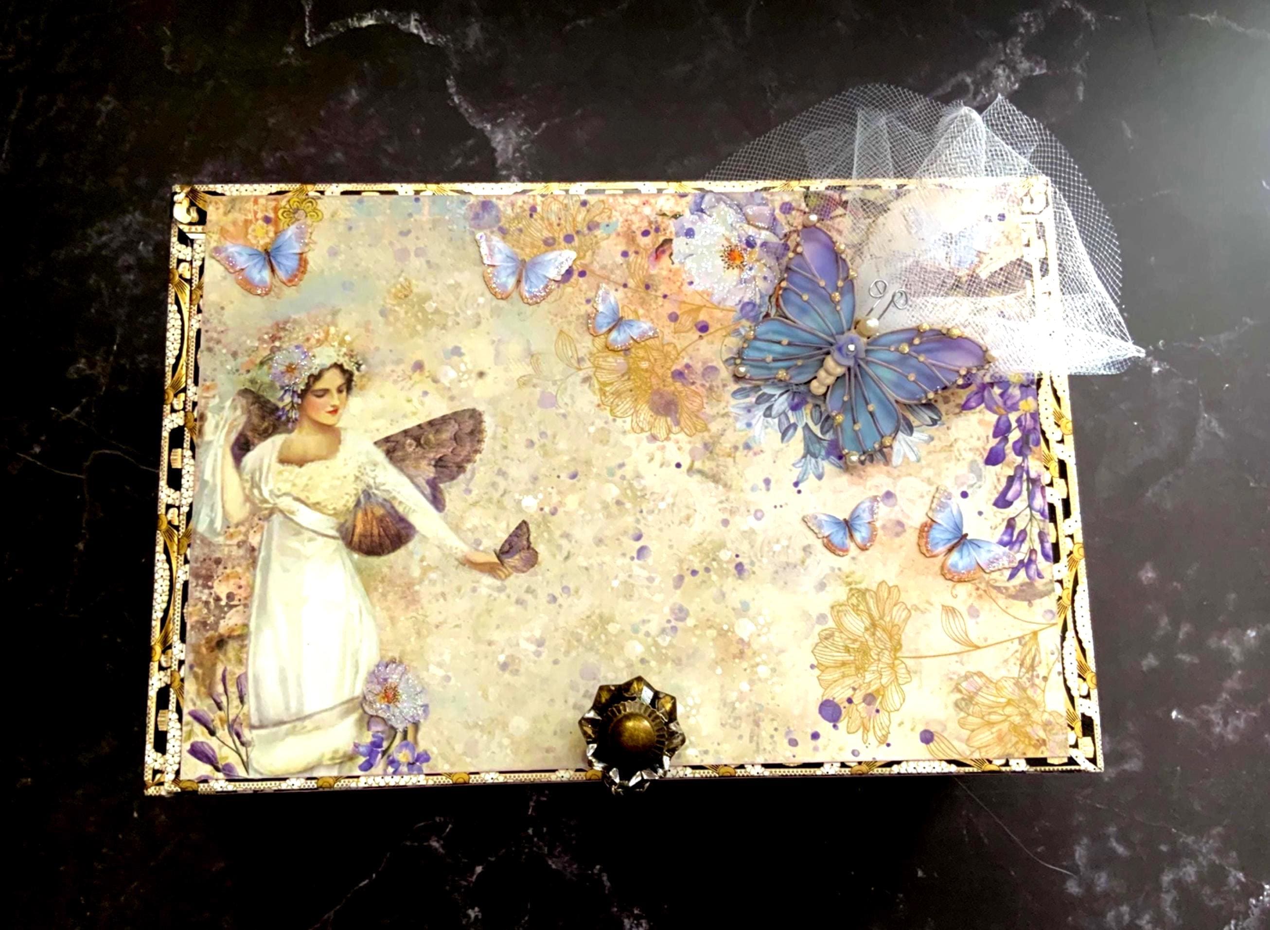 Step into an enchanting world of butterflies, fairies, and soft pastel magic with this one-of-a-kind keepsake box. Created using Fairy Whispers by Blue Fern Studios, this piece features layered imagery, shimmering details, and a fantasy-inspired charm set.