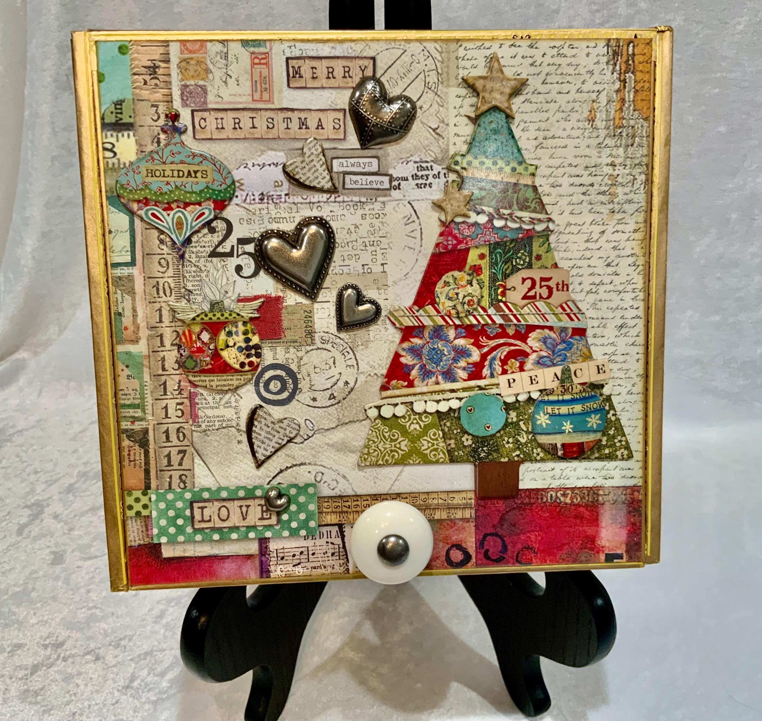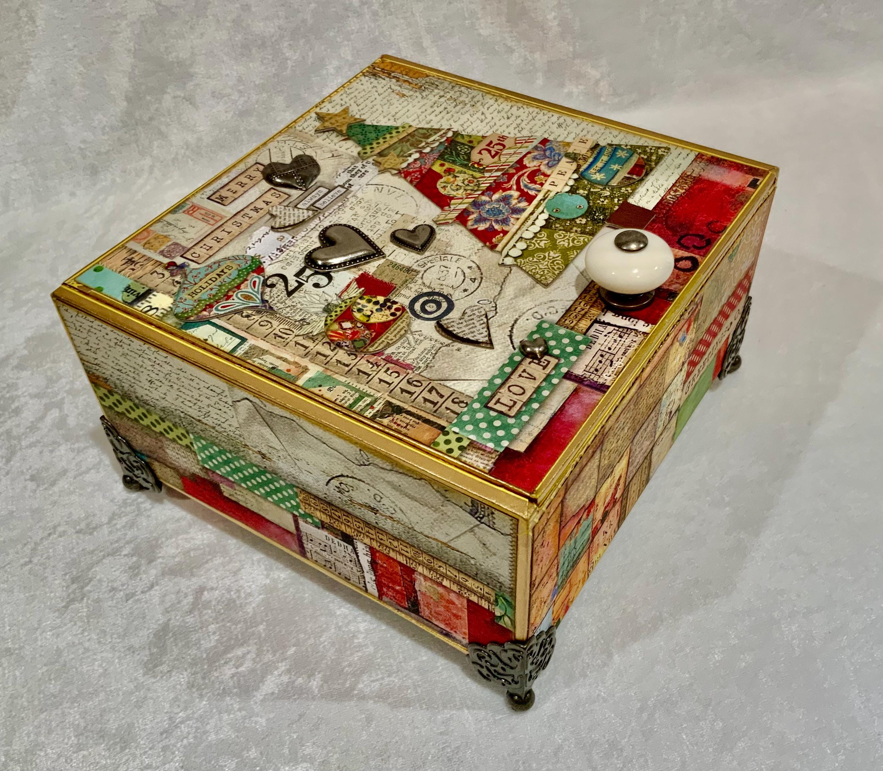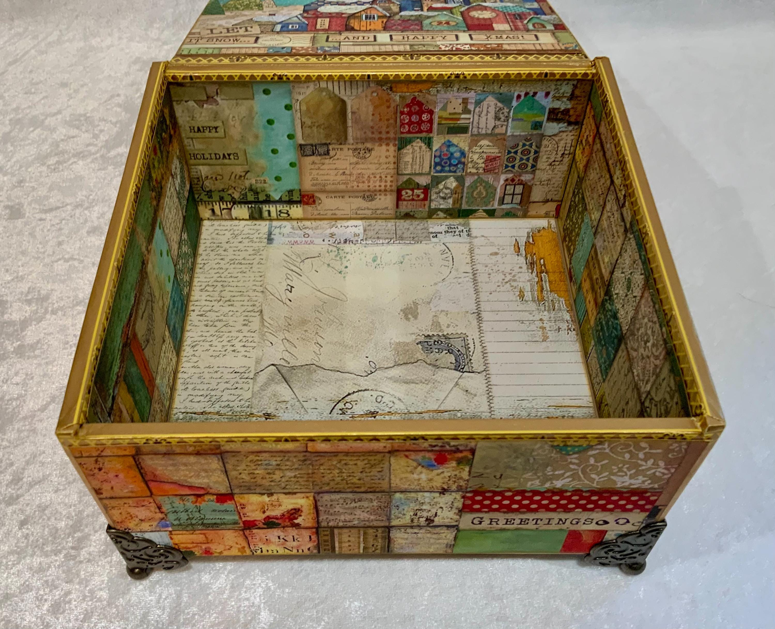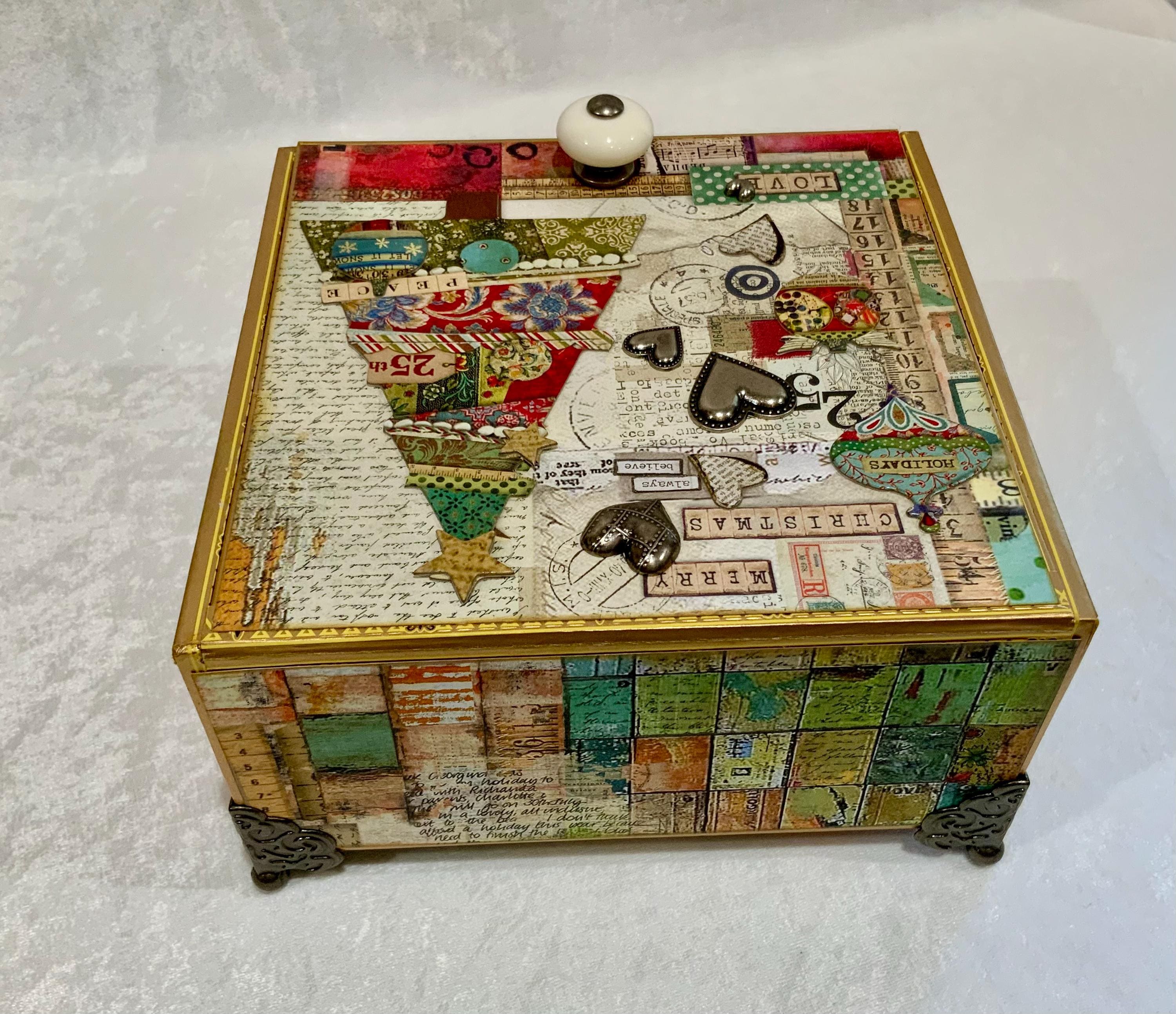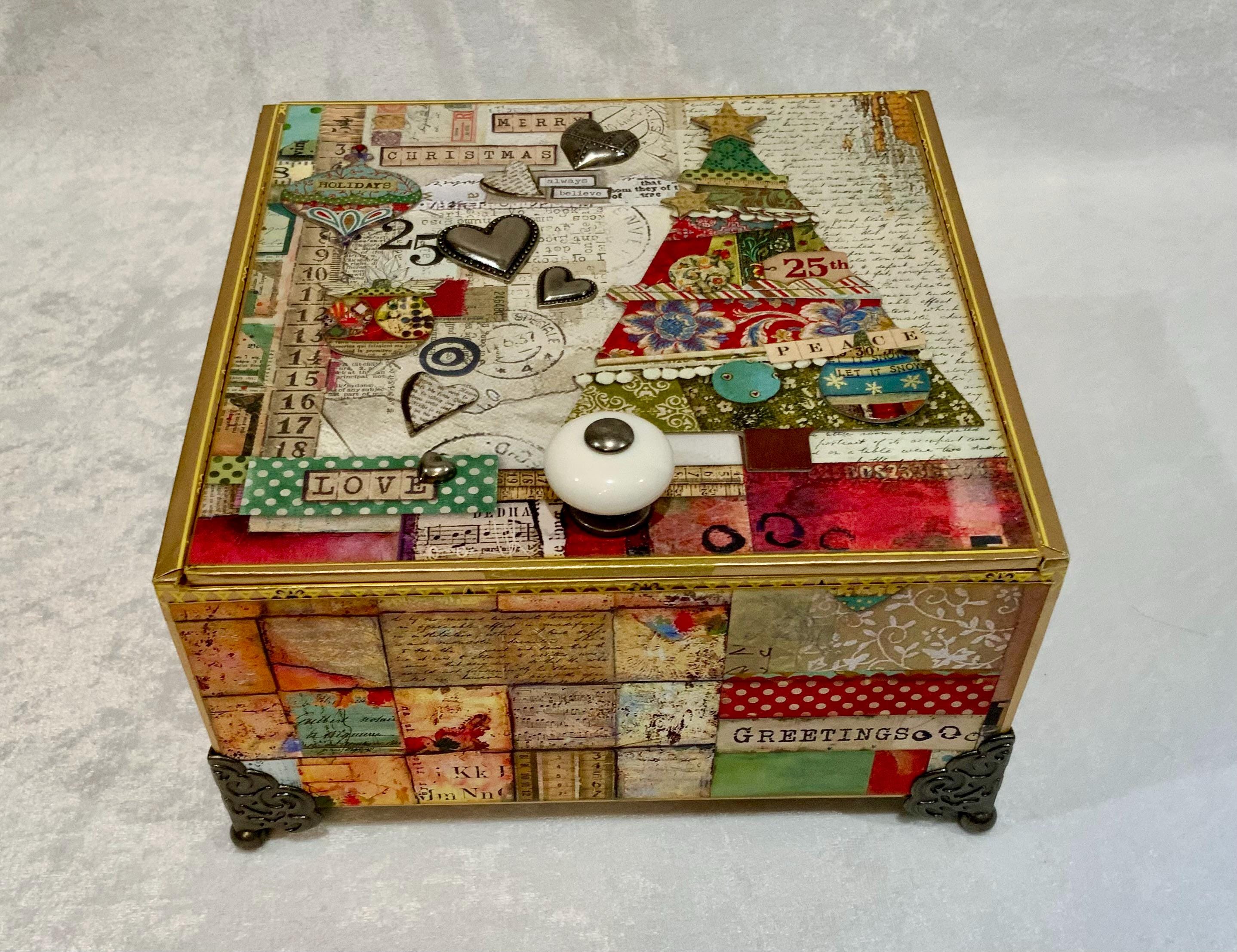 Bring the magic of Christmas to your home with this one-of-a-kind decorated cigar box featuring Stamperia’s Patchwork Christmas paper collection. This upcycled wooden cigar box has been transformed into a festive keepsake, perfect for holiday gifting, memory keeping, or unique seasonal decor.