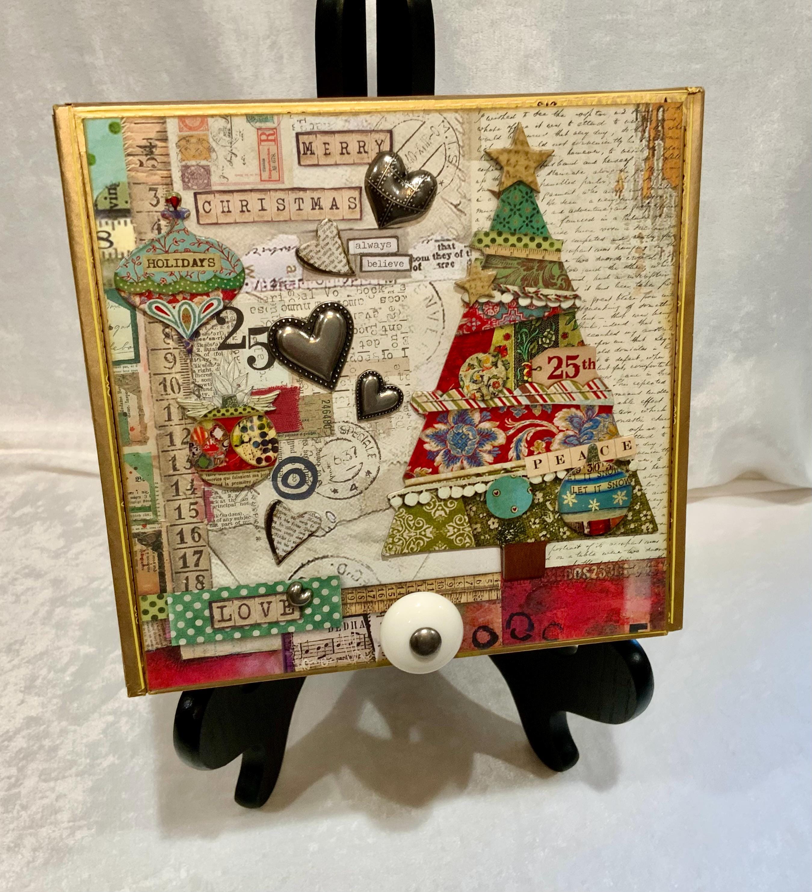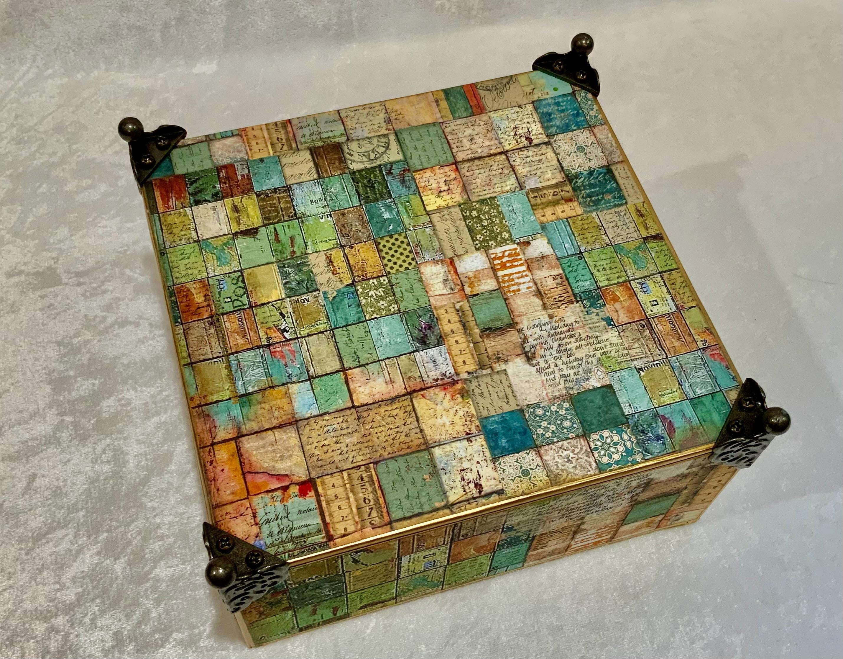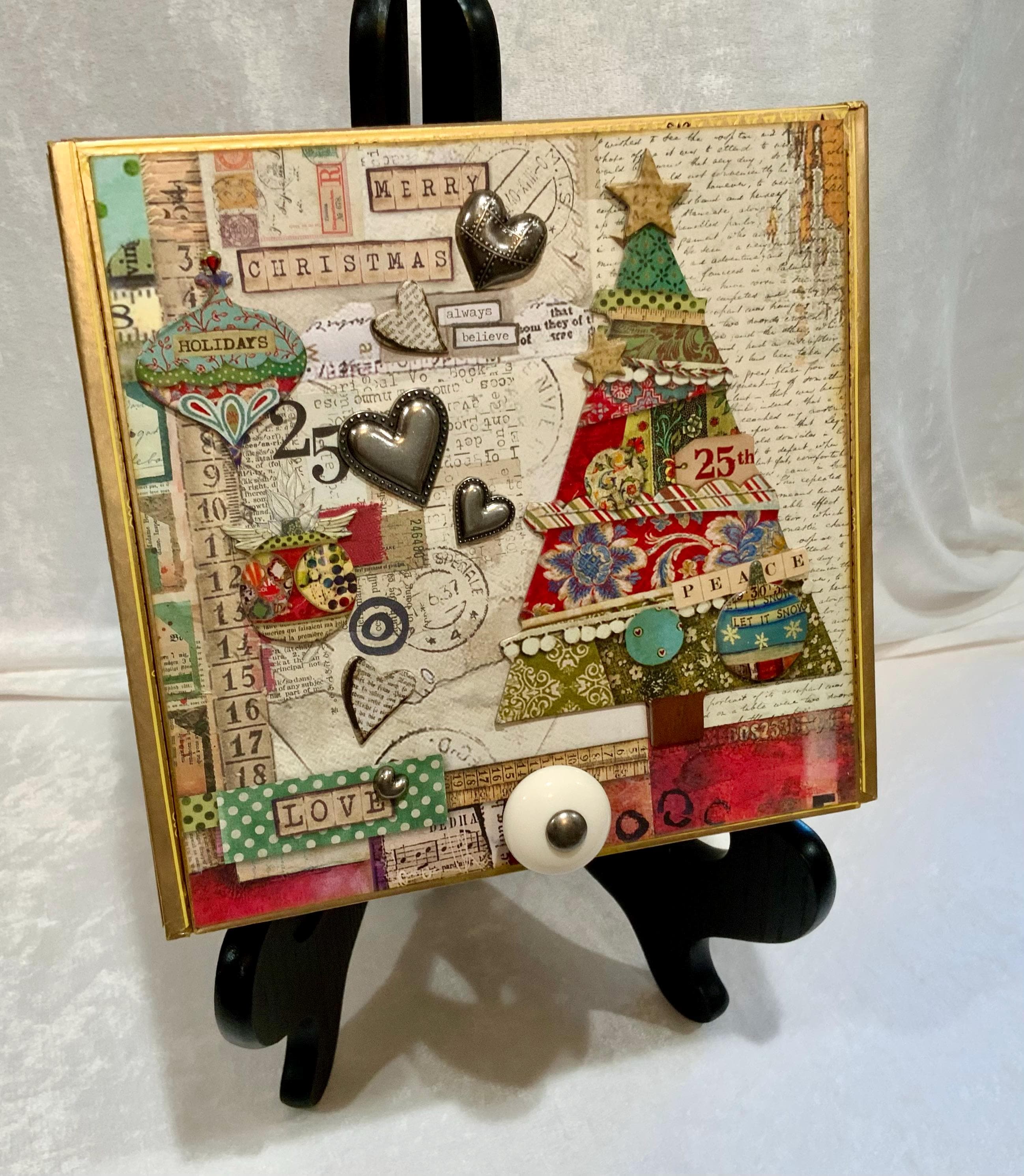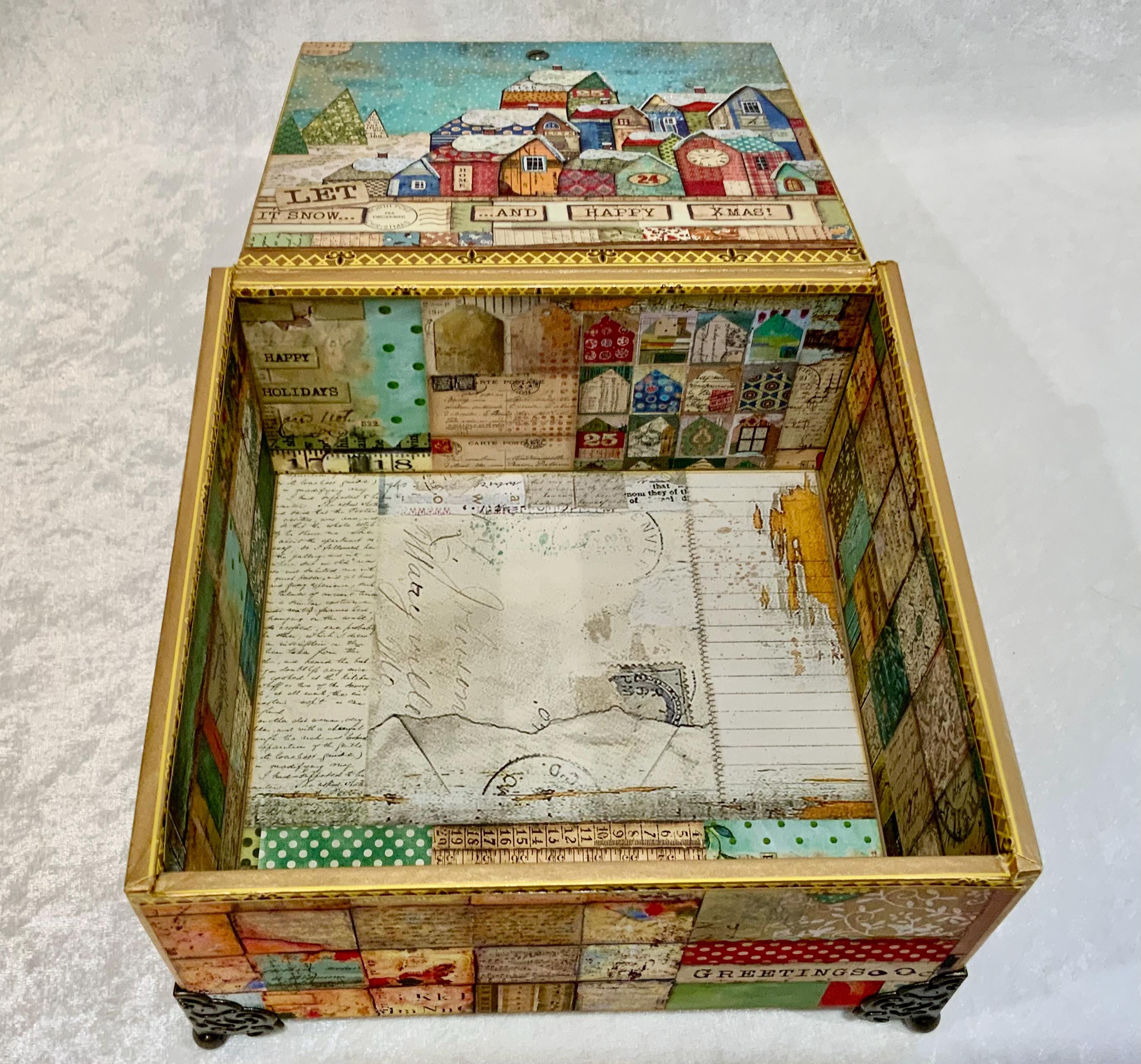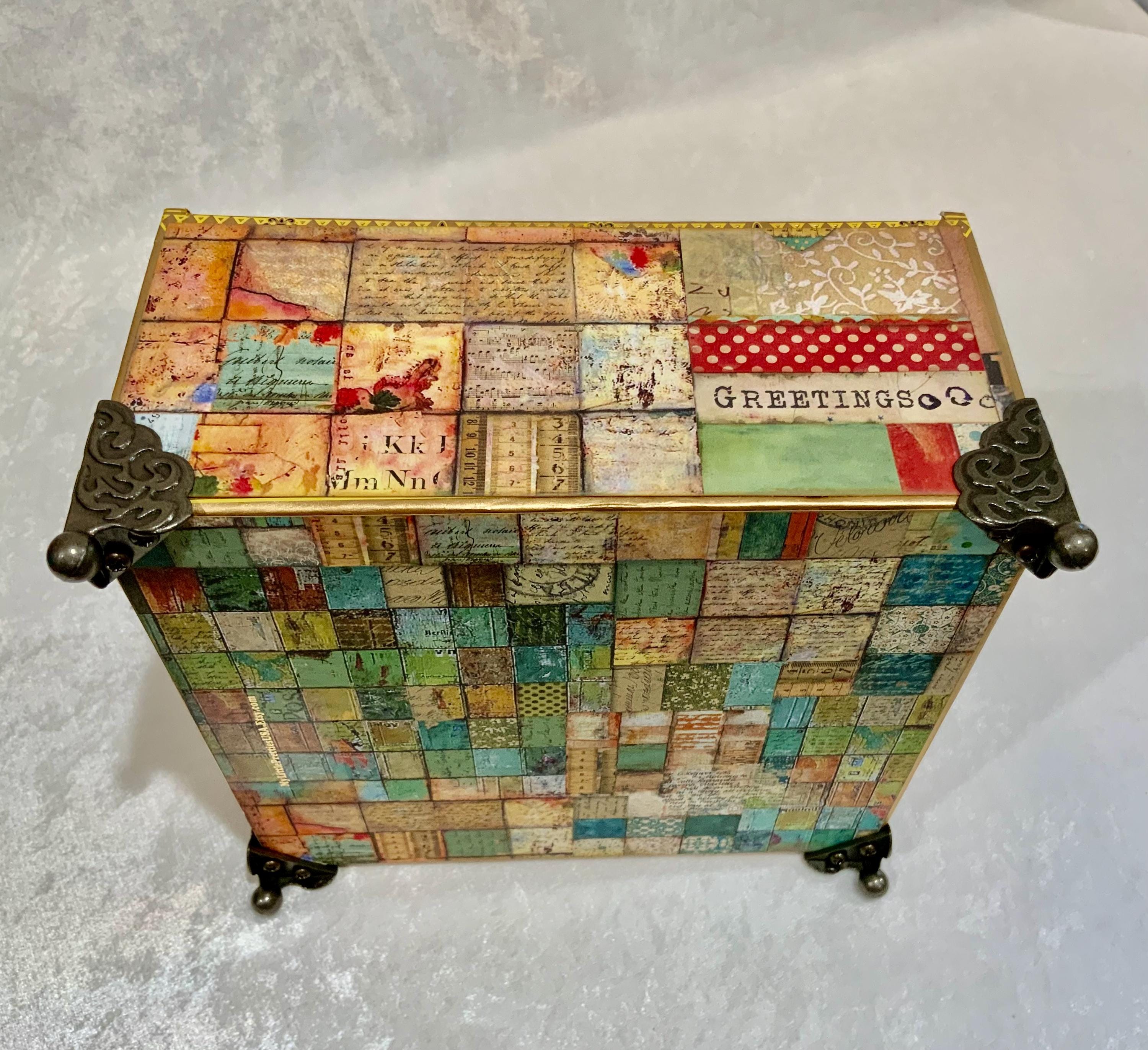 Bring the magic of Christmas to your home with this one-of-a-kind decorated cigar box featuring Stamperia’s Patchwork Christmas paper collection. This upcycled wooden cigar box has been transformed into a festive keepsake, perfect for holiday gifting, memory keeping, or unique seasonal decor.