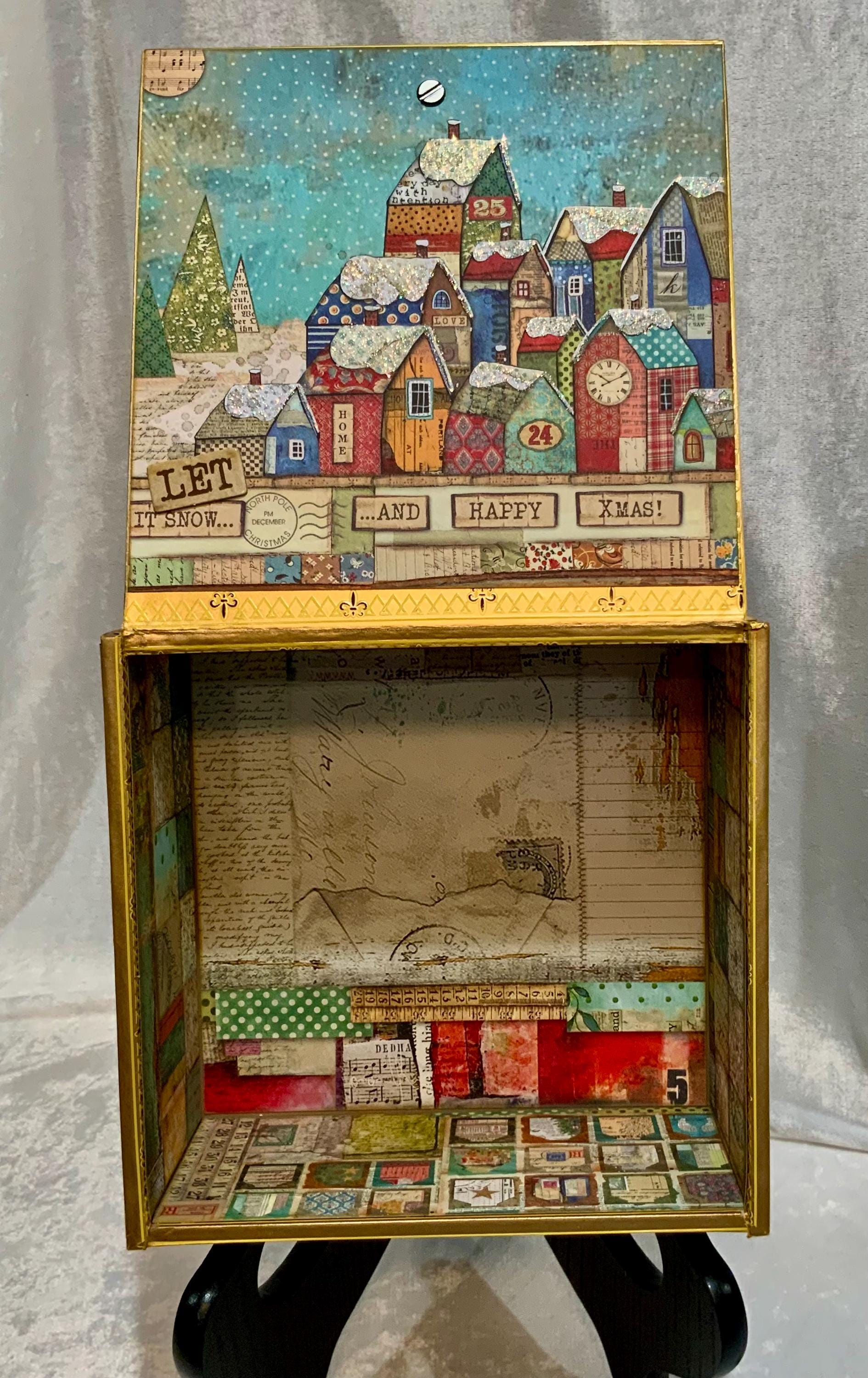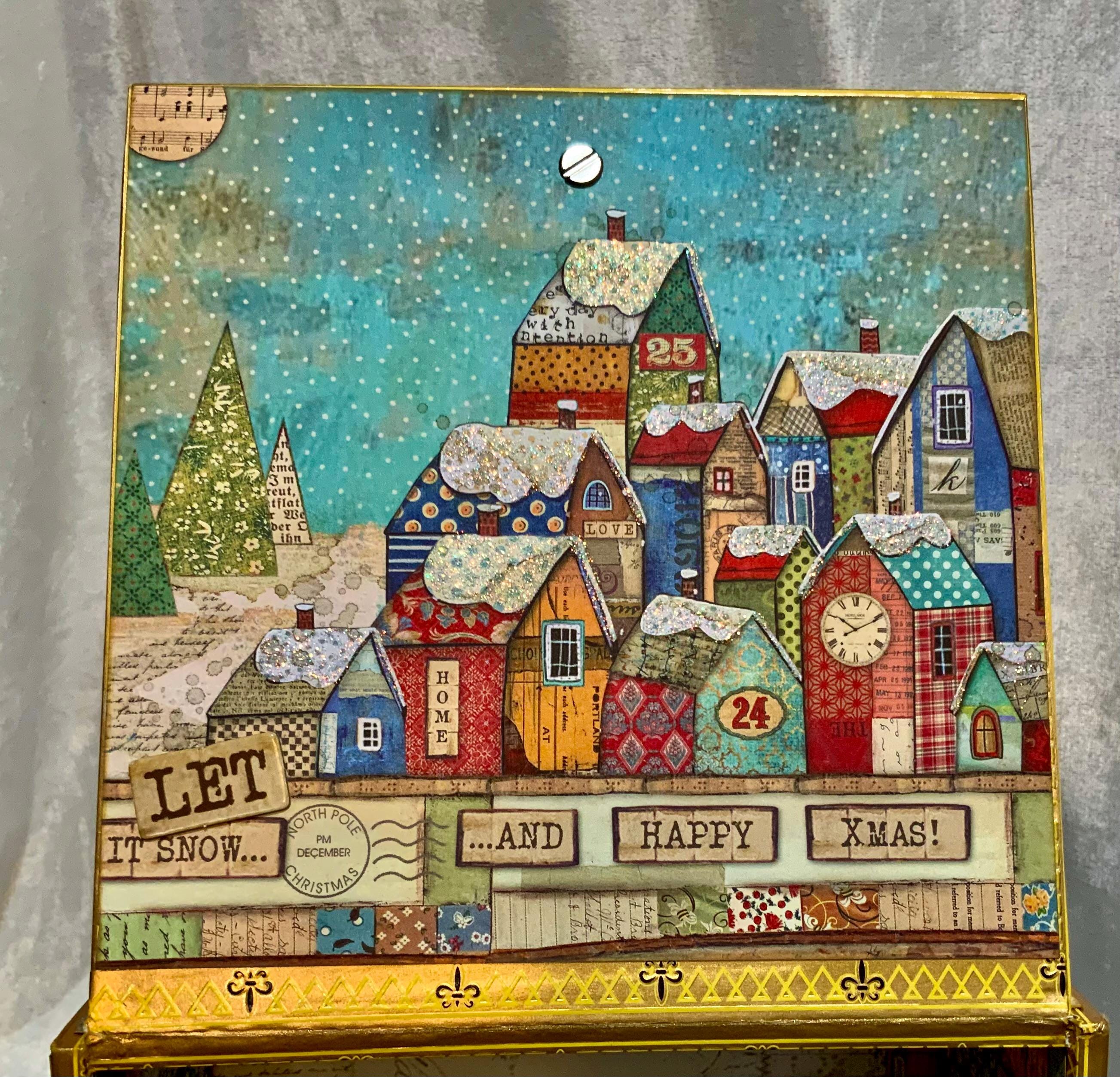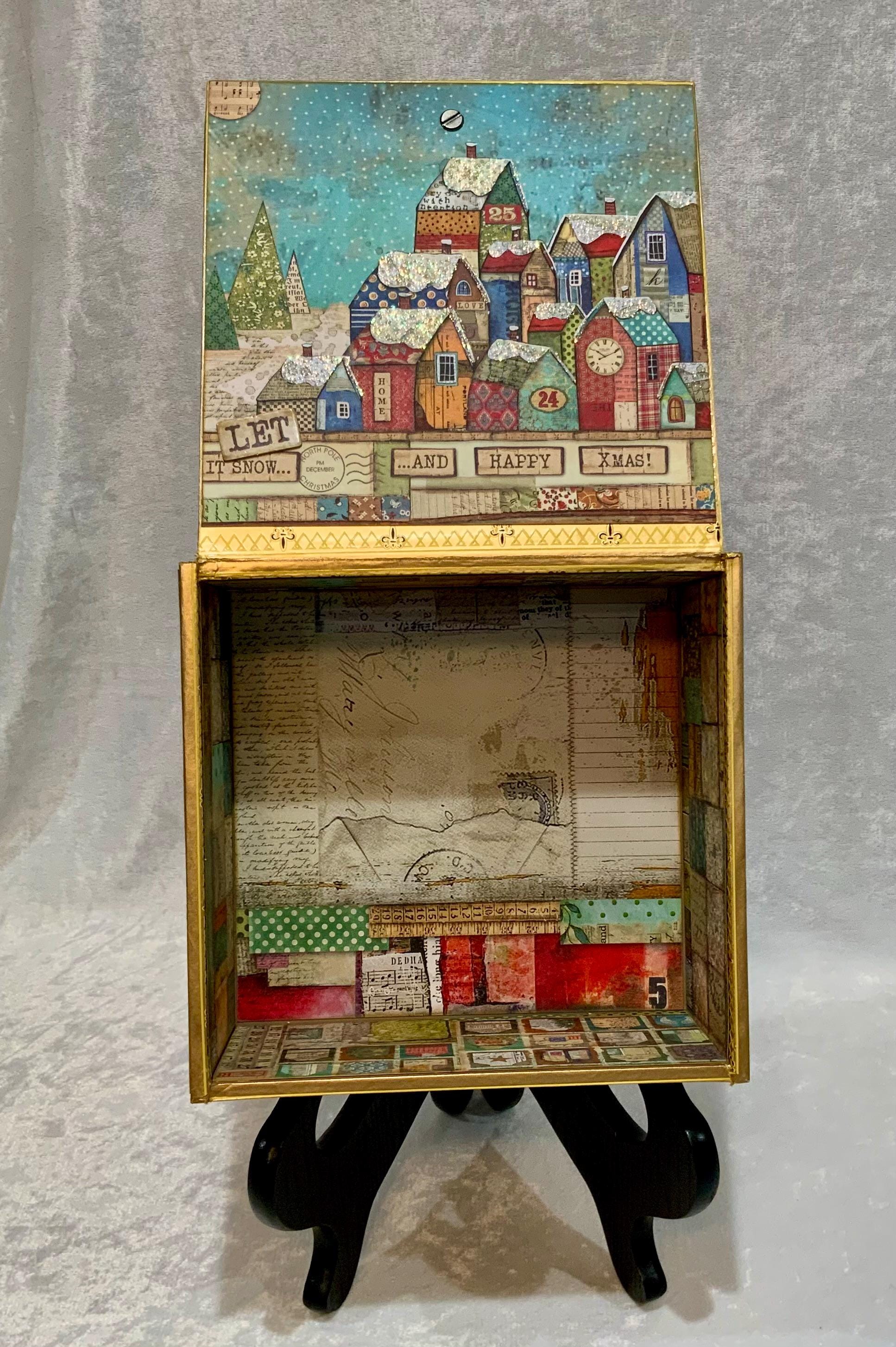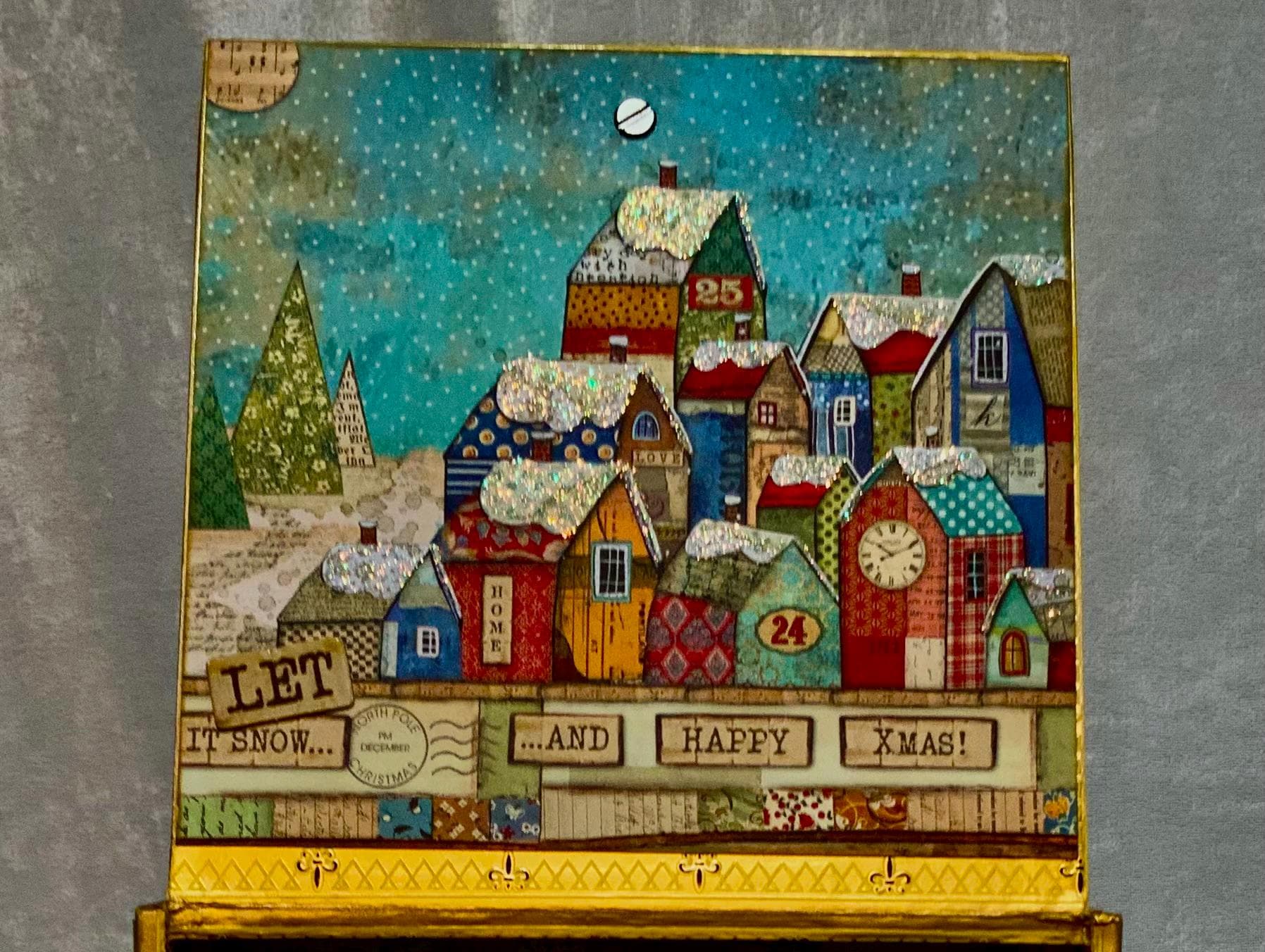 The lid showcases a handcrafted Christmas tree made from patchwork-style holiday prints, layered with dimensional embellishments like metal hearts, pearls, and sentiment tiles reading “LOVE,” “PEACE,” and “25th.” Inside, you’ll find a snowy village scene with charming houses numbered for Christmas Eve and Day, along with joyful illustrations of angels, ornaments, and the word “Noel.”