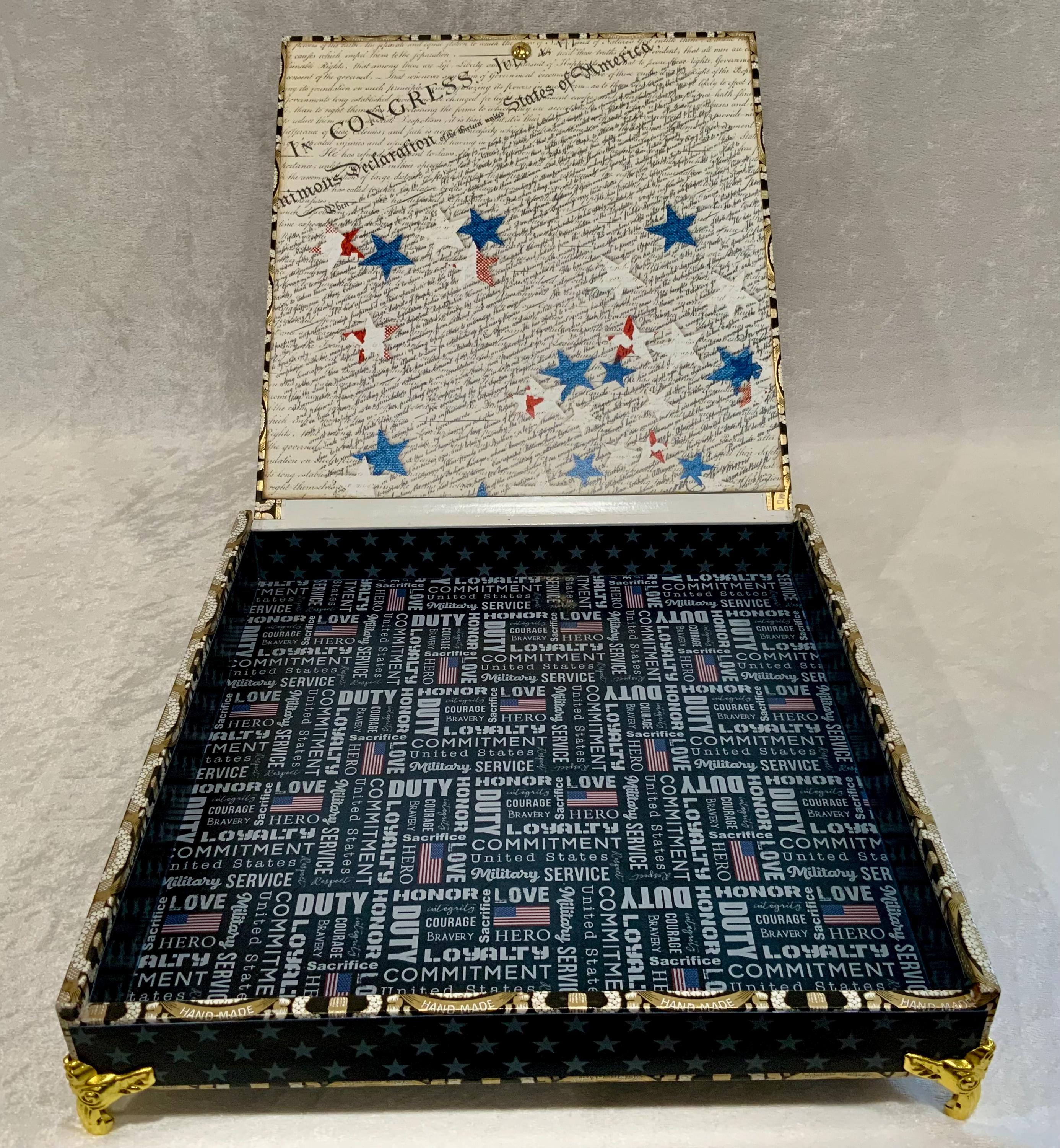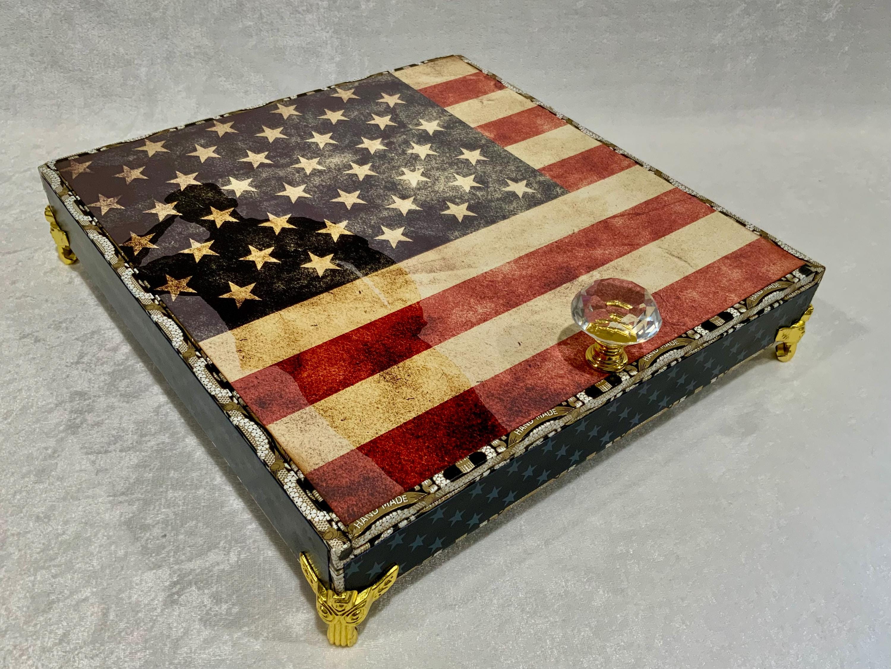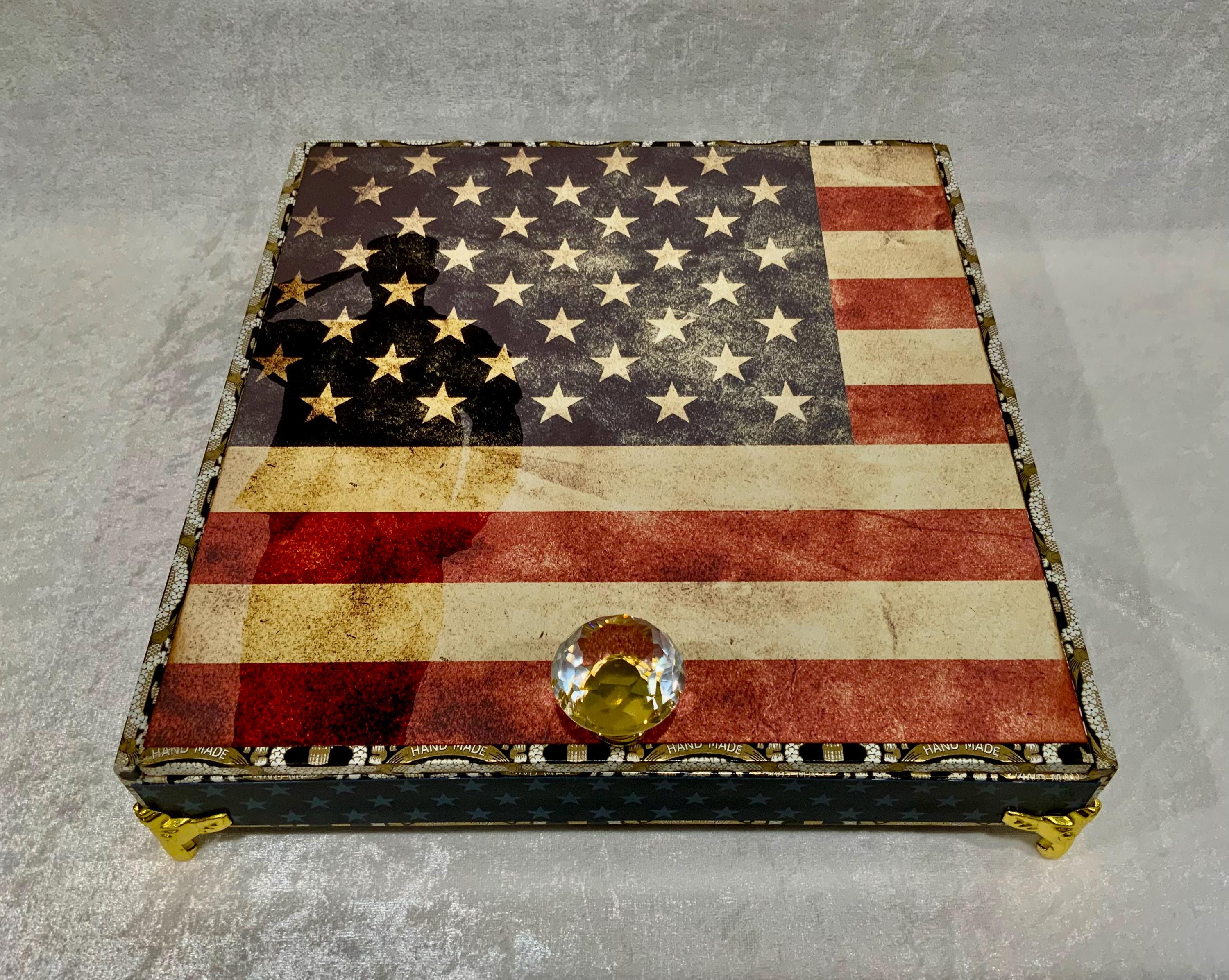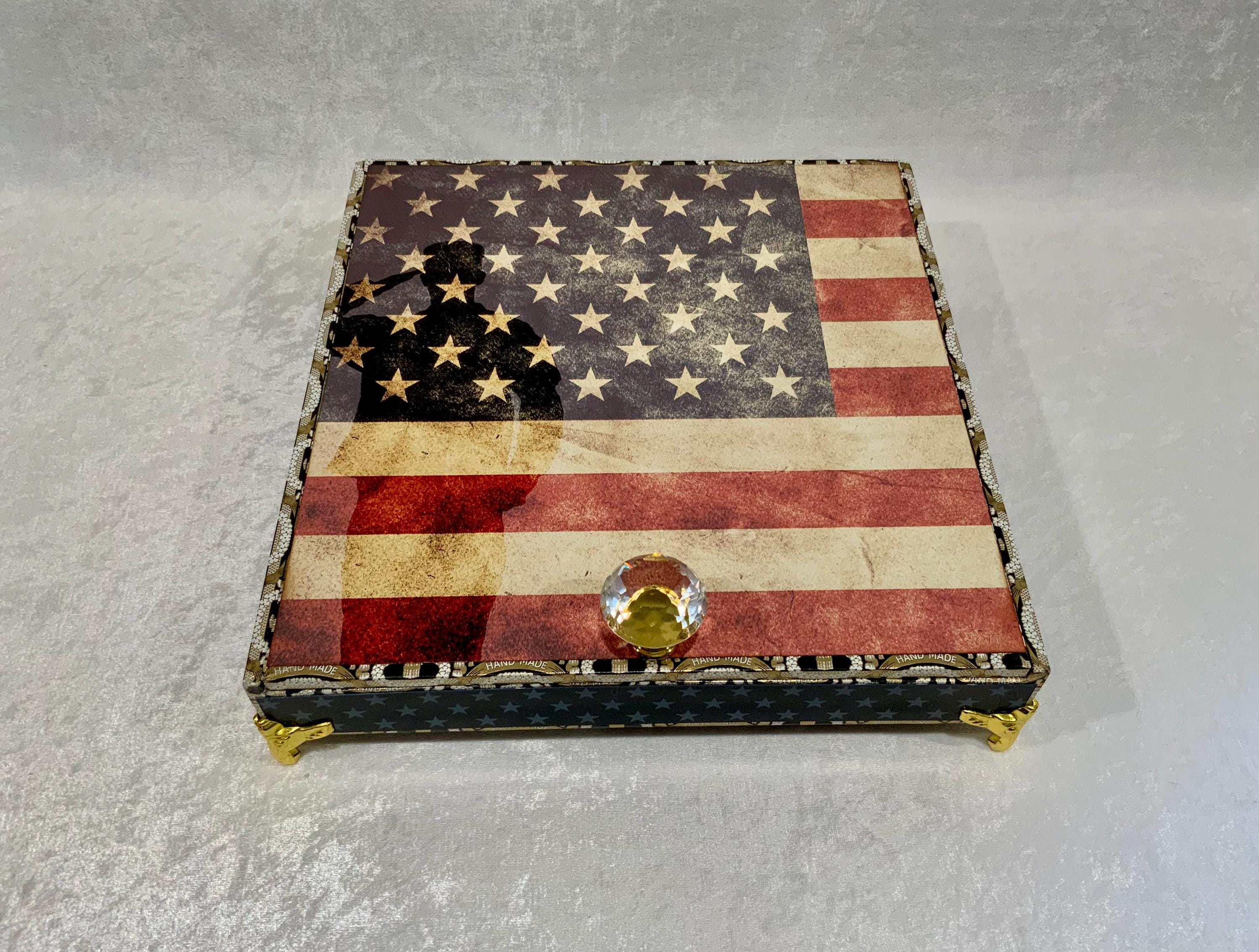 The exterior lid features a bold soldier silhouette layered over a distressed American flag, creating a meaningful and timeless statement piece. The sides are wrapped in coordinating star paper for a tailored, cohesive finish.
