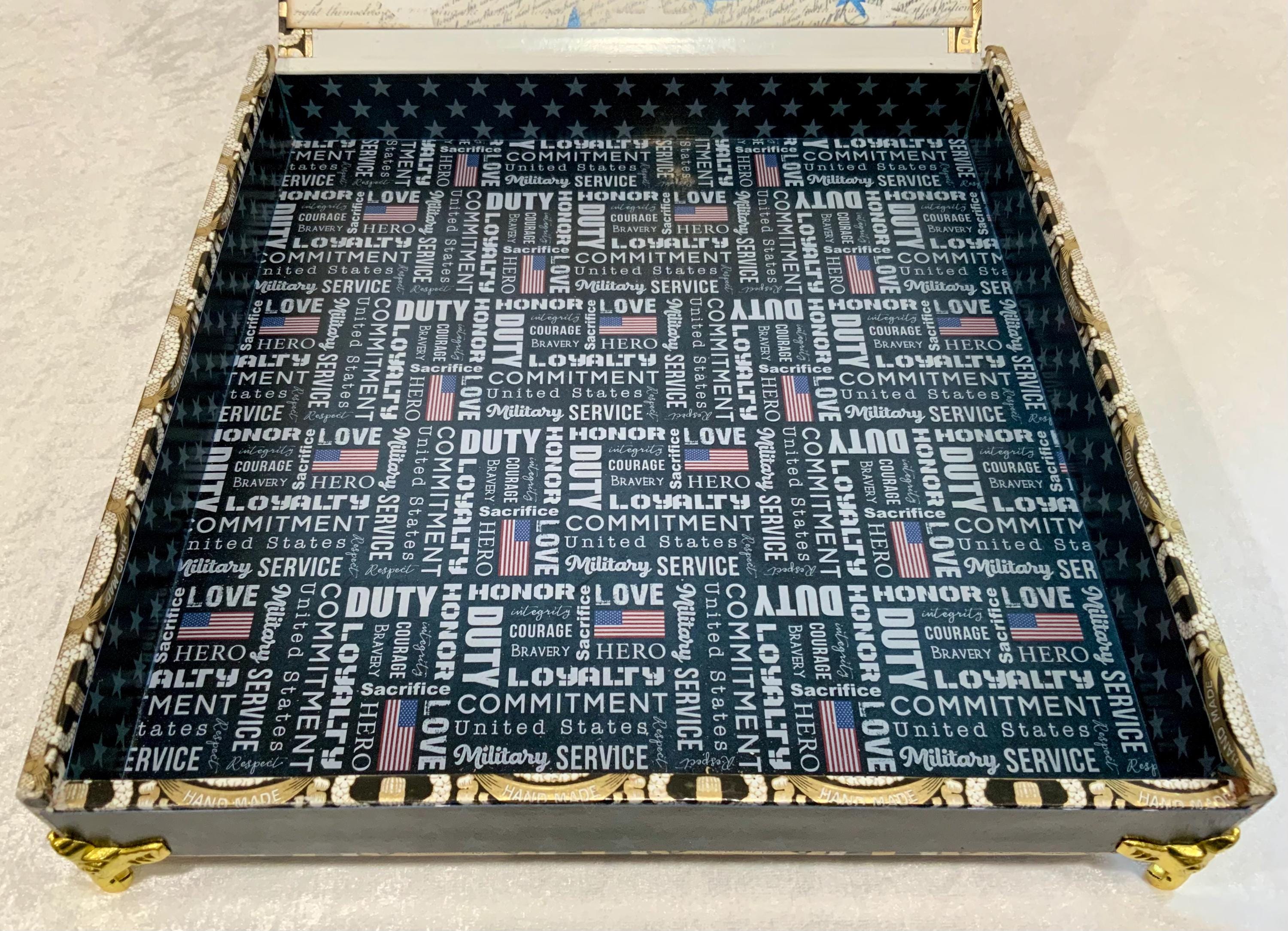 When opened, the inside lid reveals a historic Constitution-inspired design, while the interior base highlights powerful military values including Duty, Honor, Loyalty, Commitment, and Service.