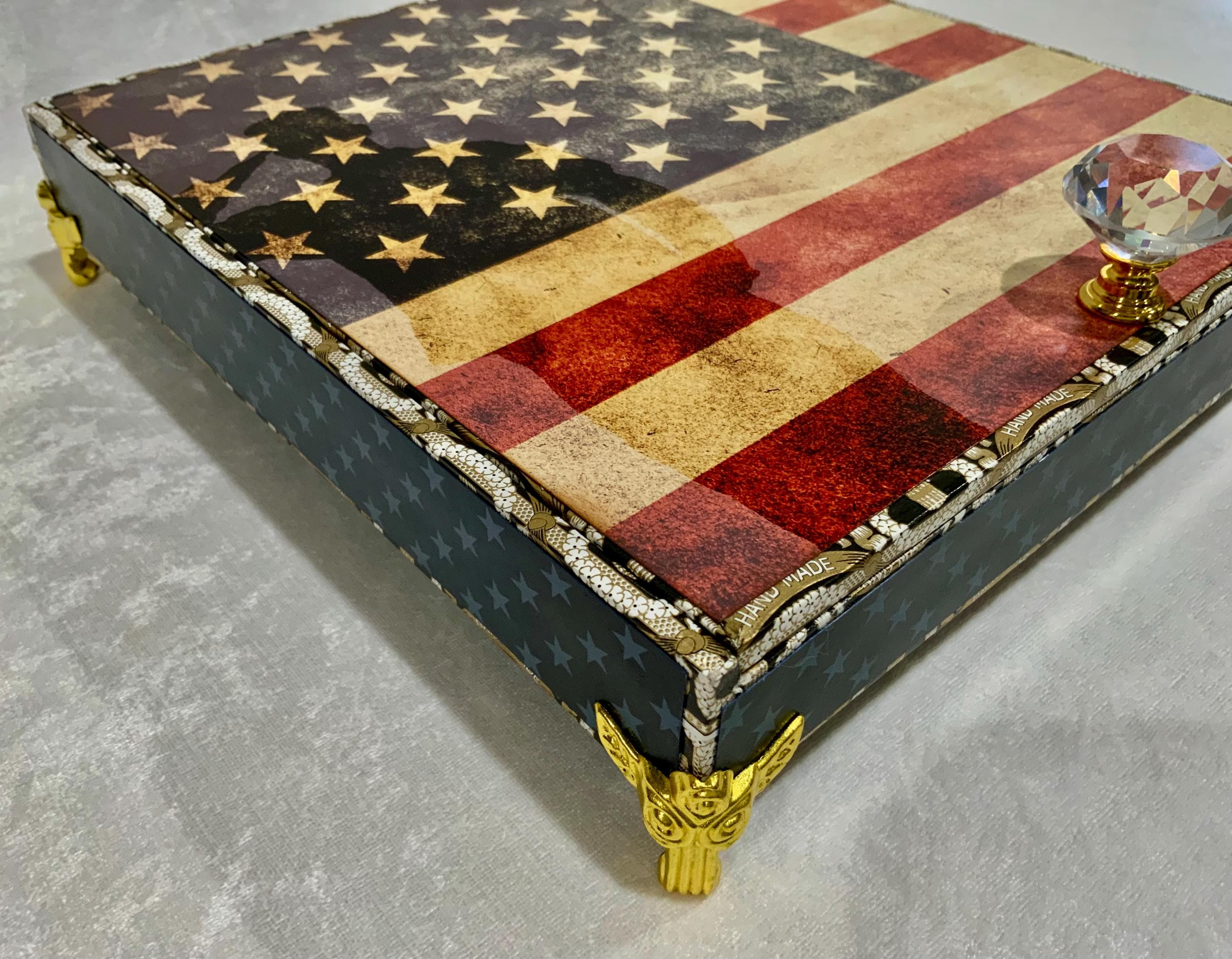 This box is constructed using a substantial Arturo Fuente wooden cigar box base and finished with intentionally selected upgraded hardware, including brass feet with antique finish and a faceted glass knob with gold base for a refined presentation.