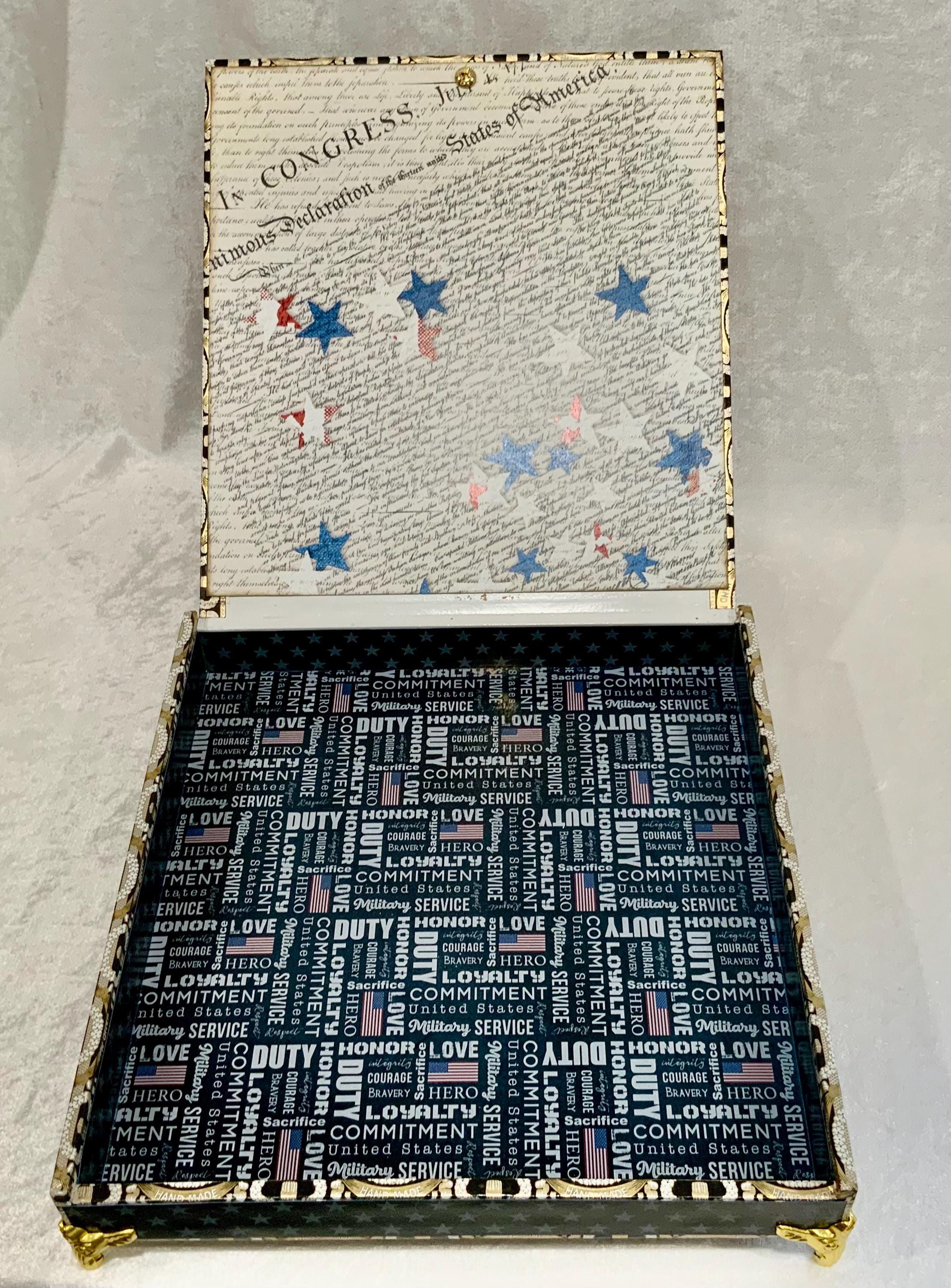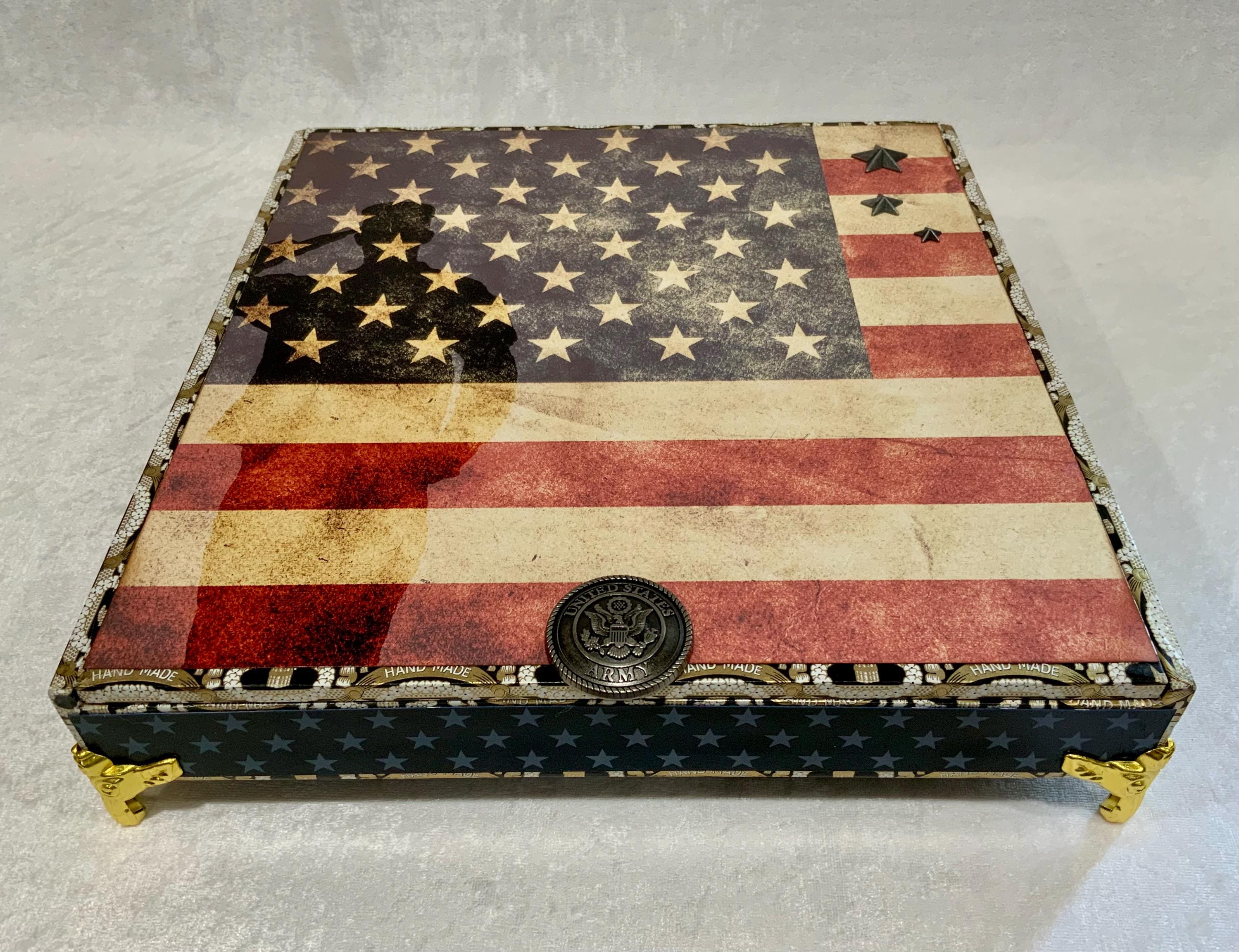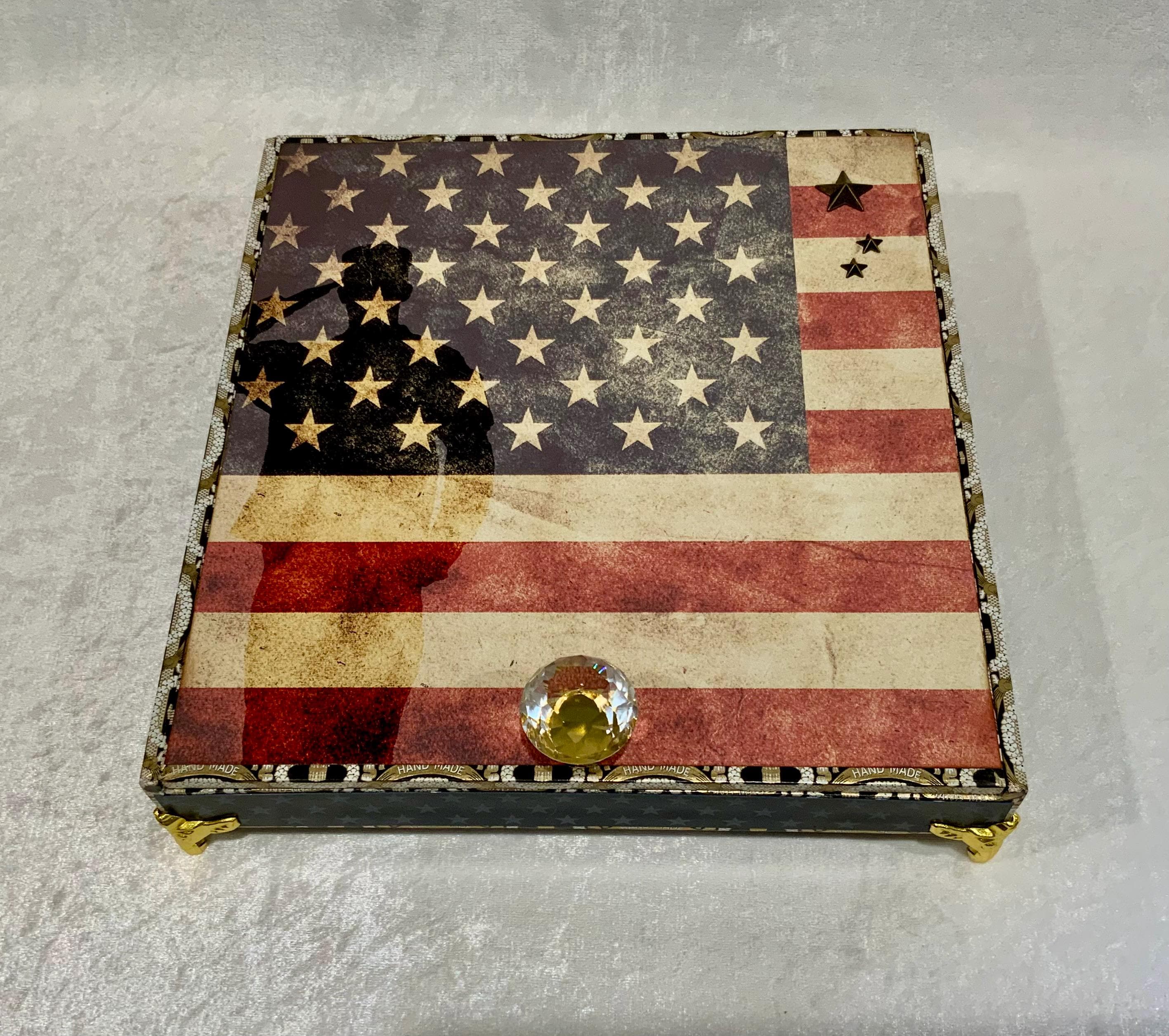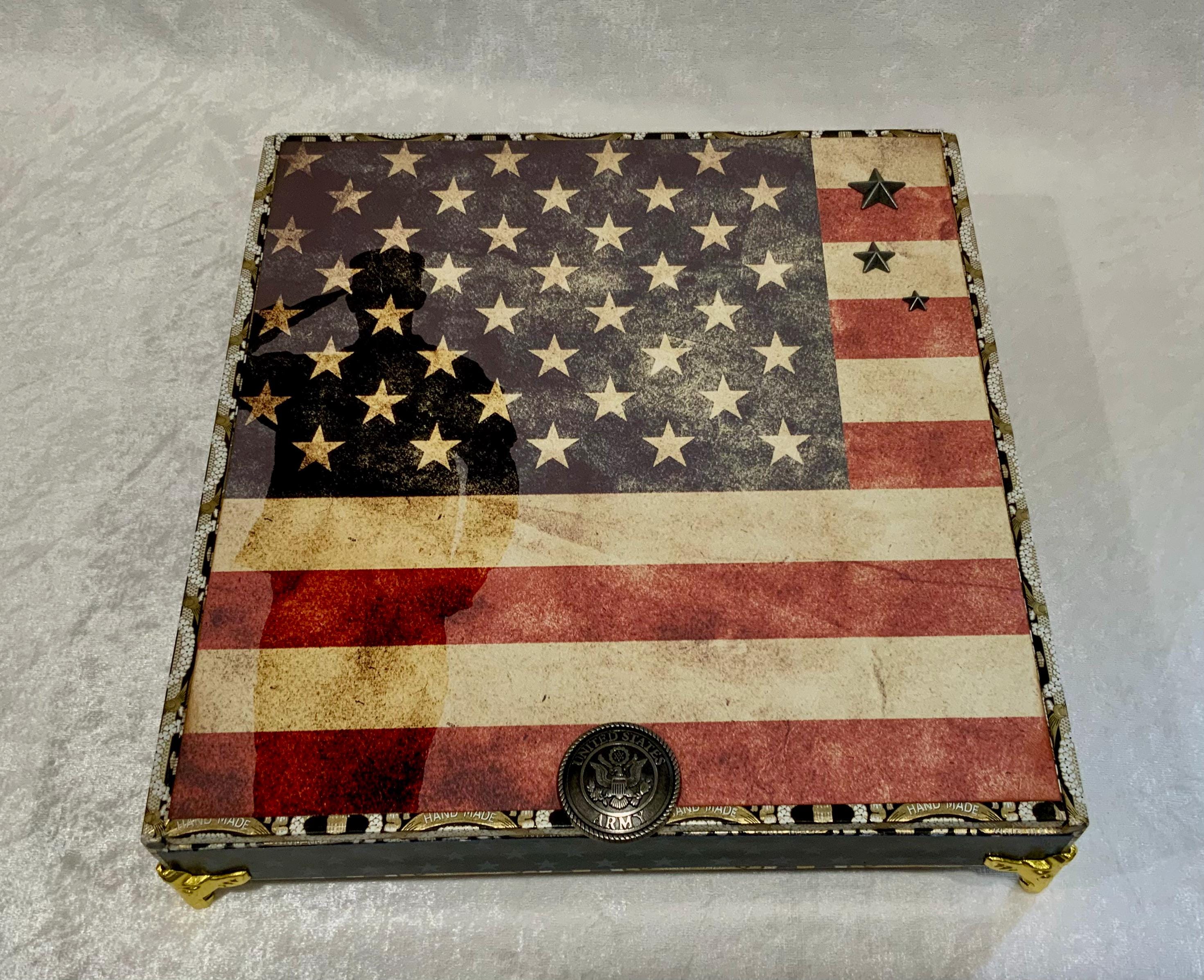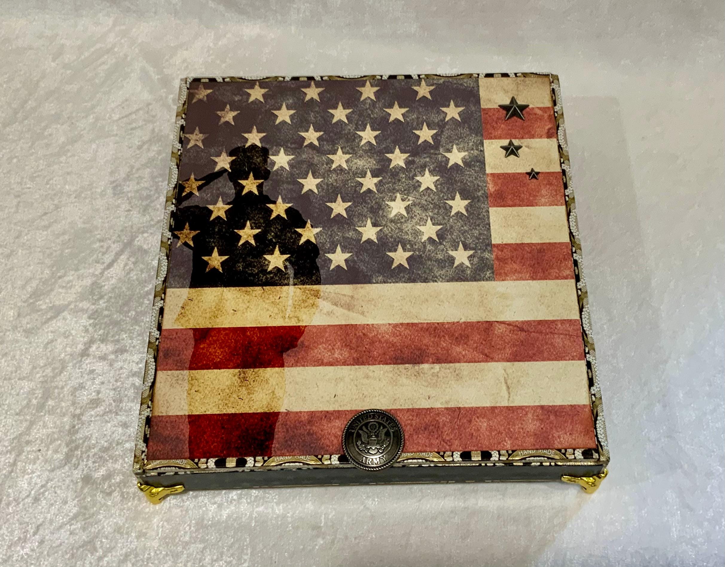 The exterior lid features a bold soldier silhouette layered over a distressed American flag, creating a meaningful and timeless statement piece. The sides are wrapped in coordinating star paper for a tailored, cohesive finish.