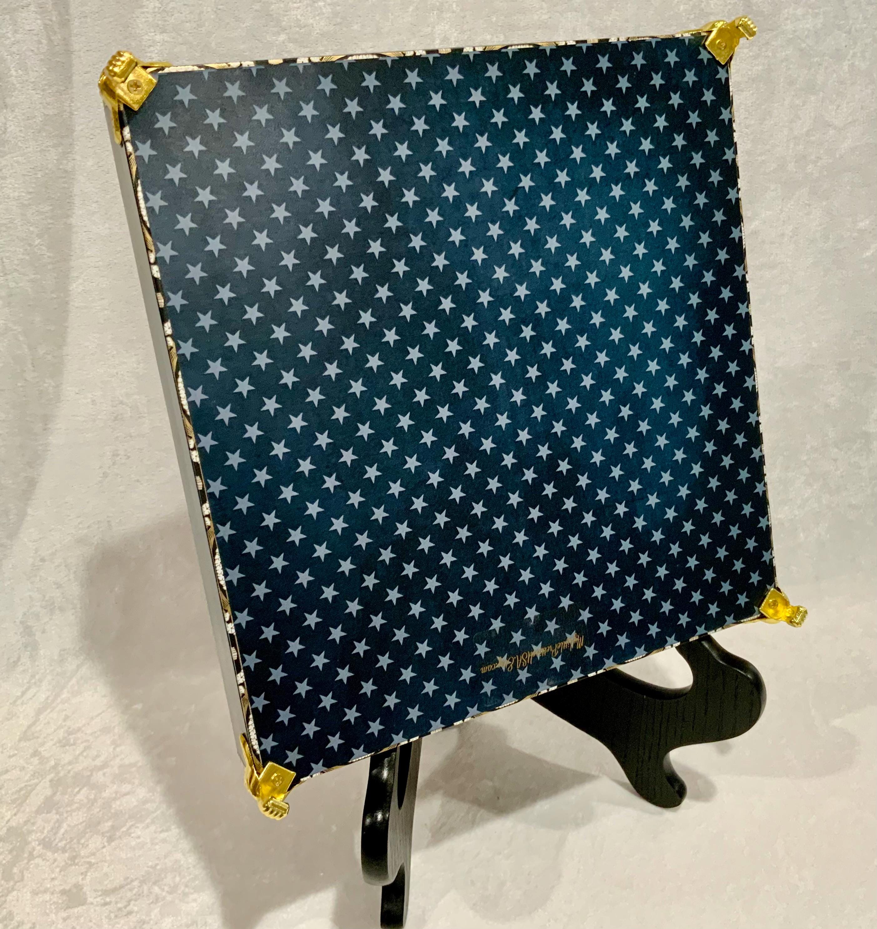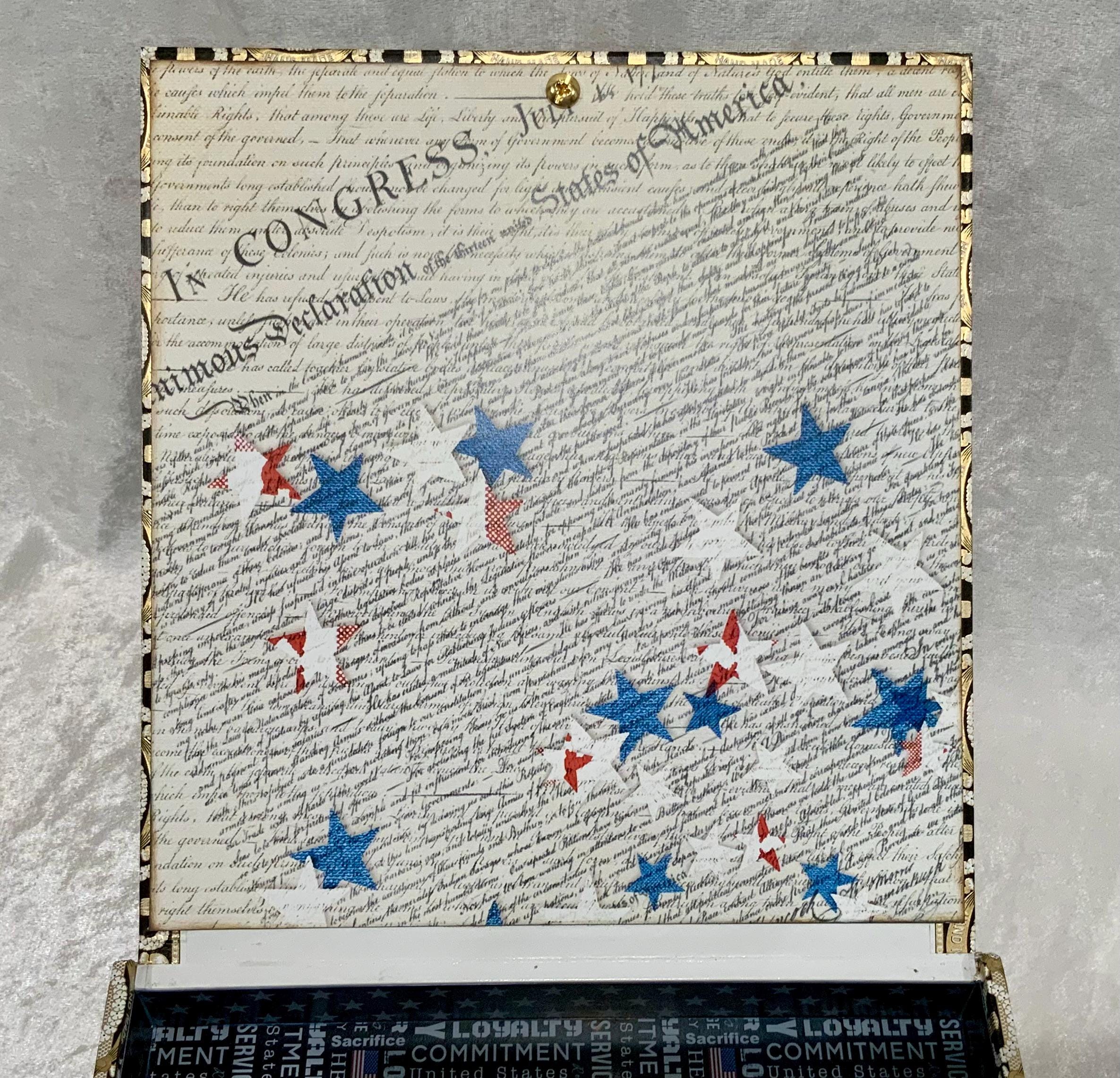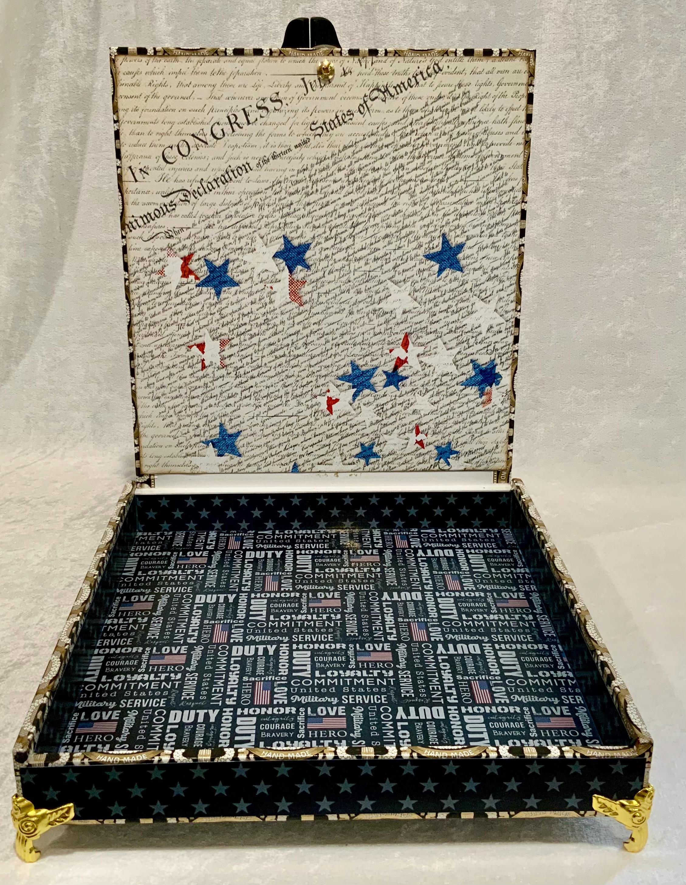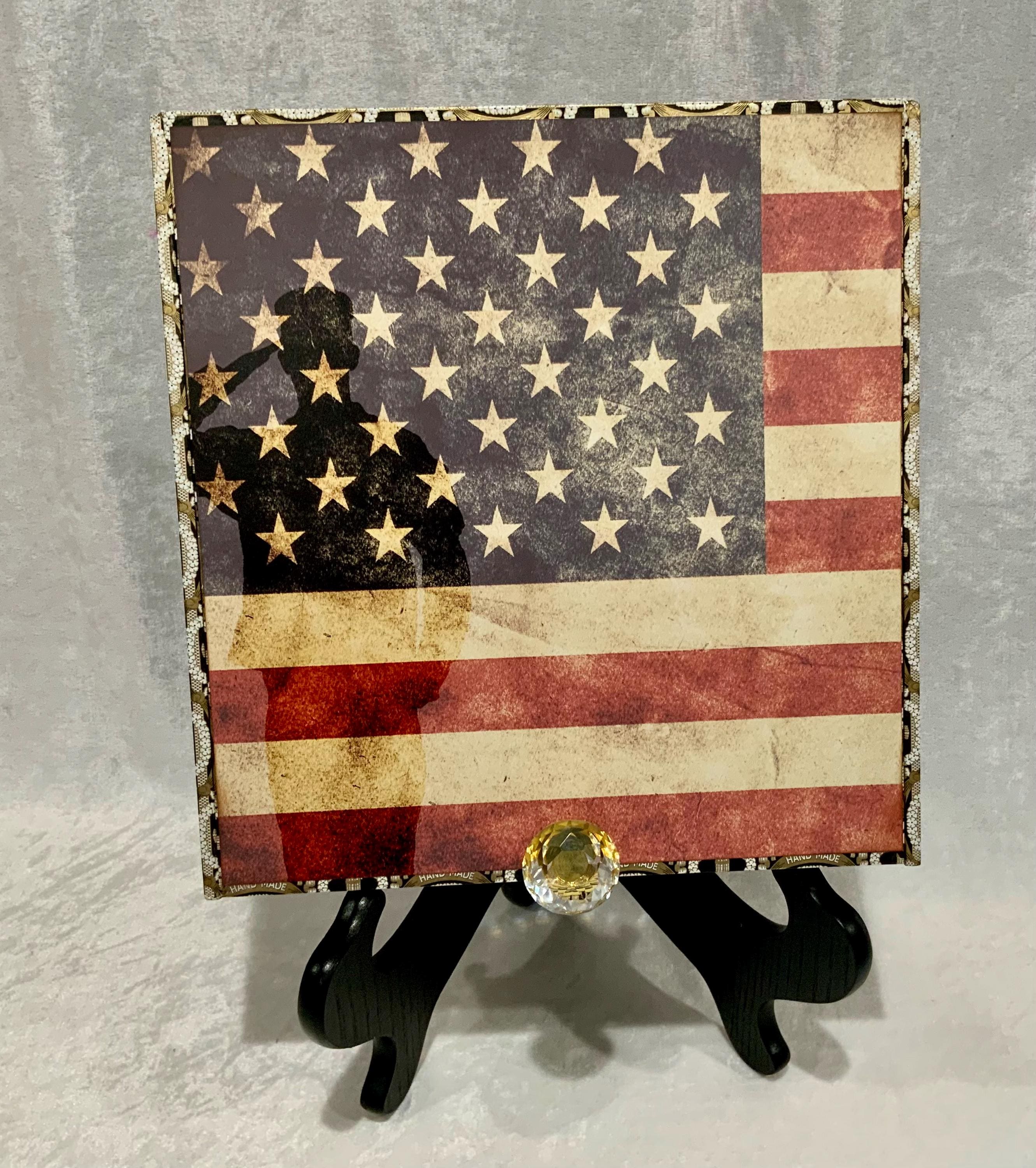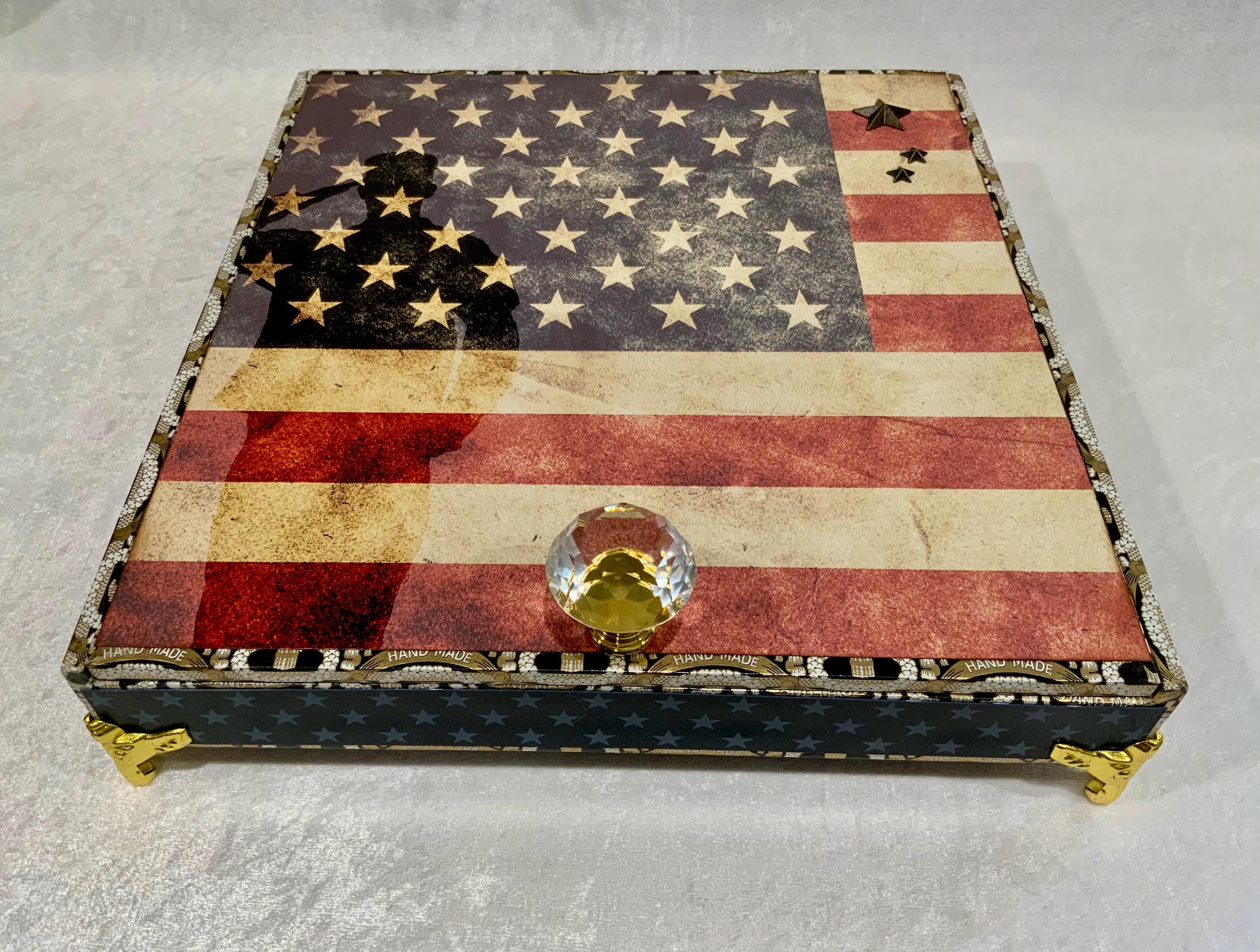 The exterior lid features a bold soldier silhouette layered over a distressed American flag, creating a meaningful and timeless statement piece. The sides are wrapped in coordinating star paper for a tailored, cohesive finish.