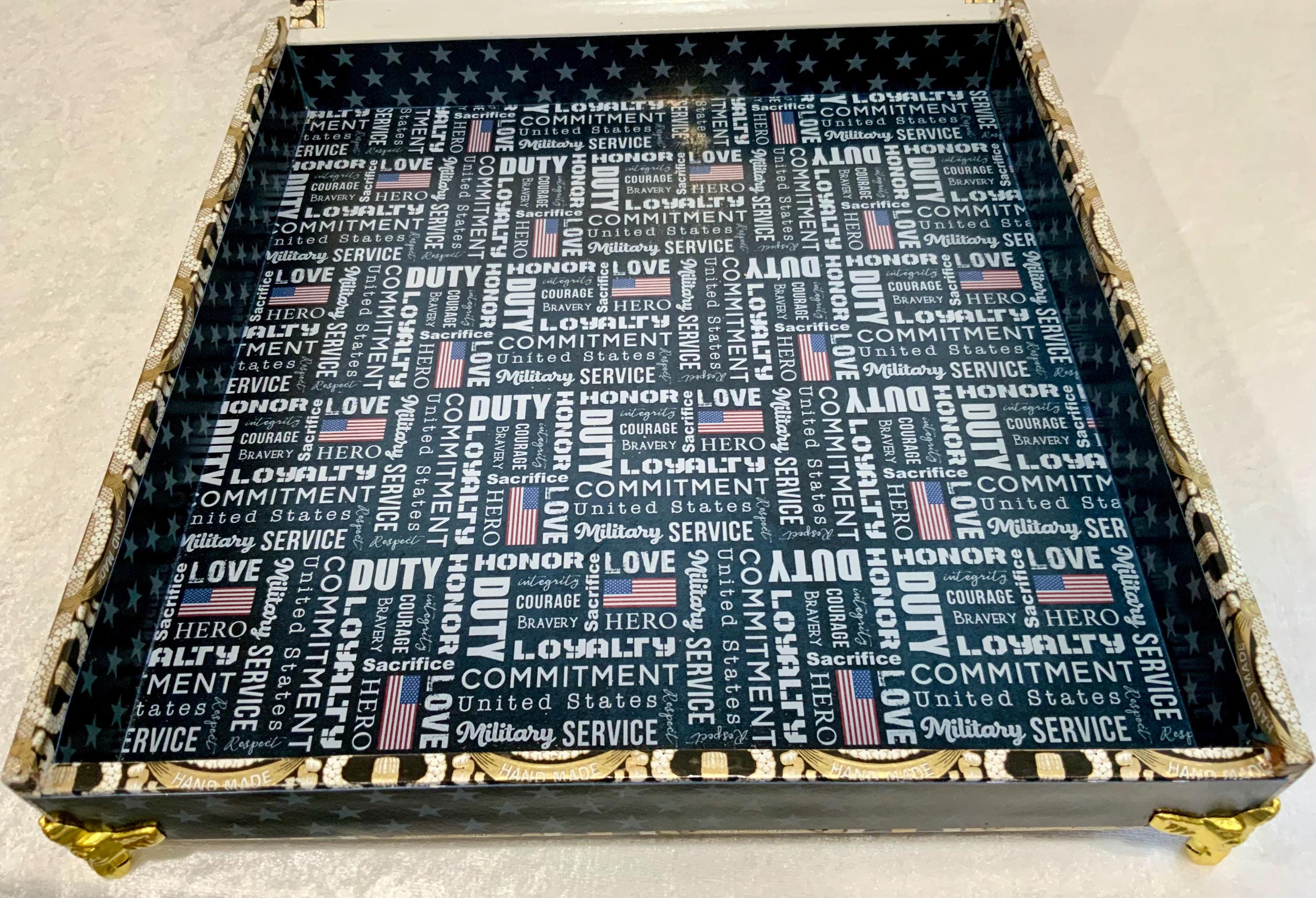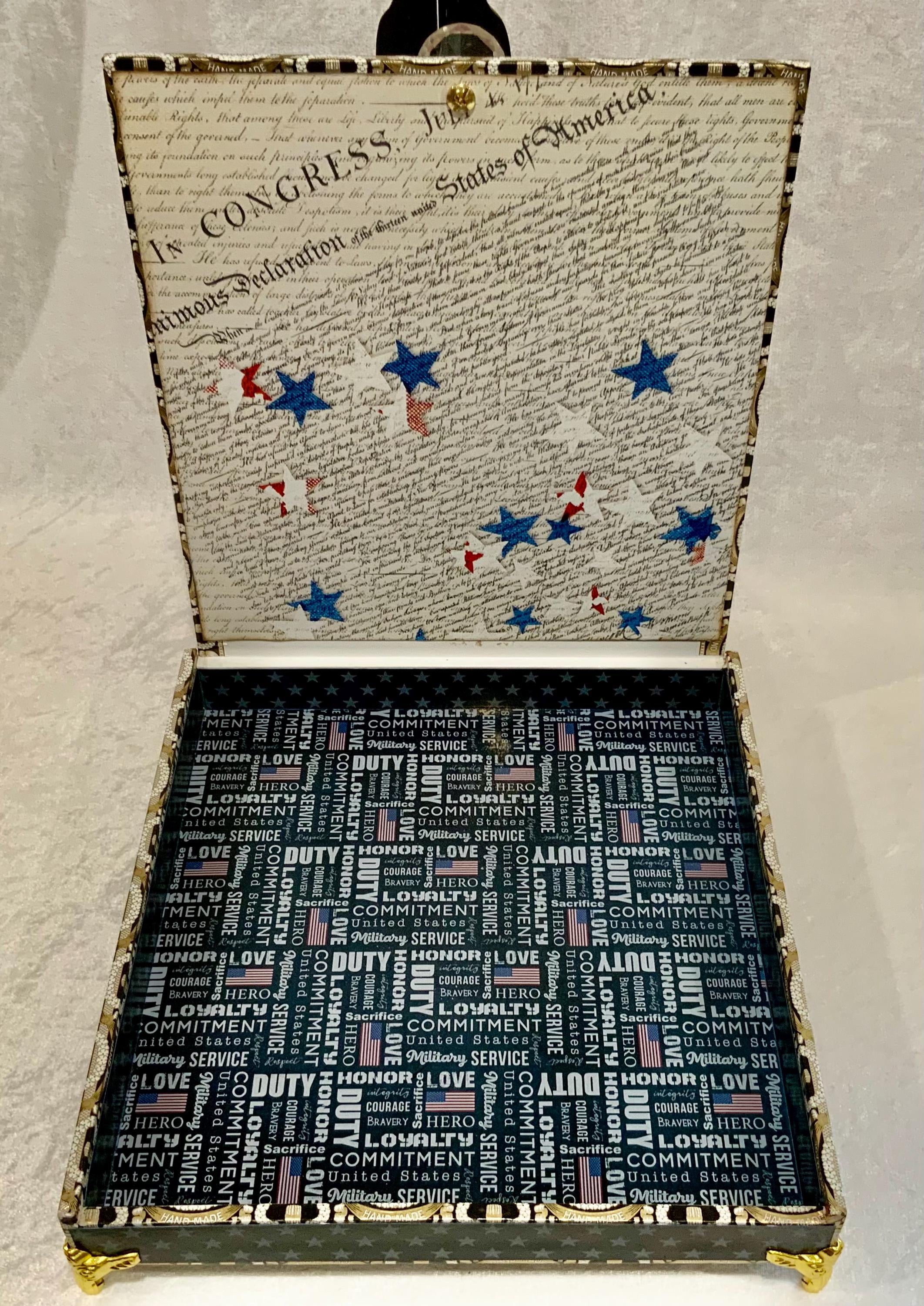 When opened, the inside lid reveals a historic Constitution-inspired design, while the interior base highlights powerful military values including Duty, Honor, Loyalty, Commitment, and Service.