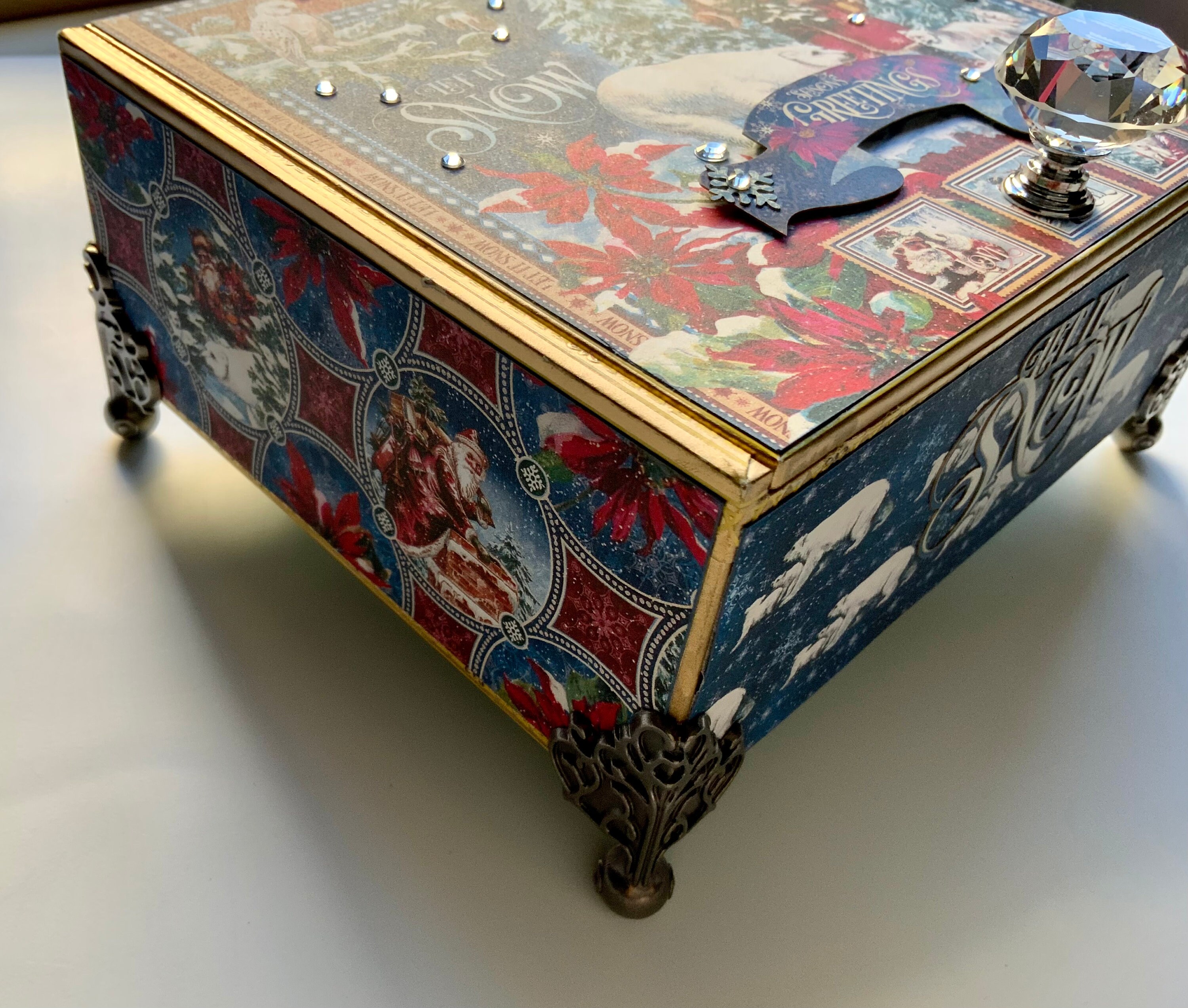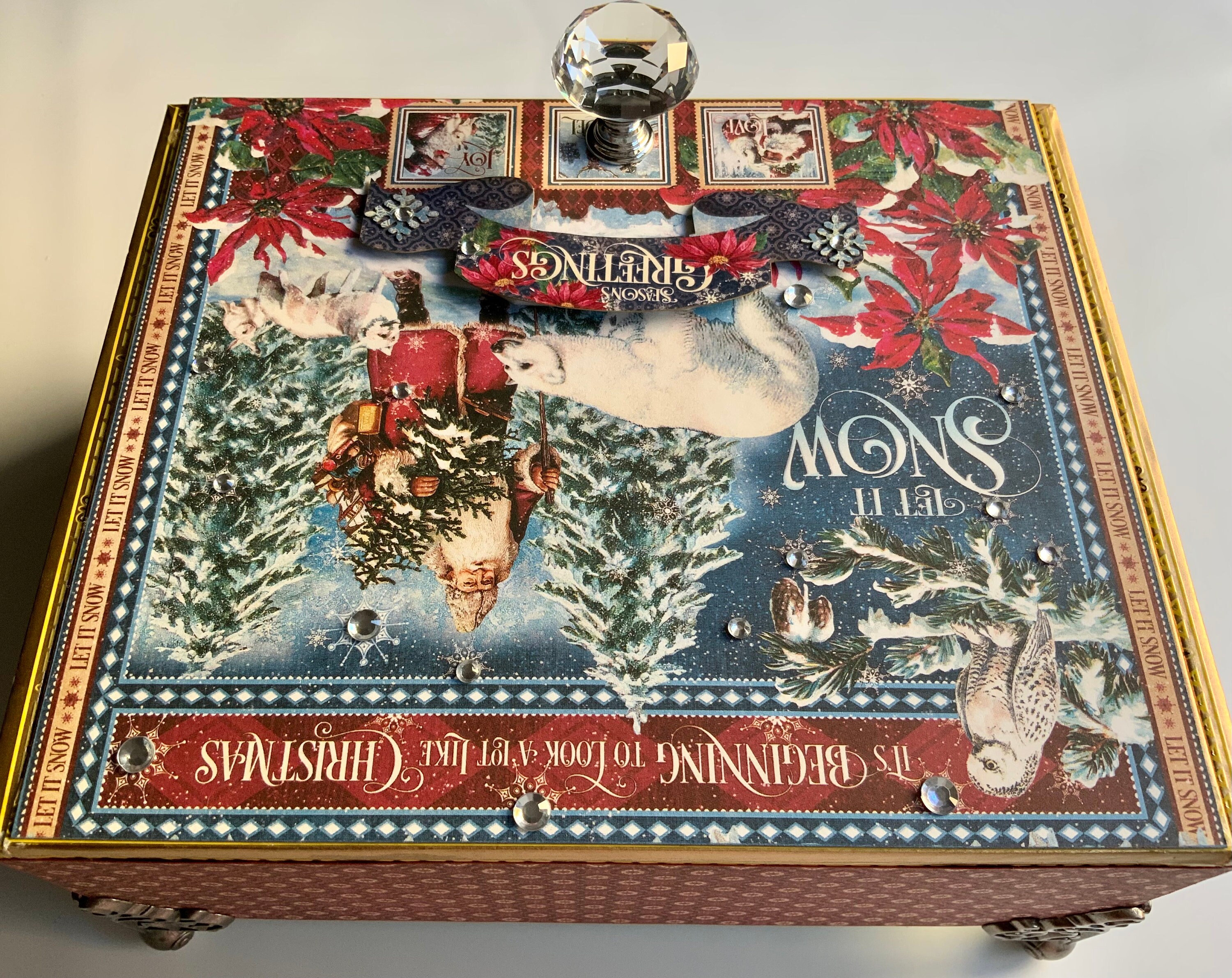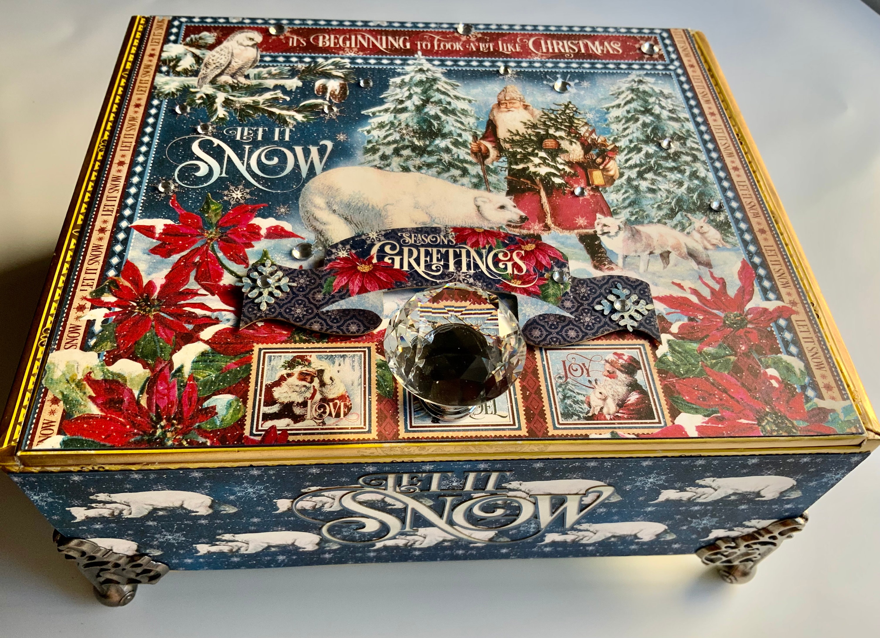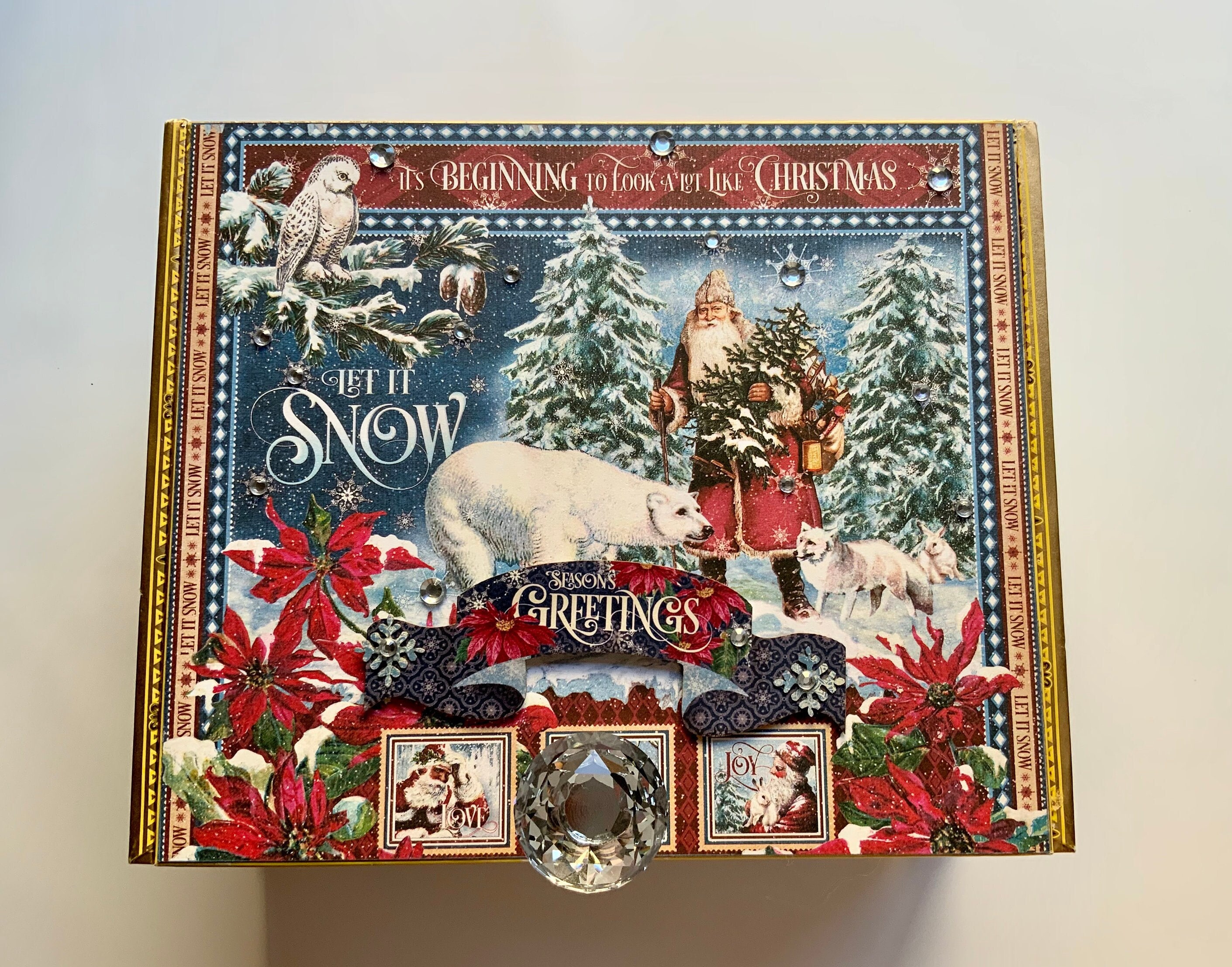 Repurposed Wooden Cigar Box. Let it Snow! The scene is a traditional classic Christmas look. Winter snow, polar bears and Santa Claus! I decorated this box with vintage looking paper and sparkles plus snow flake stickers. The glass and metal knob gives the look of a snow globe. The box is very dimensional with the gems, banners and small card on the inside lid picturing Santa carrying a Christmas tree followed by his winter buddies! This box is big enough to hold most sizes of Christmas cards or a small gift.