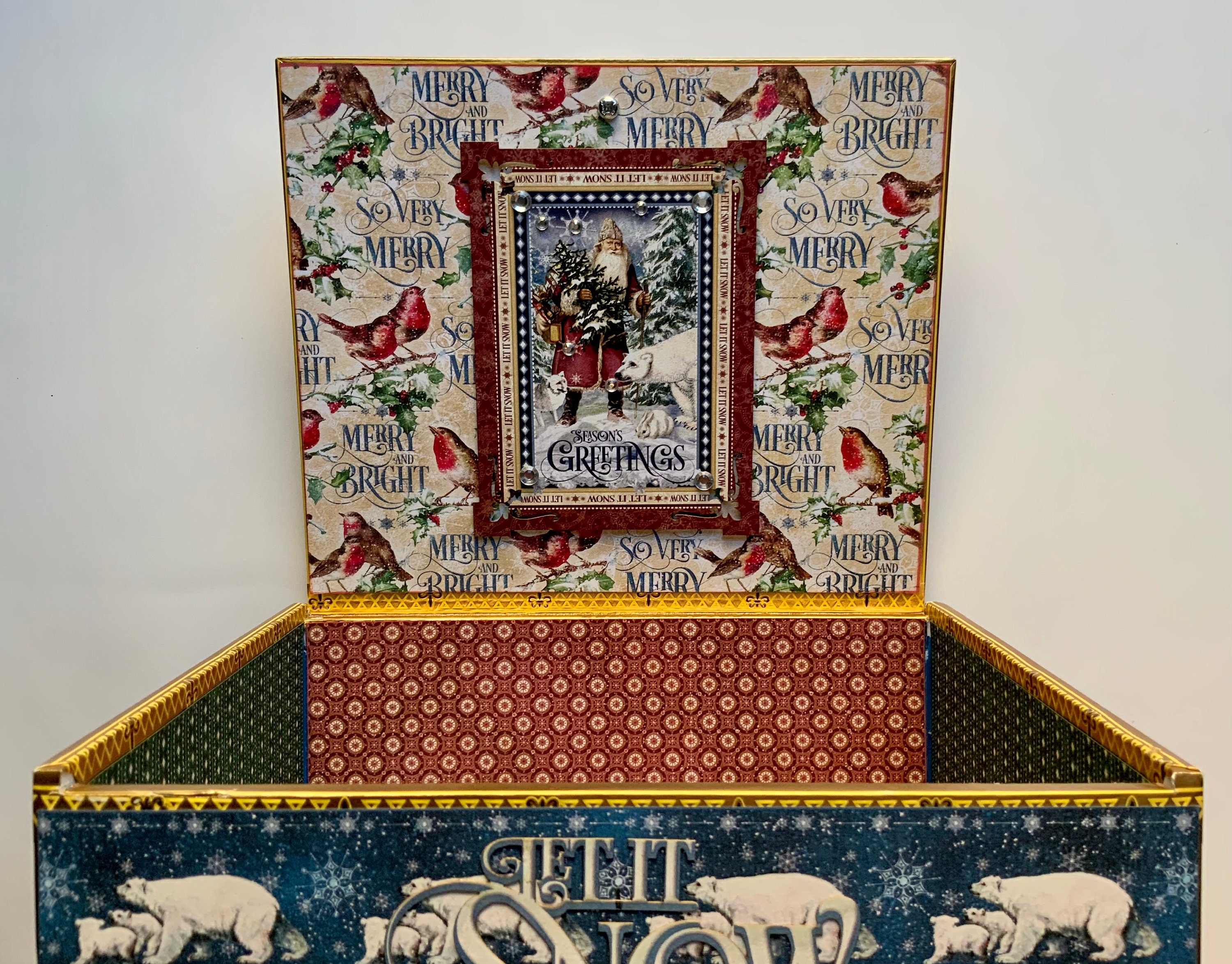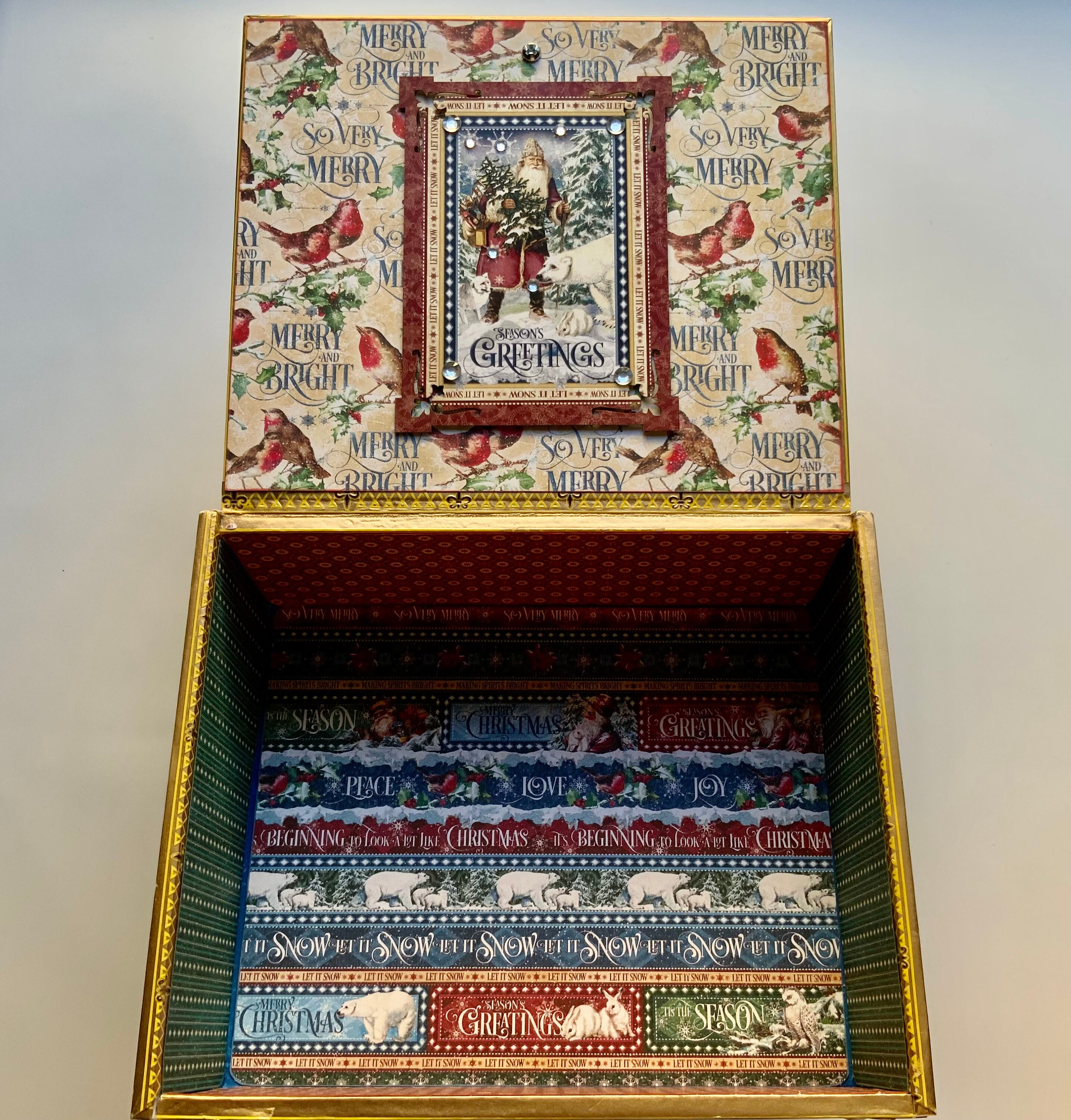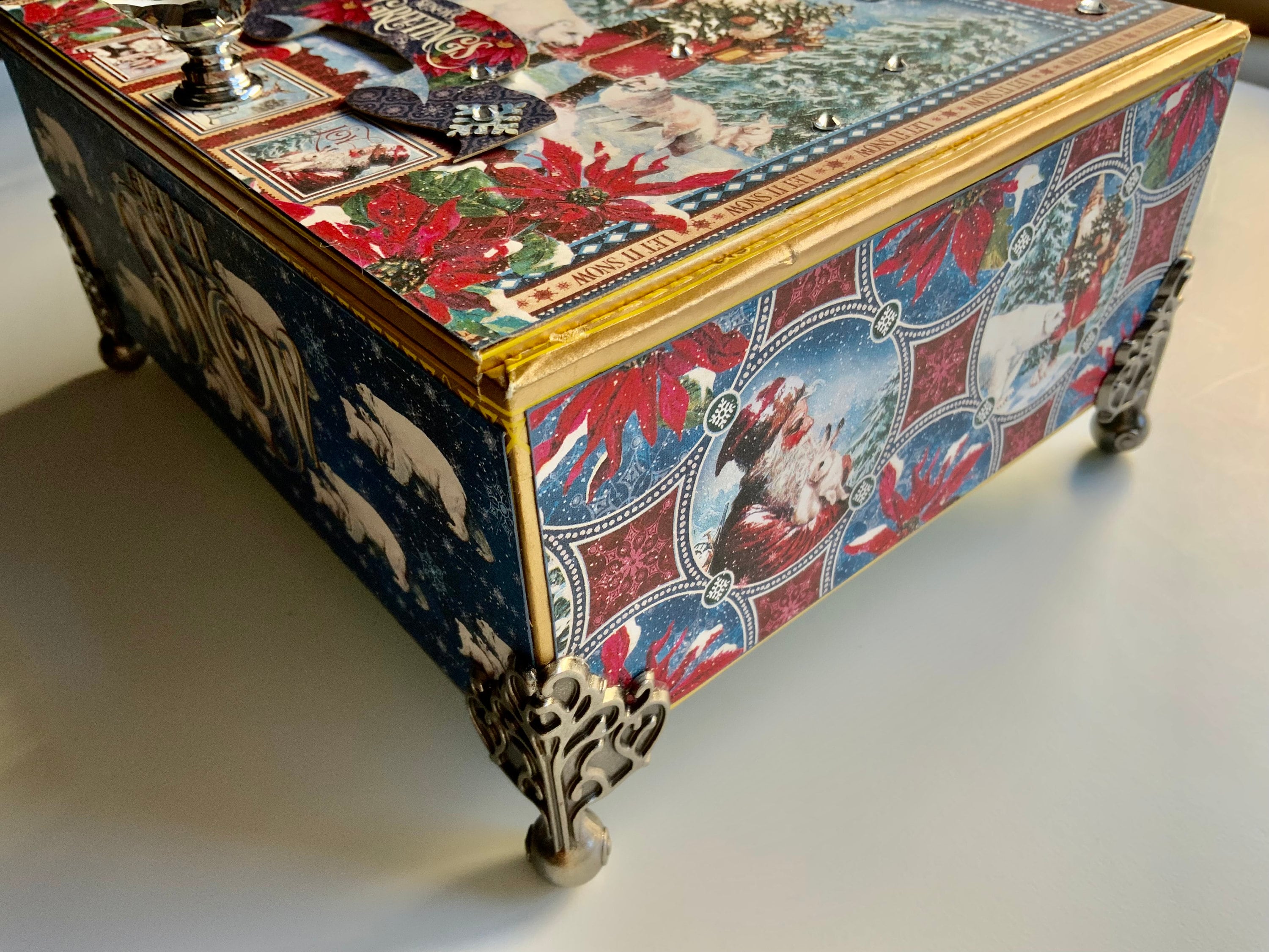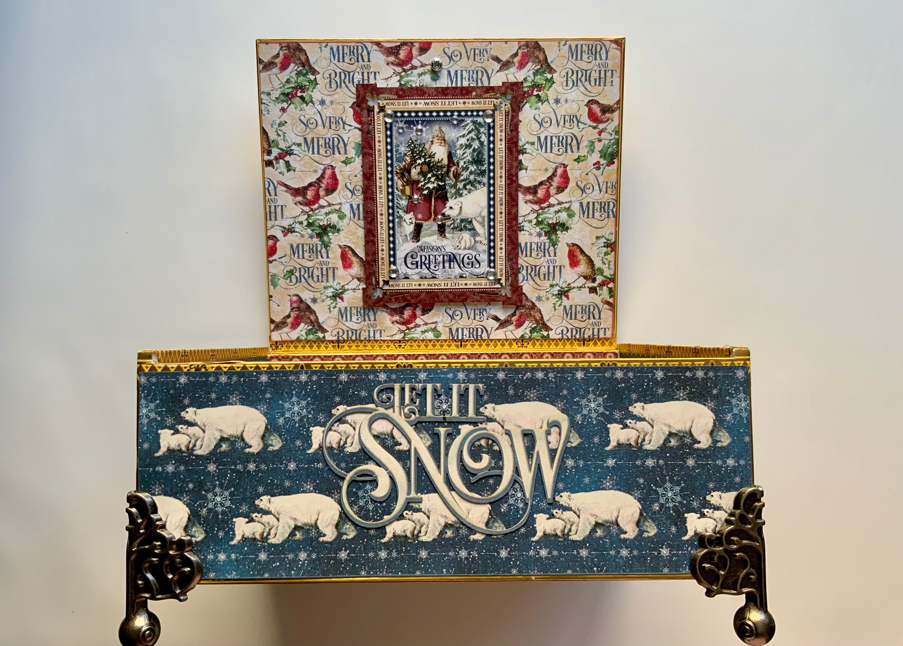Repurposed Wooden Cigar Box. Let it Snow! The scene is a traditional classic Christmas look. Winter snow, polar bears and Santa Claus! I decorated this box with vintage looking paper and sparkles plus snow flake stickers. The glass and metal knob gives the look of a snow globe. The box is very dimensional with the gems, banners and small card on the inside lid picturing Santa carrying a Christmas tree followed by his winter buddies! This box is big enough to hold most sizes of Christmas cards or a small gift.