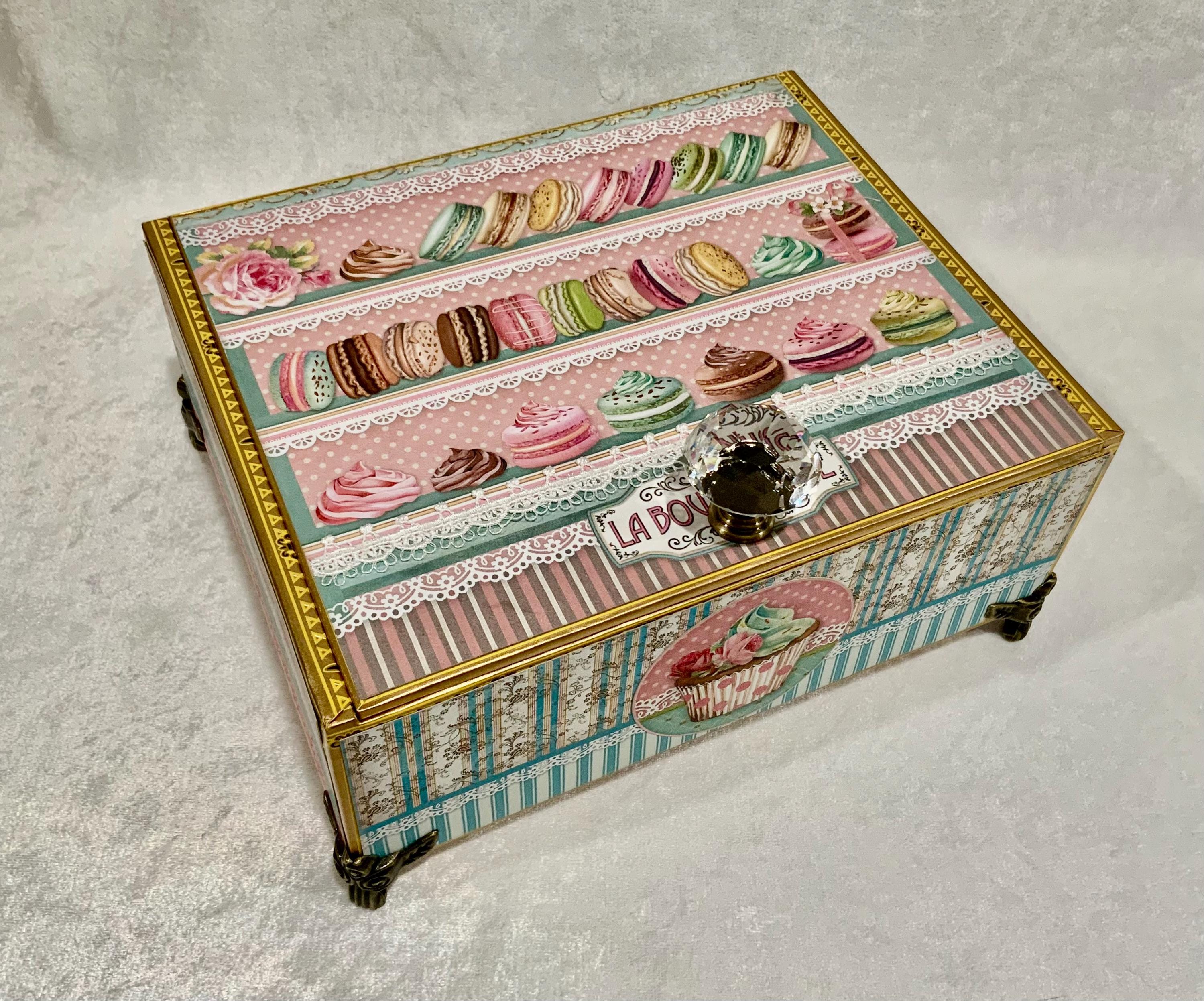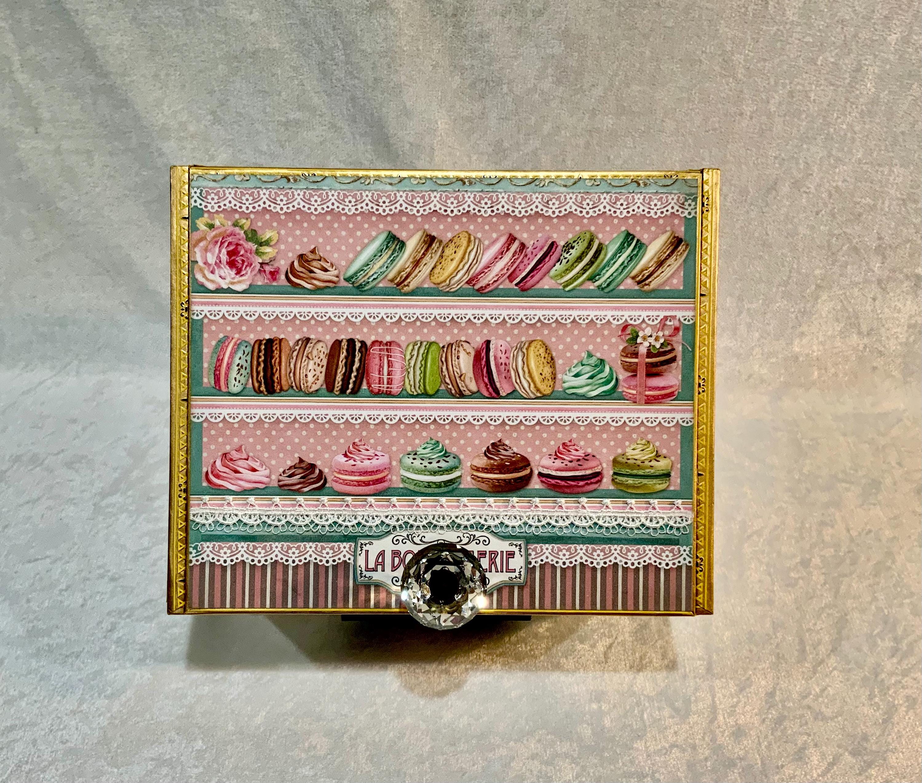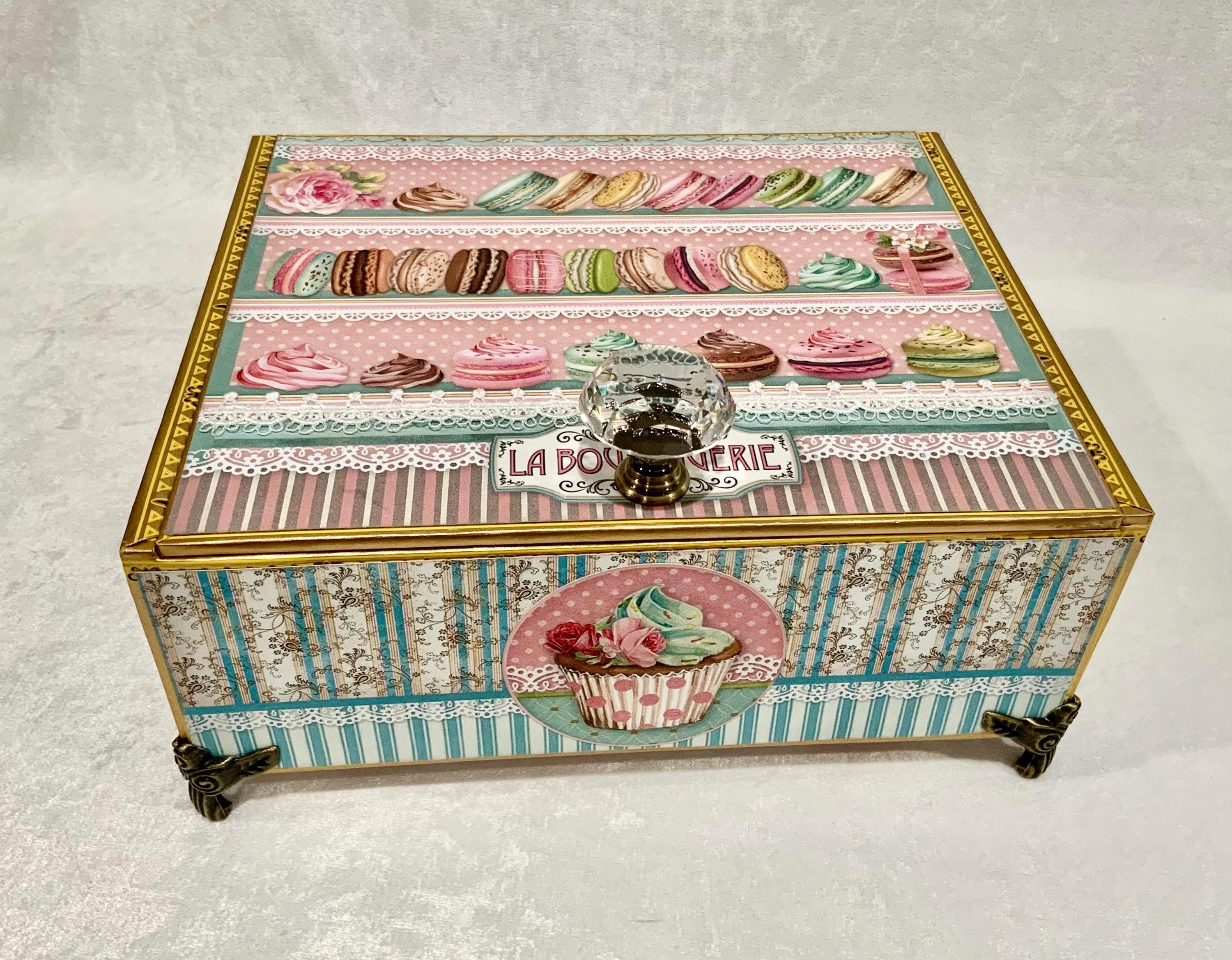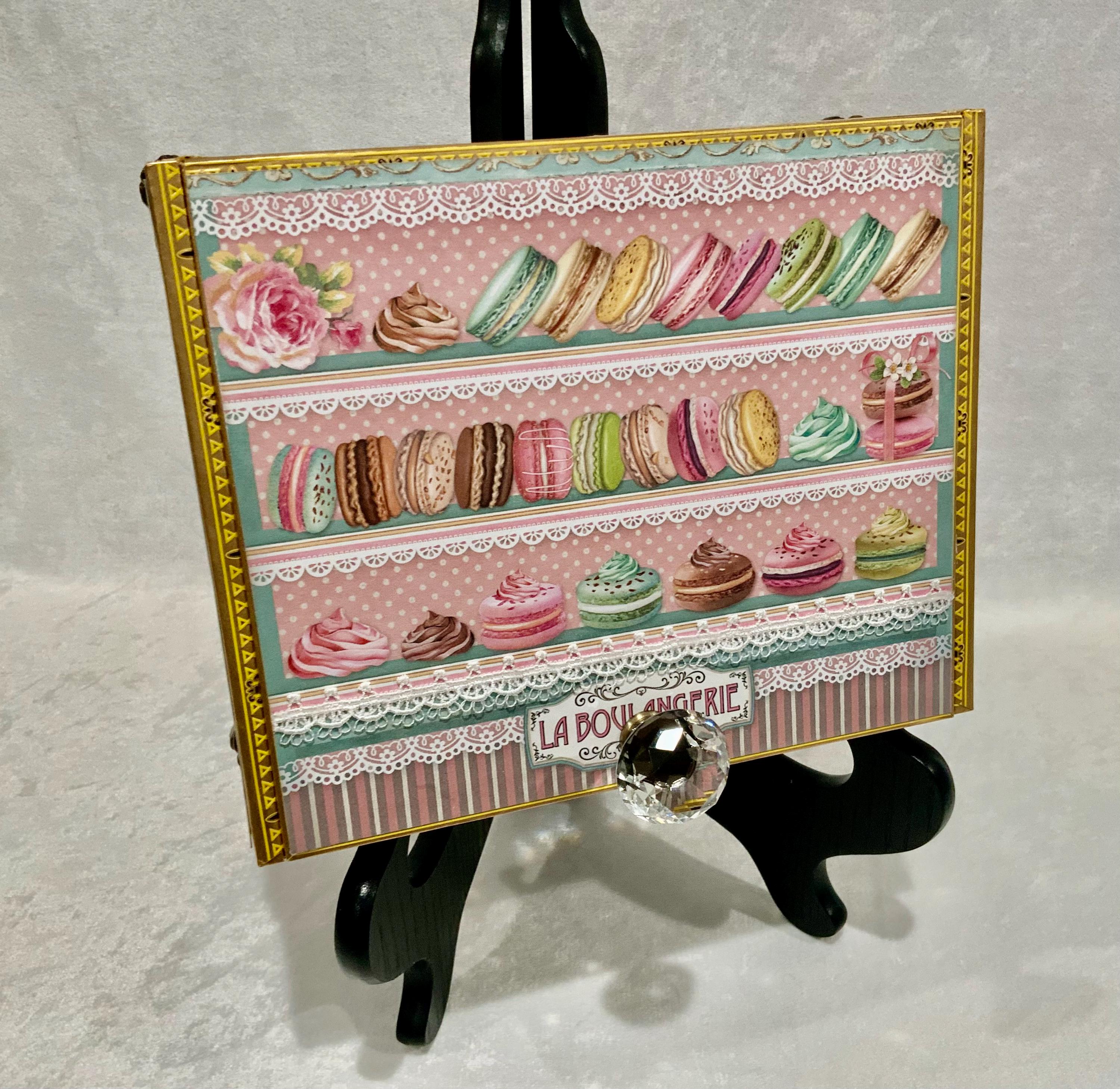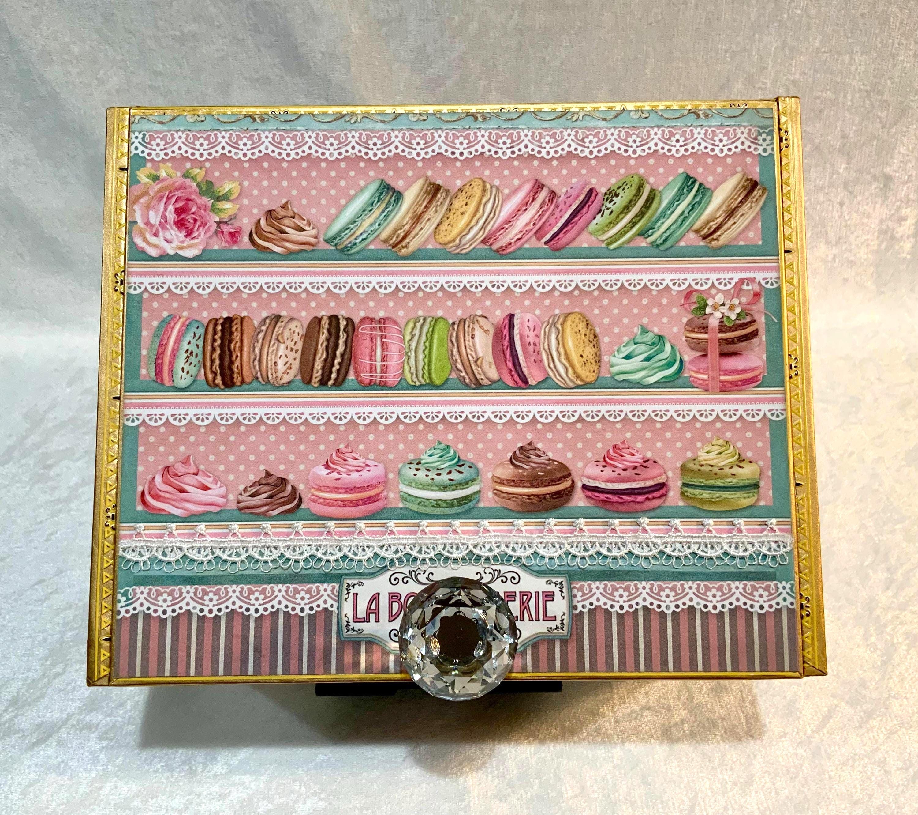 This one-of-a-kind upcycled cigar box has been lovingly transformed into a charming patisserie-themed treasure. Featuring colorful macarons, decadent cakes, and delicate lace detail, this piece evokes the romance of a Parisian bakery.