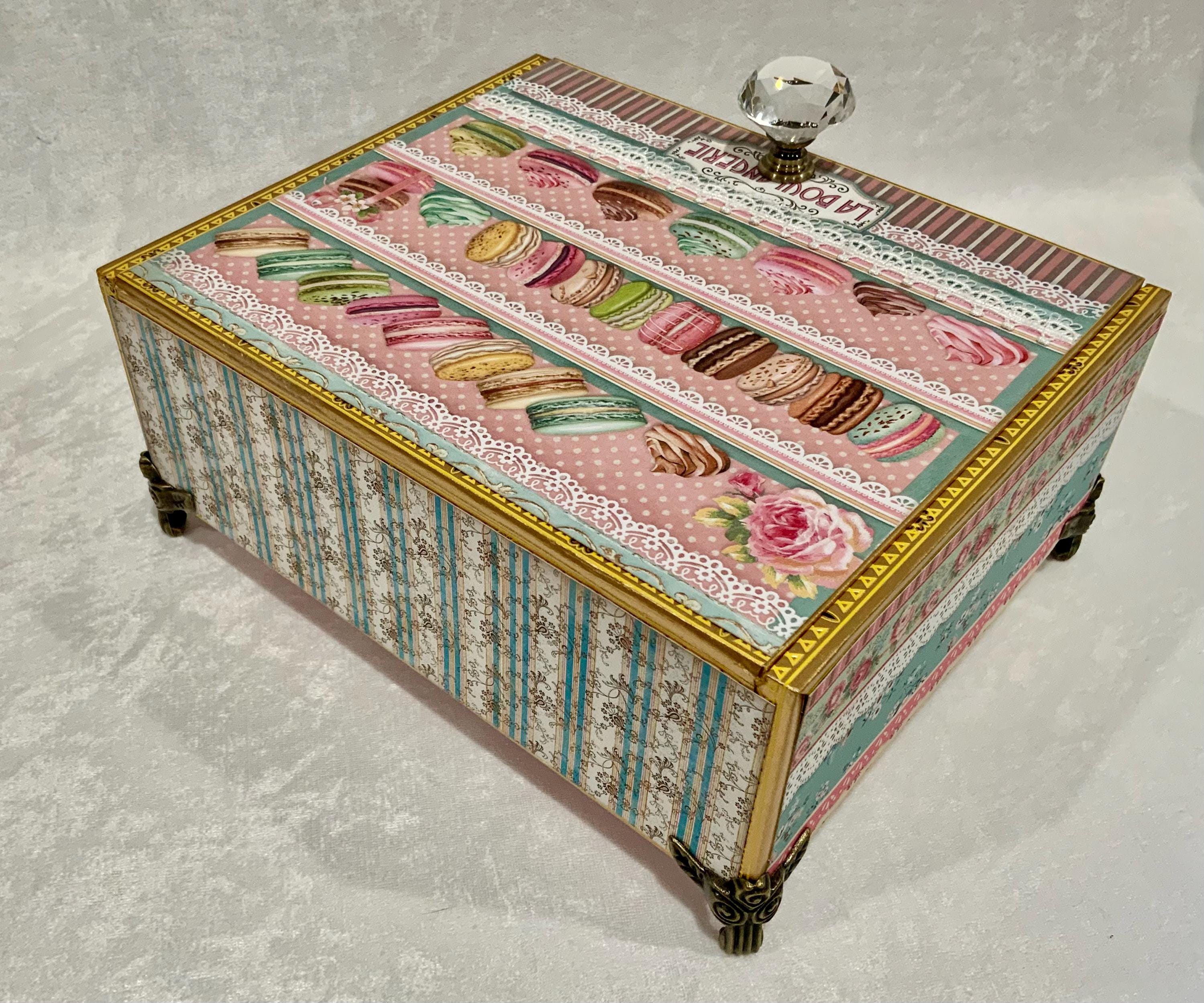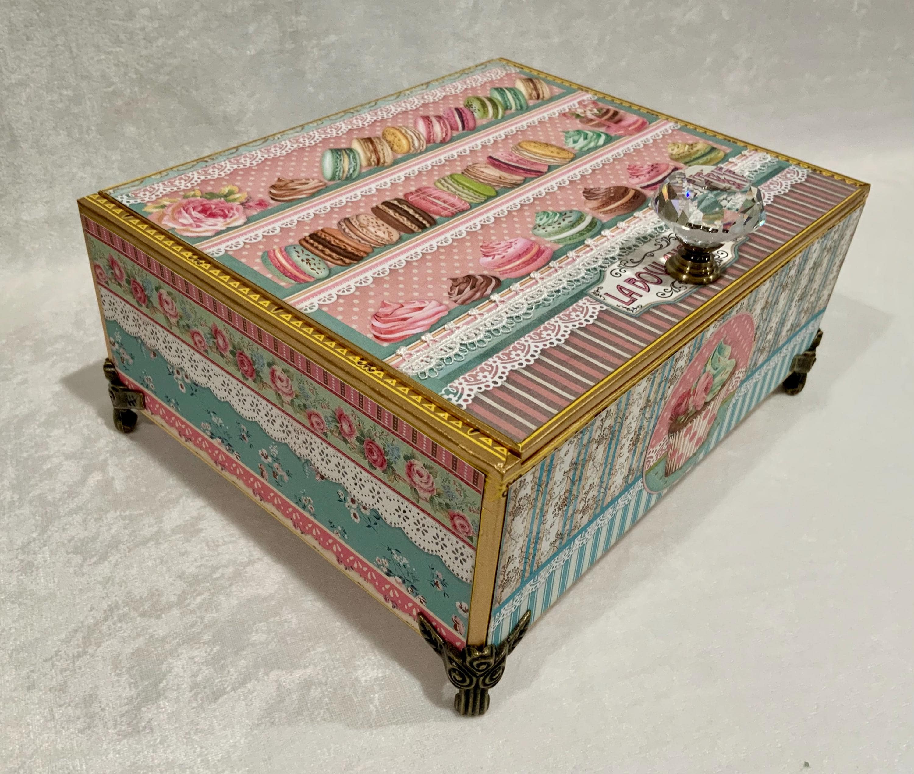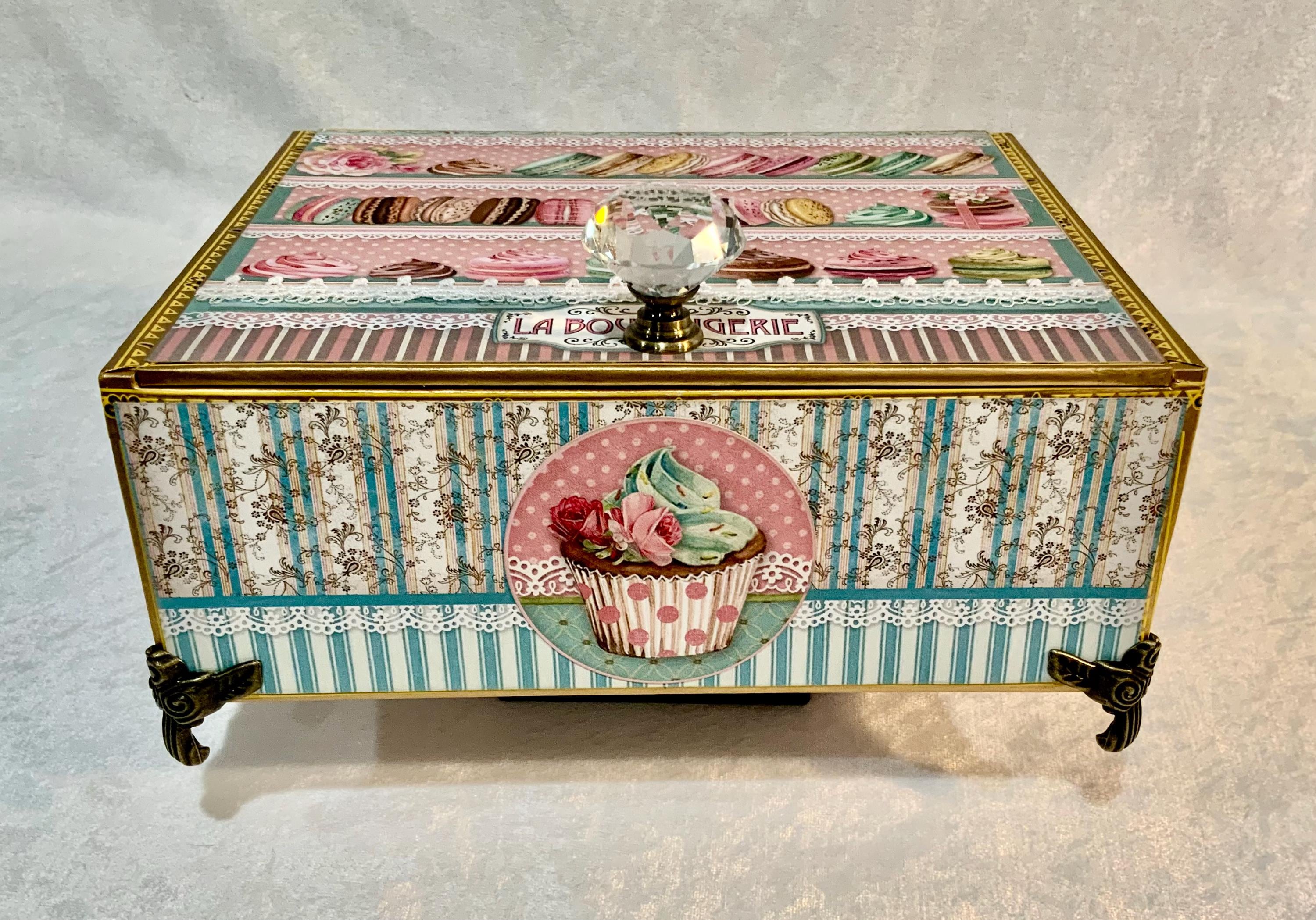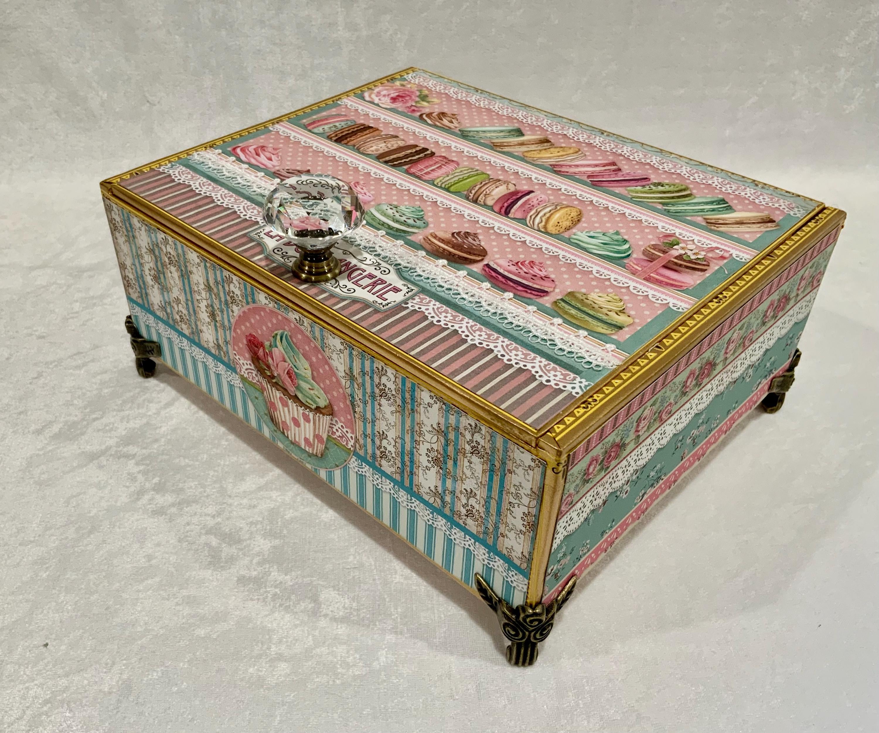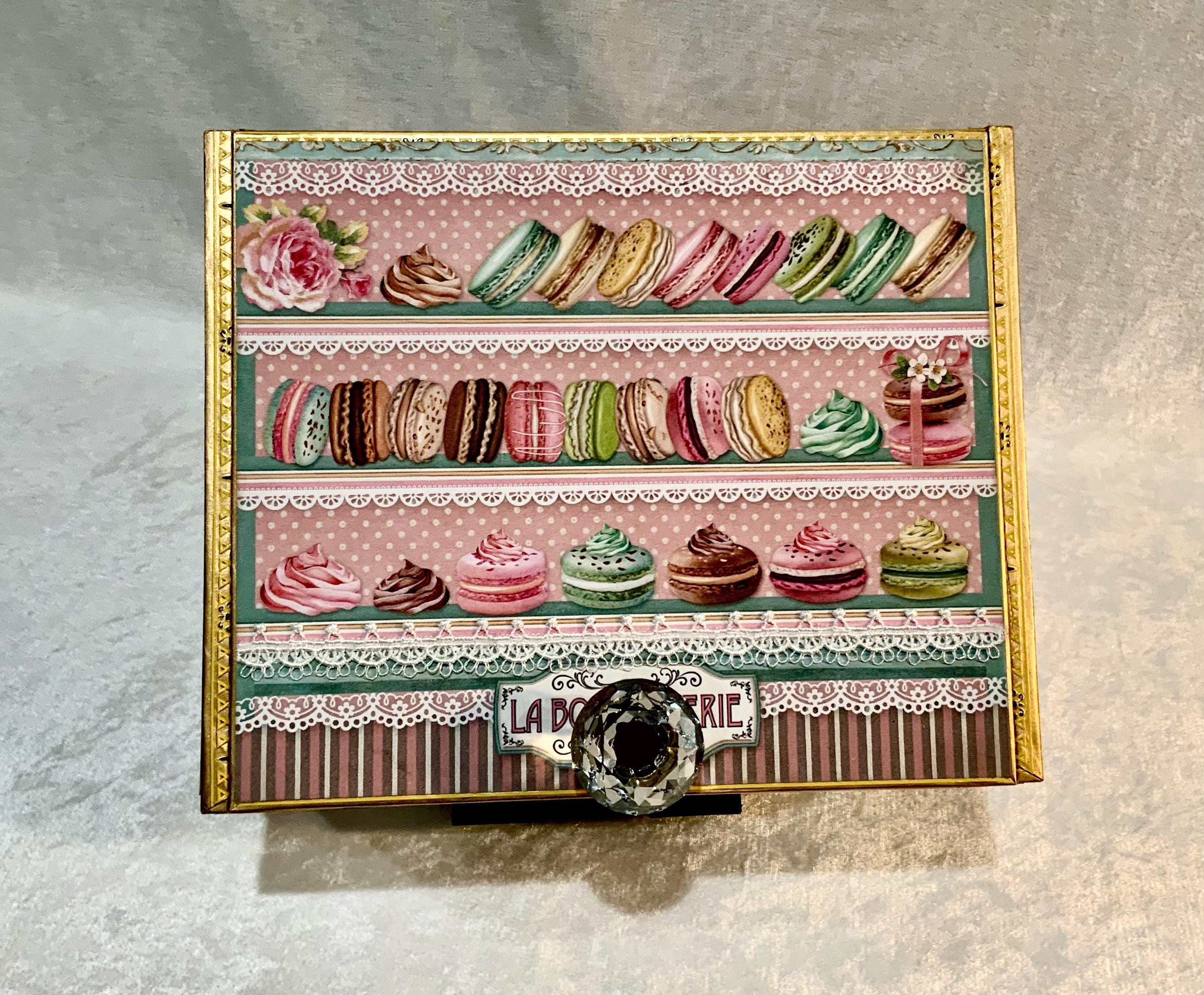 This one-of-a-kind upcycled cigar box has been lovingly transformed into a charming patisserie-themed treasure. Featuring colorful macarons, decadent cakes, and delicate lace detail, this piece evokes the romance of a Parisian bakery.