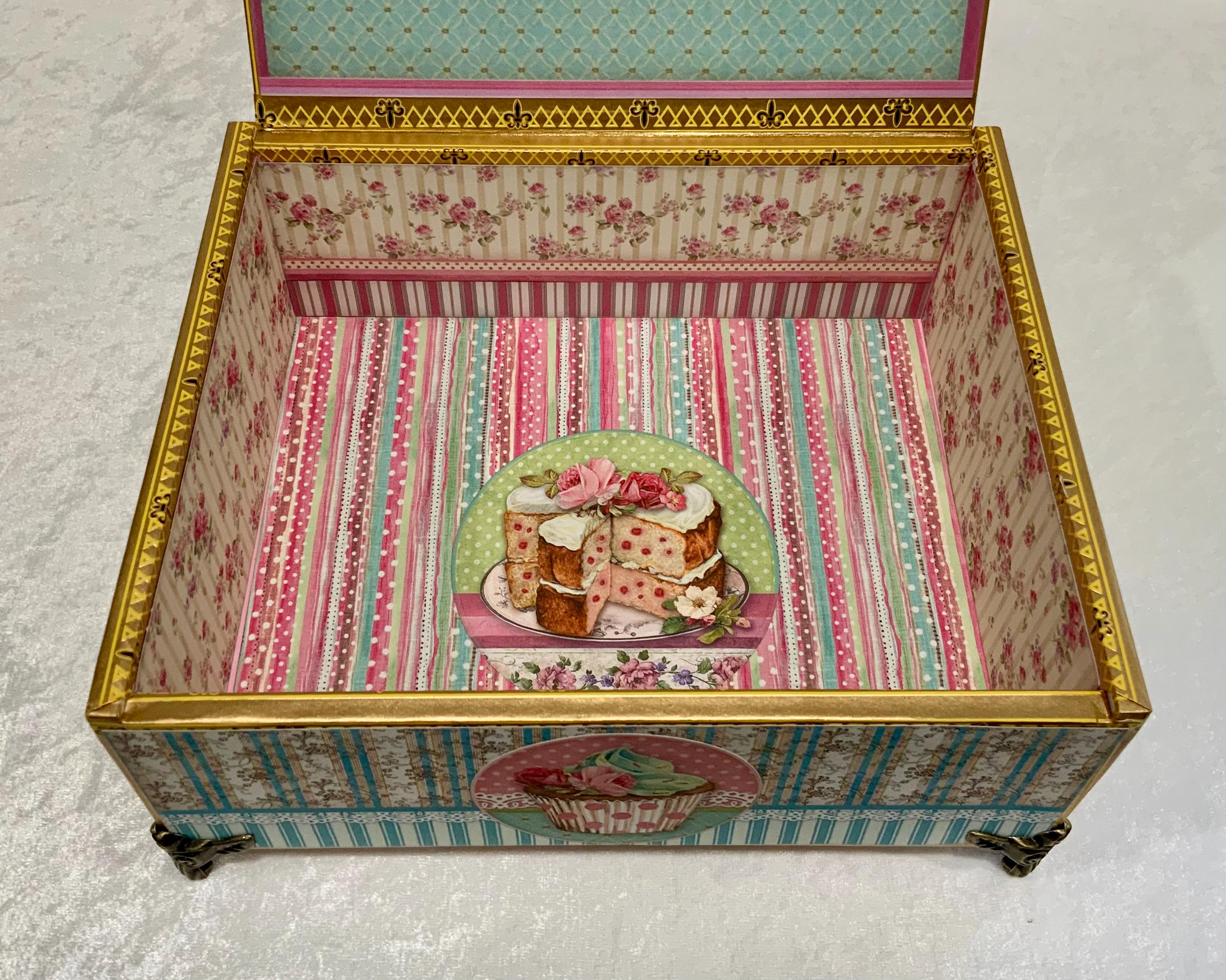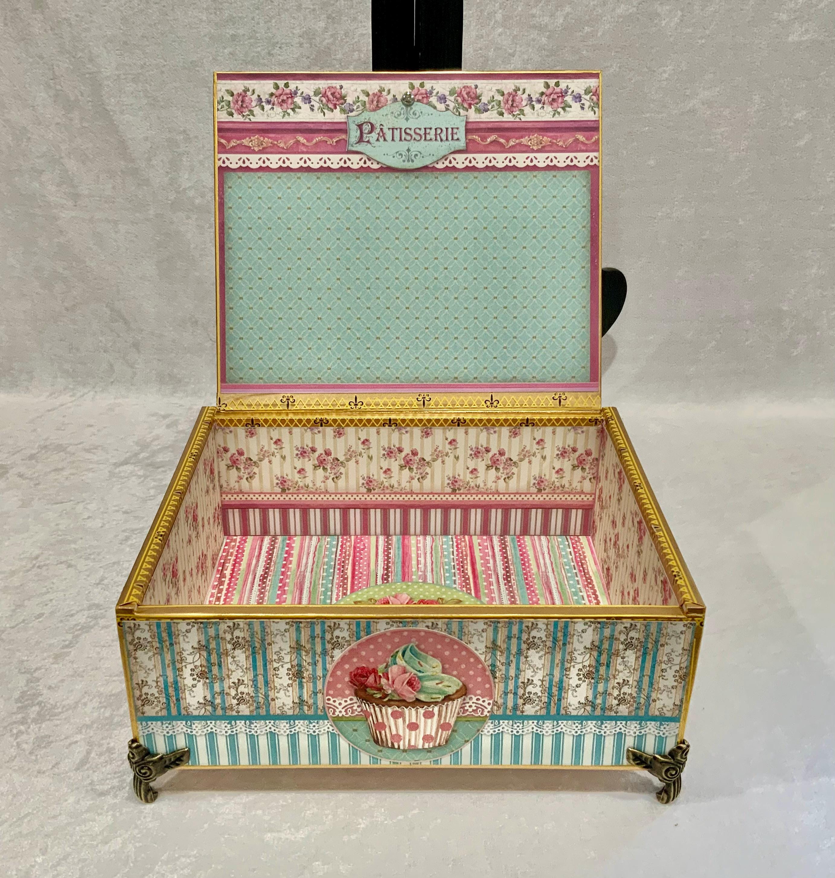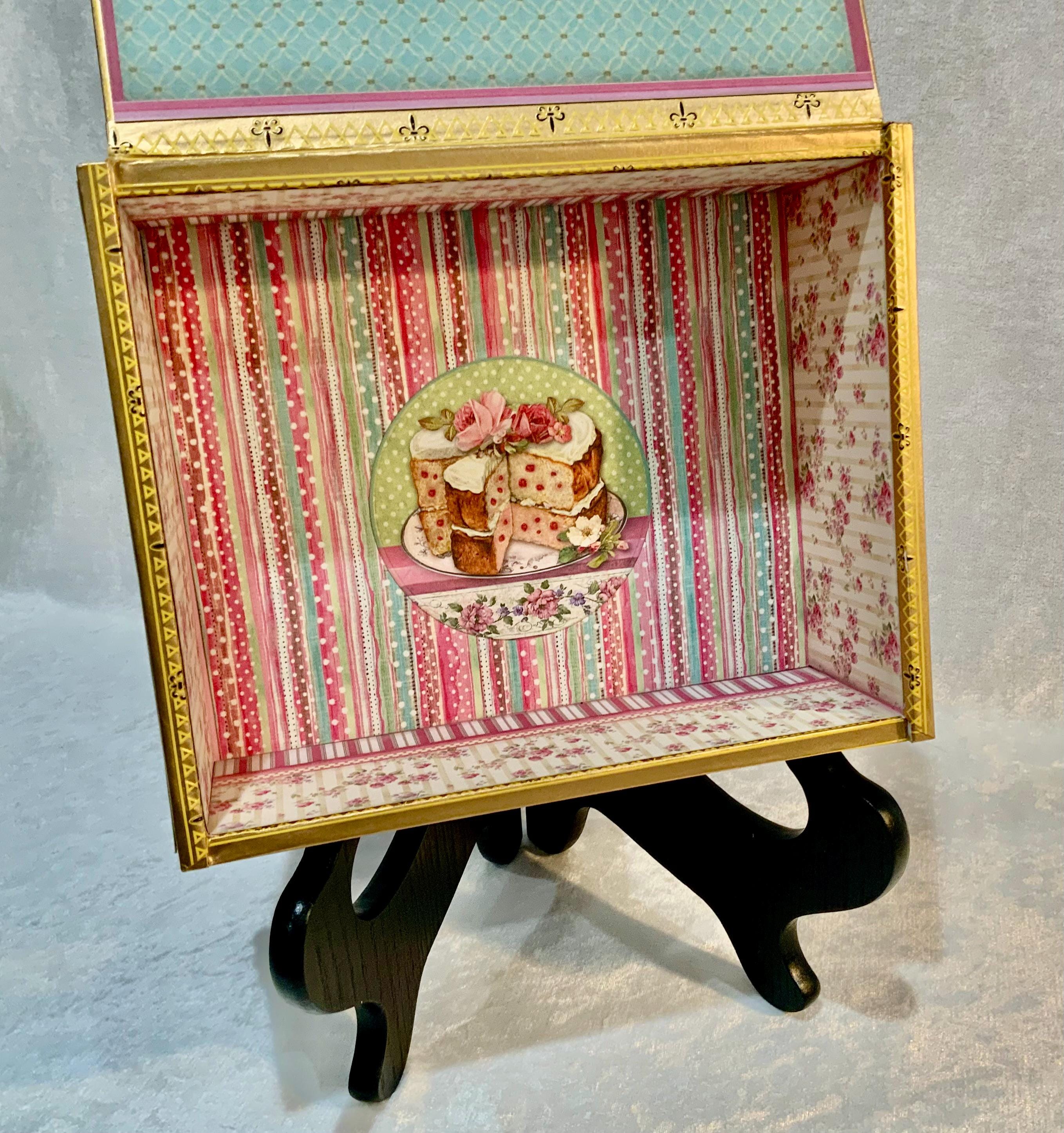 Use this box as a stand alone gift or fill it full of wrapped goodies or small gift inside! It is a Pastry Shoppe theme with all kinds of delicacies pictured on the outside and inside. I also added beautiful lace to the outside lid.
