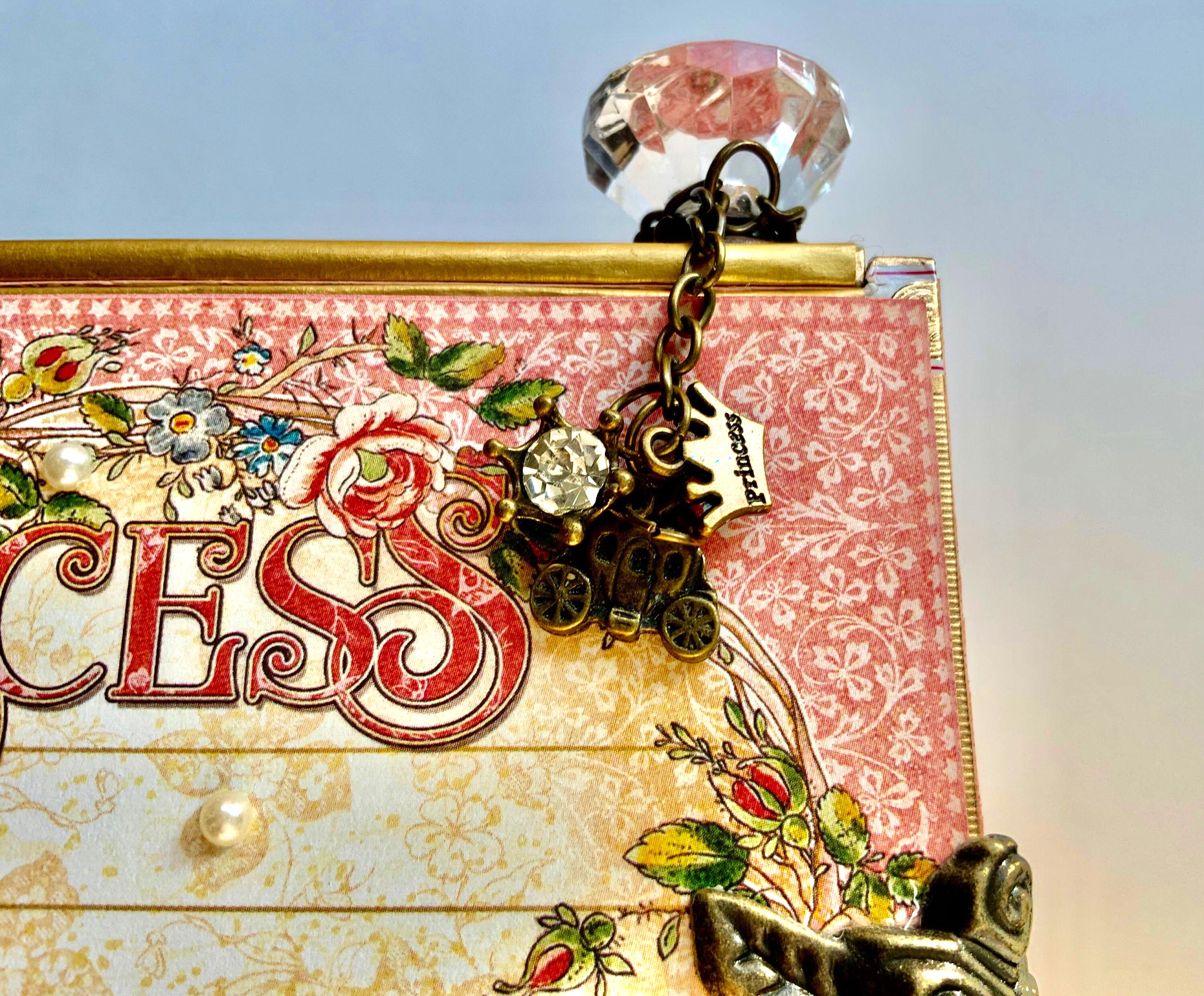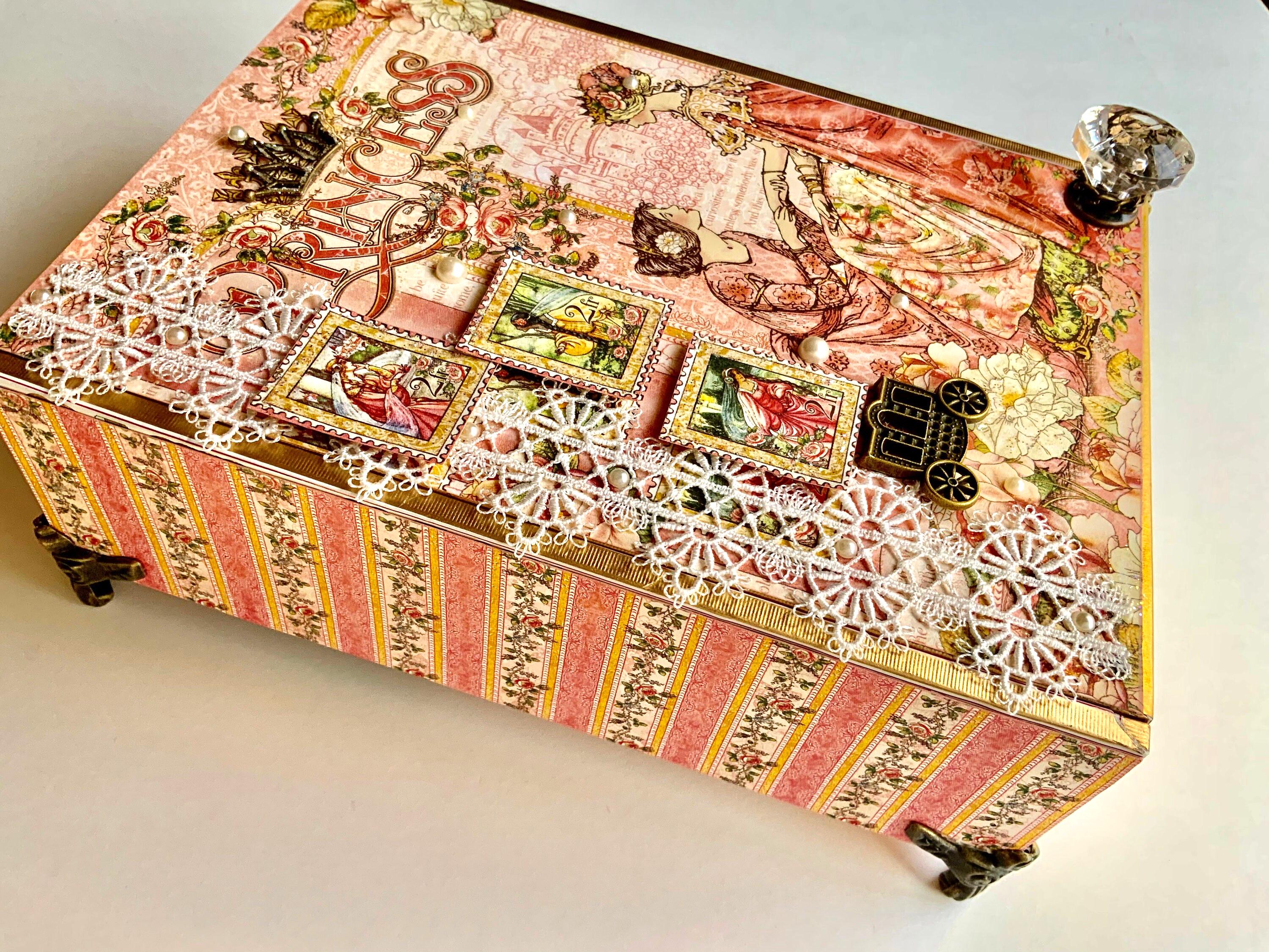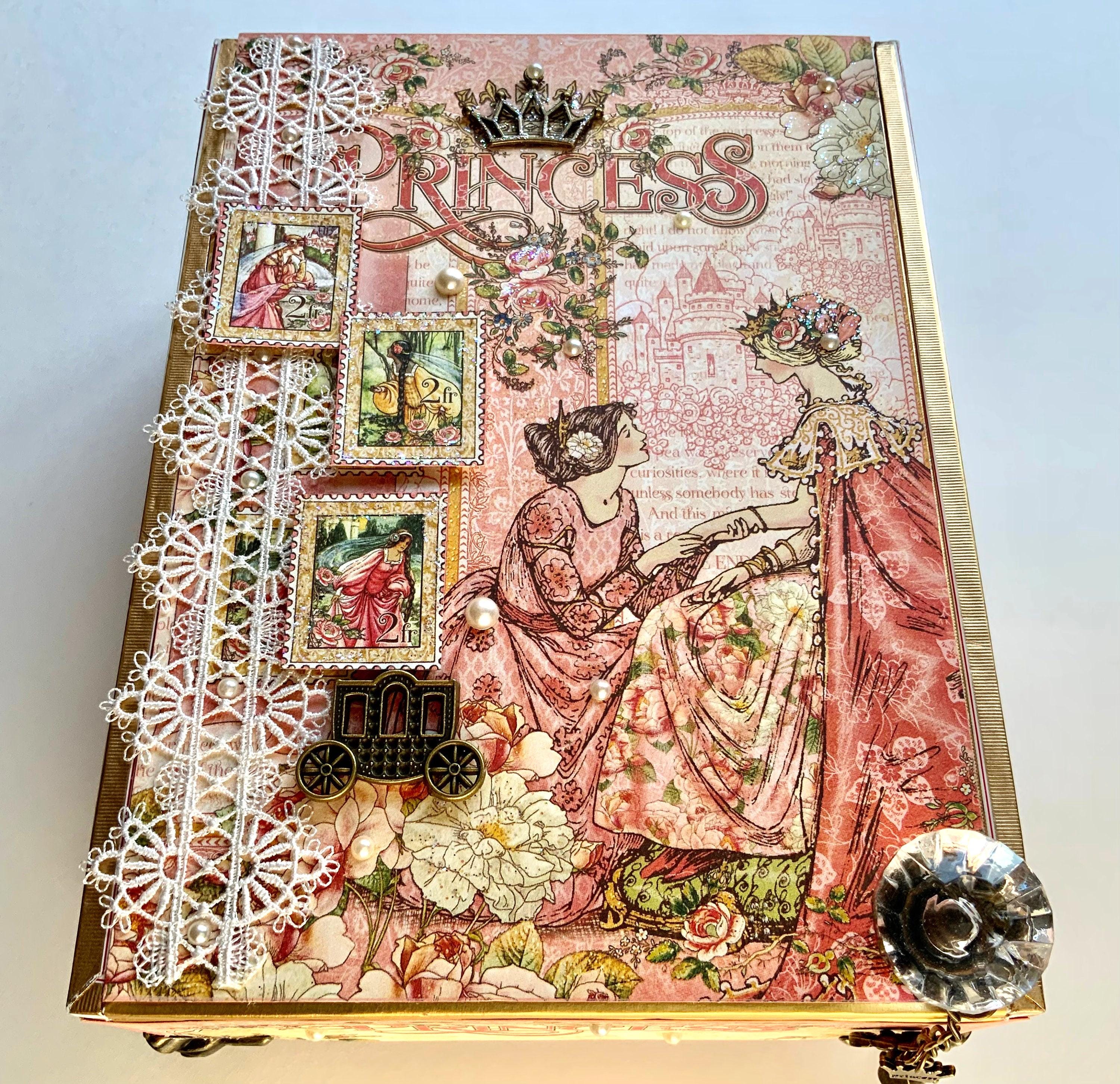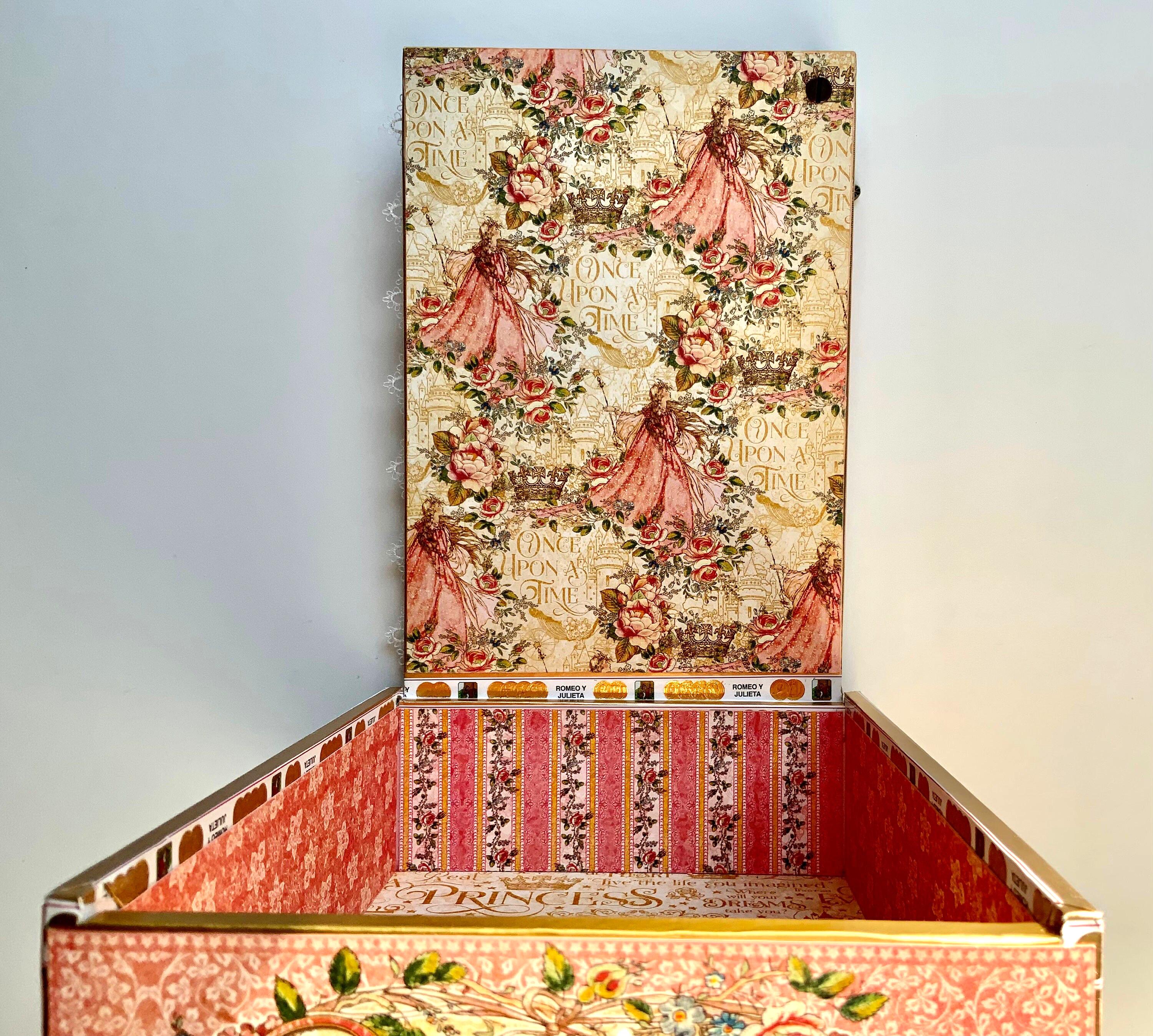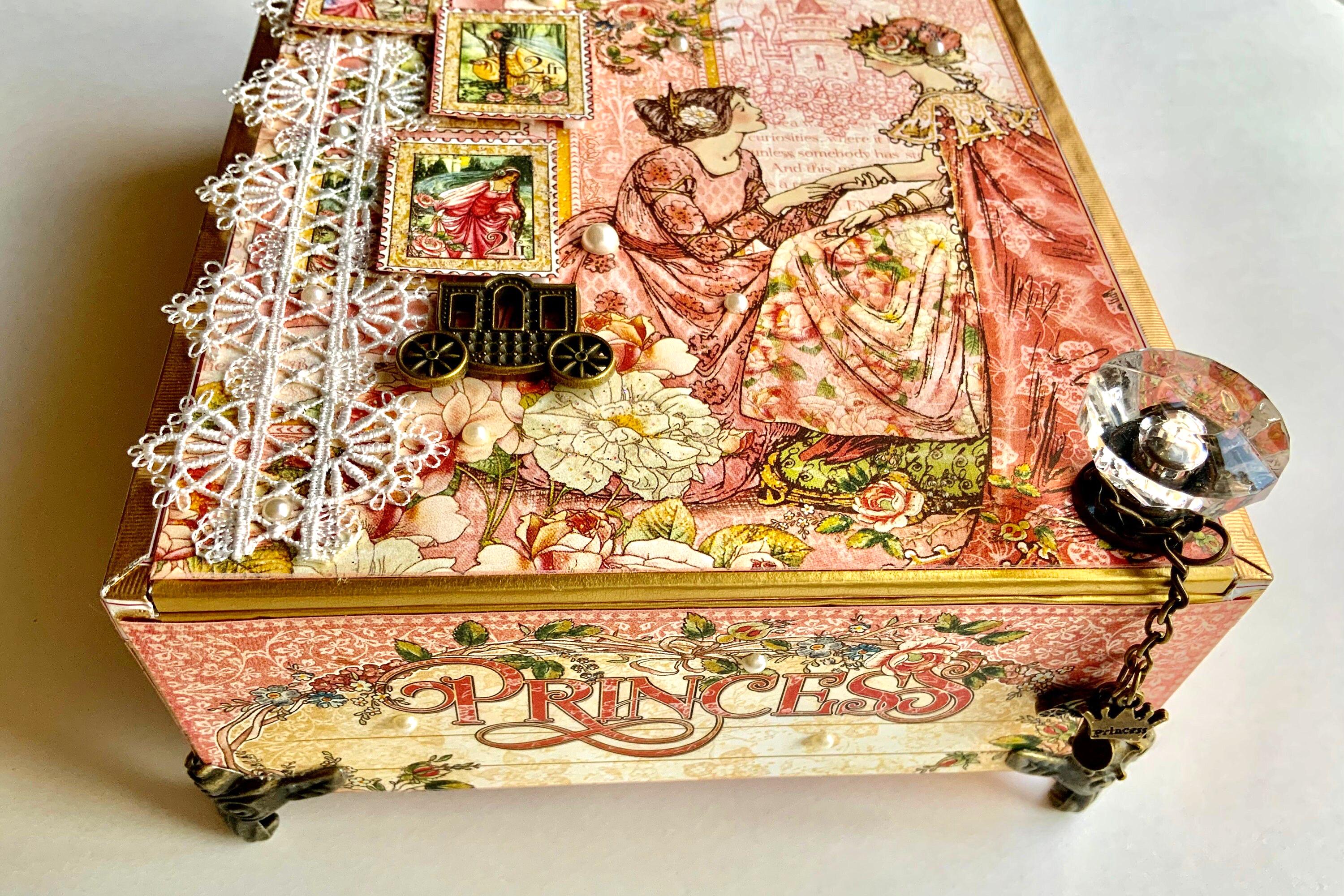 Step into a fairy-tale world with this one-of-a-kind Princess Keepsake Box, handcrafted using the retired and highly sought-after Graphic 45 Princess paper collection. This elegant box is upcycled from a Romeo y Julieta cigar box and transformed into a beautiful heirloom storage piece for jewelry, letters, keepsakes, and special gifts.