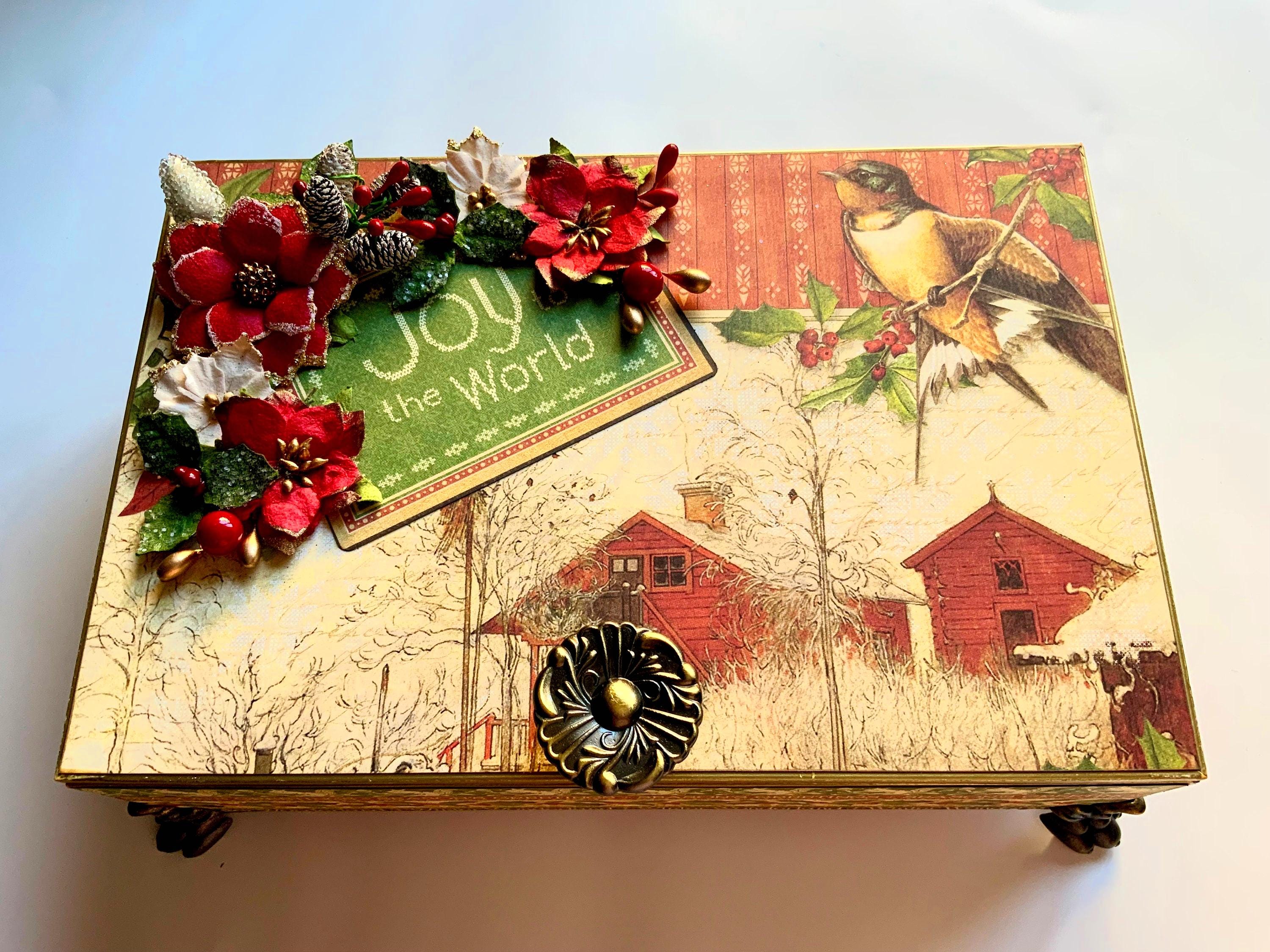 Celebrate the warmth and nostalgia of Christmas with this handcrafted keepsake box made from an authentic upcycled cigar box and decorated using the retired Graphic 45 “Winter Wonderland” paper collection.