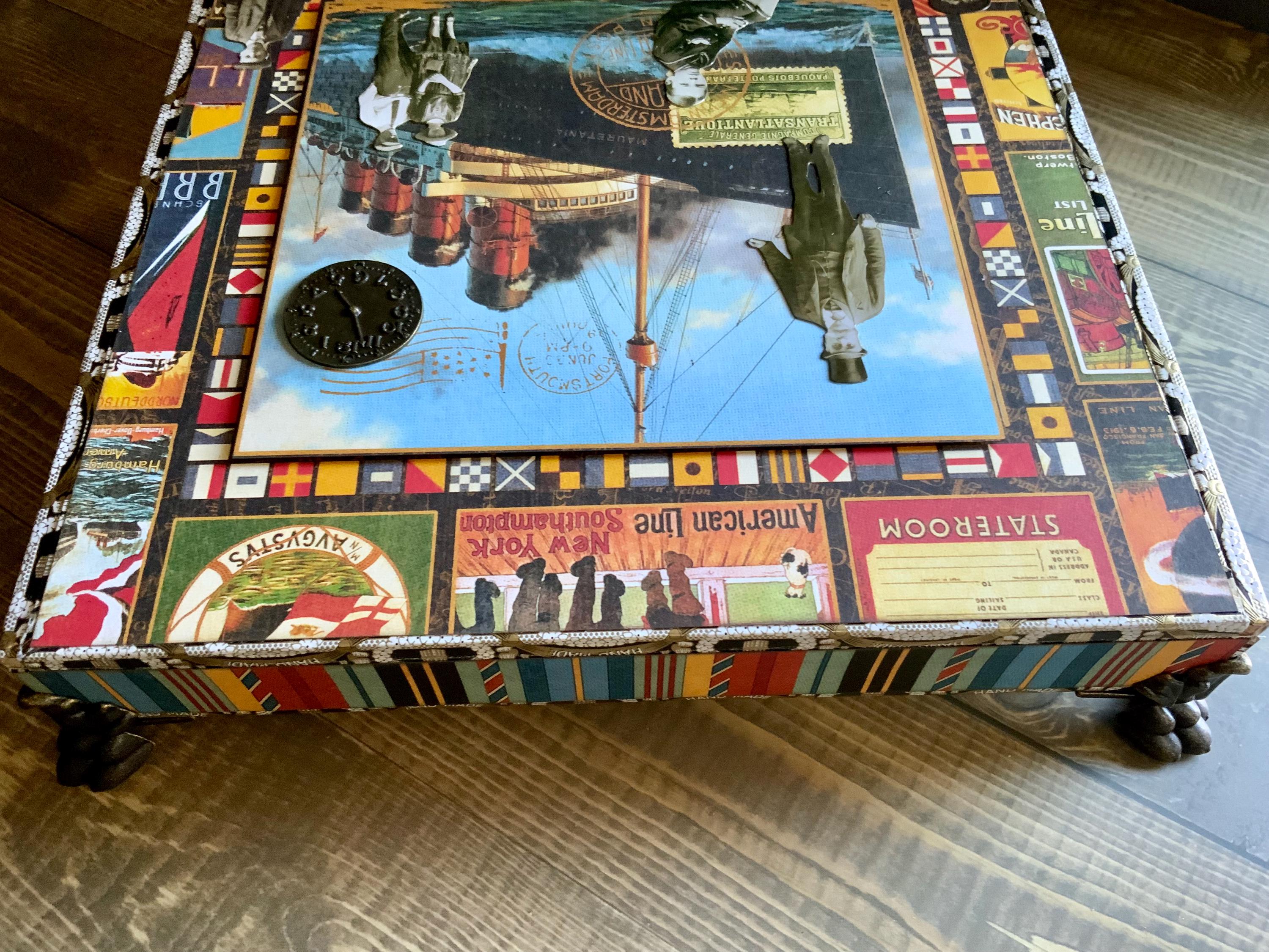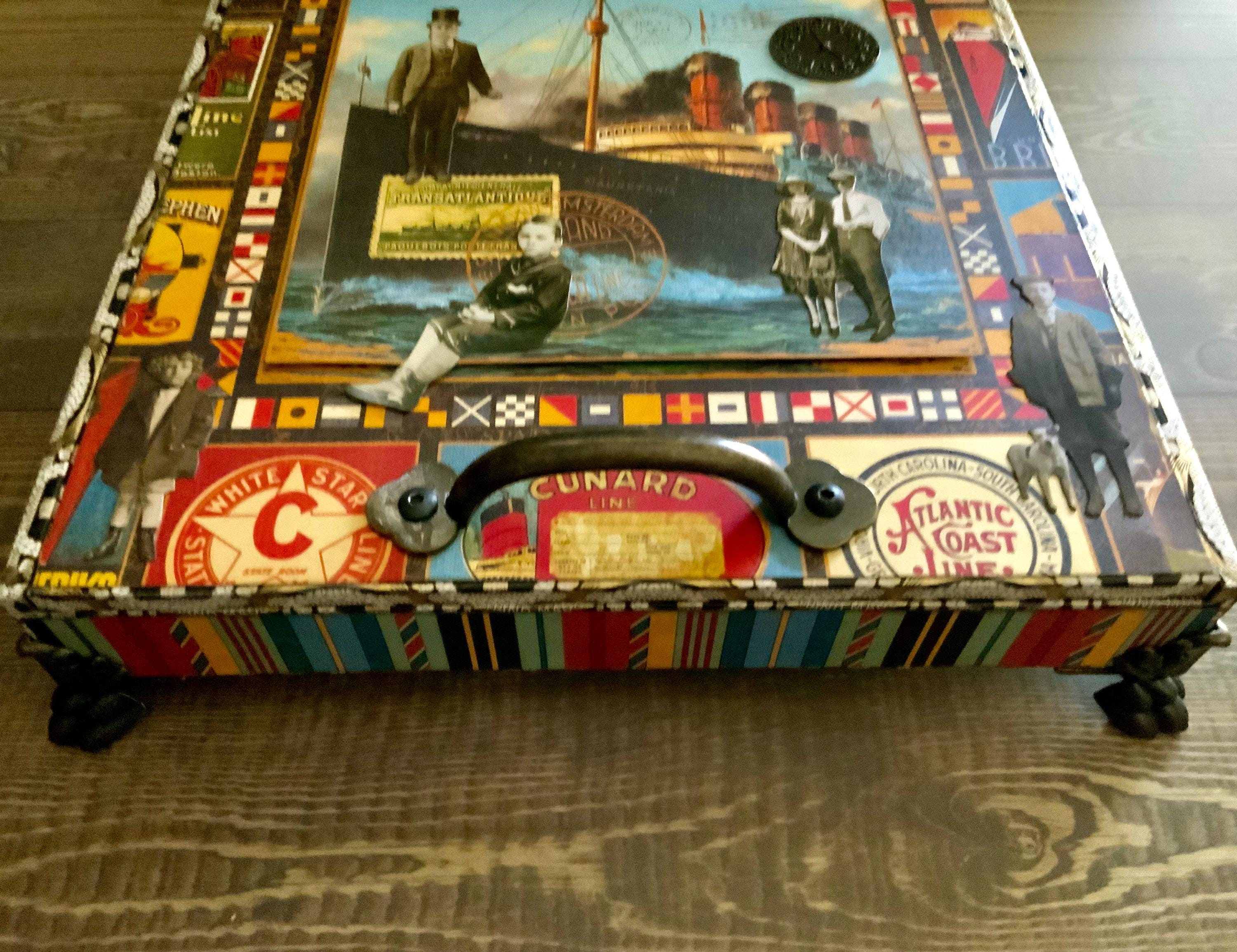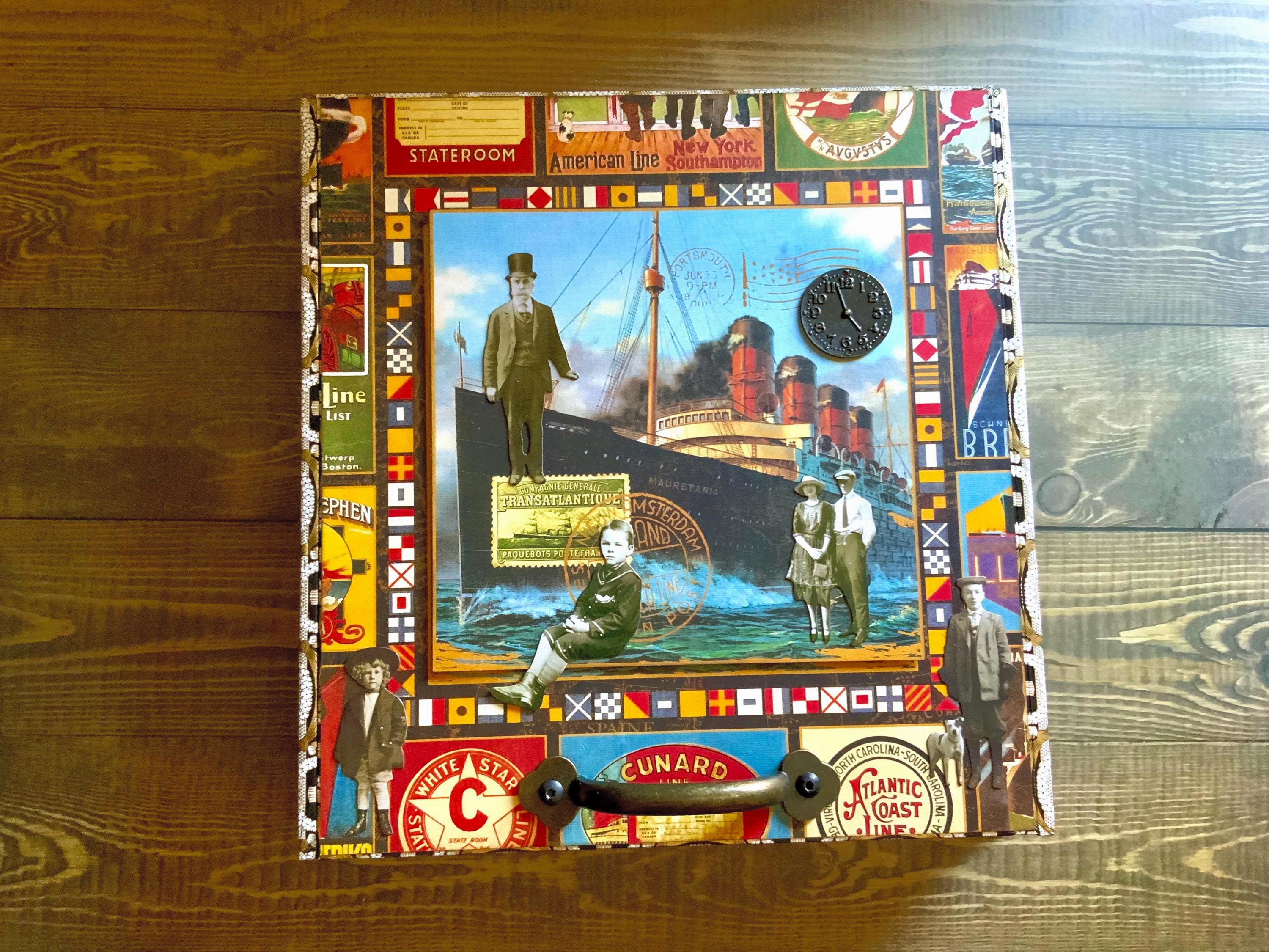 • Mixed media layering on the lid with a striking ocean liner focal image.