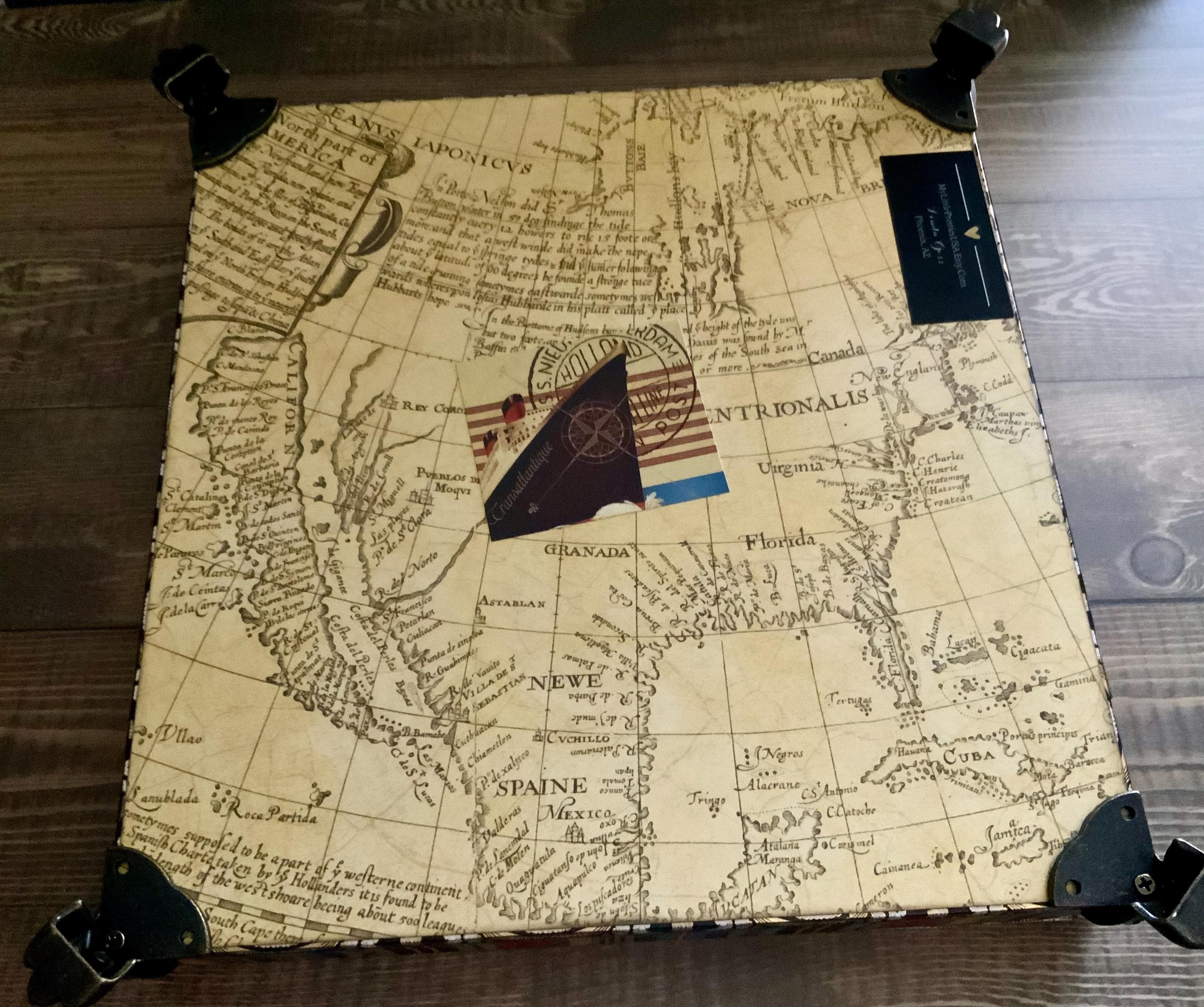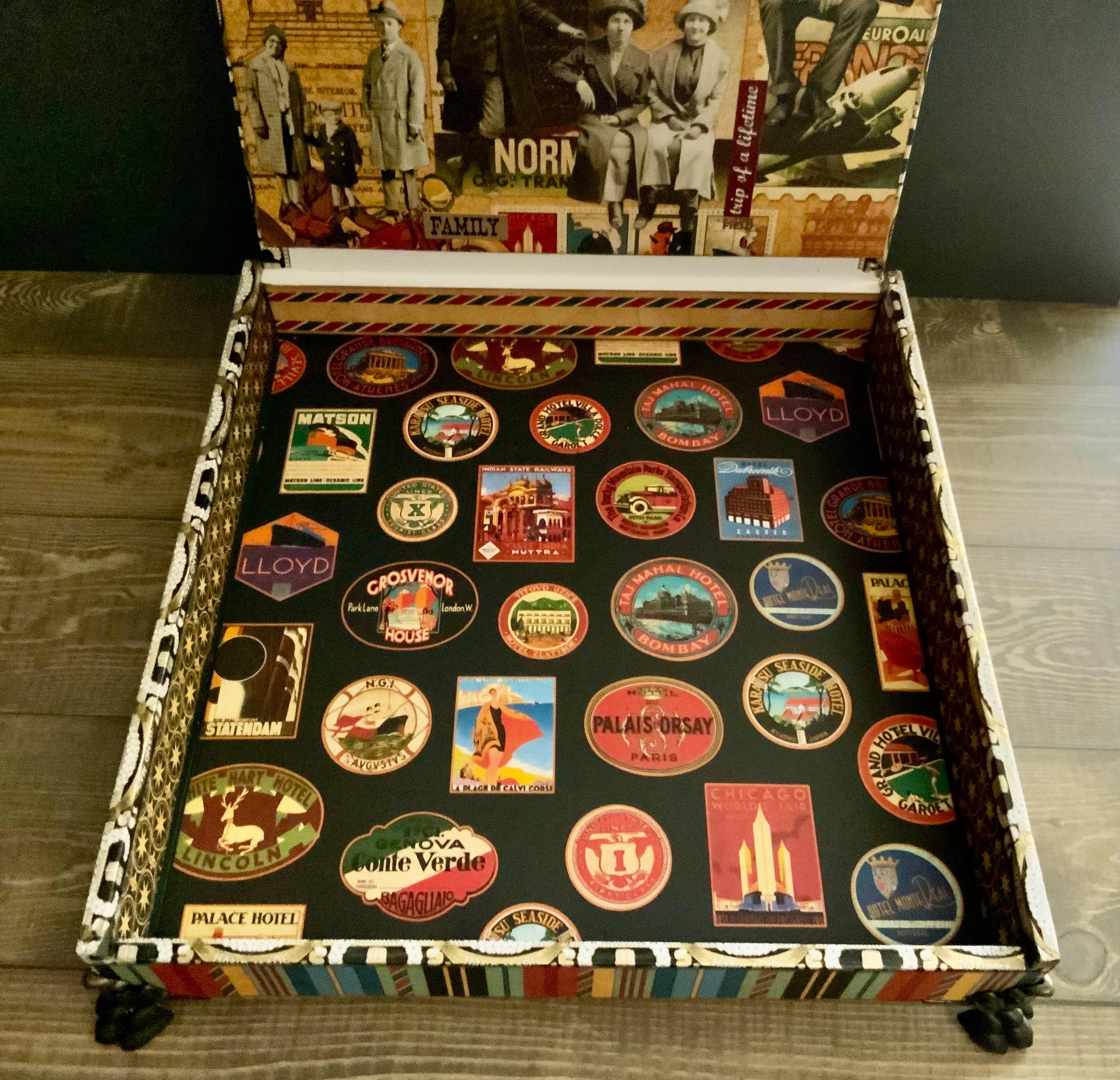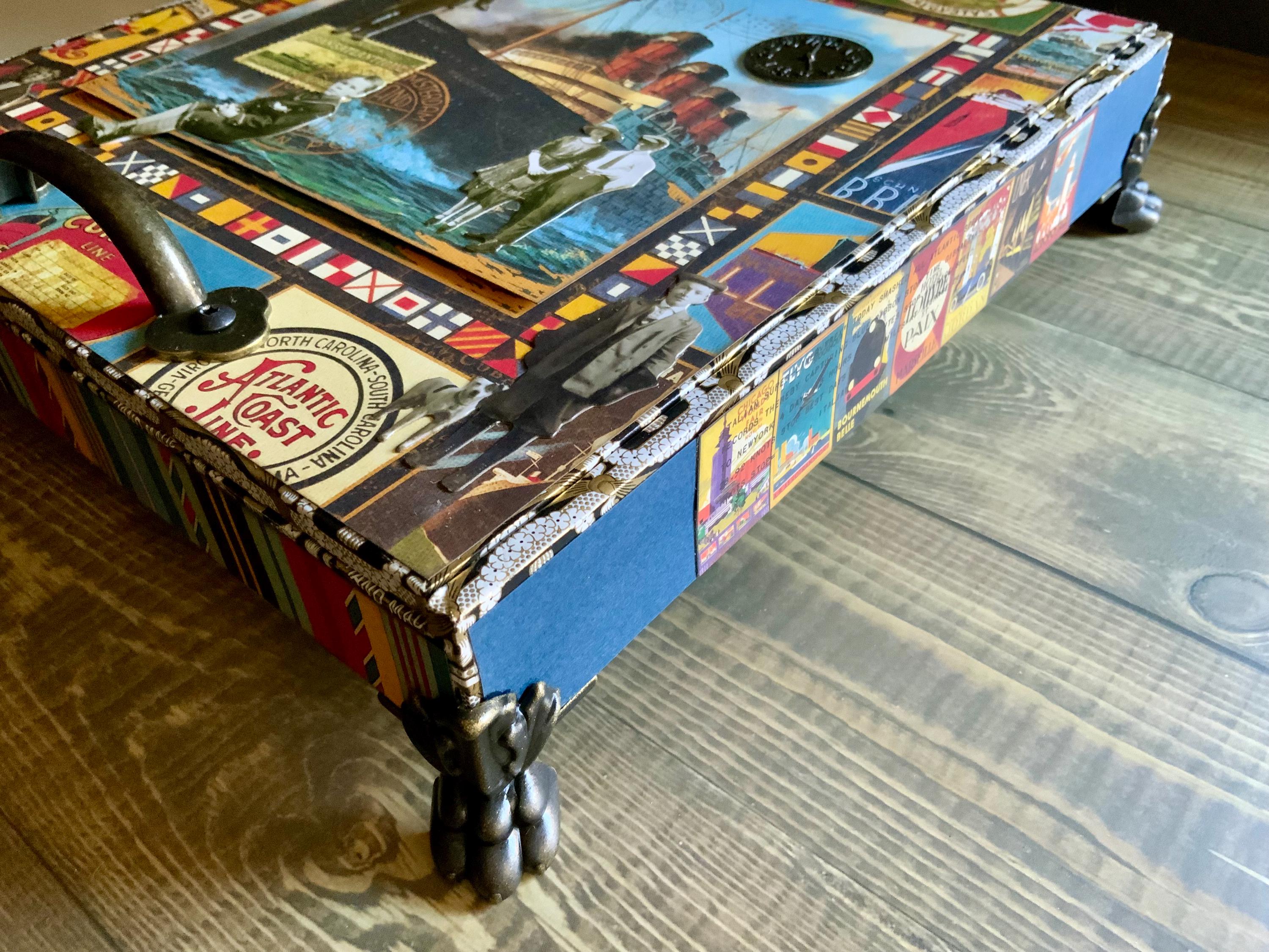 Transatlantique Decorated Cigar Box – 10x10x1.5” Graphic 45 Retired Paper, Vintage Travel Theme, Claw Feet, Collector’s Keepsake Box