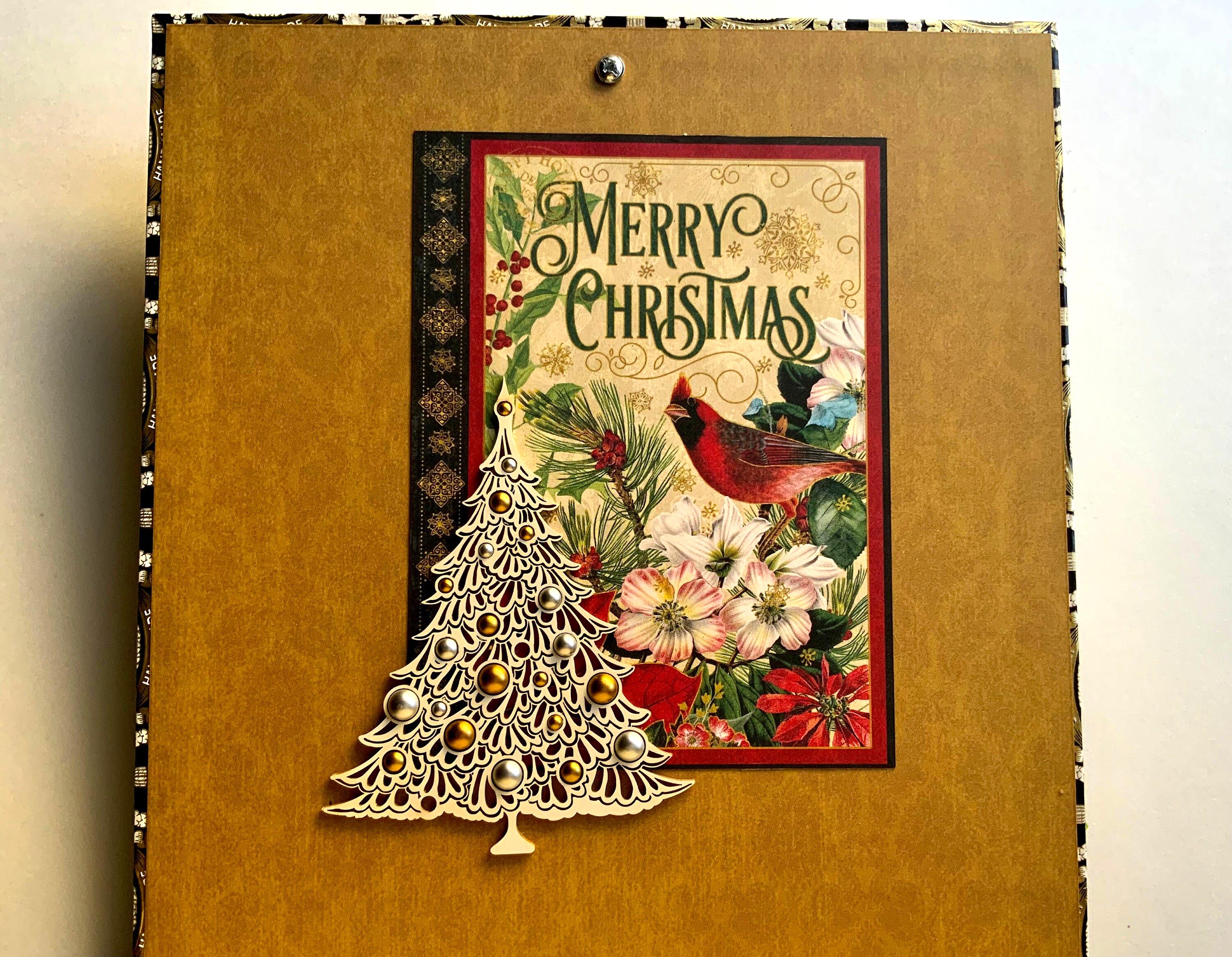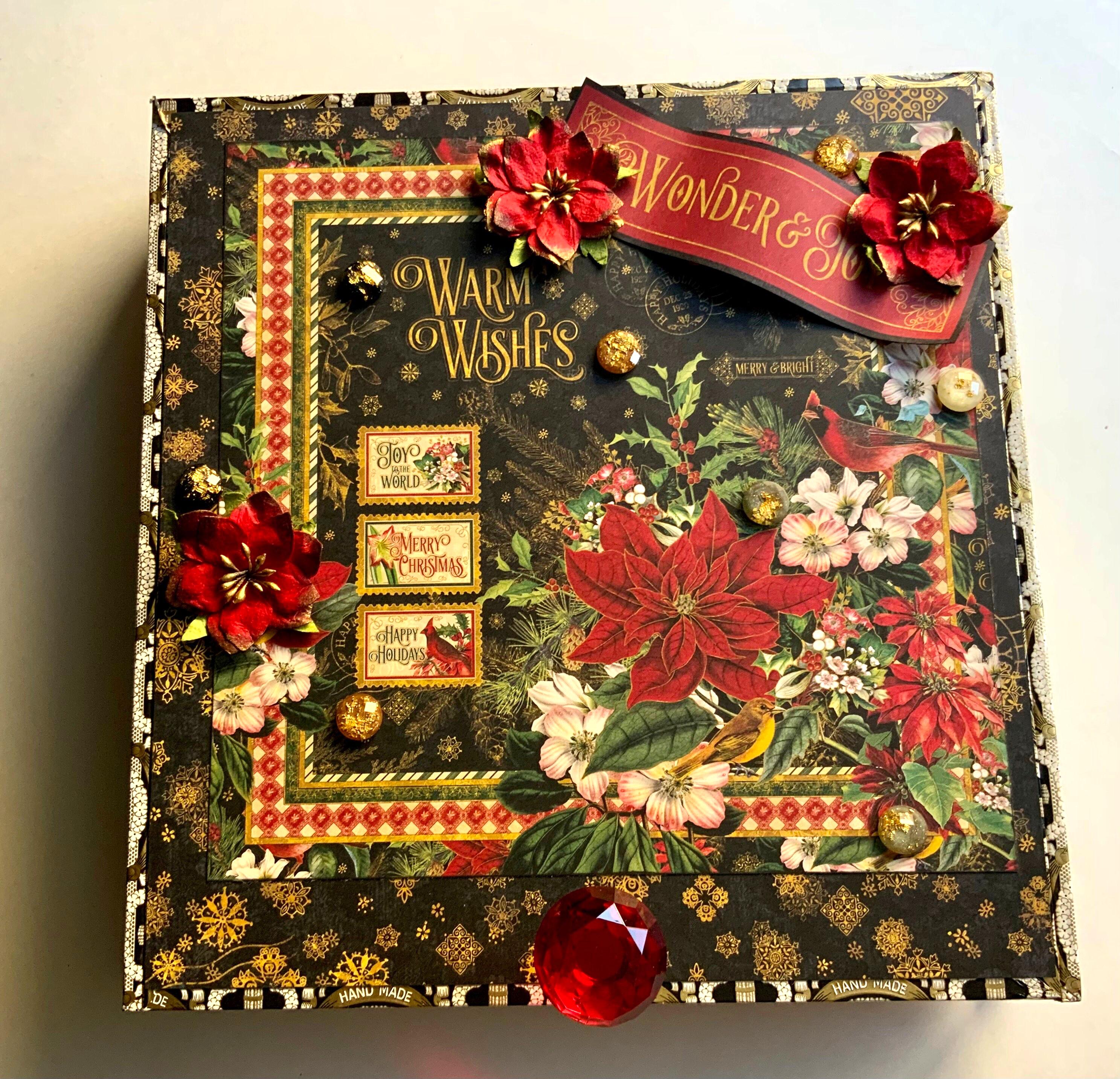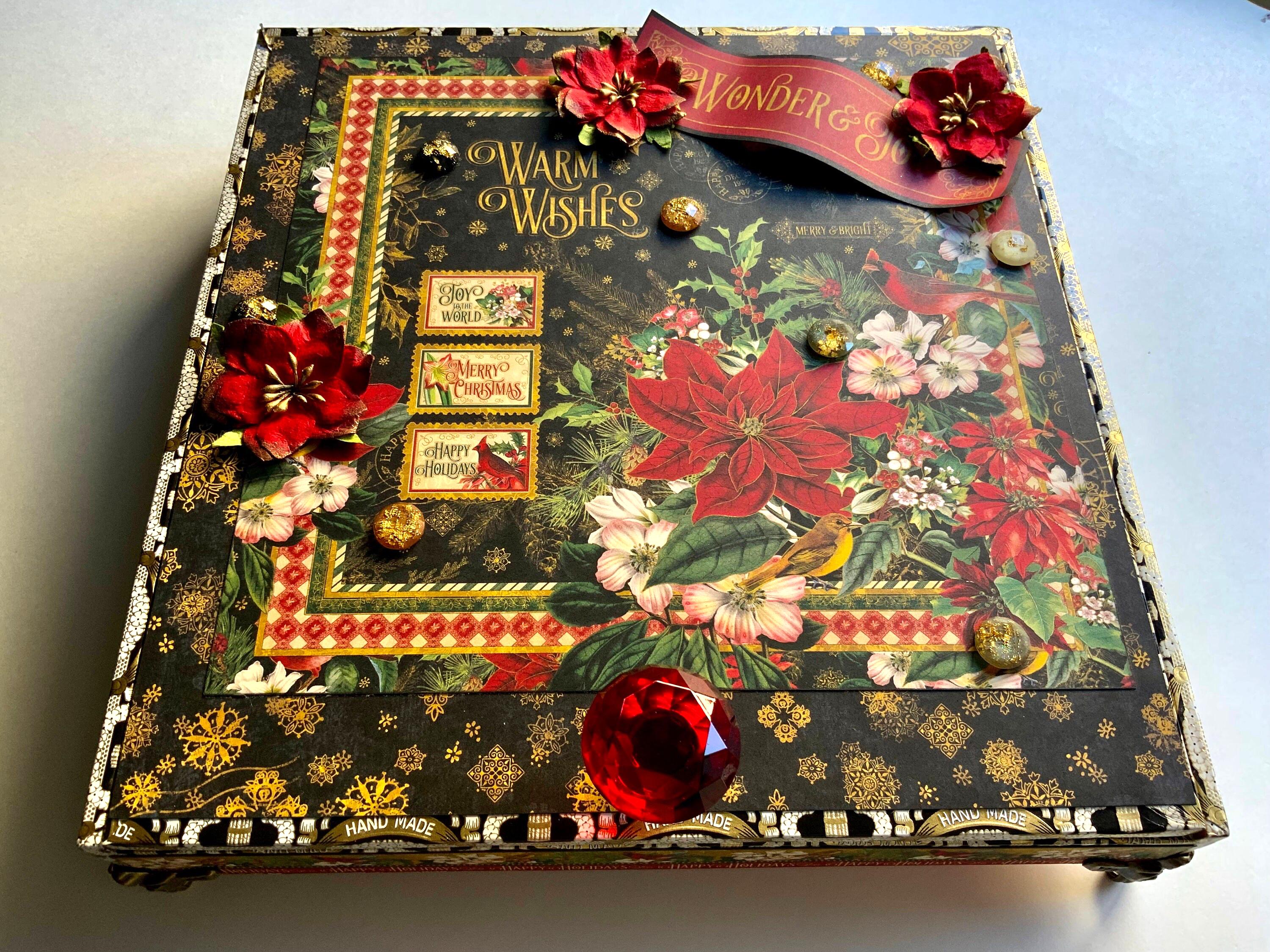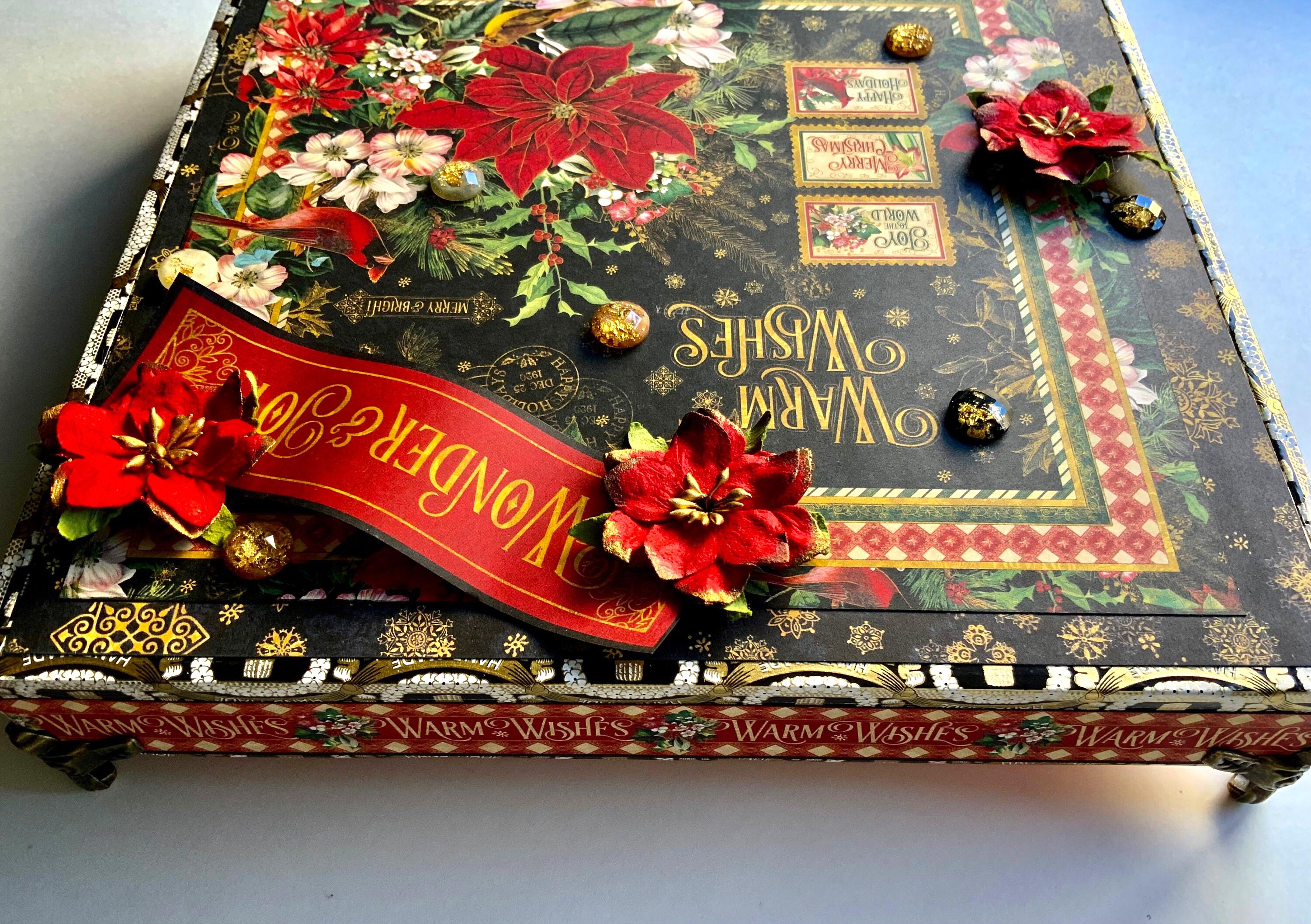 Celebrate the holiday season with this one-of-a-kind decorated cigar box featuring the rich and timeless “Warm Wishes” paper collection from Graphic 45. Designed with vibrant poinsettias, red cardinals, gold snowflake accents, and dimensional embellishments, this keepsake box is both a stunning display piece and a functional storage solution.