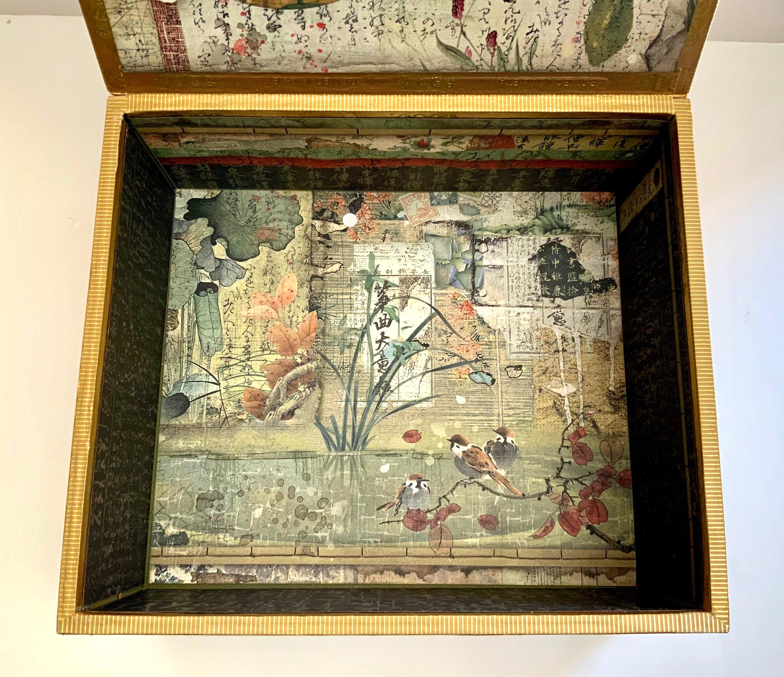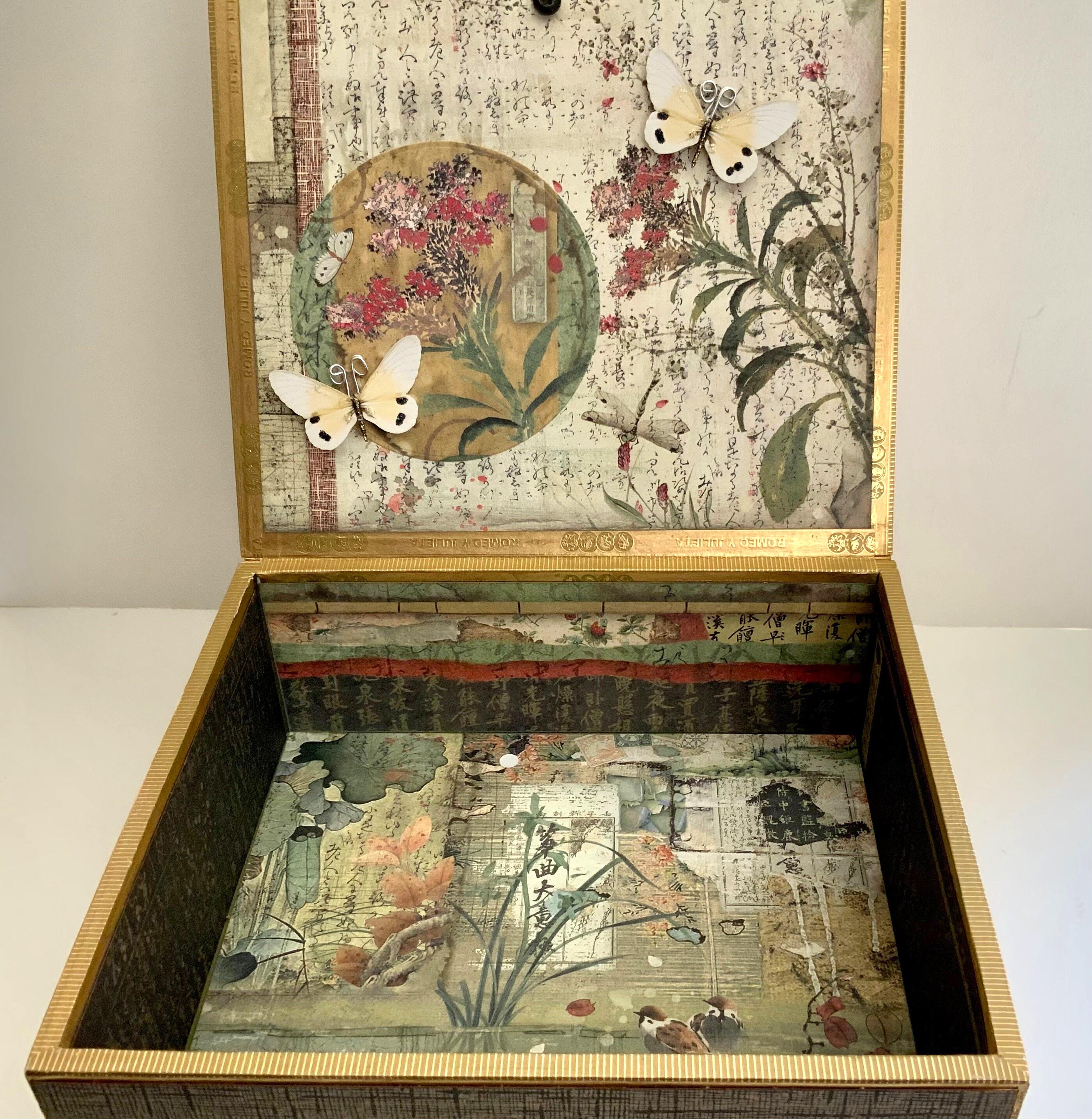 This handcrafted box is a serene blend of elegance and nature, inspired by traditional Asian art. Decorated with soft floral prints, flowing calligraphy, and delicately layered butterflies, this upcycled cigar box is both functional and enchanting.