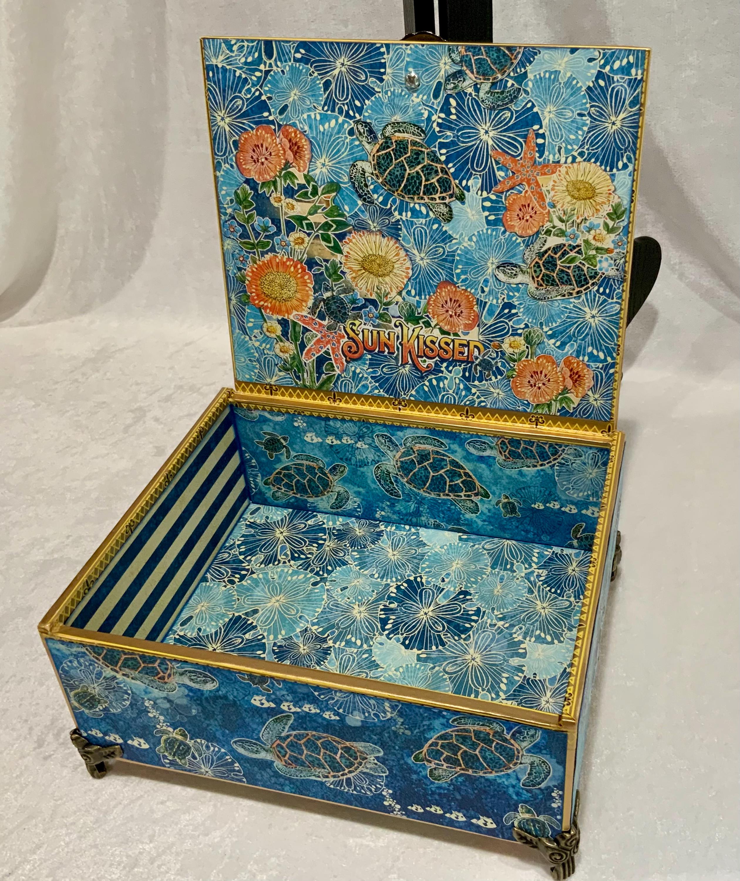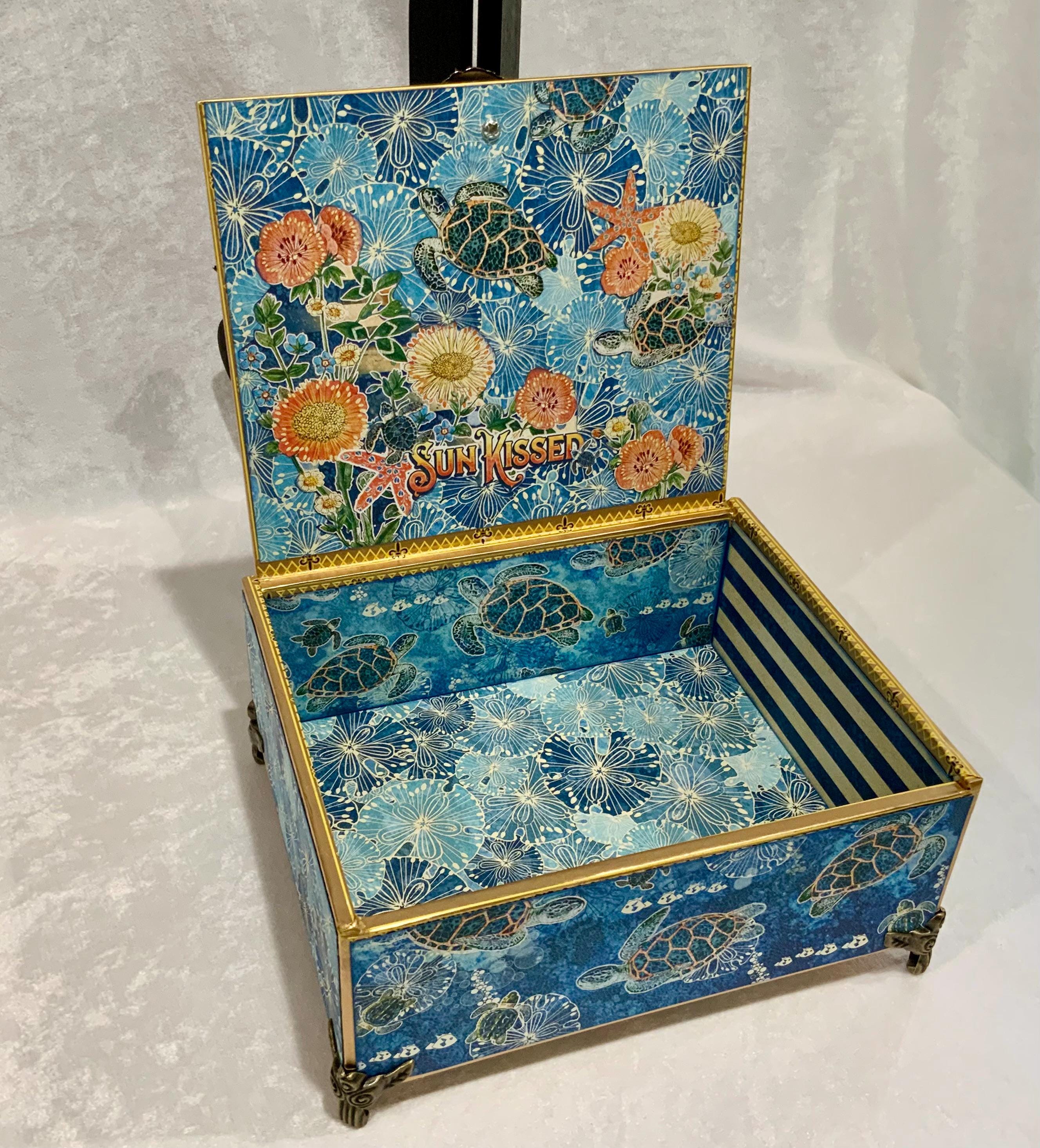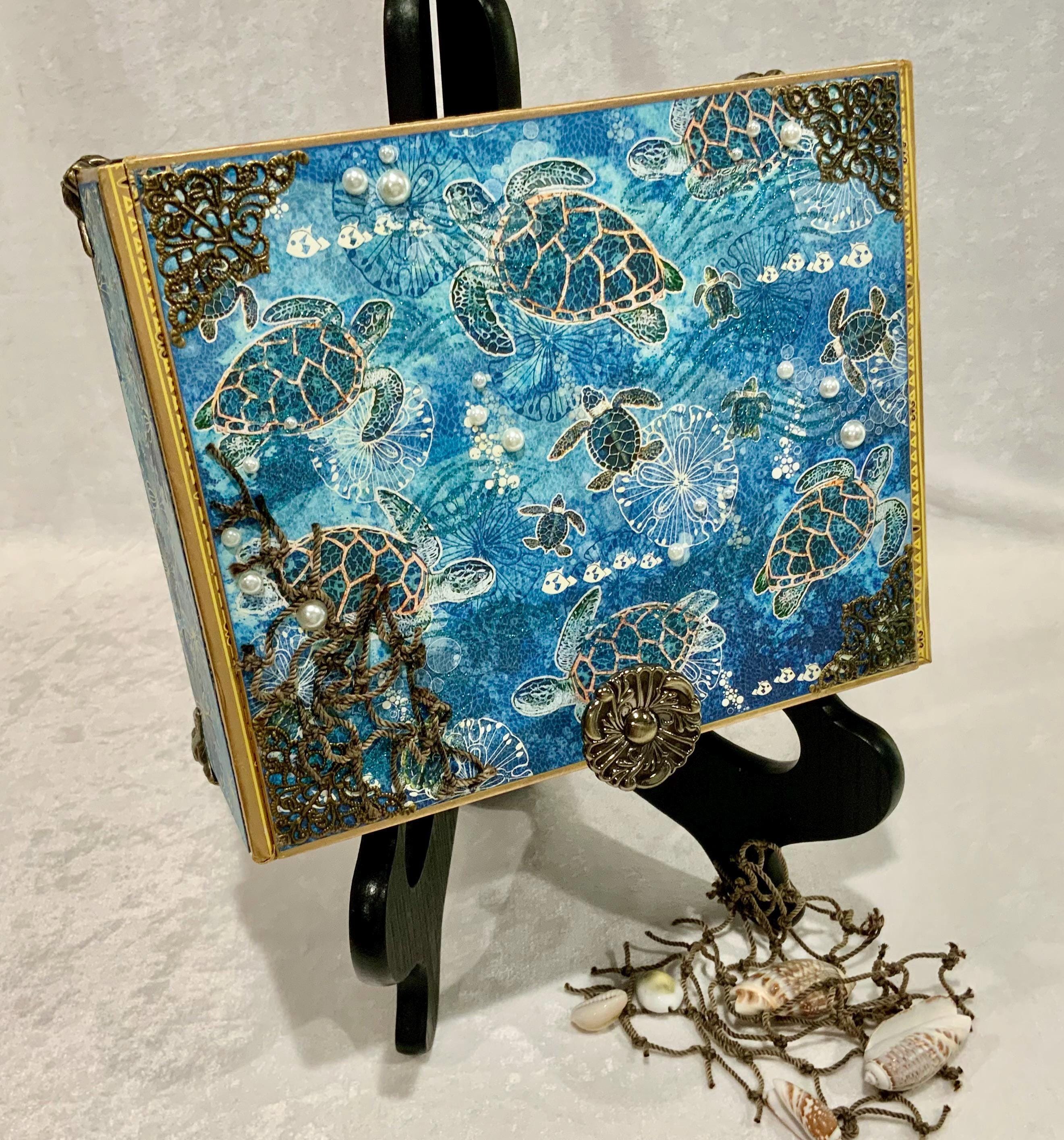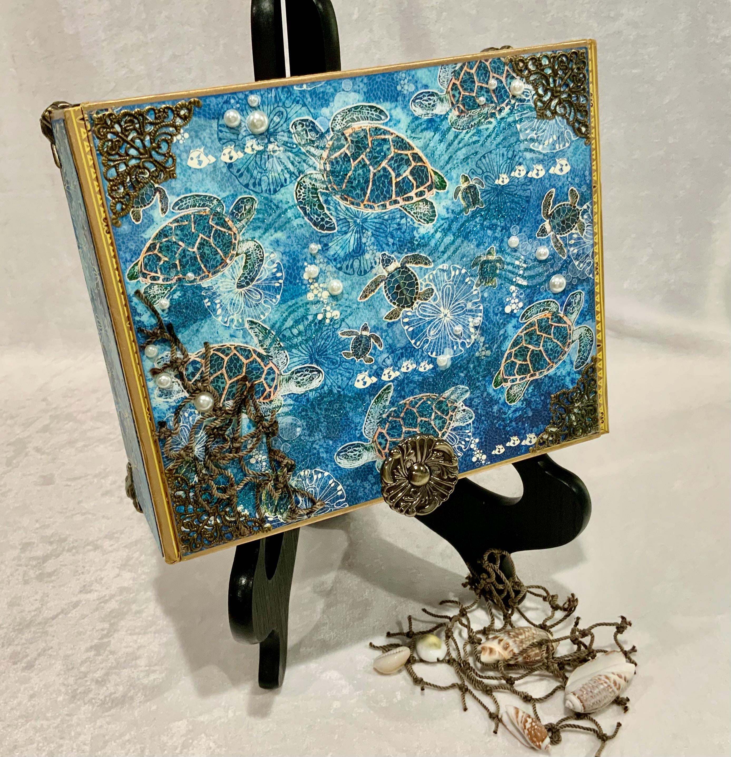 This one-of-a-kind 8x6.5x3” keepsake cigar box was created using the retired Graphic 45 Sun-Kissed paper collection, featuring vibrant sea turtles swimming across ocean-blue backgrounds. The lid is hand-stenciled using blue sparkle paste, forming subtle wave patterns that shimmer as the light moves across the surface.