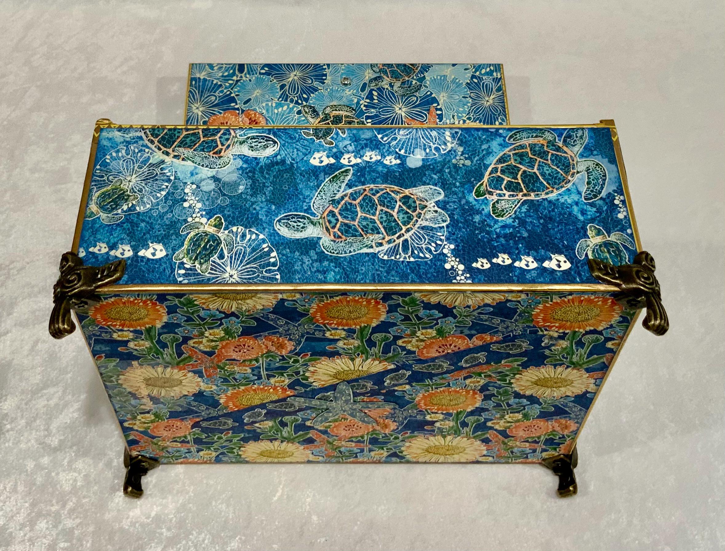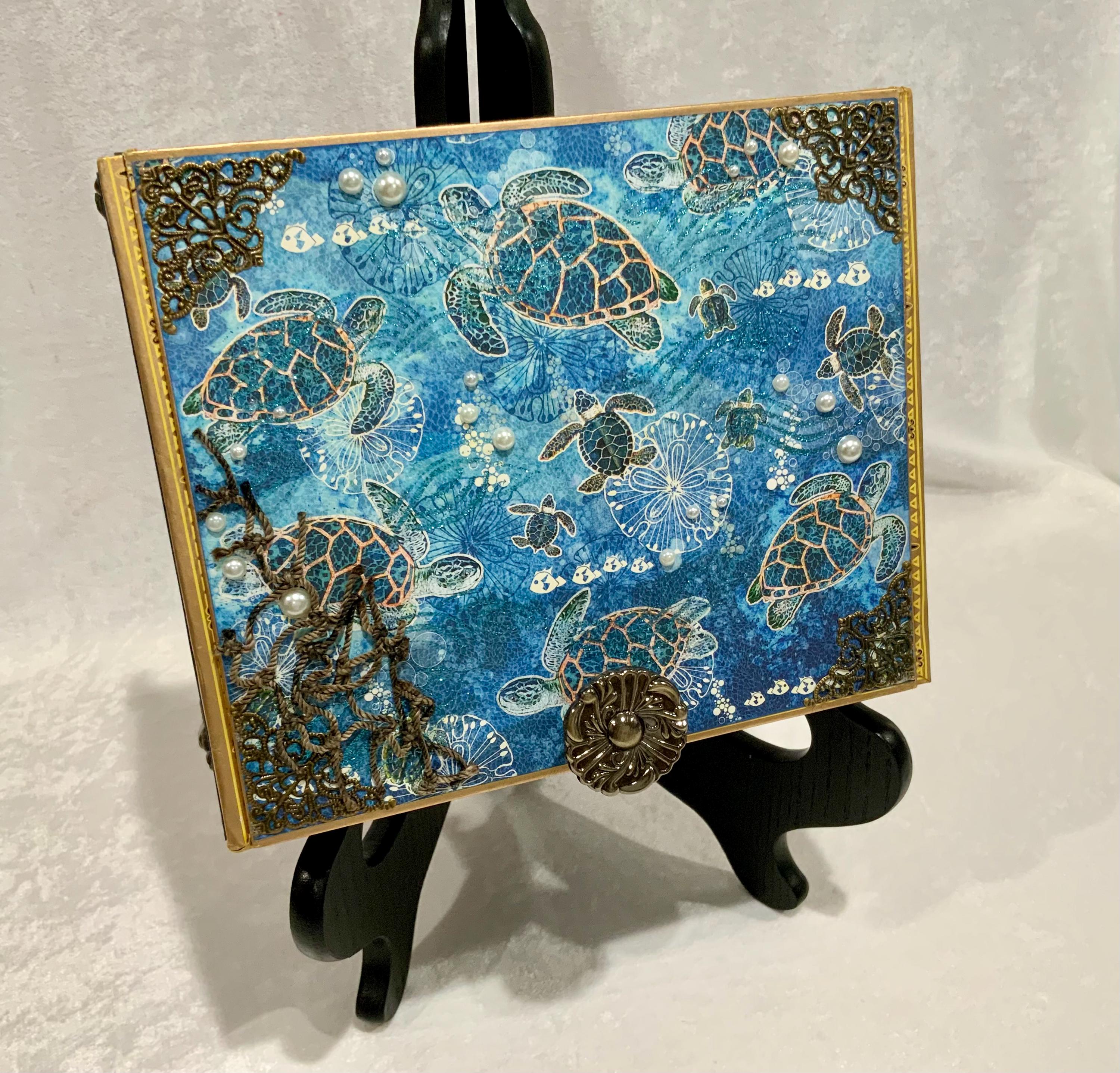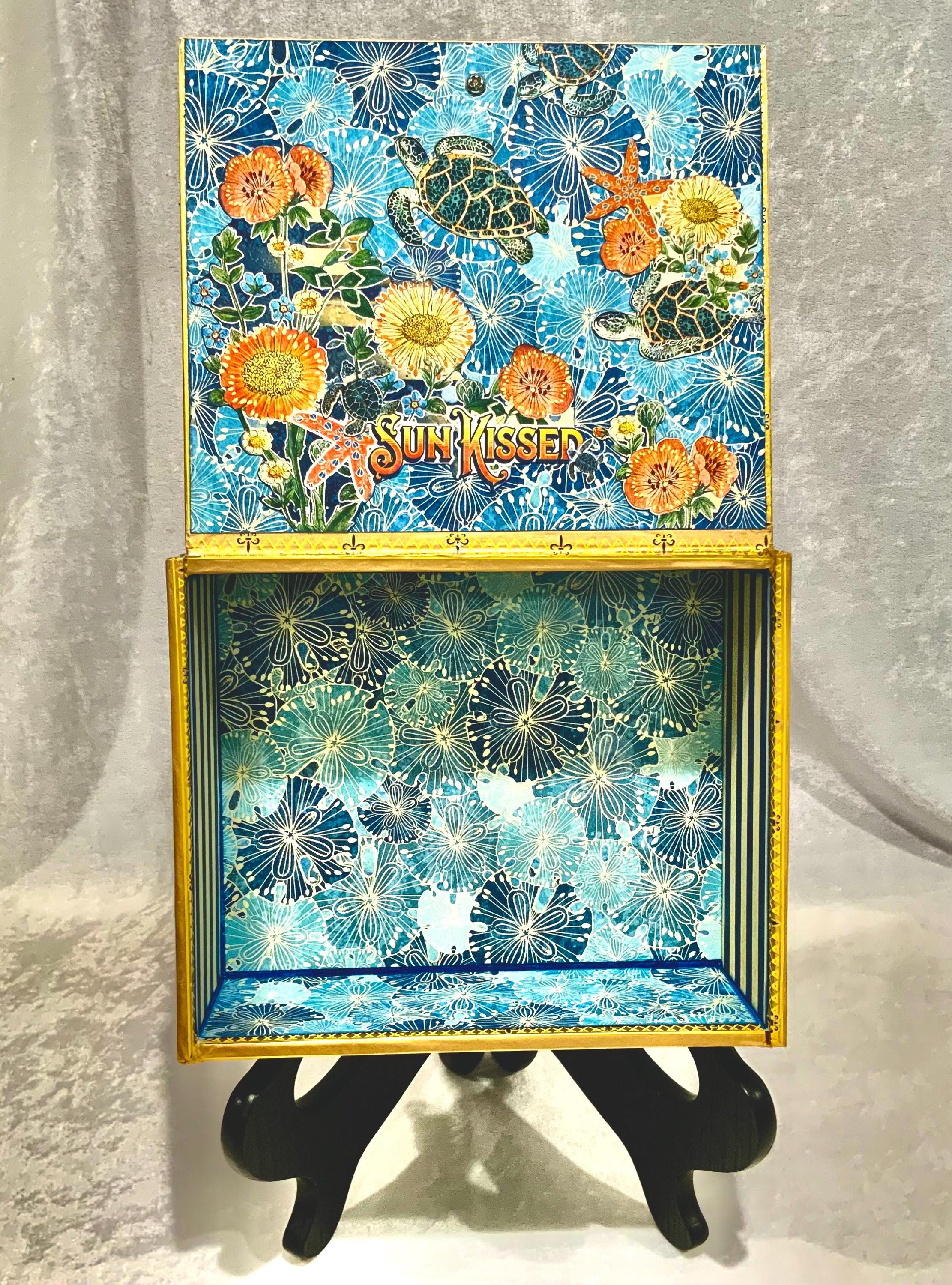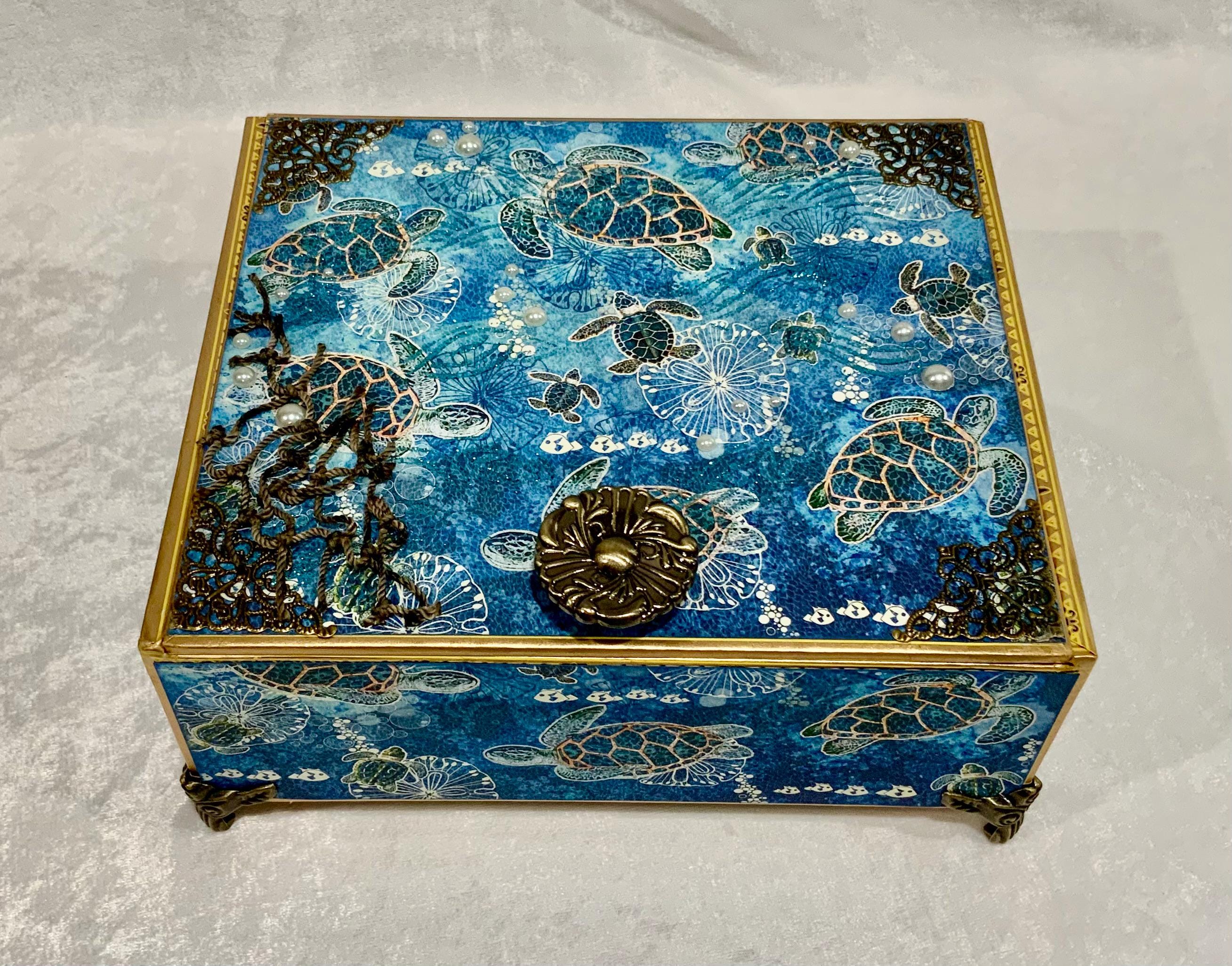 This one-of-a-kind 8x6.5x3” keepsake cigar box was created using the retired Graphic 45 Sun-Kissed paper collection, featuring vibrant sea turtles swimming across ocean-blue backgrounds. The lid is hand-stenciled using blue sparkle paste, forming subtle wave patterns that shimmer as the light moves across the surface.