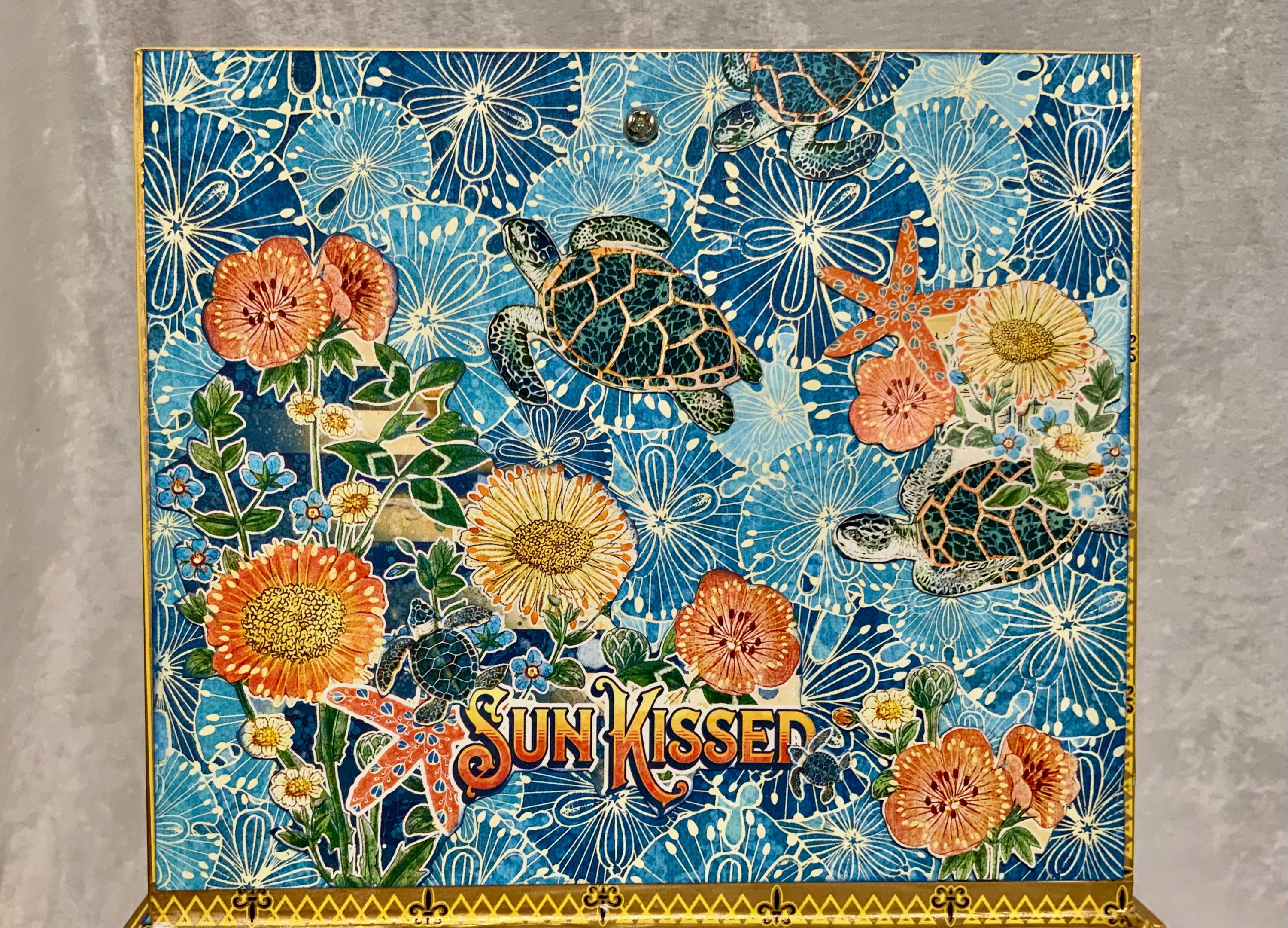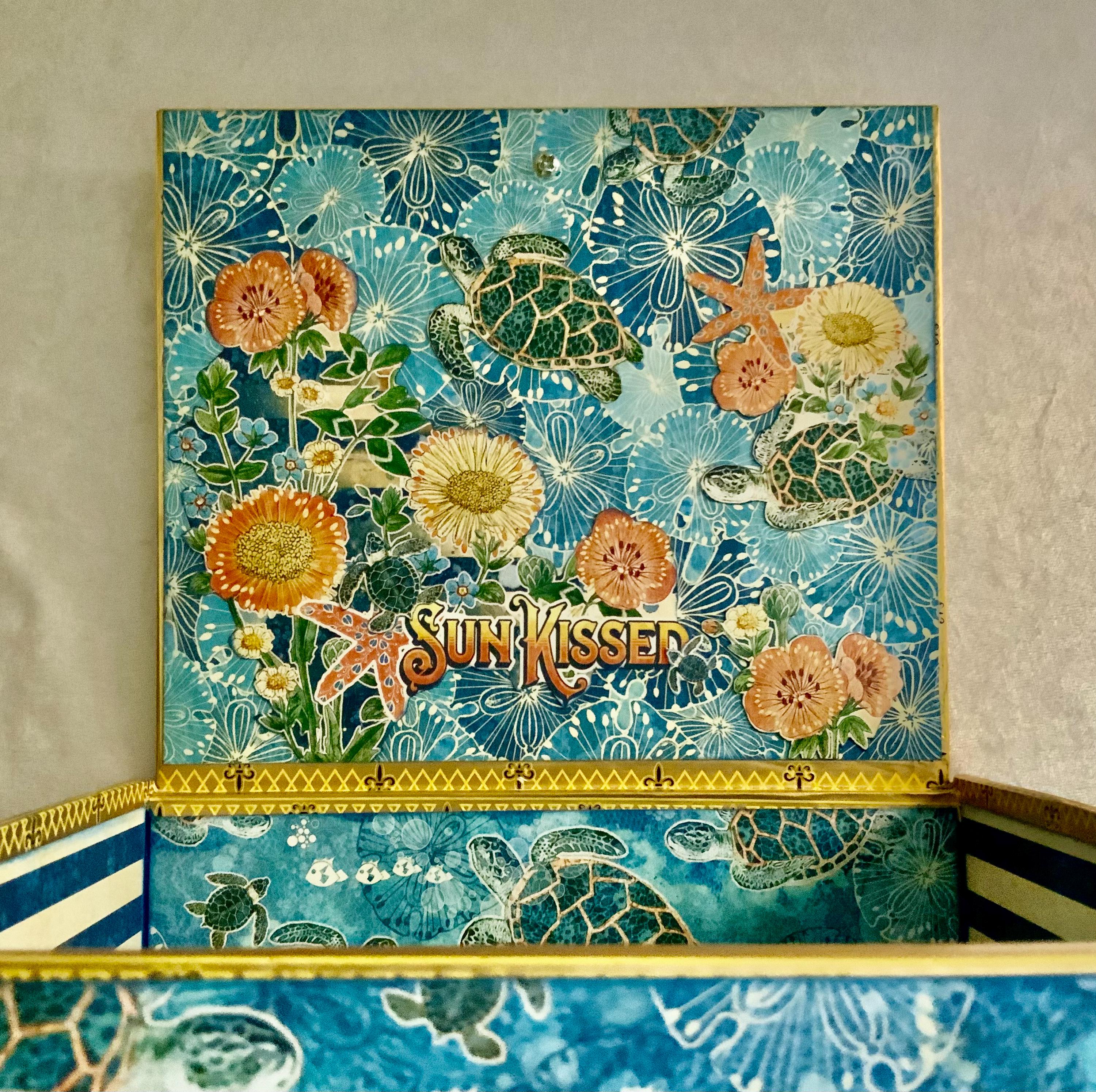 Inside, the coordinating Sun-Kissed papers continue the ocean theme, including sea turtles, coral florals, and a cheerful “Sun-Kissed” motif. Borders, edges, and trims are meticulously finished to ensure a polished, high-quality piece from every angle.