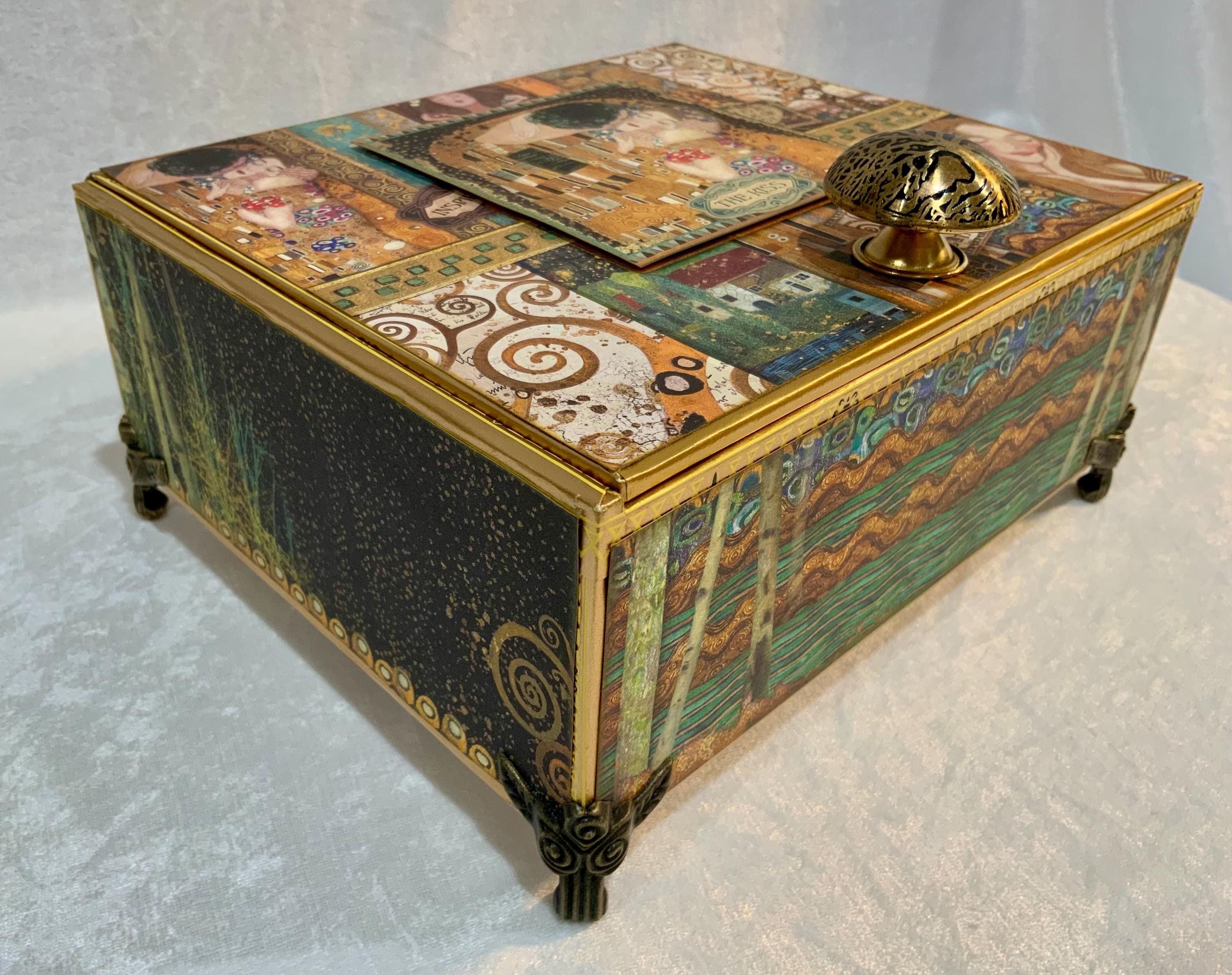 This handmade 8x6.5x3 decorated cigar box is inspired by the timeless elegance of Gustav Klimt’s artwork. The pictures show a custom listing. Your order will be custom-made for you within 2 weeks.