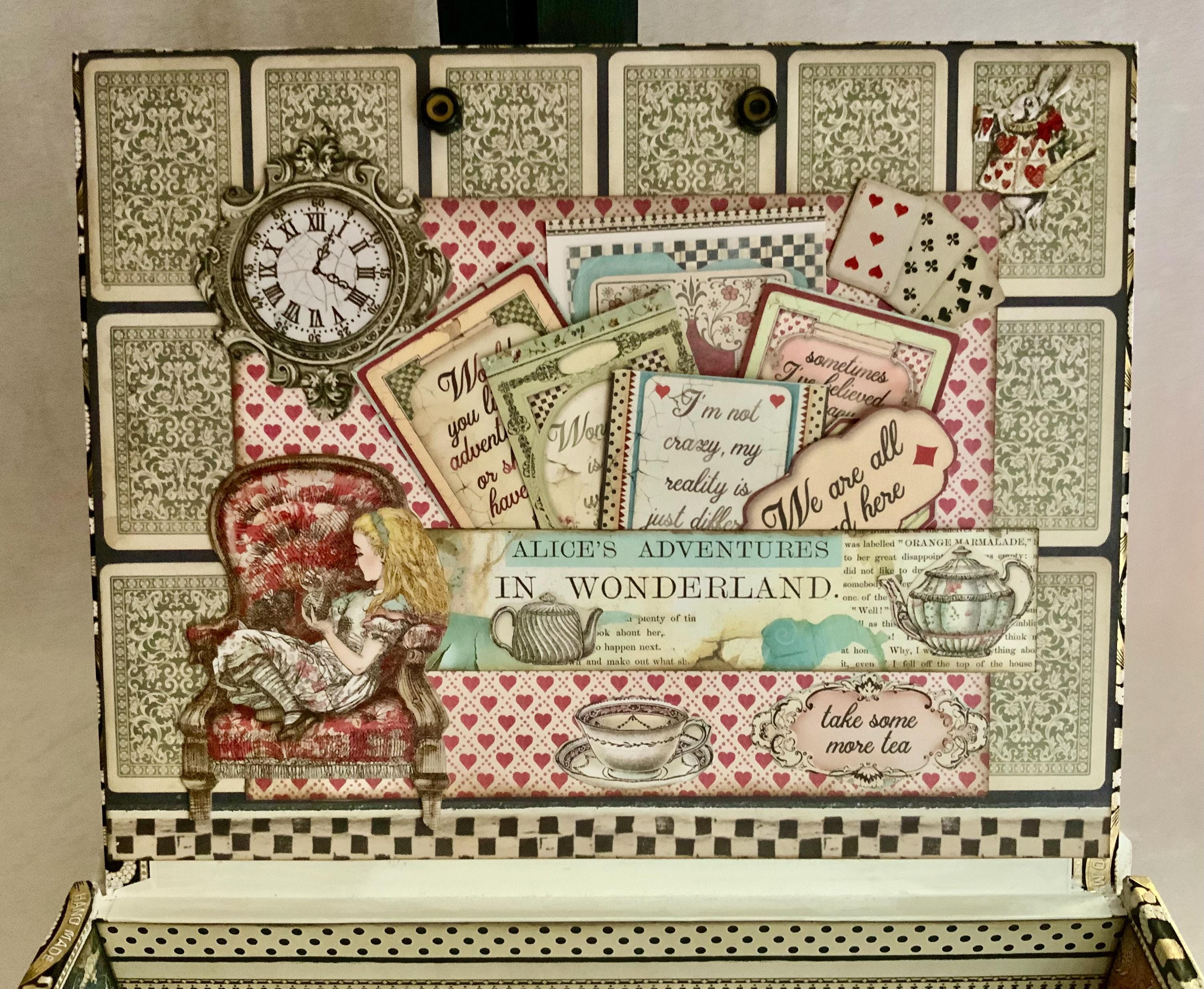 There are various embellishments coordinating with the Alice theme. The inside of the lid is just as amazing as the lid! So cute!
