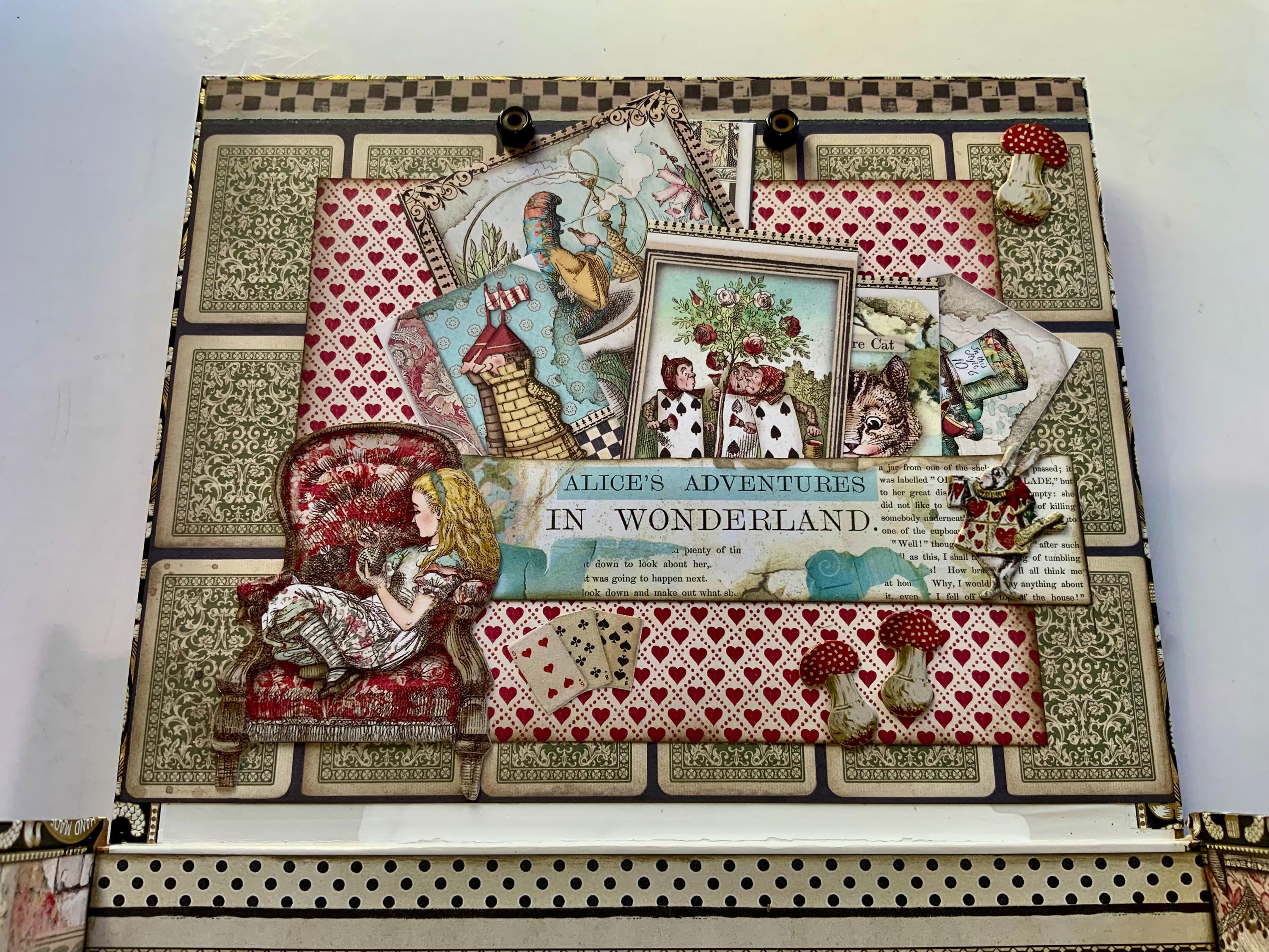 Fall down the rabbit hole with this enchanting handmade keepsake box, inspired by Alice’s Adventures in Wonderland. Upcycled from a real wooden cigar box, it’s richly detailed with iconic tea party imagery, classic characters, and charming Victorian embellishments. From checkerboard trims to layered paper textures, every detail tells a story.