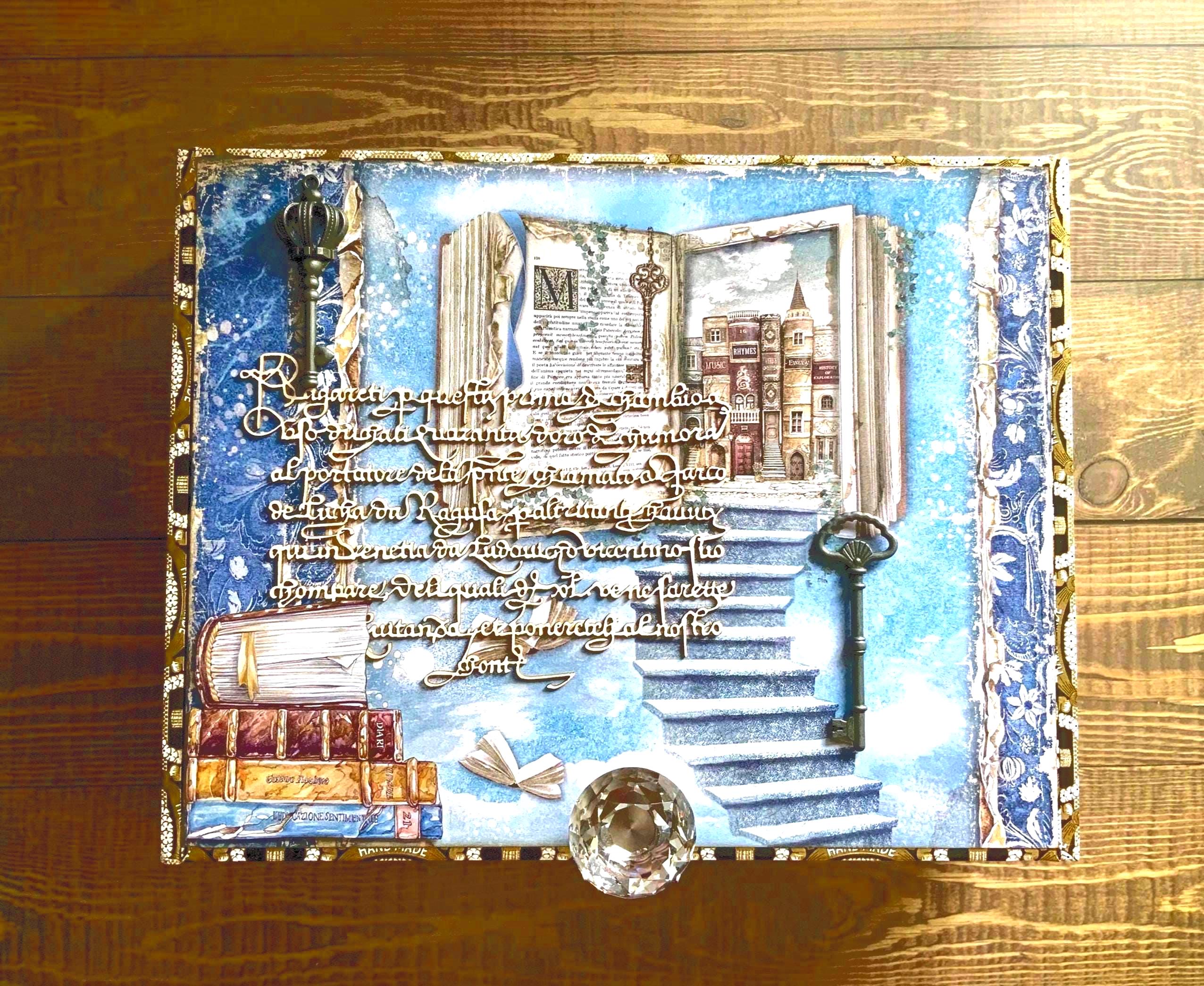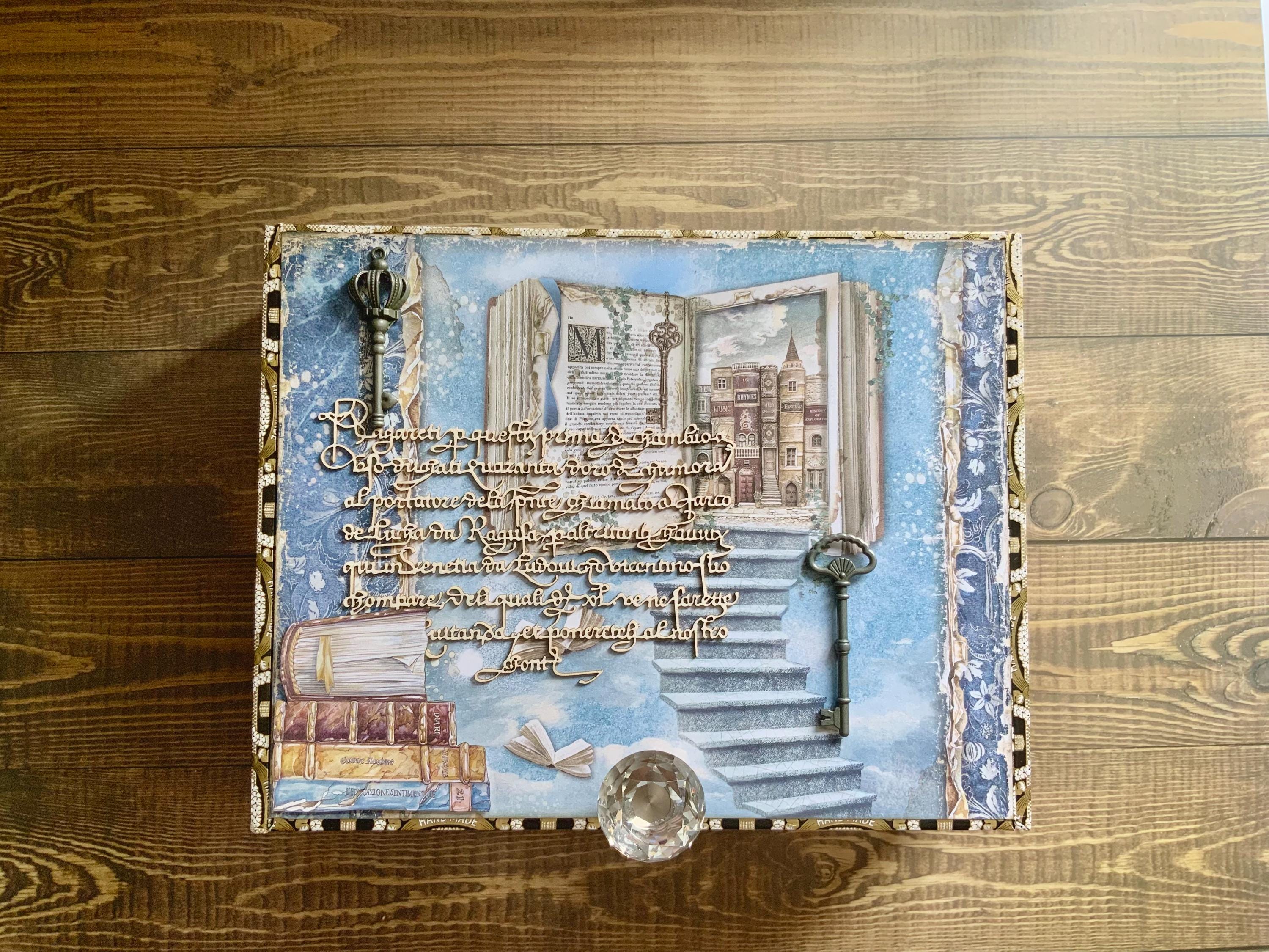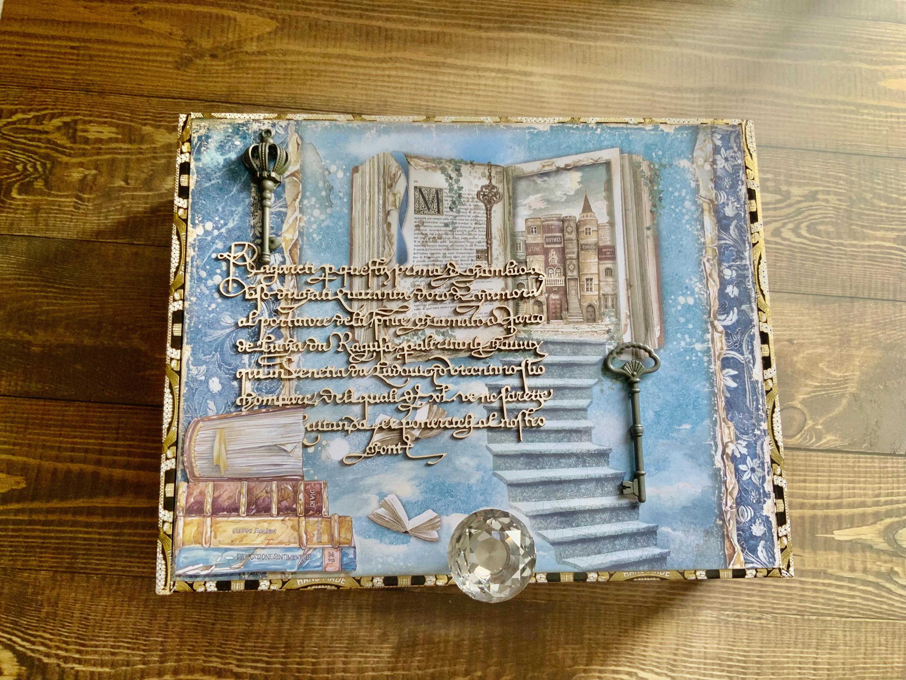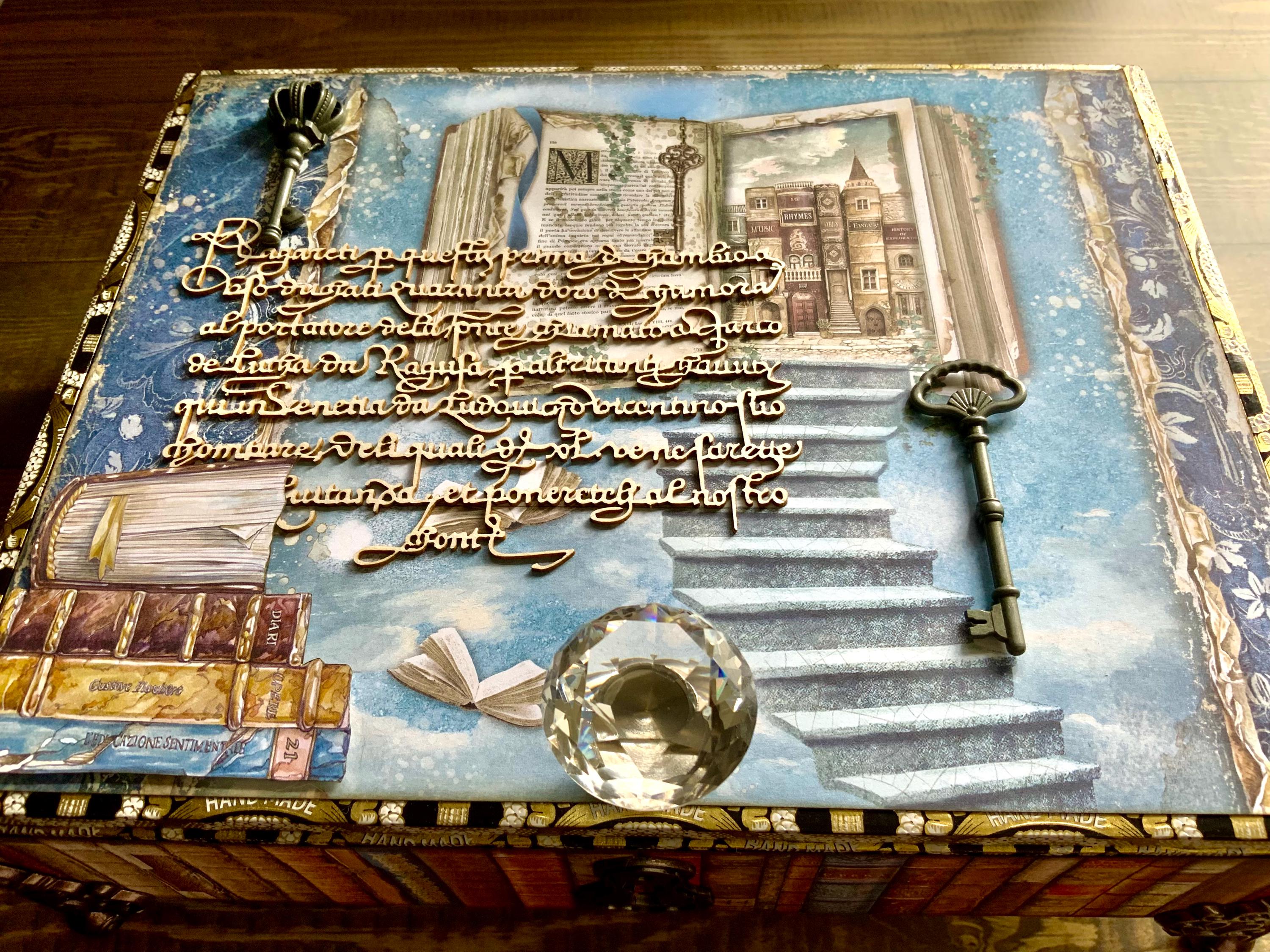 Materials: Stamperia papers, metal embellishments, keys, crystal knob, gold trim, metal feet