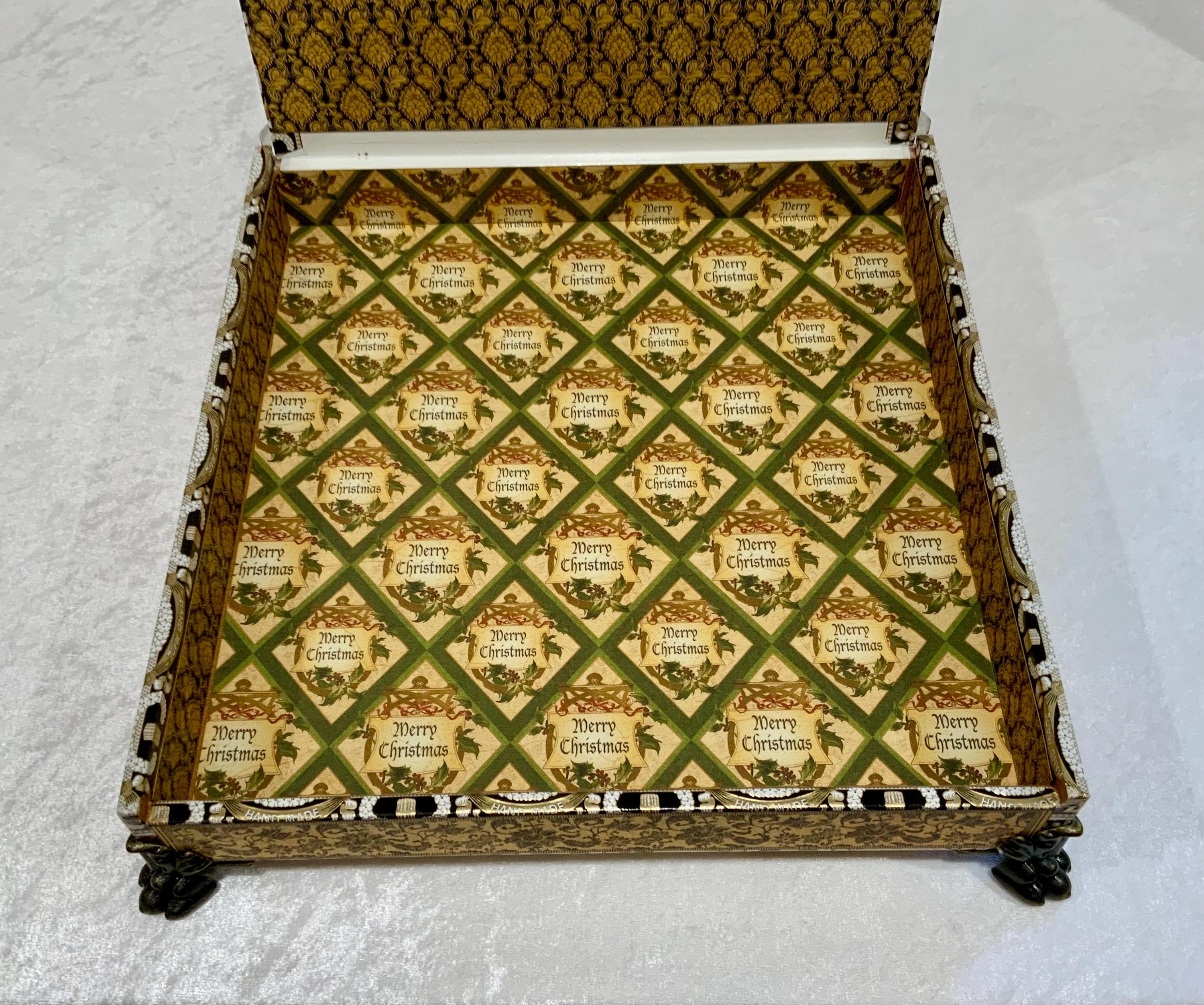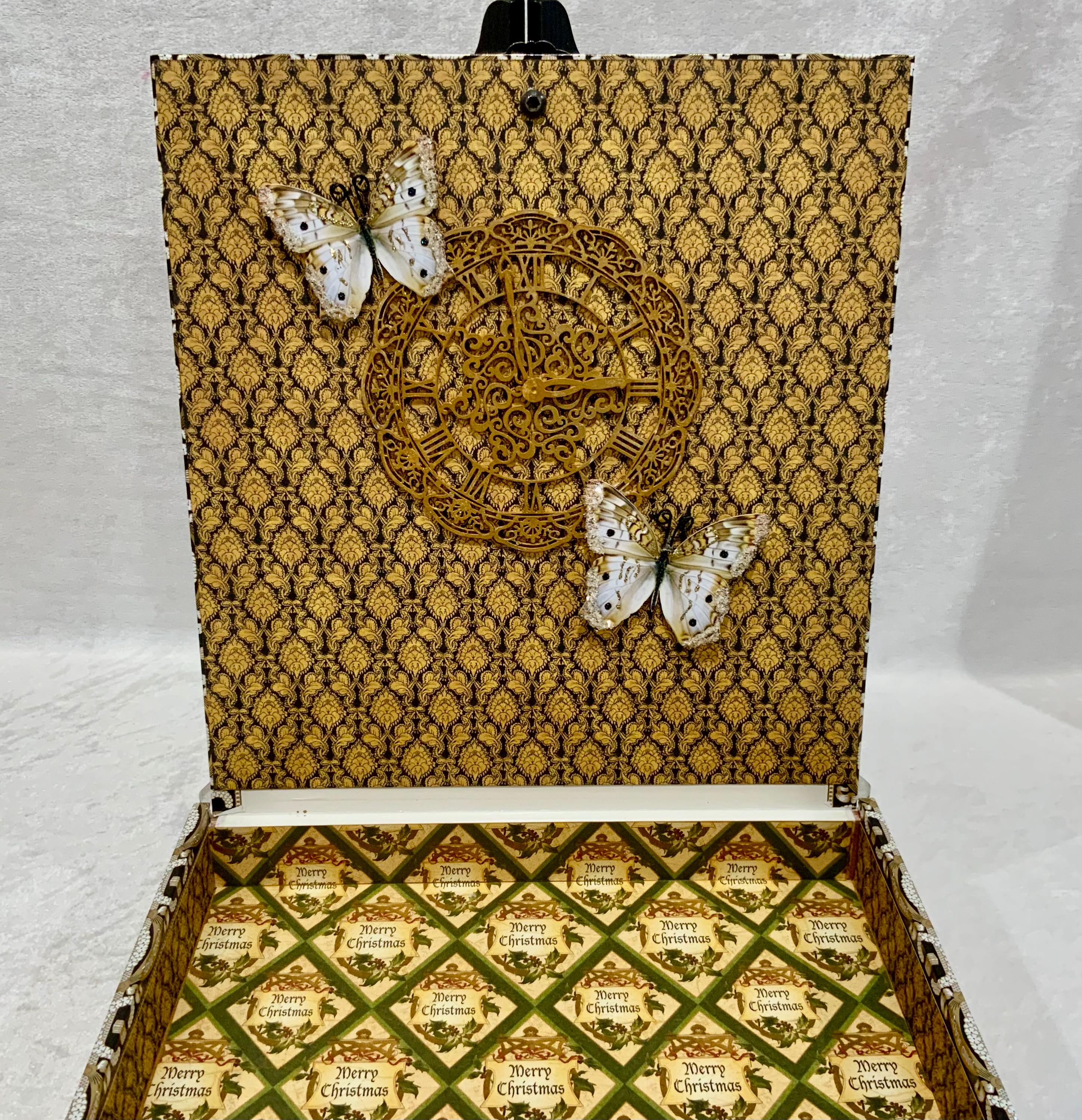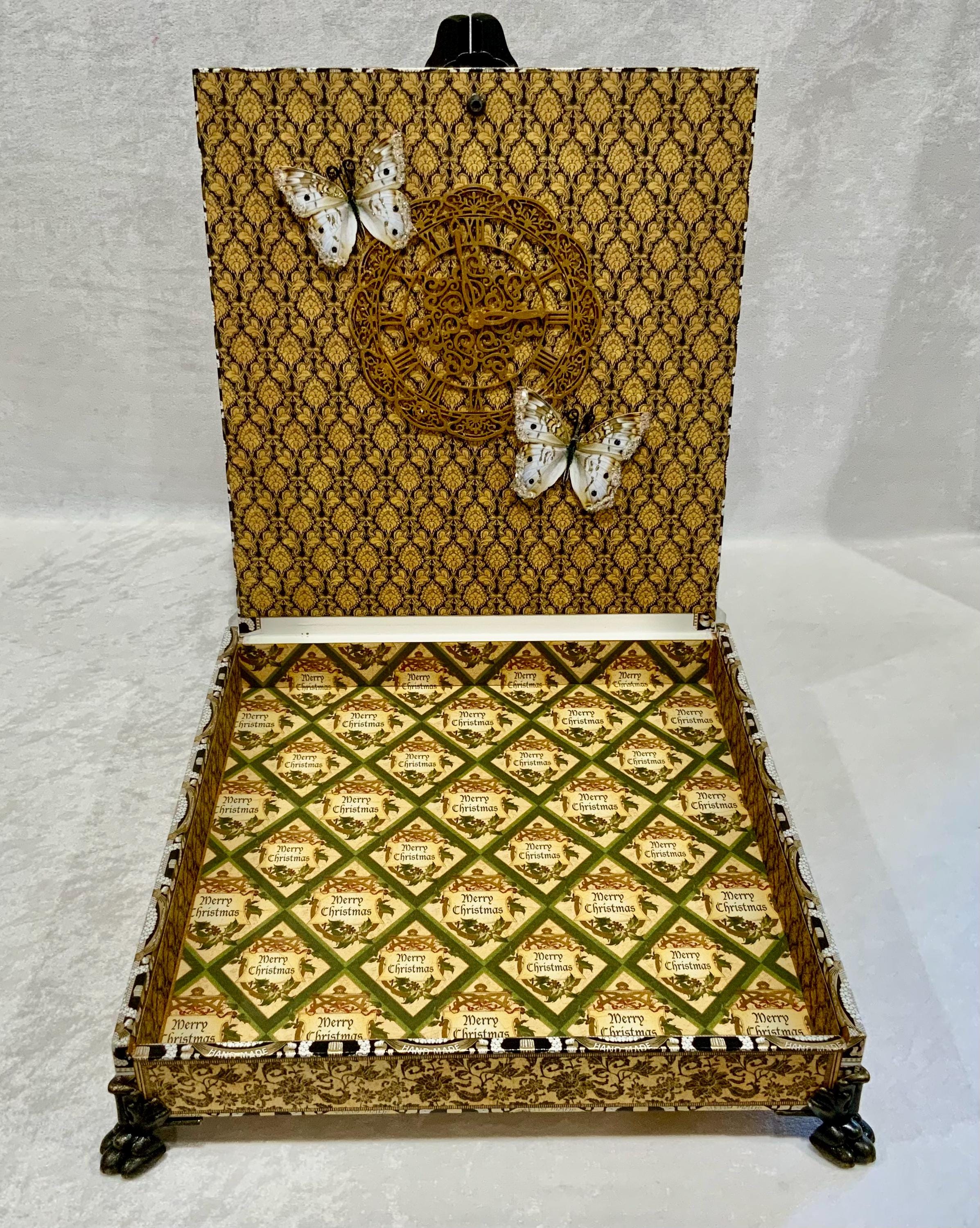 Inside, the fully lined box reveals a festive “Merry Christmas” patterned interior with rich green, gold, and parchment tones. The interior lid features a dimensional vintage clock and delicate white butterflies, adding timeless detail. Finished with antiqued bronze metal feet, and a decorative knob, this piece brings grace and nostalgia to any holiday setting.