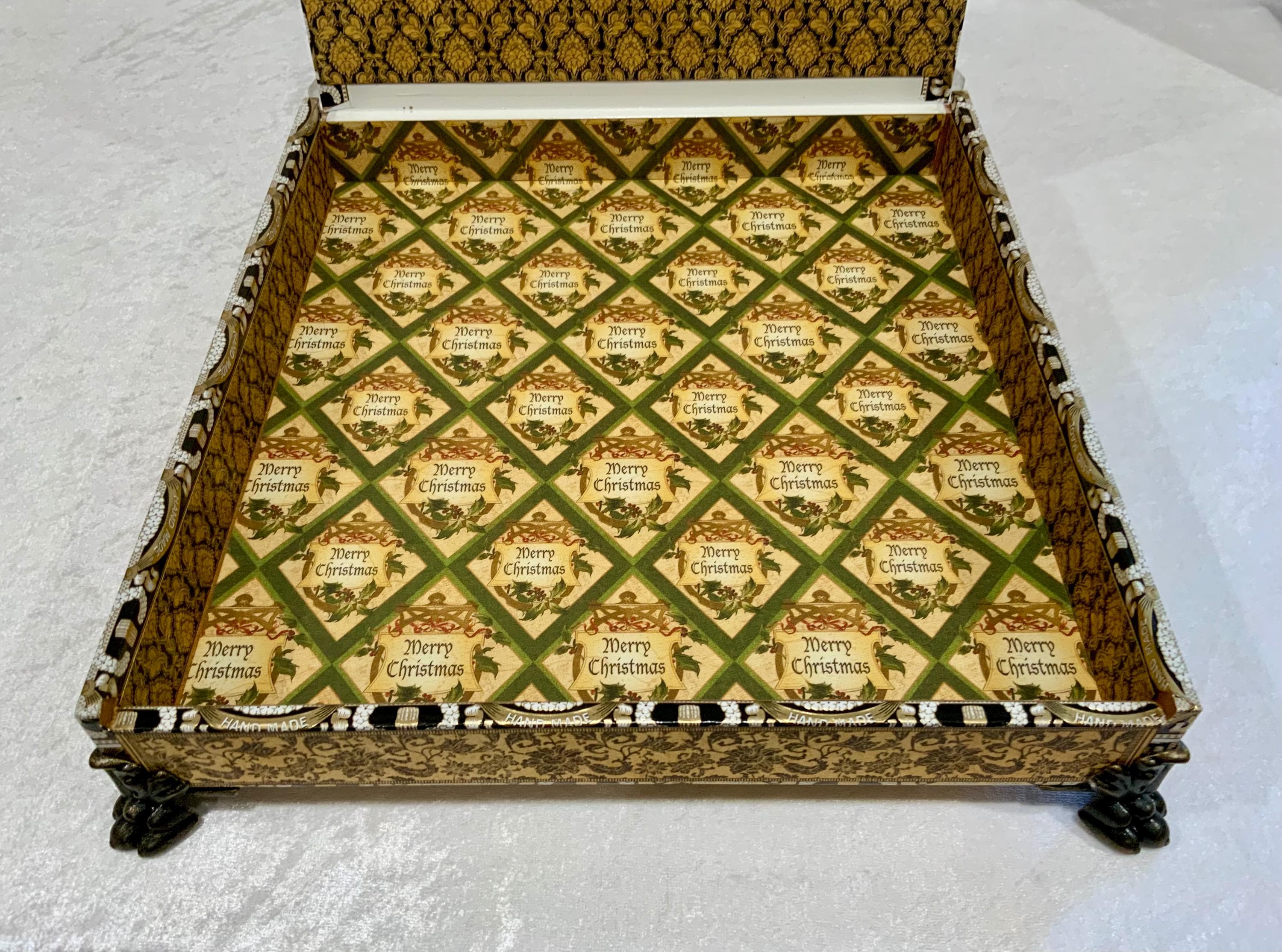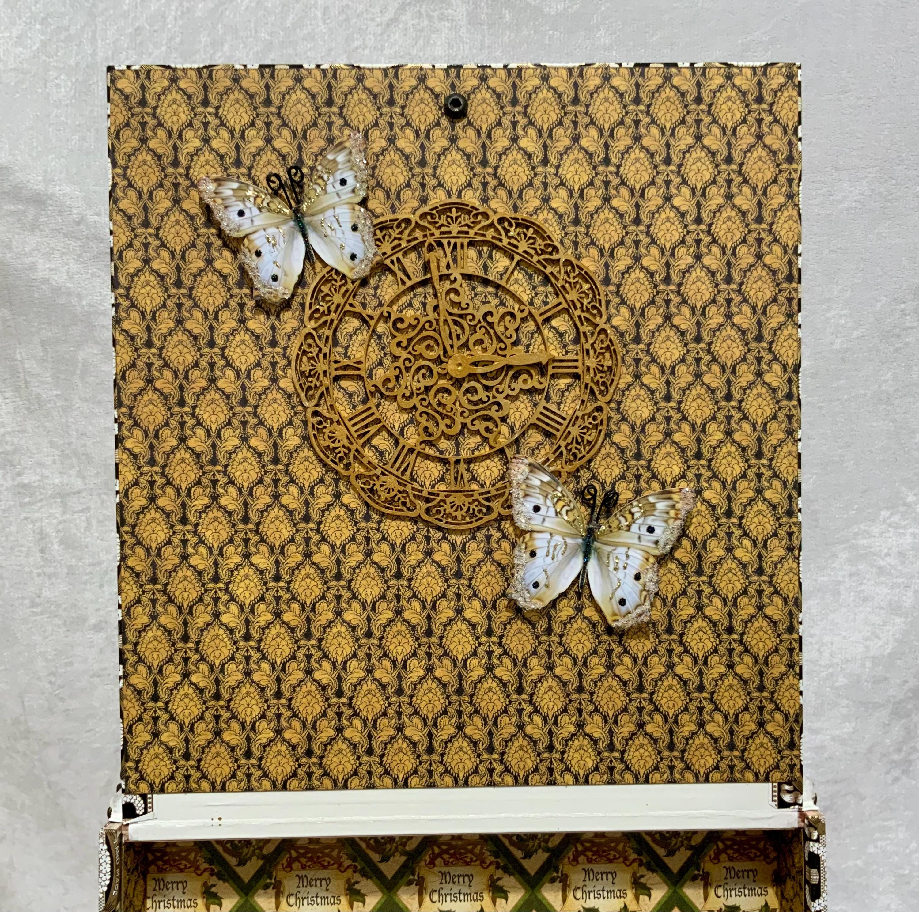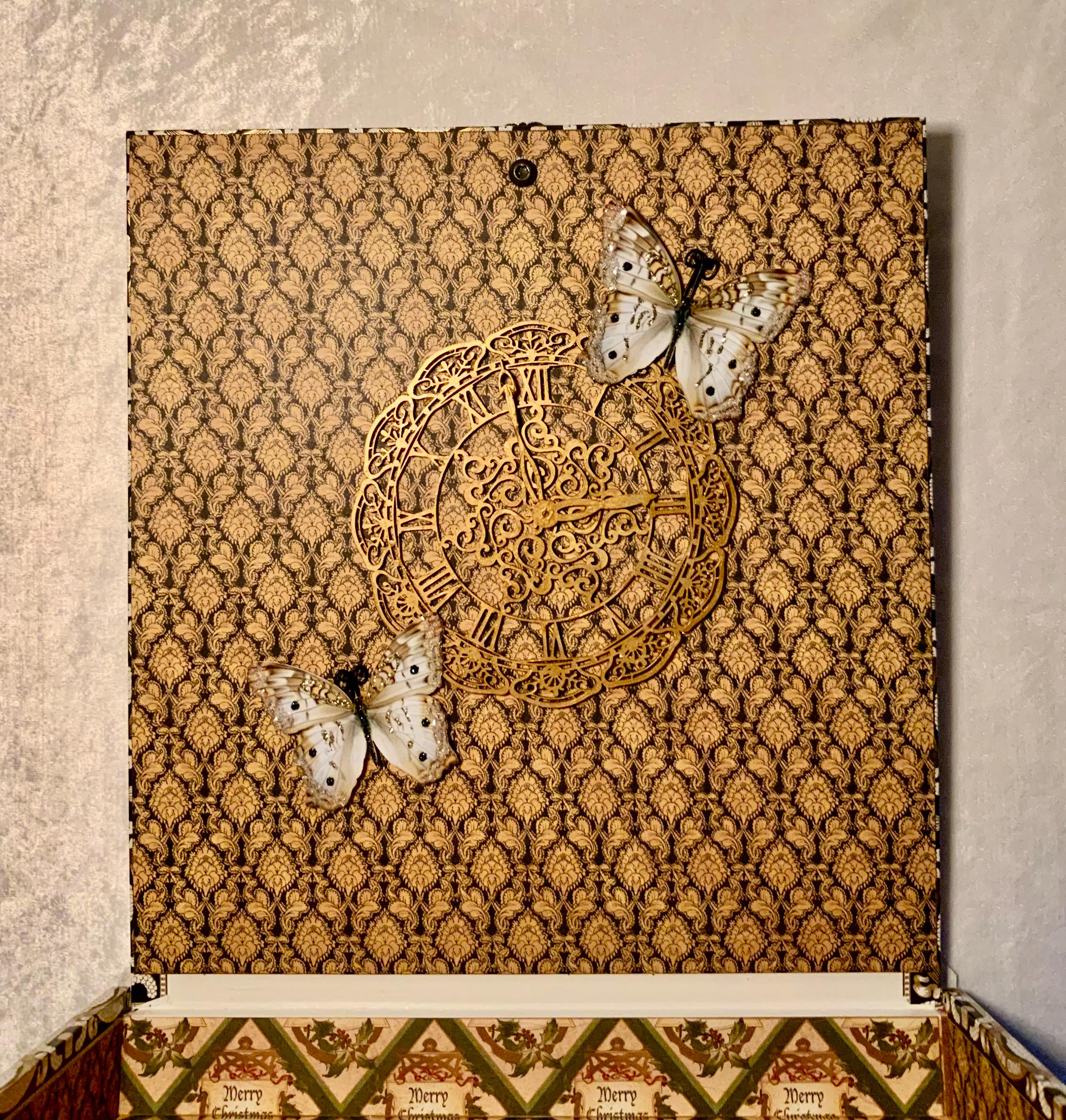 Inside, the fully lined box reveals a festive “Merry Christmas” patterned interior with rich green, gold, and parchment tones. The interior lid features a dimensional vintage clock and delicate white butterflies, adding timeless detail. Finished with antiqued bronze metal feet, and a decorative knob, this piece brings grace and nostalgia to any holiday setting.