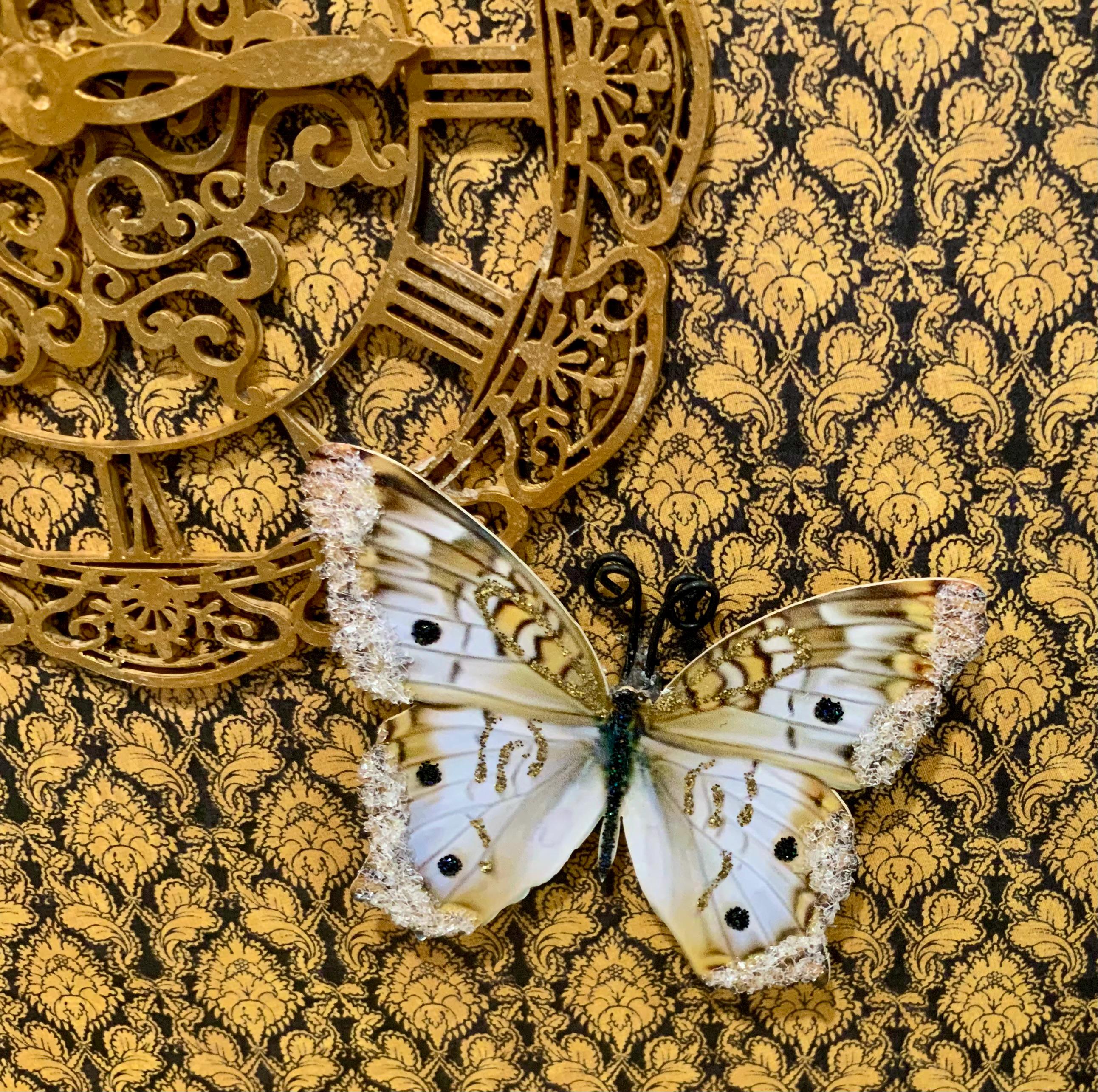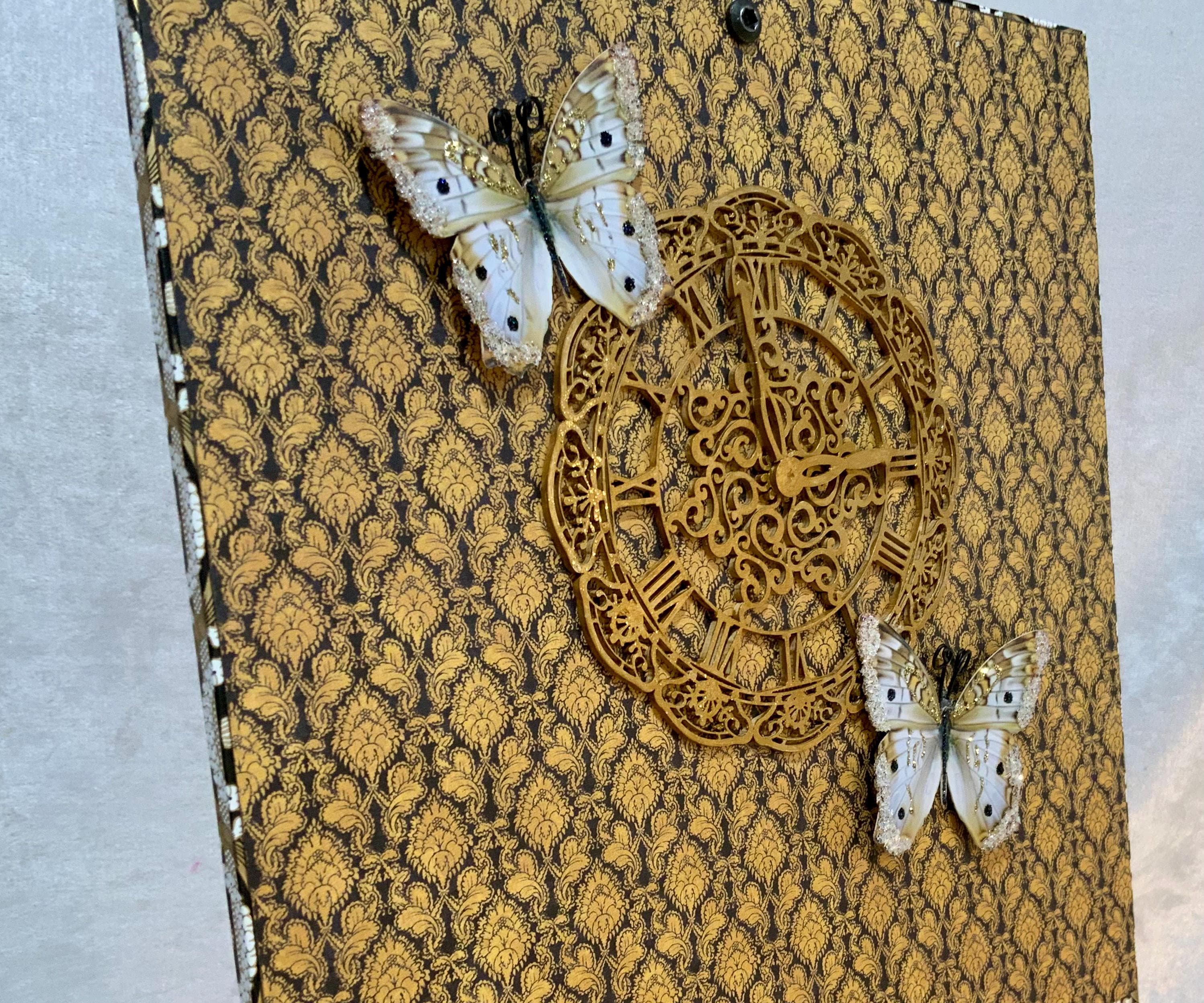 • Dimensional clock face and butterflies on inside lid