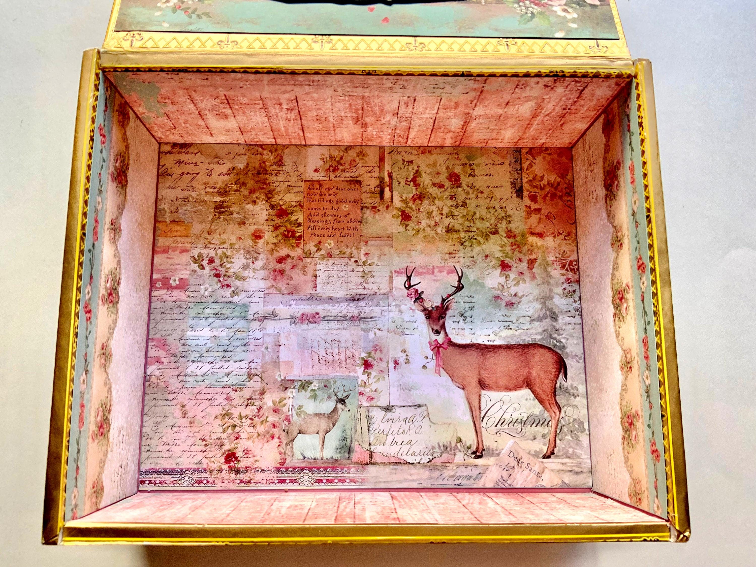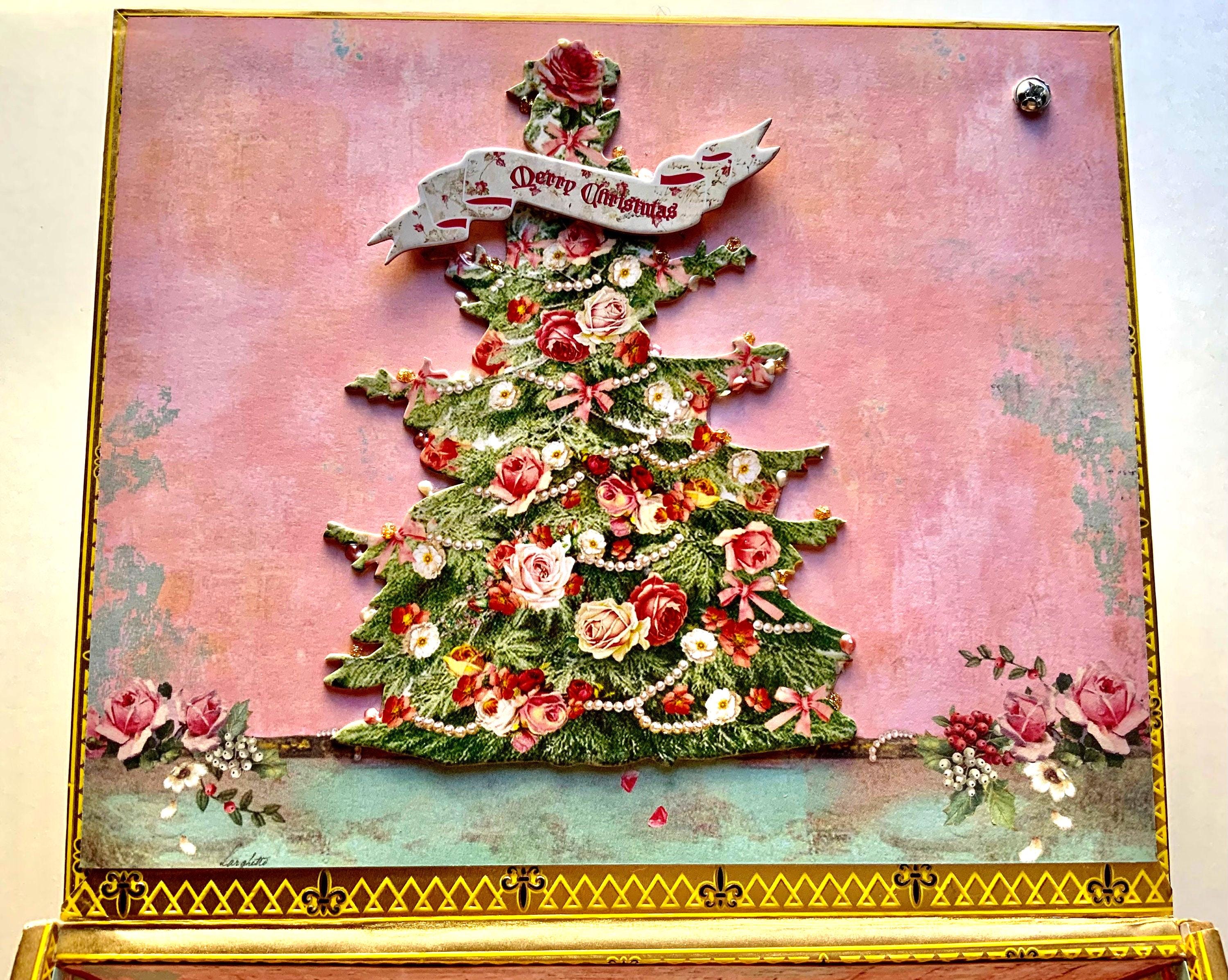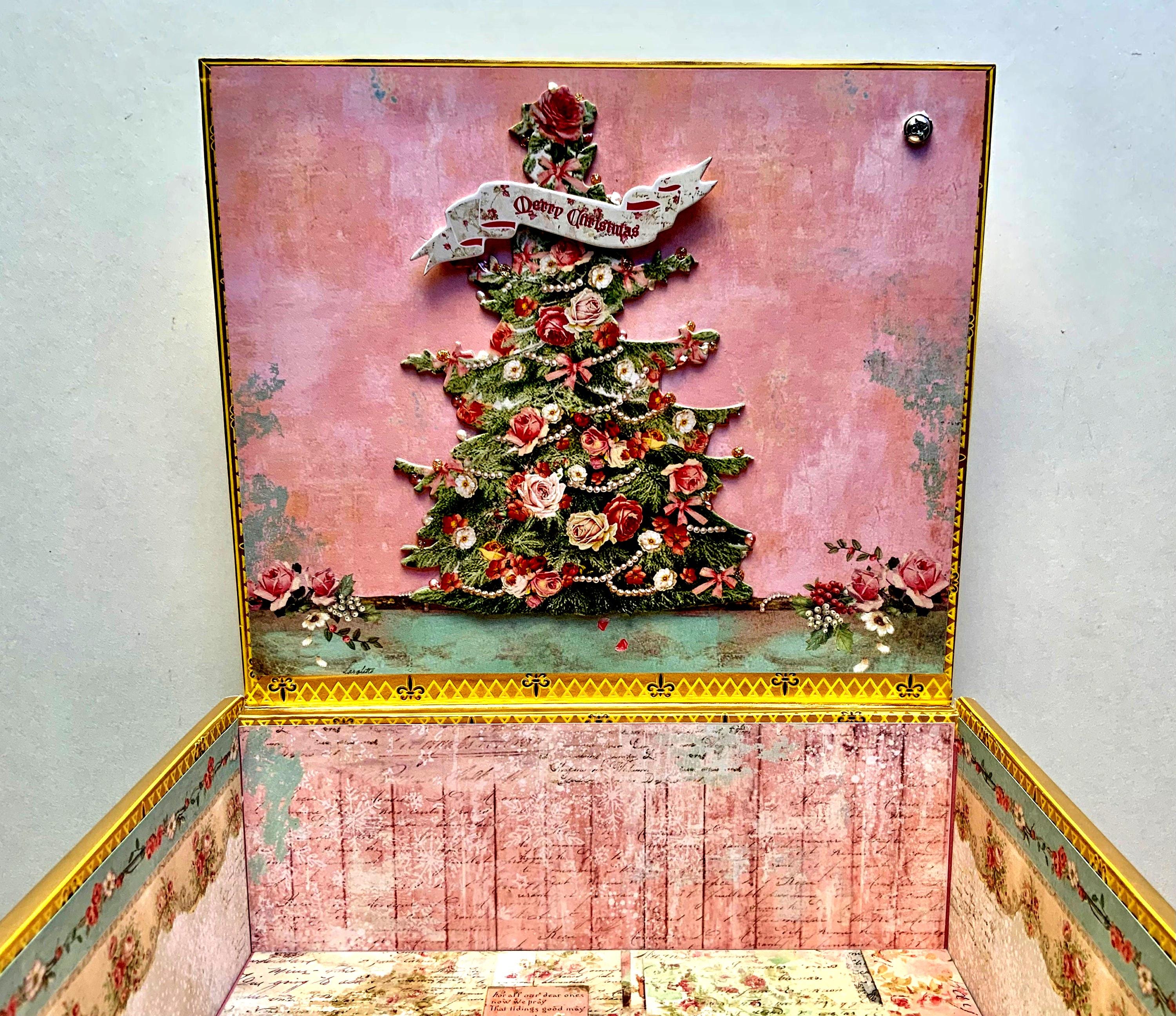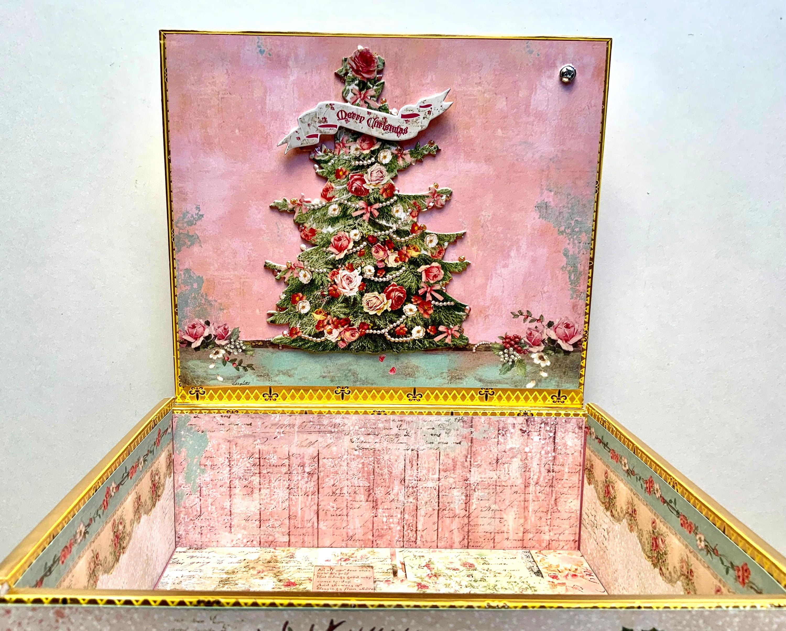 • Interior: Fully lined in coordinating Pink Christmas papers, including the beautiful rose-trimmed Christmas tree design