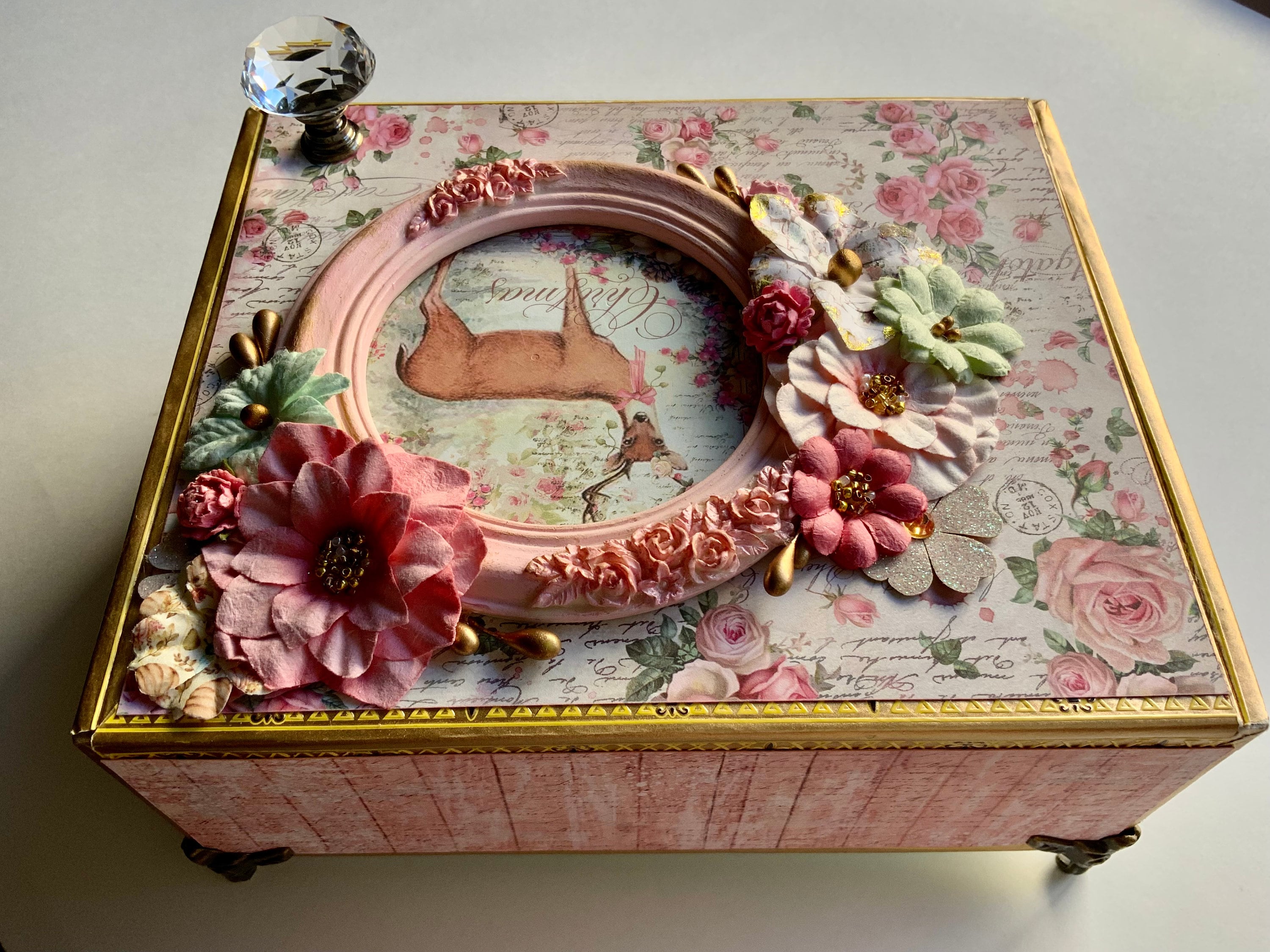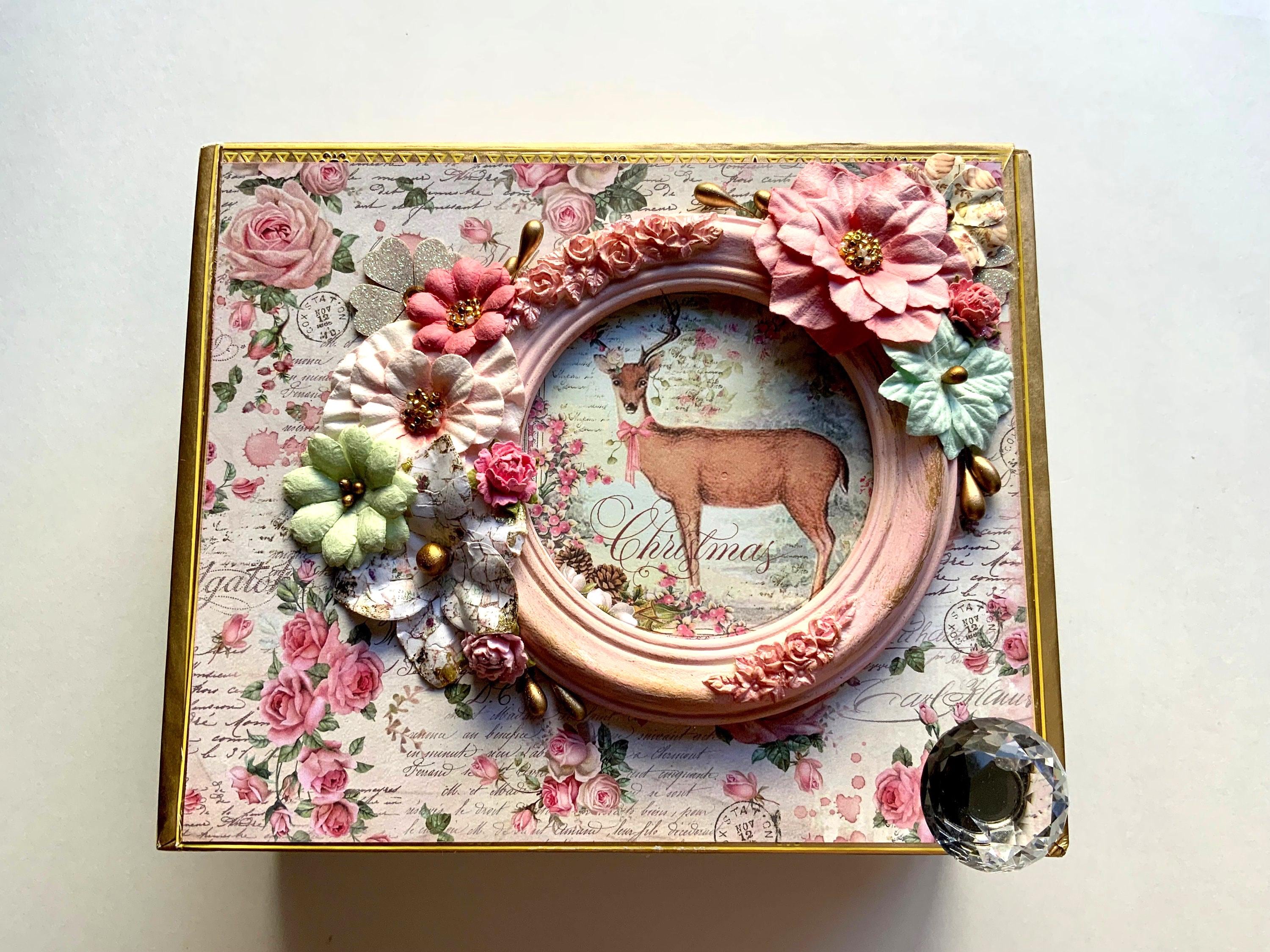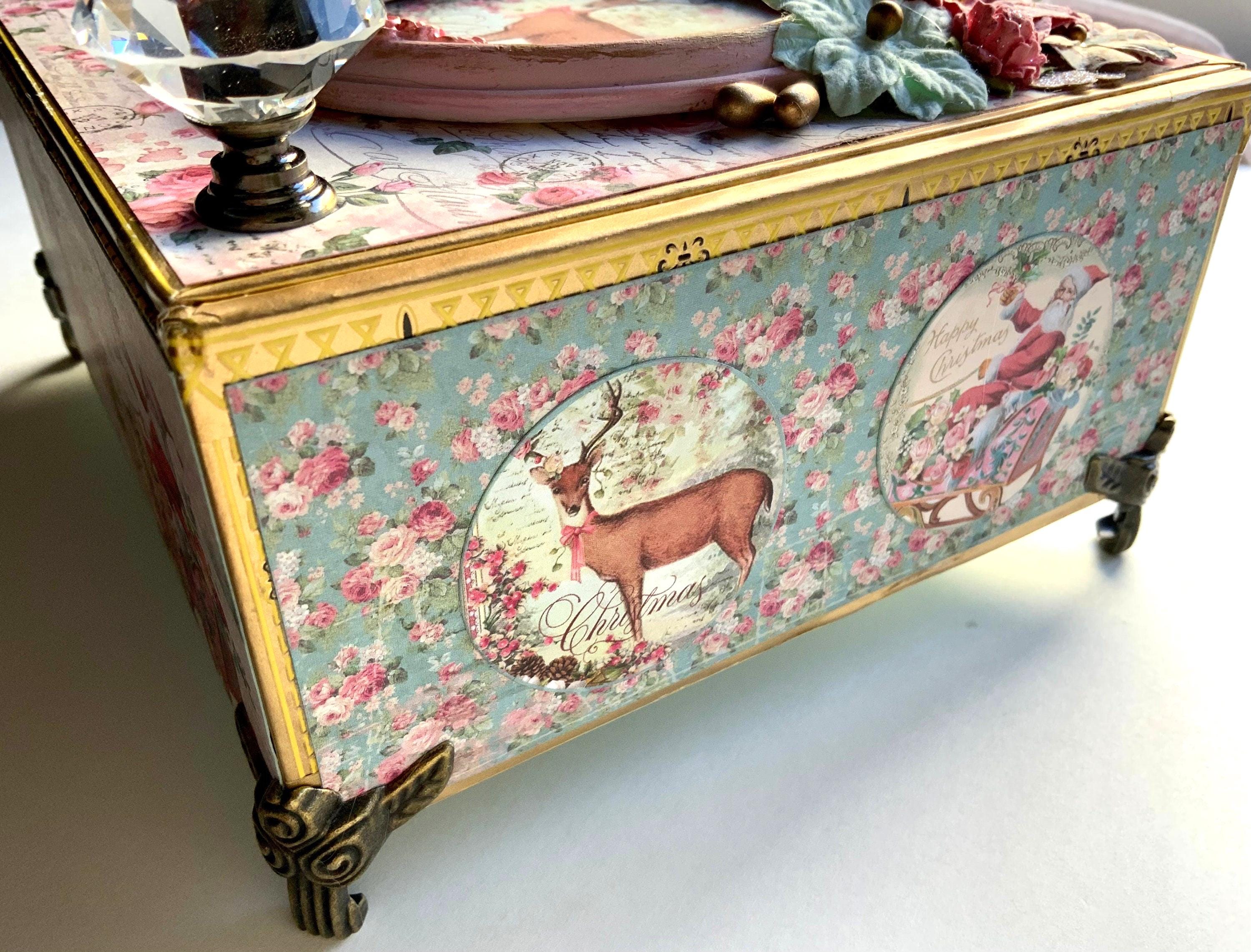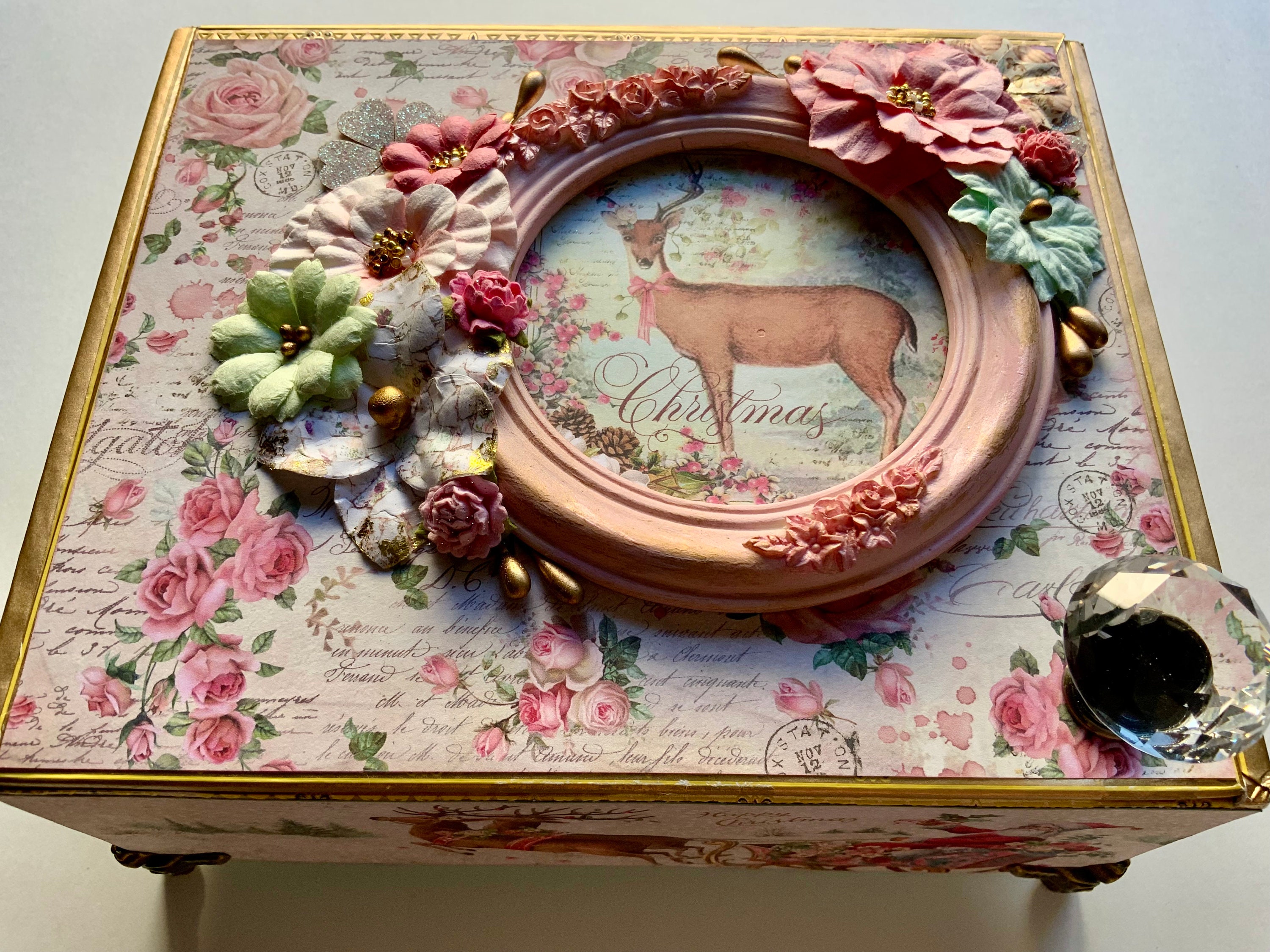 Bring a touch of romantic Christmas magic to your home with this beautifully handcrafted Pink Christmas decorated cigar box. Soft pastels, shabby chic details, and vintage holiday charm make this keepsake box perfect for gifting, display, or storing treasured holiday memories.