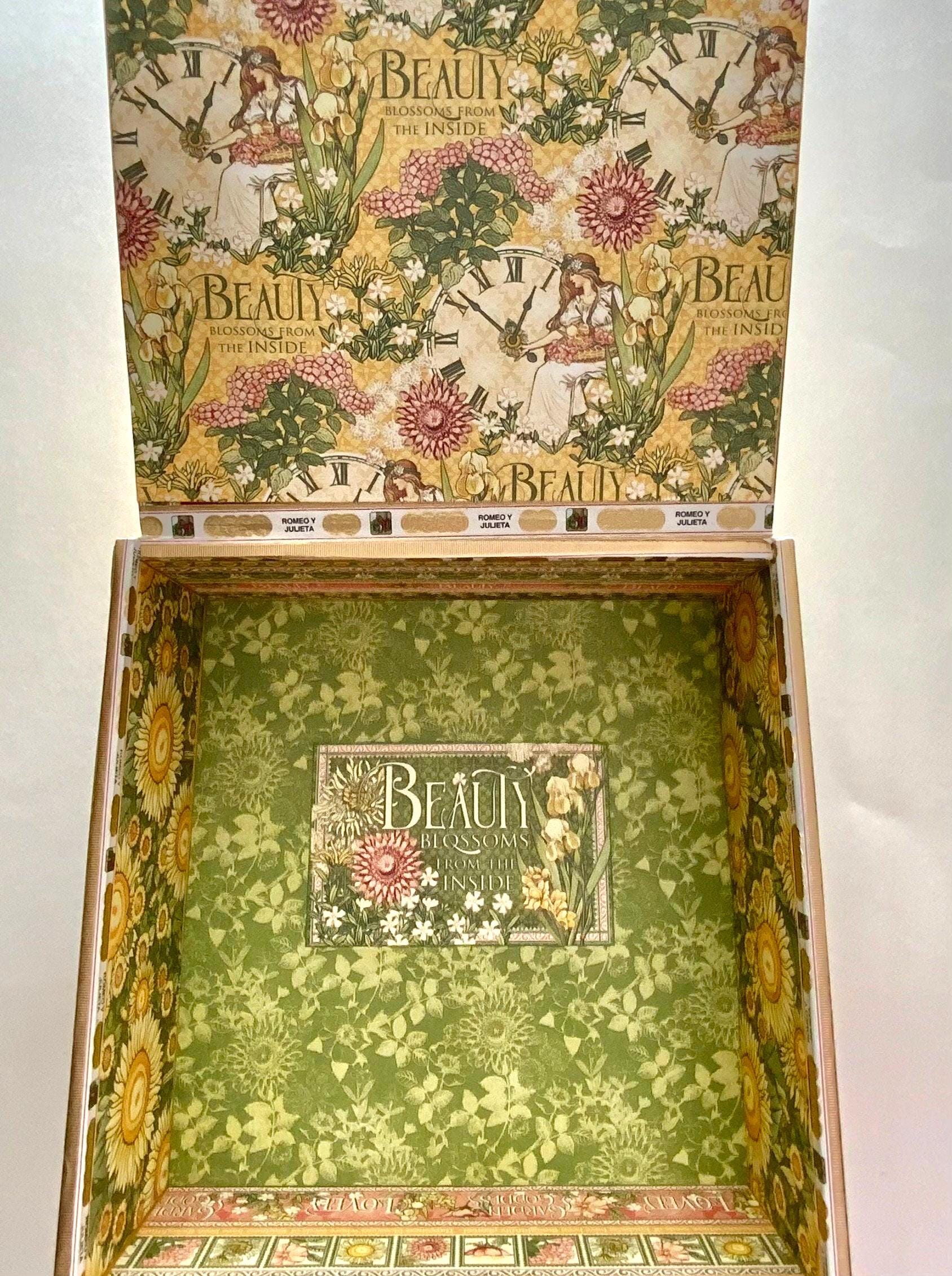 All of my keepsake boxes are authentic upcycled cigar boxes. I carefully select the best ones to decorate, and most surfaces are covered with premium papers, trims, and embellishments. For my Camacho “piano finish” boxes, the glossy black lids may show faint surface scratches from their original life — these are minor and add to the authentic character of the box.