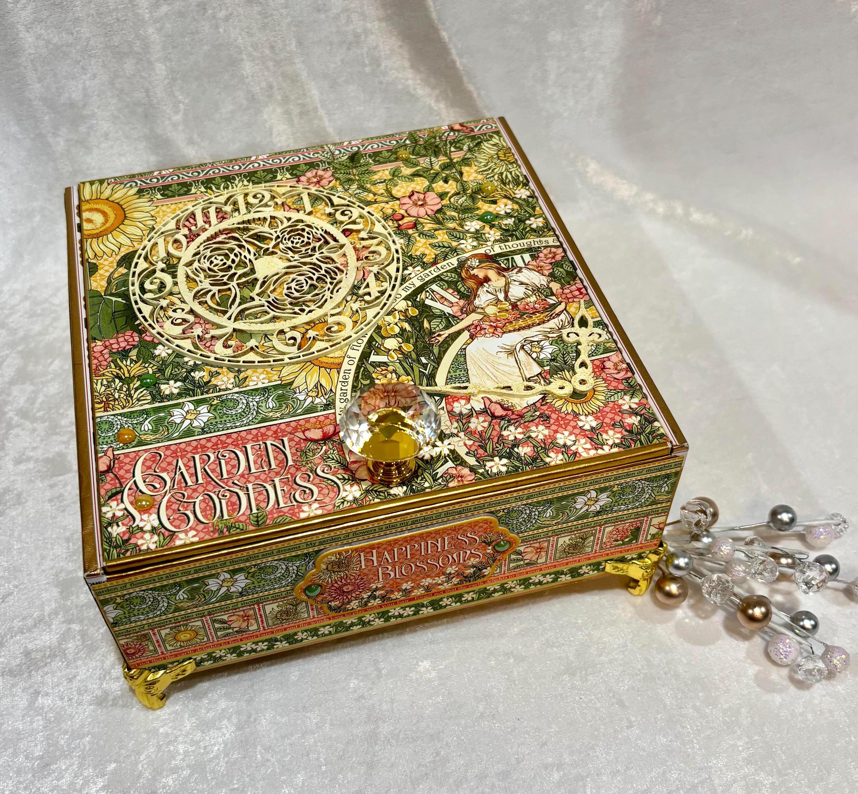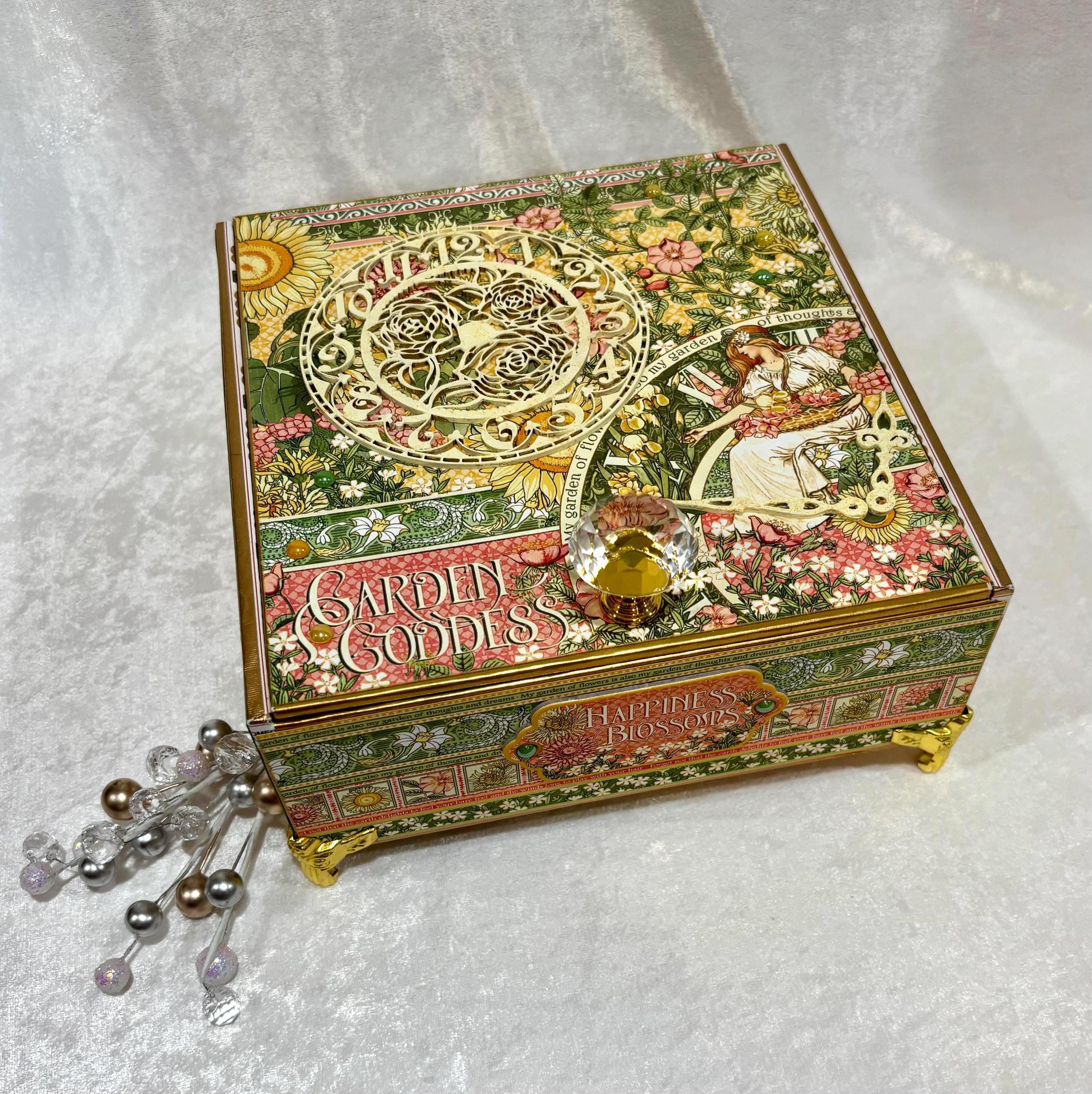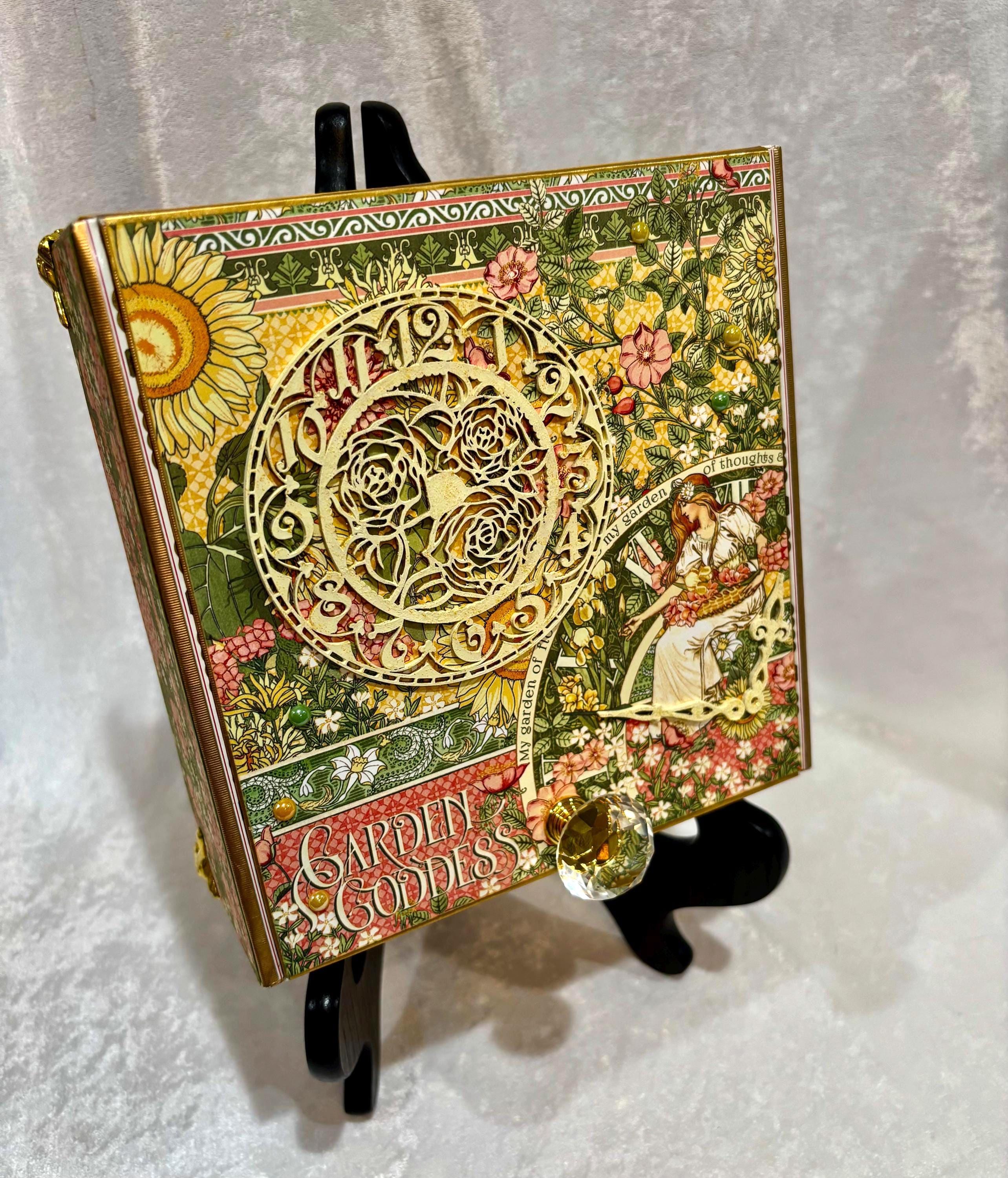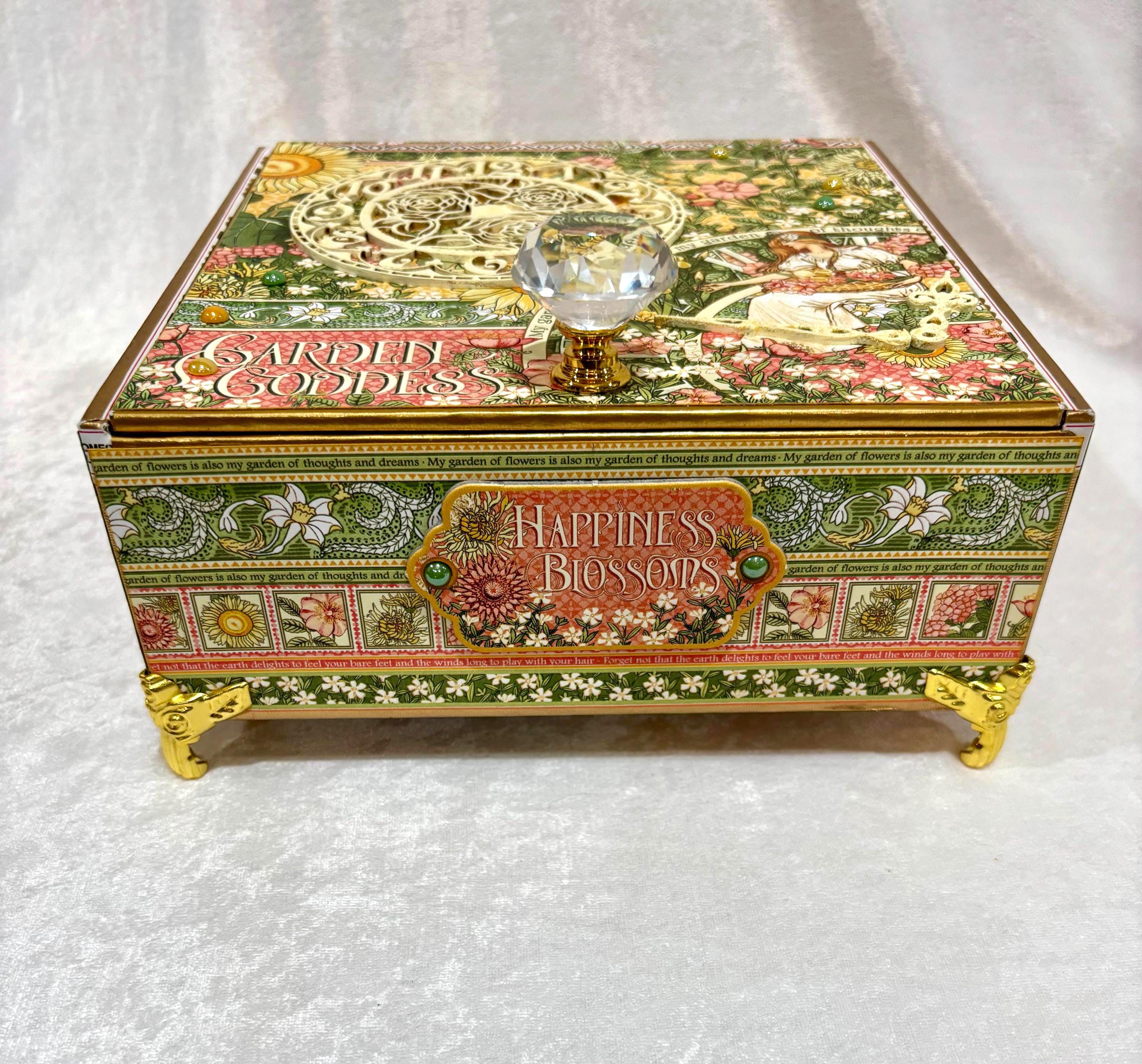 Bring the warmth and beauty of a blooming garden into your home with this one-of-a-kind decorated cigar box, handcrafted using the retired Graphic 45 Garden Goddess paper collection. This exact piece cannot be recreated — retired paper collection not available any longer.