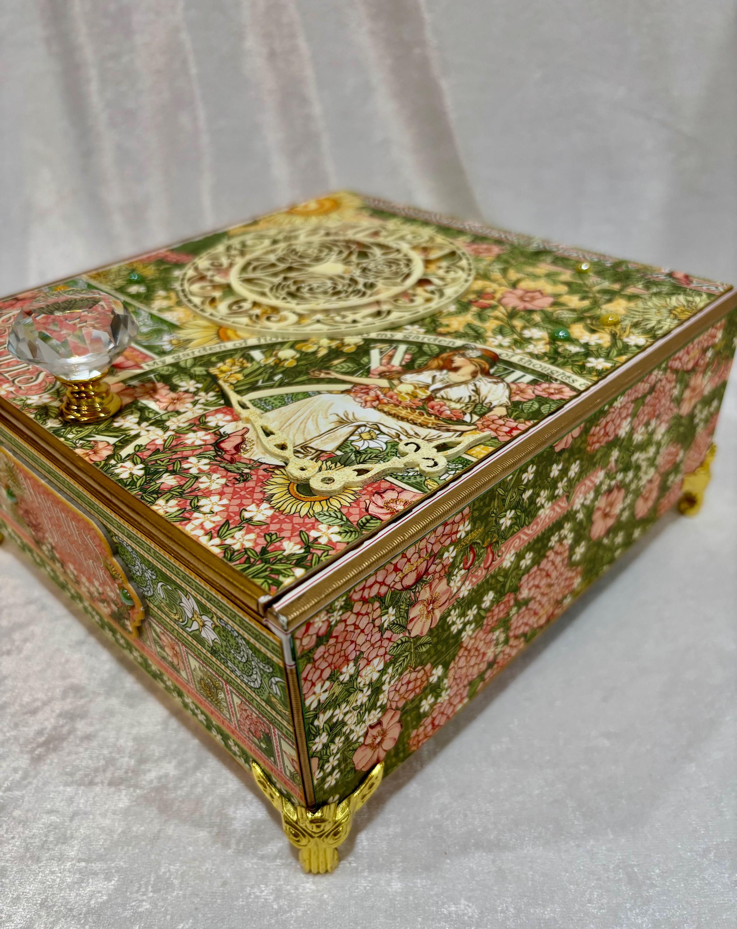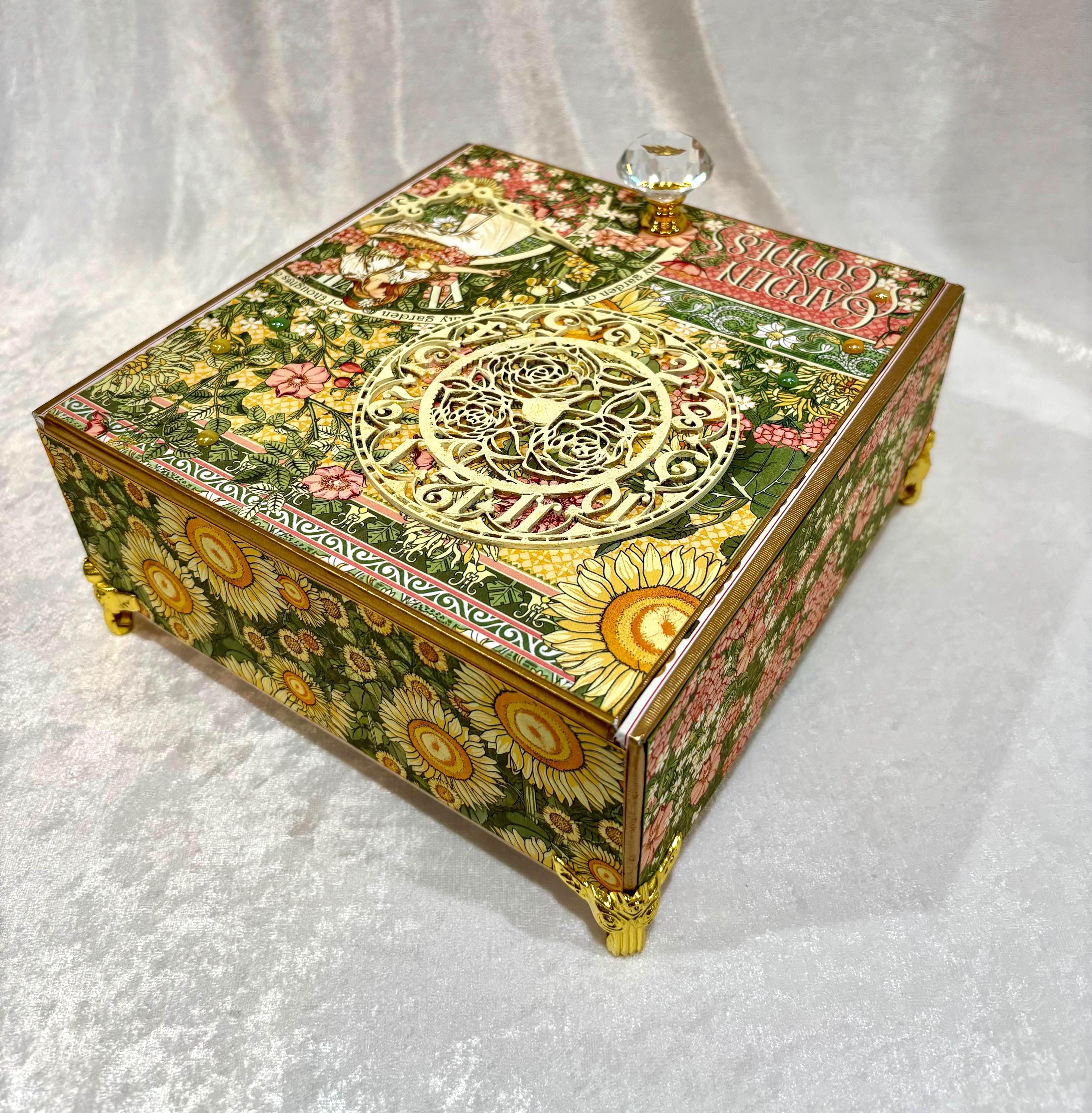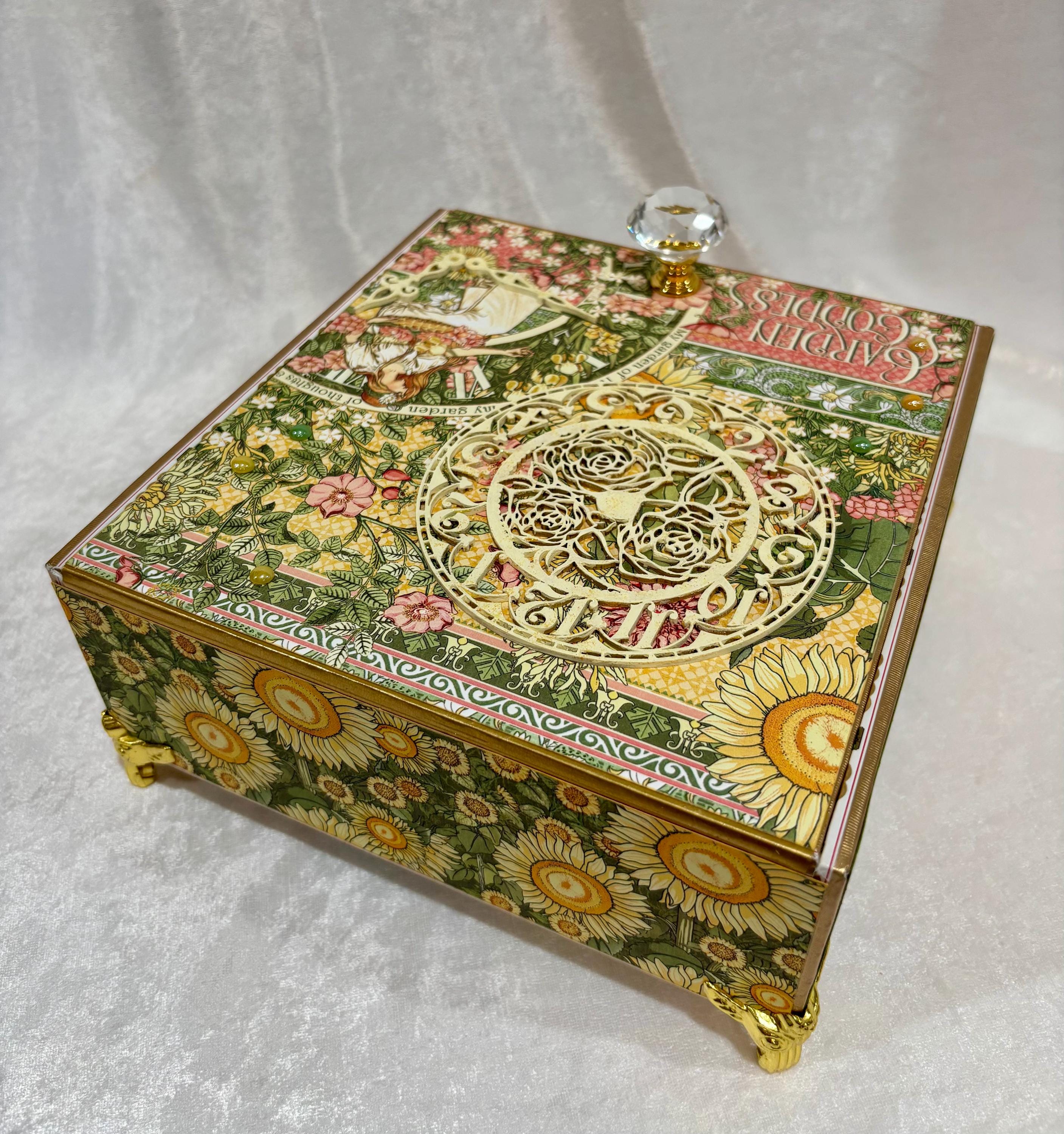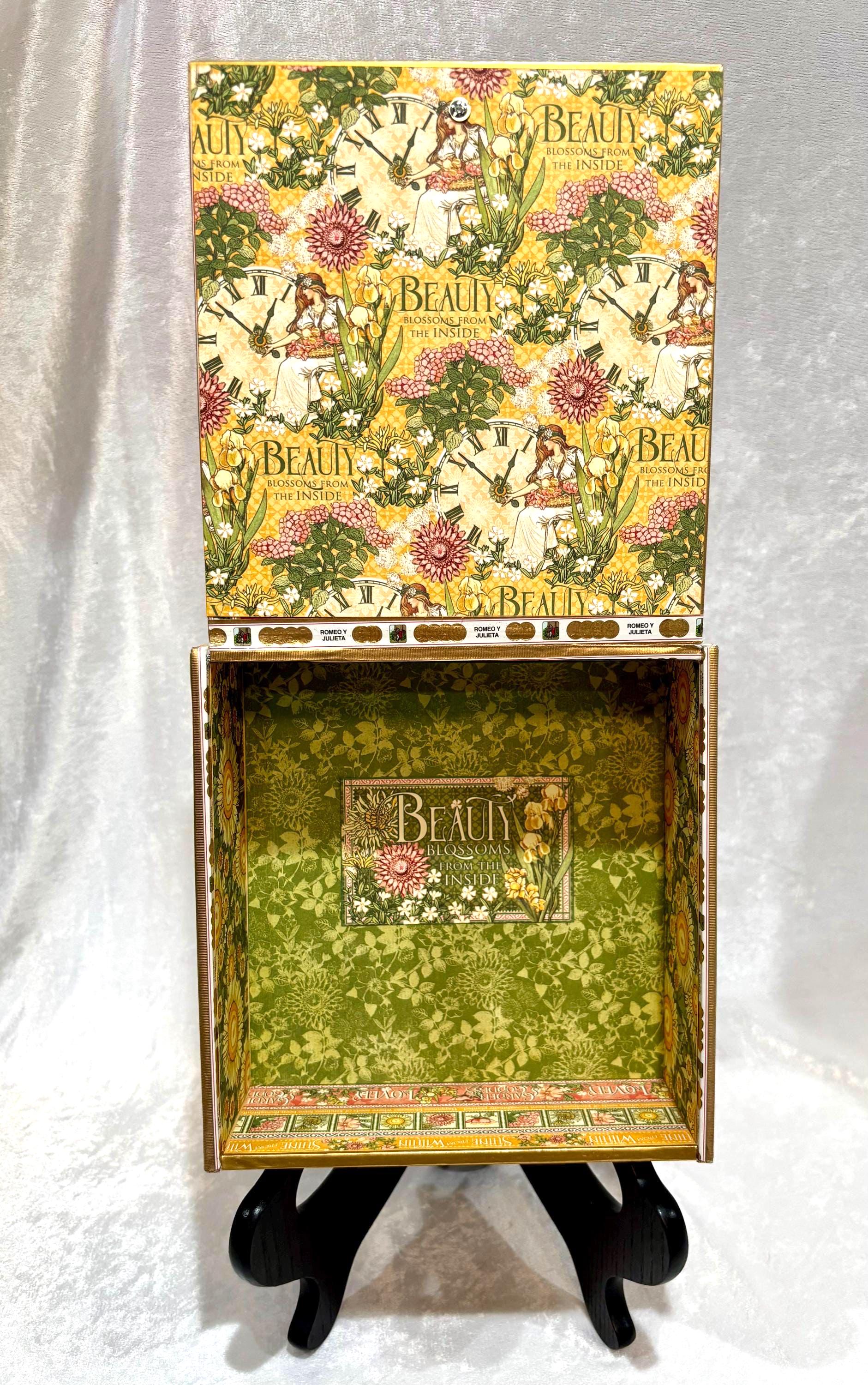 Bring the warmth and beauty of a blooming garden into your home with this one-of-a-kind decorated cigar box, handcrafted using the retired Graphic 45 Garden Goddess paper collection. This exact piece cannot be recreated — retired paper collection not available any longer.