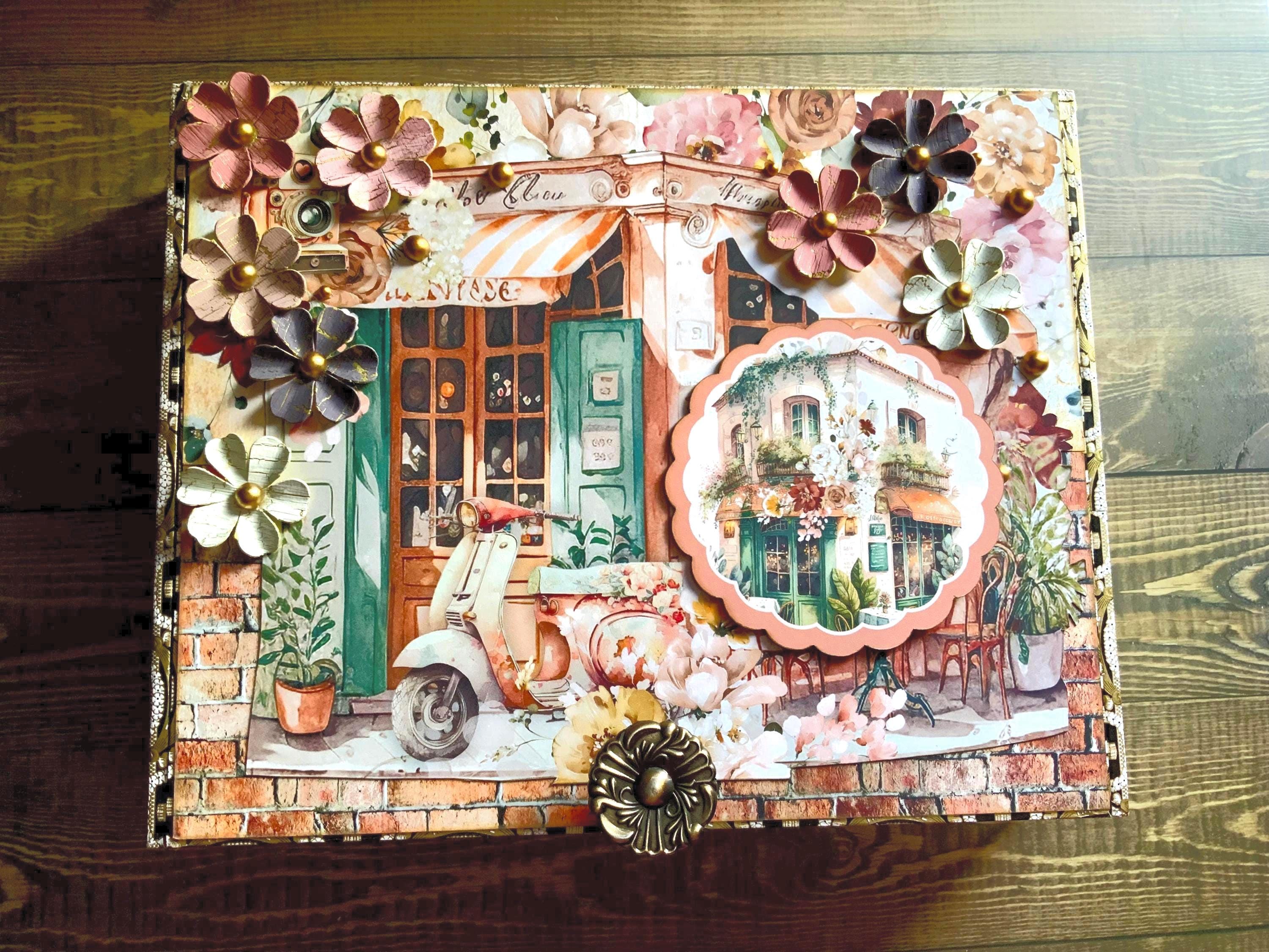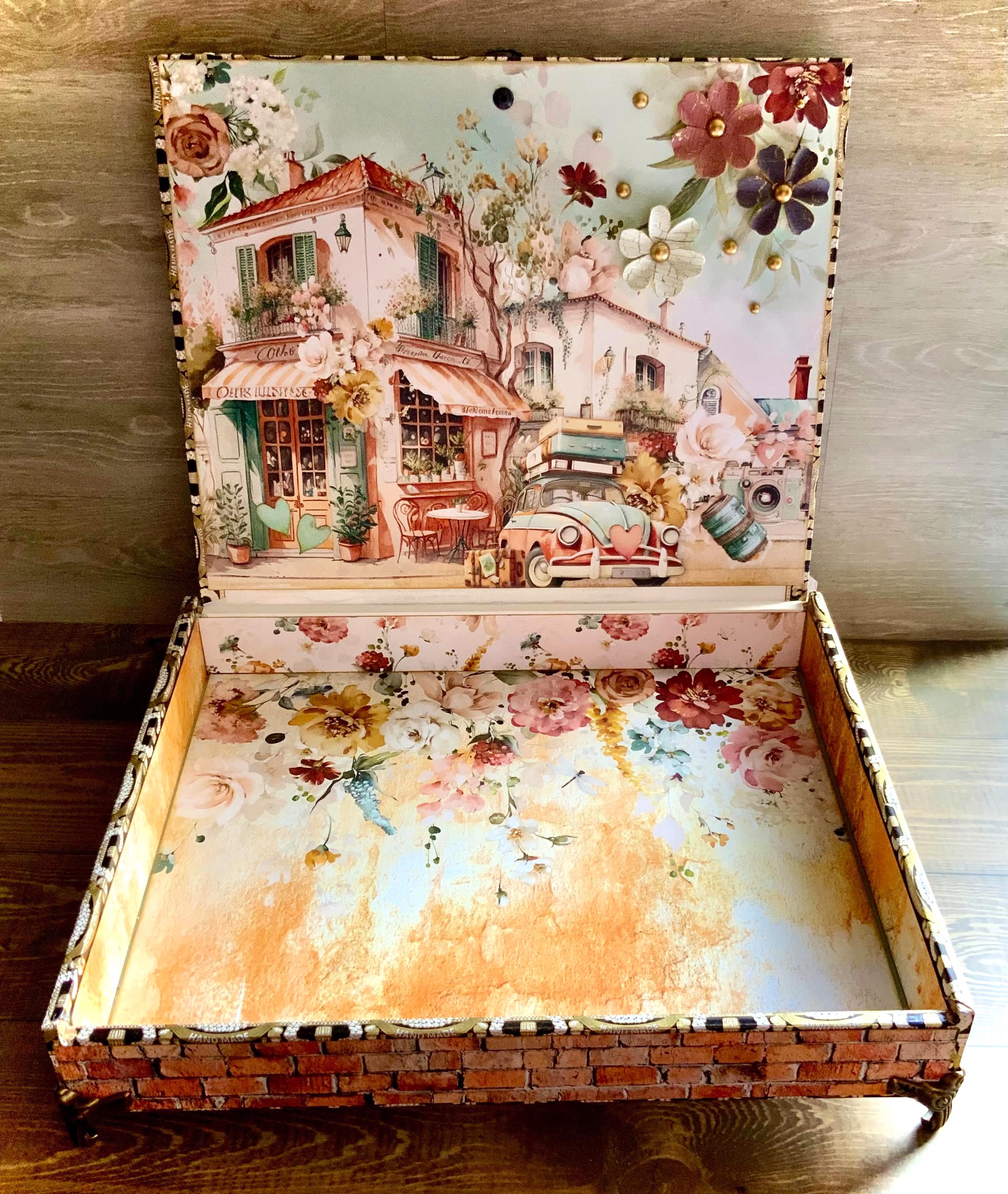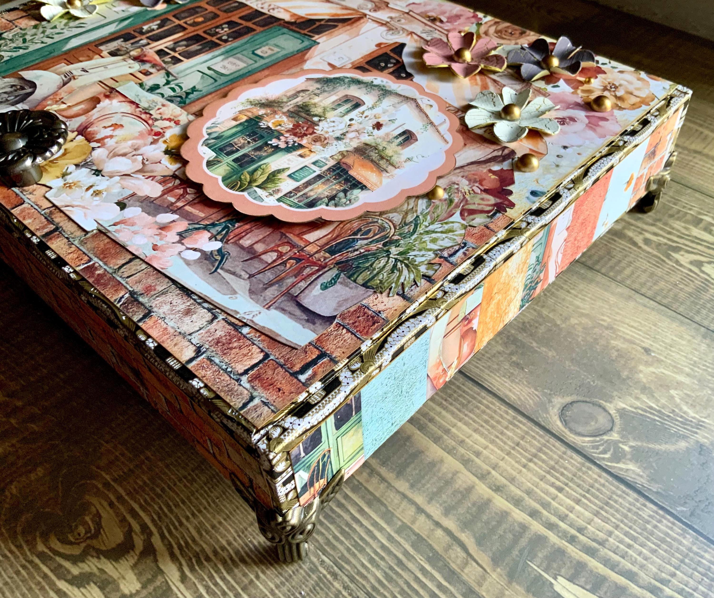 Take a stroll through a romantic European street every time you open this beautifully transformed cigar box. Hand-decorated with layered floral embellishments and vintage-style travel illustrations, this one-of-a-kind piece is both functional and decorative.