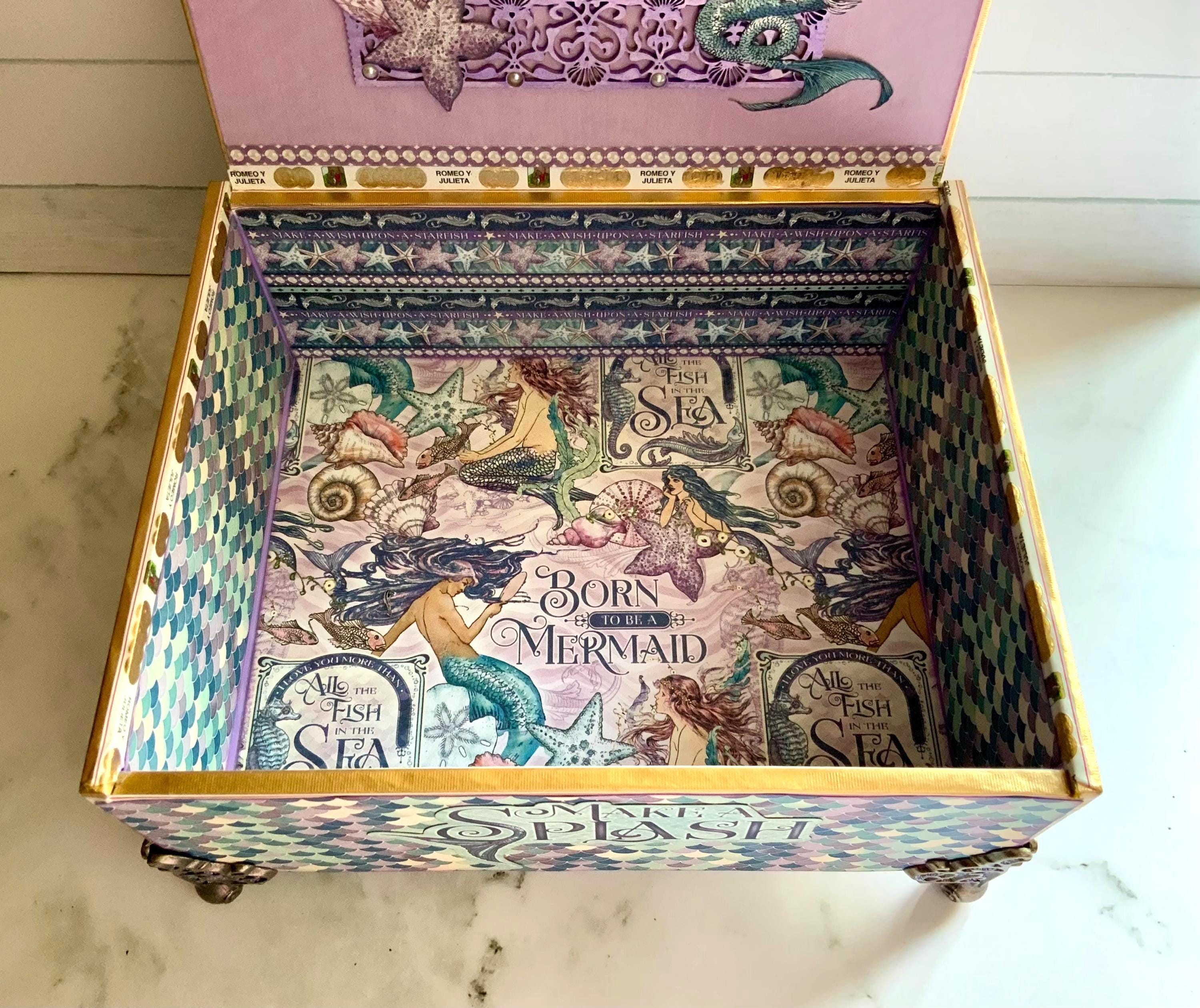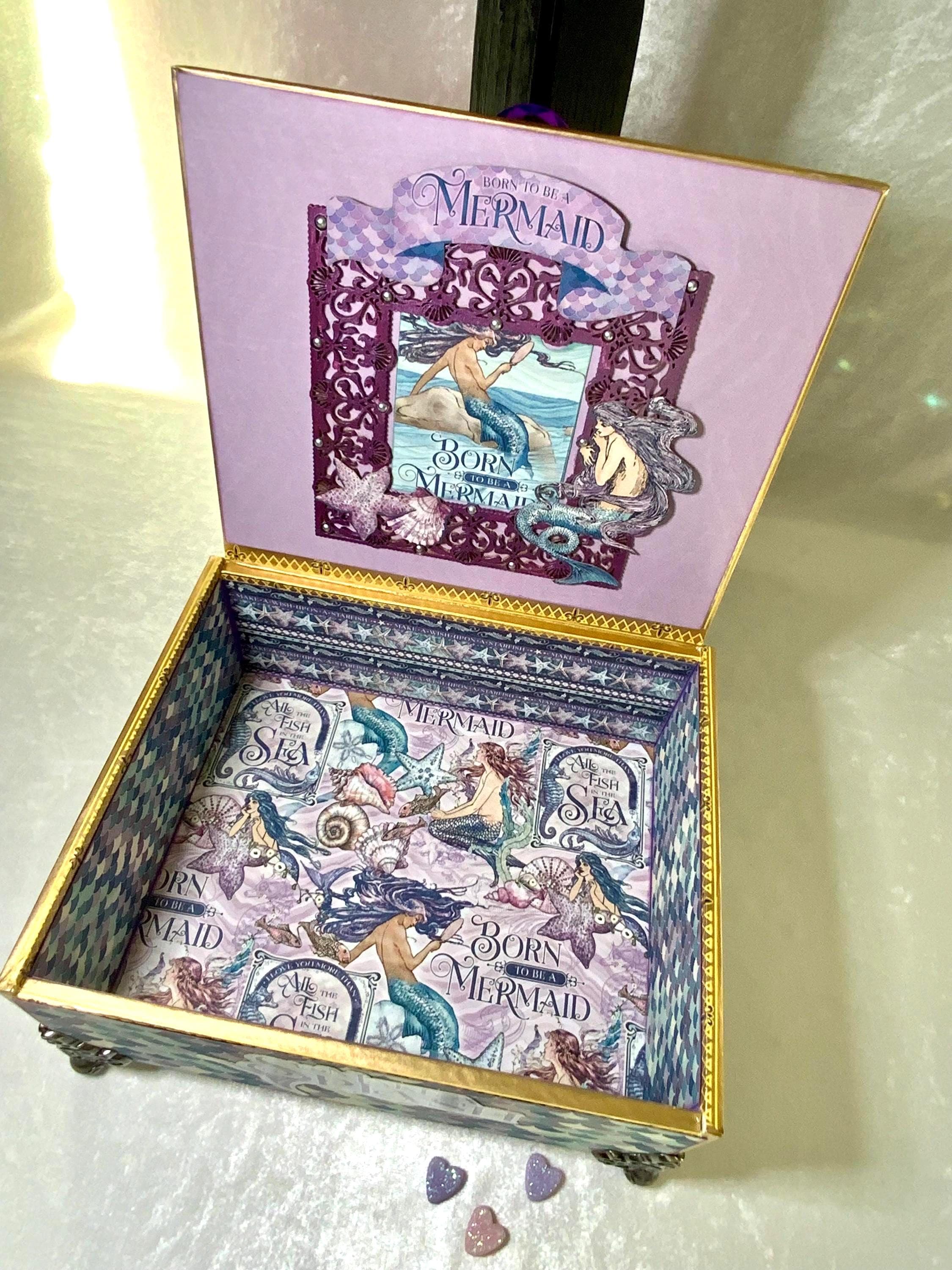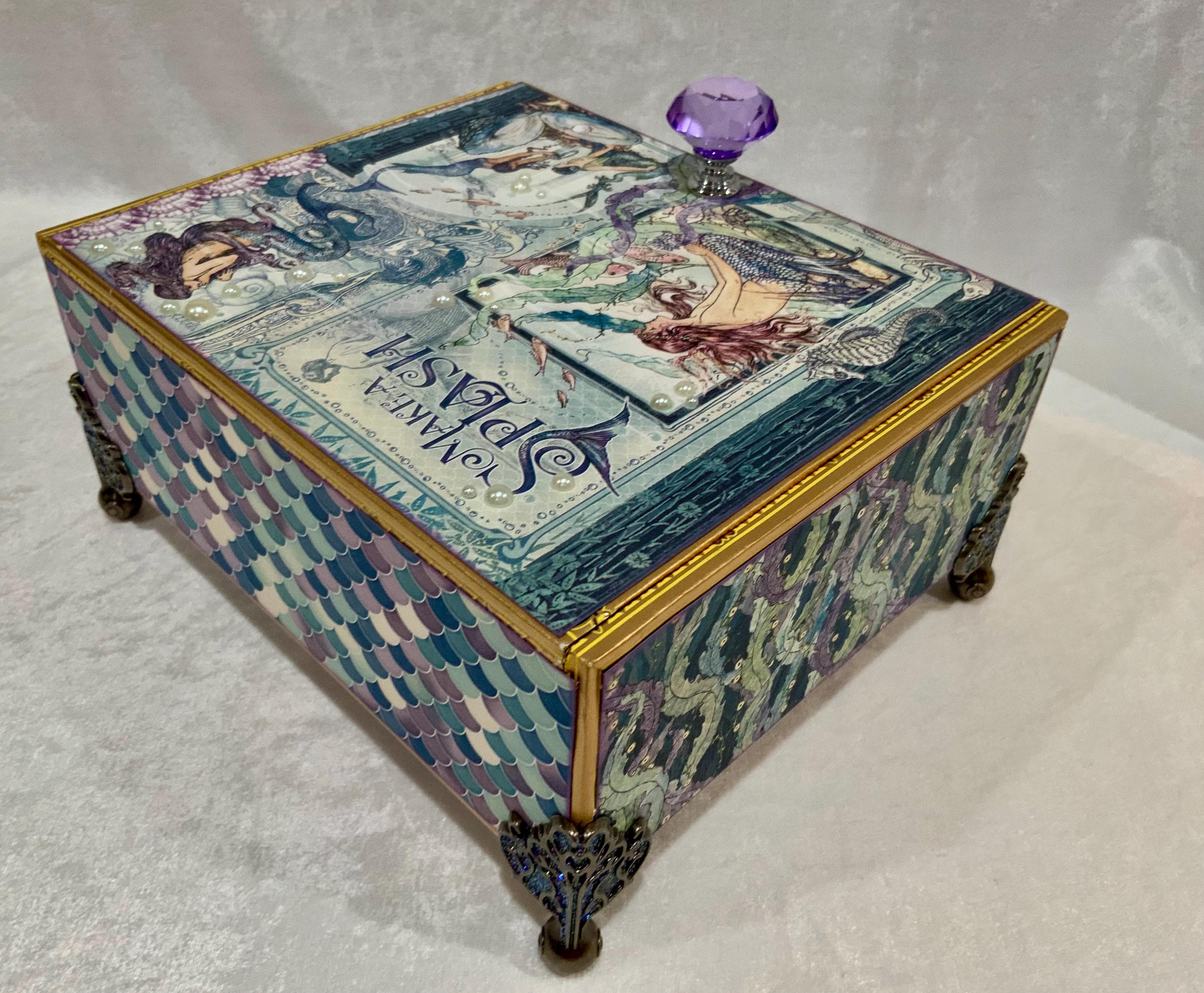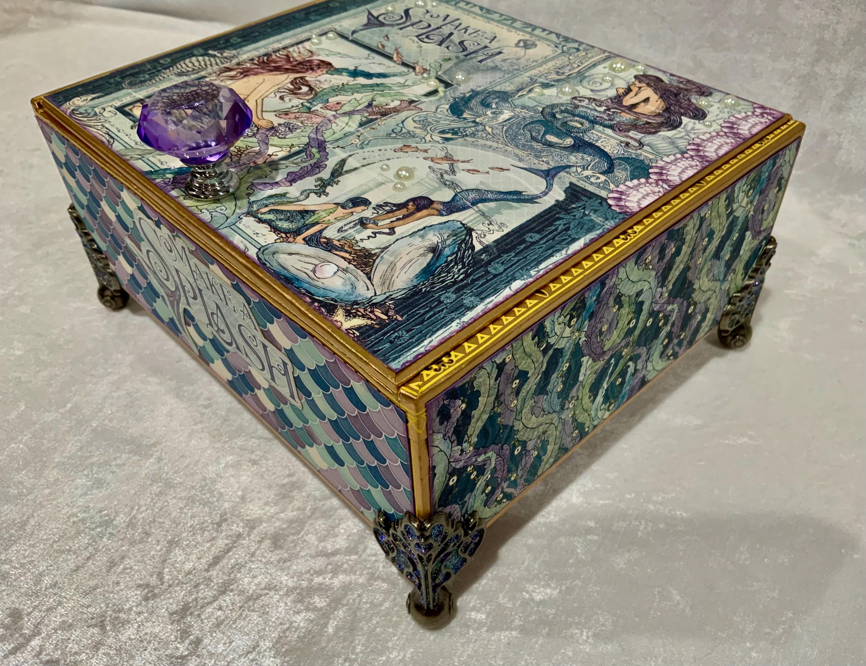 Dive into enchantment with this handcrafted mermaid-themed keepsake box, a magical treasure for anyone who dreams of the sea. Adorned in iridescent paper resembling mermaid scales, this one-of-a-kind box features a rich vintage illustration of underwater maidens, pearls, a faceted purple crystal knob, and elegant filigree metal feet.