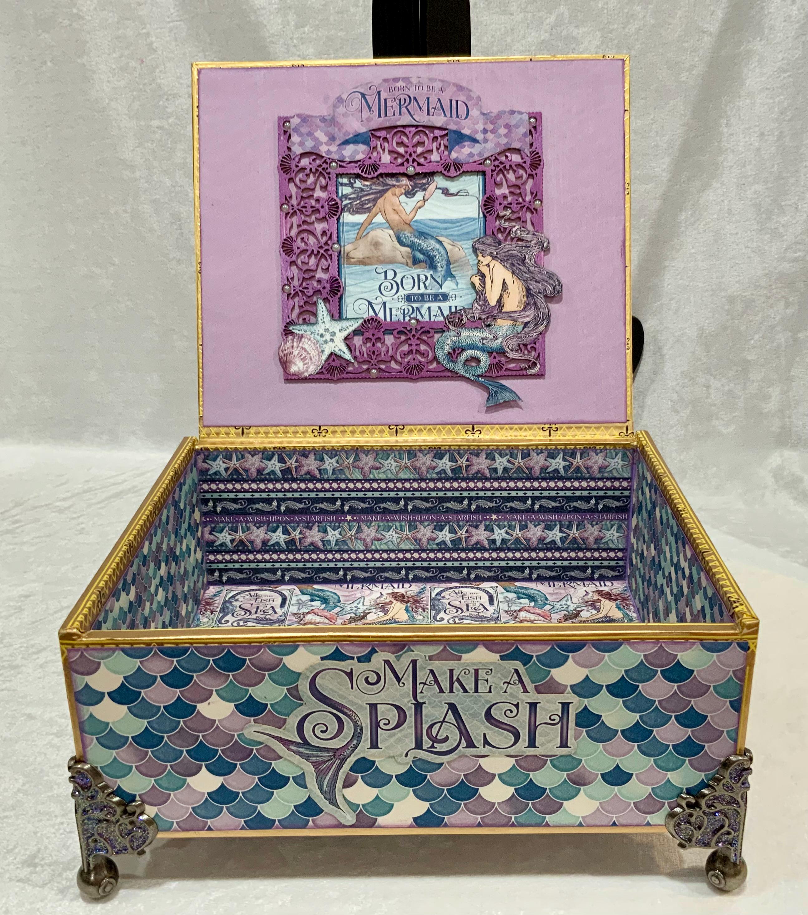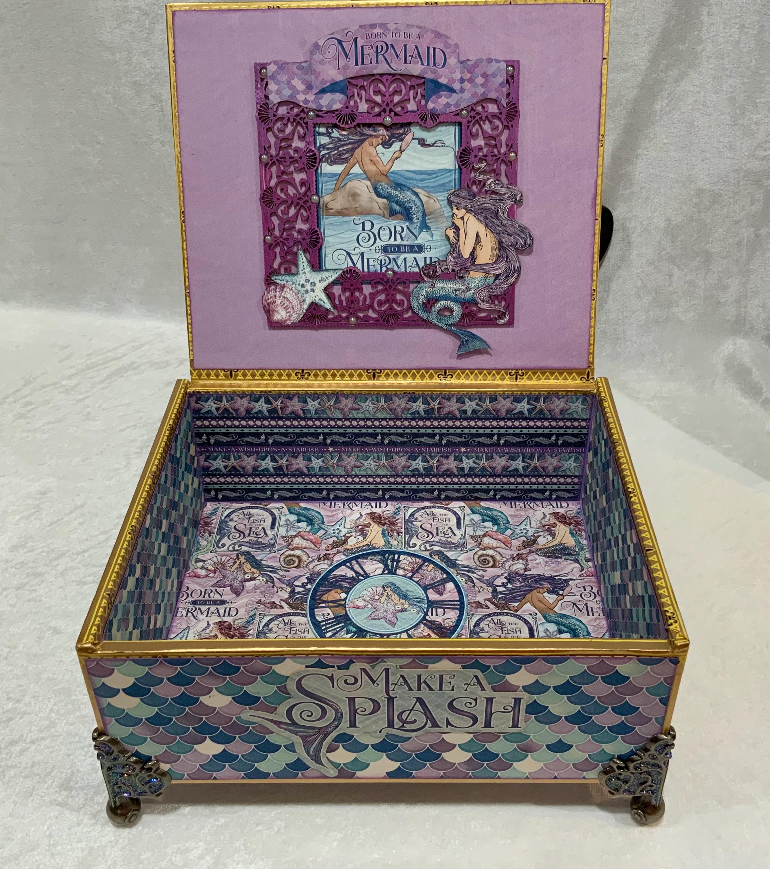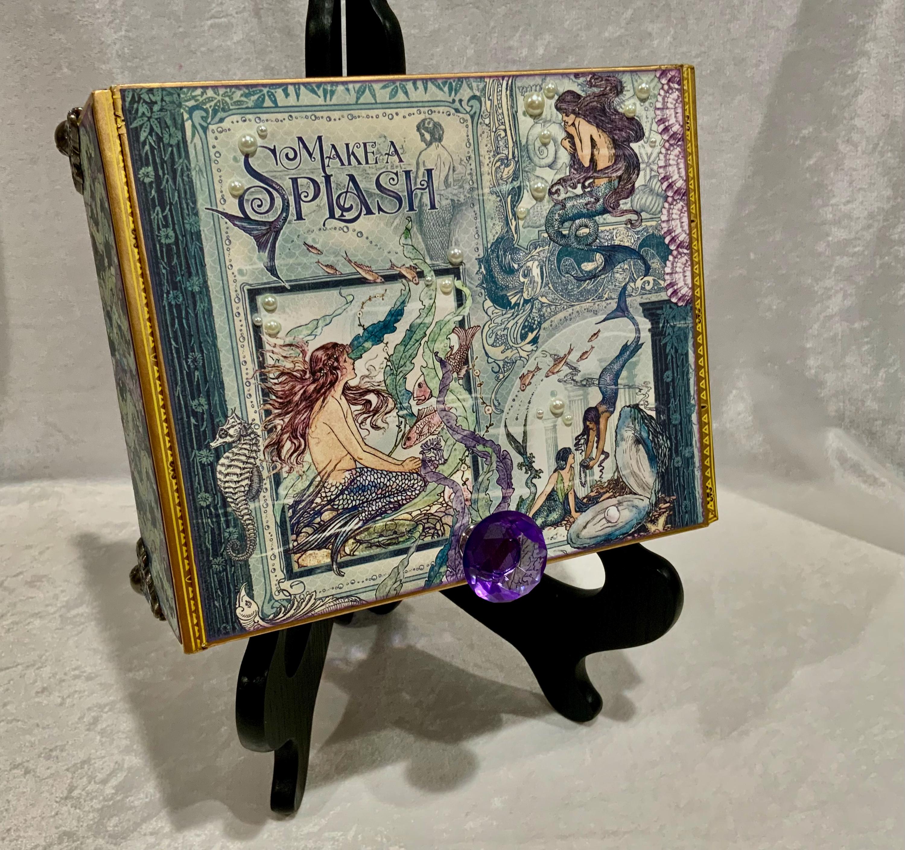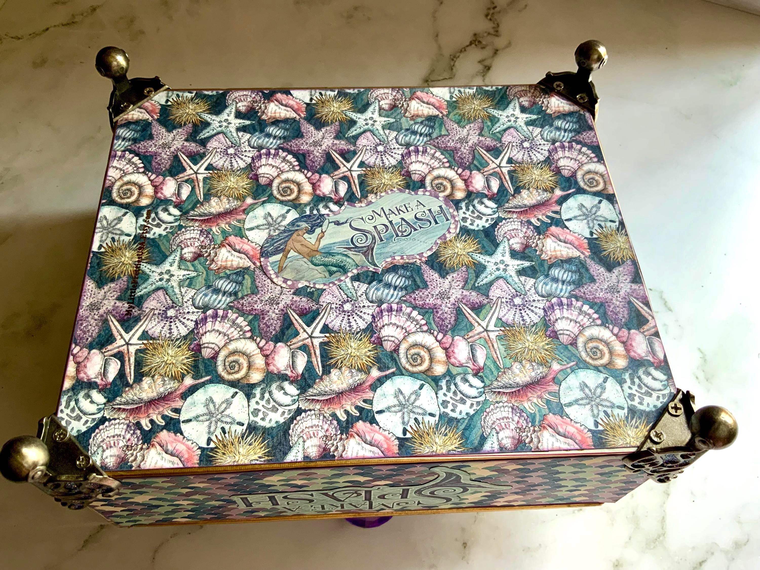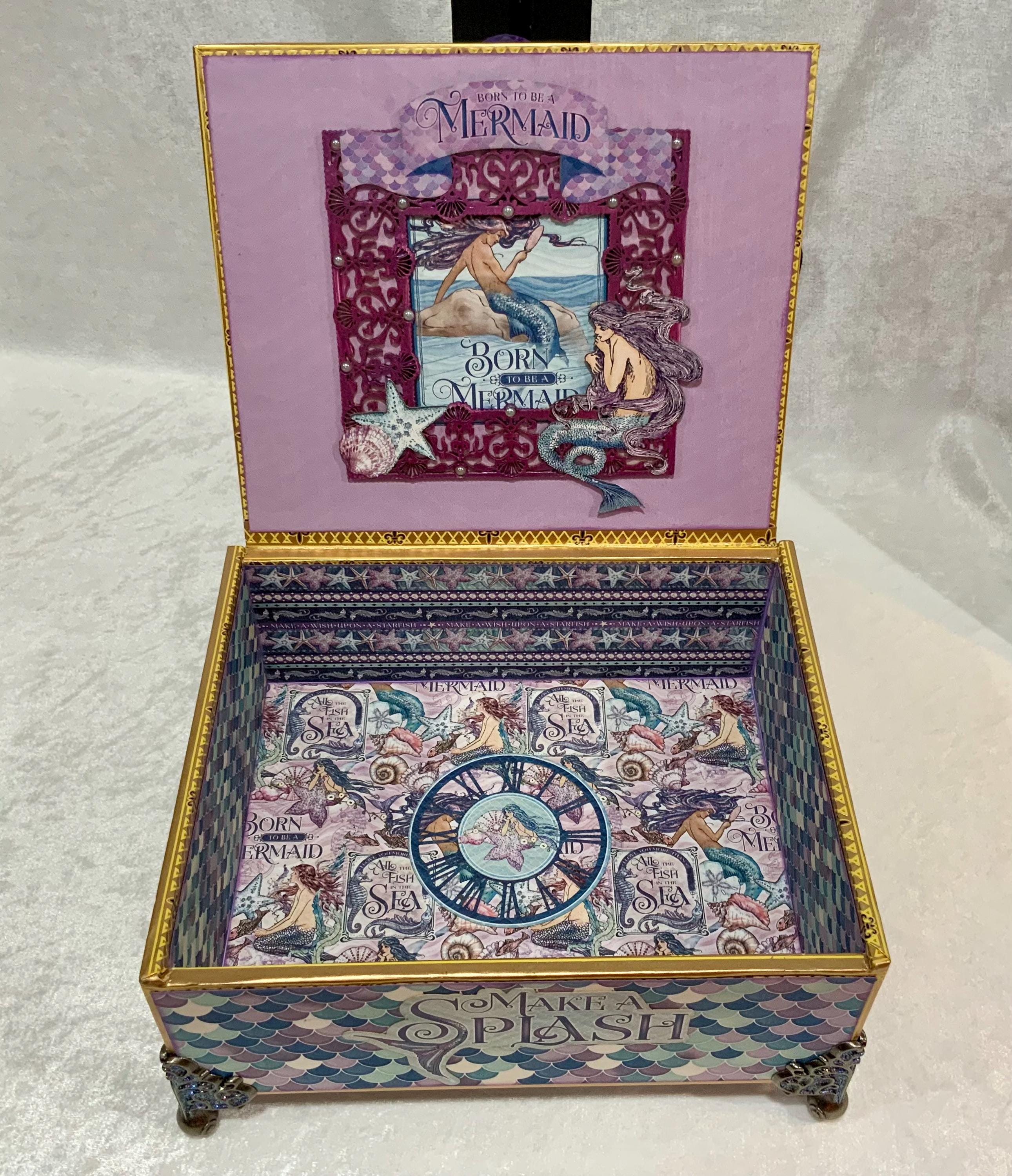 Dive into enchantment with this handcrafted mermaid-themed keepsake box, a magical treasure for anyone who dreams of the sea. Adorned in iridescent paper resembling mermaid scales, this one-of-a-kind box features a rich vintage illustration of underwater maidens, pearls, a faceted purple crystal knob, and elegant filigree metal feet.