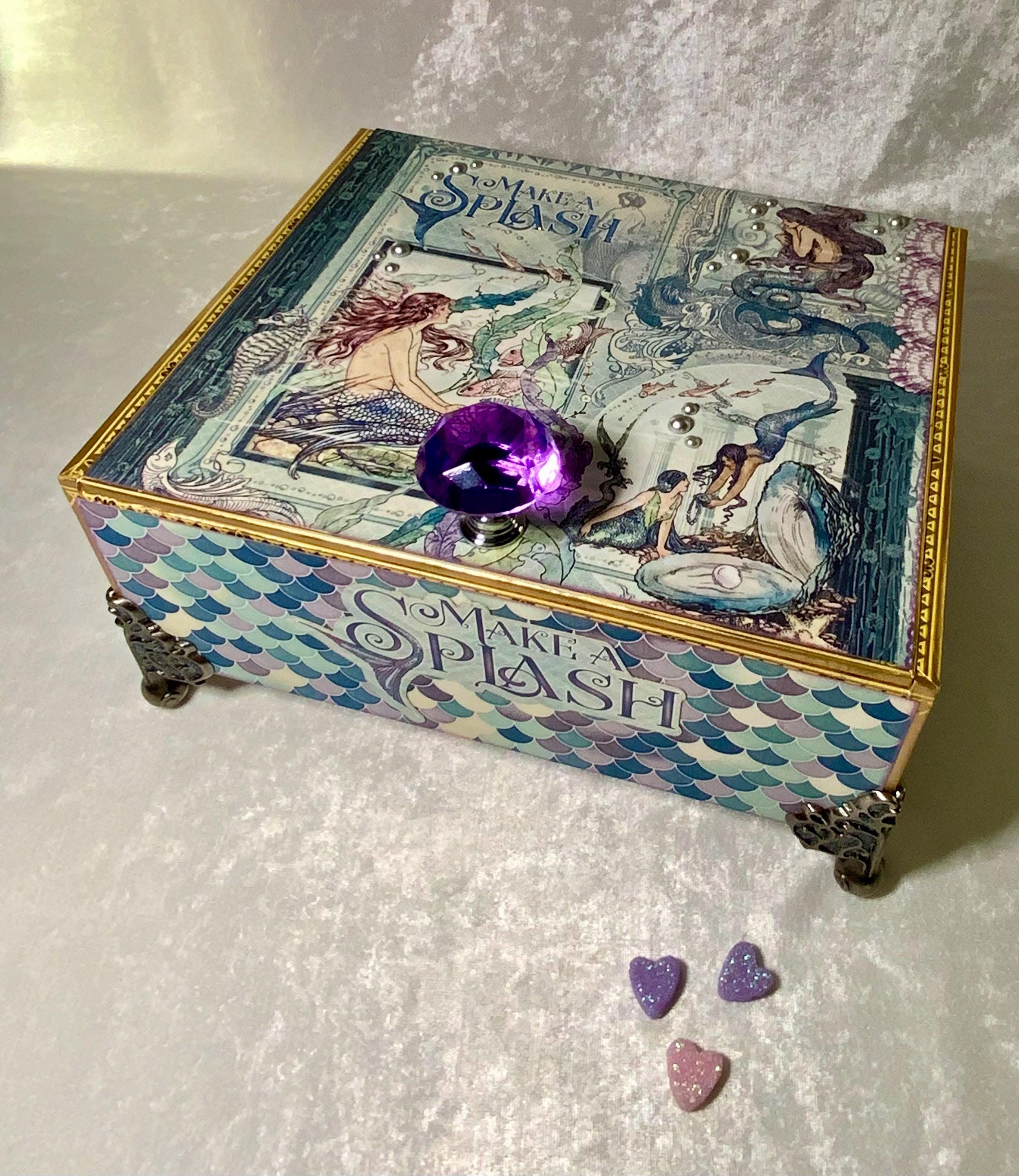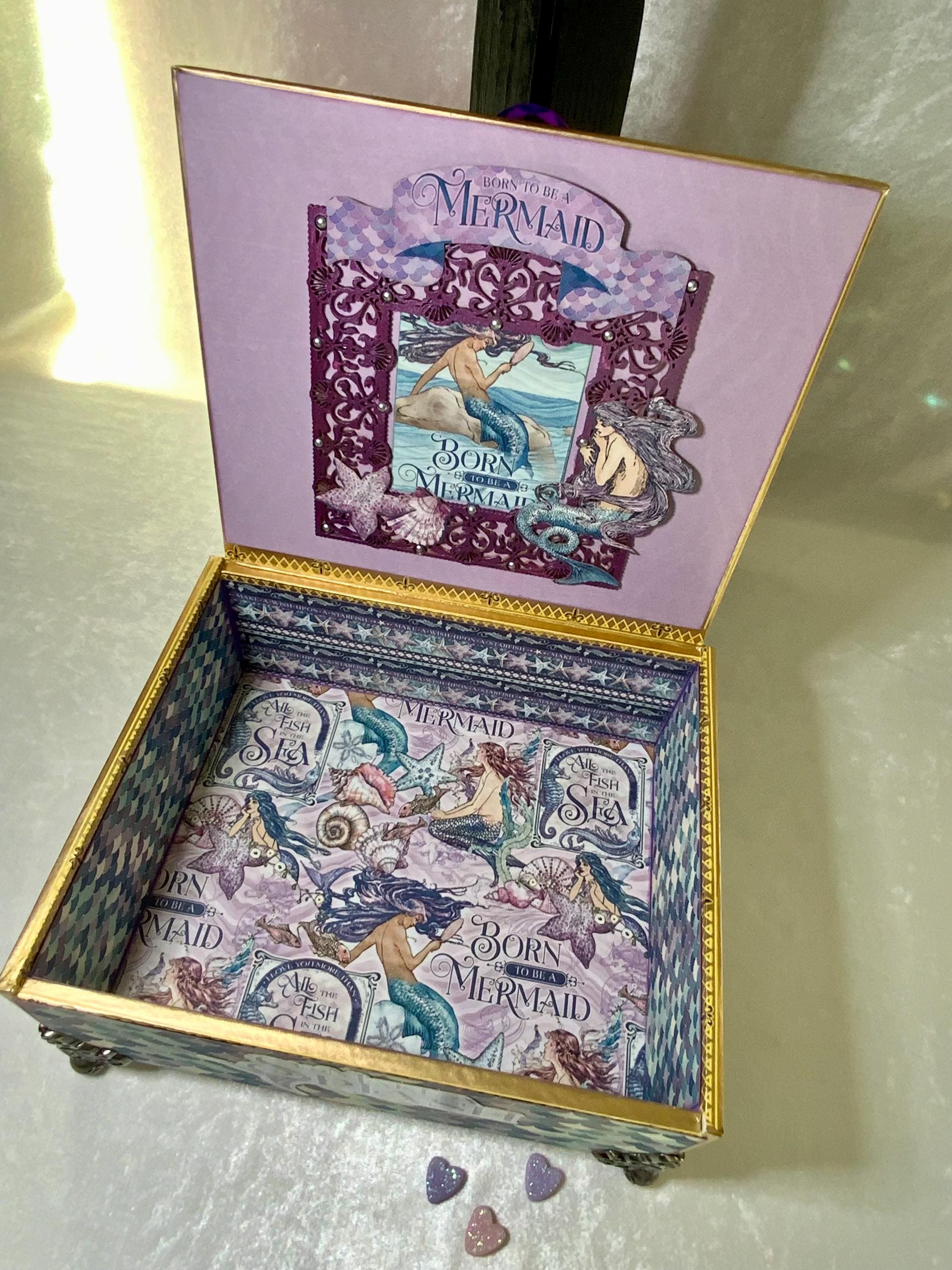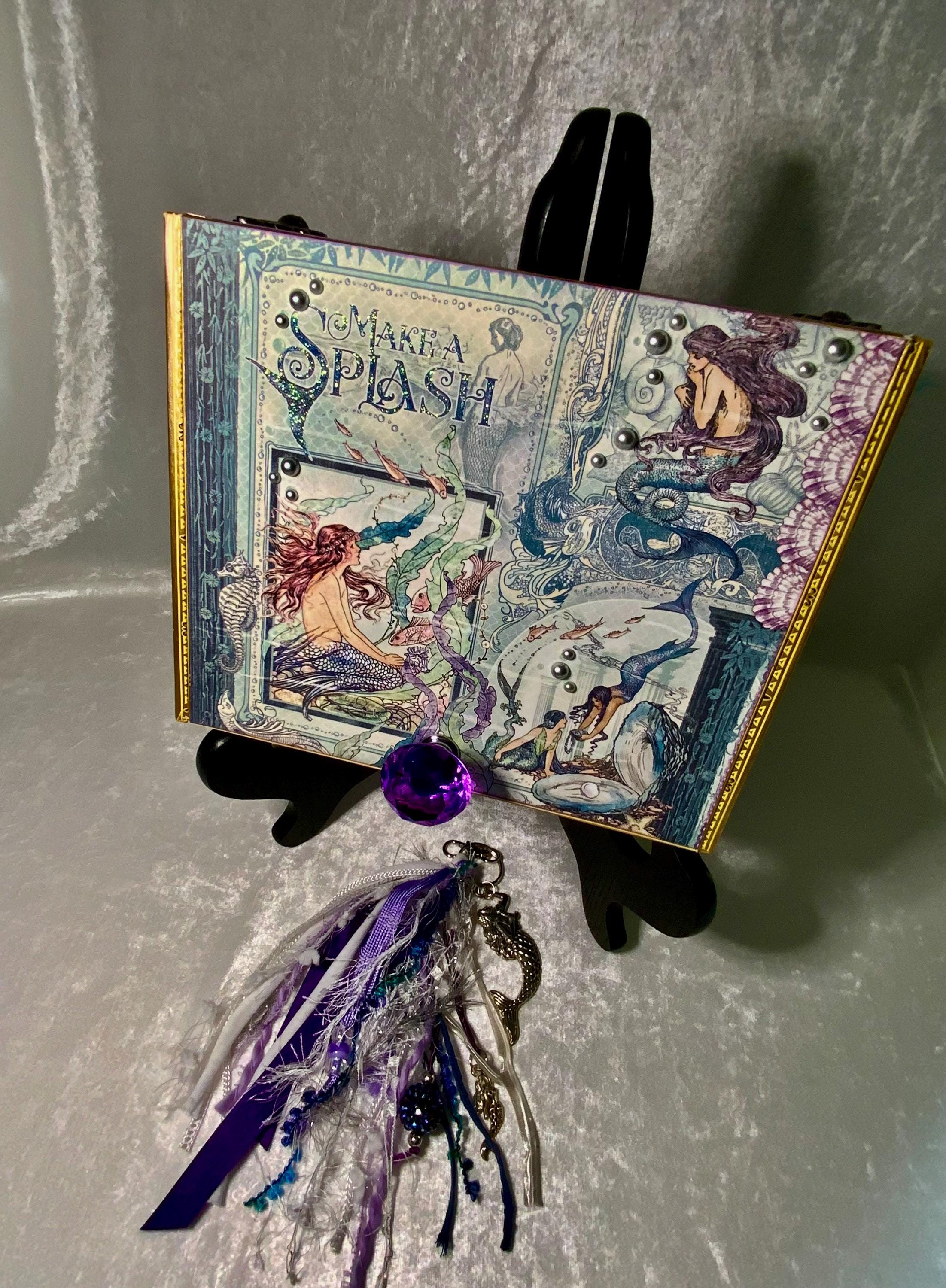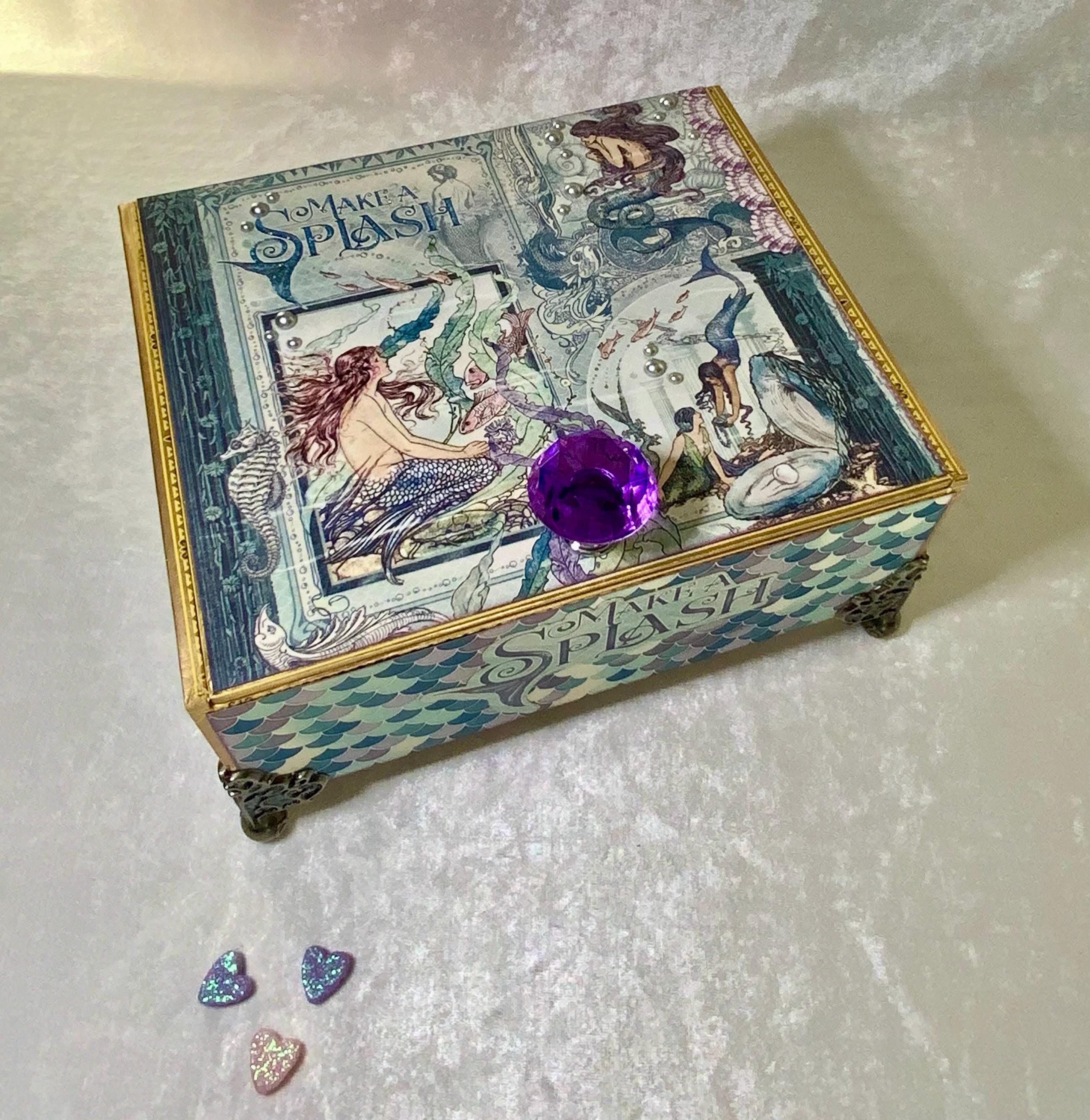 Dive into enchantment with this handcrafted mermaid-themed keepsake box, a magical treasure for anyone who dreams of the sea. Adorned in iridescent paper resembling mermaid scales, this one-of-a-kind box features a rich vintage illustration of underwater maidens, pearls, a faceted purple crystal knob, and elegant filigree metal feet.