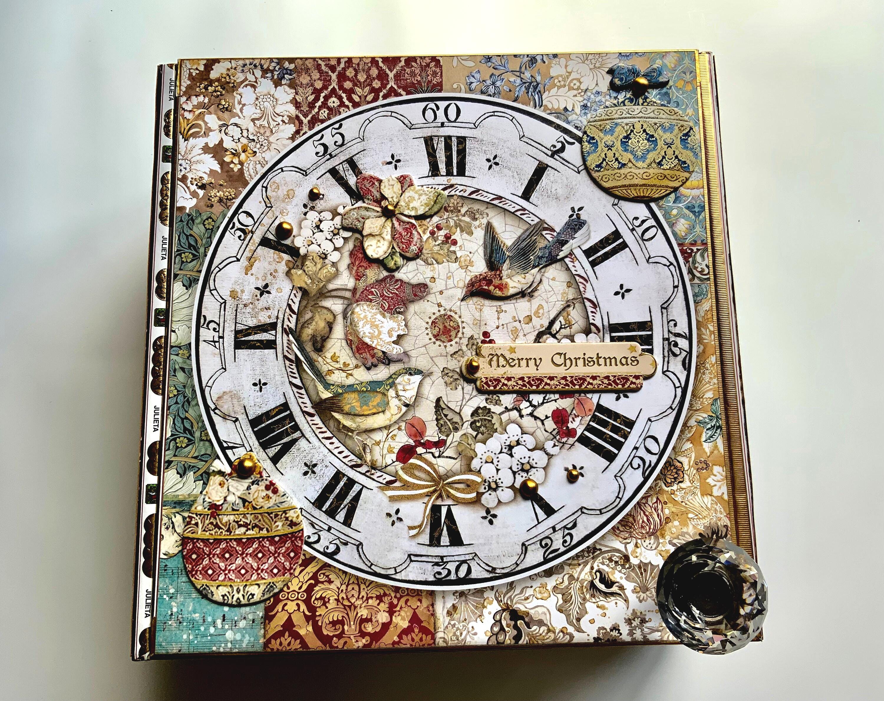 Ring in the magic of the season with this exquisite Christmas-themed embellished cigar box. The centerpiece is a grand vintage-style clock face layered with poinsettias, birds, and holly, all set against a richly patterned patchwork background in festive tones of red, gold, teal, and cream.