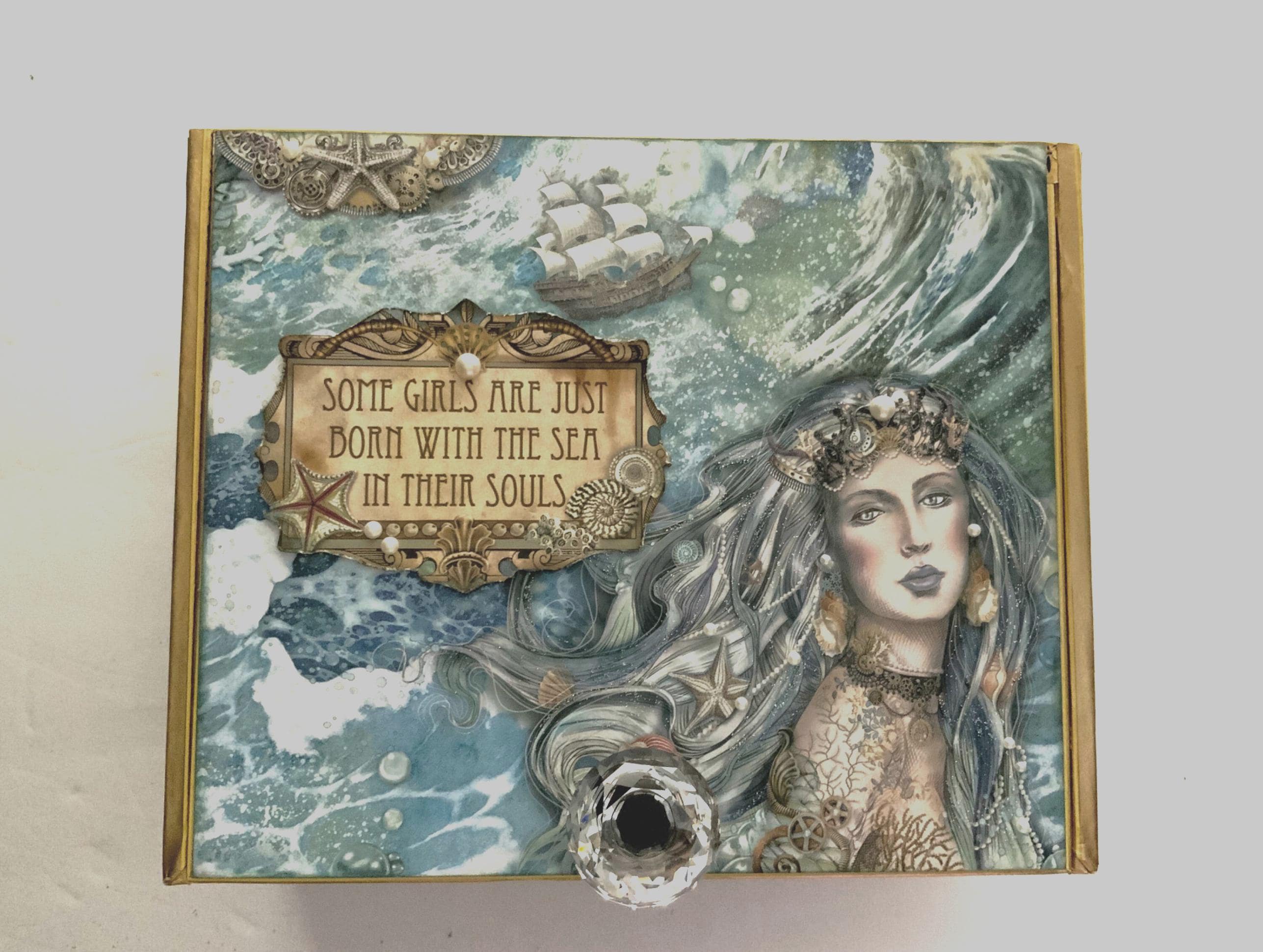 This ocean-inspired treasure box is a tribute to the wild, mystical beauty of the sea. Handmade from an upcycled cigar box, it features an ethereal mermaid with flowing hair, vintage ships, coral reefs, and the quote: “Some girls are just born with the sea in their souls.”