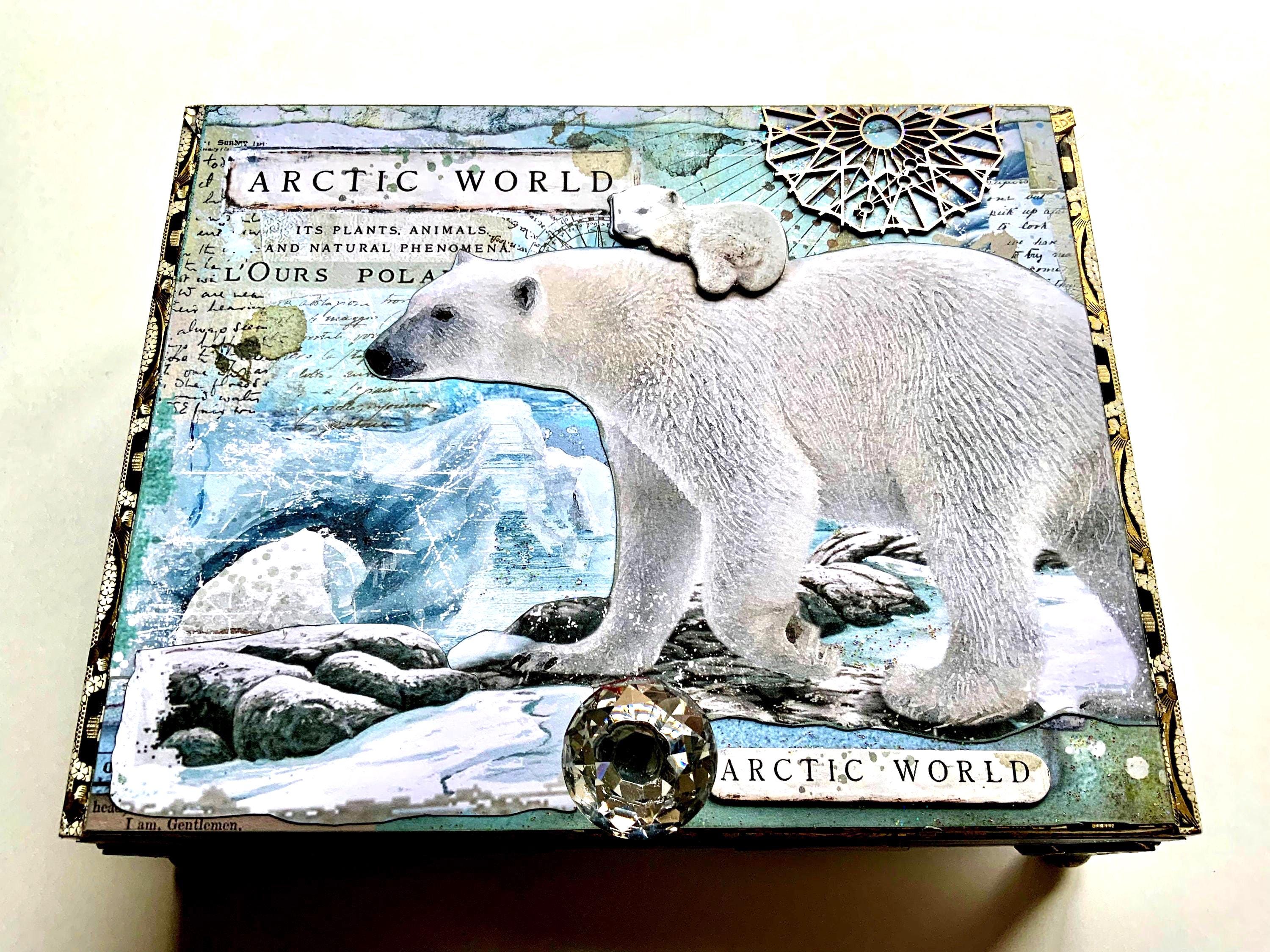 Bring the magic of the Arctic into your home with this one-of-a-kind decorated cigar box featuring majestic polar bears and adorable penguins. Carefully handcrafted using premium Stamperia papers, this upcycled Romeo y Julieta cigar box has been transformed into a winter wonderland.