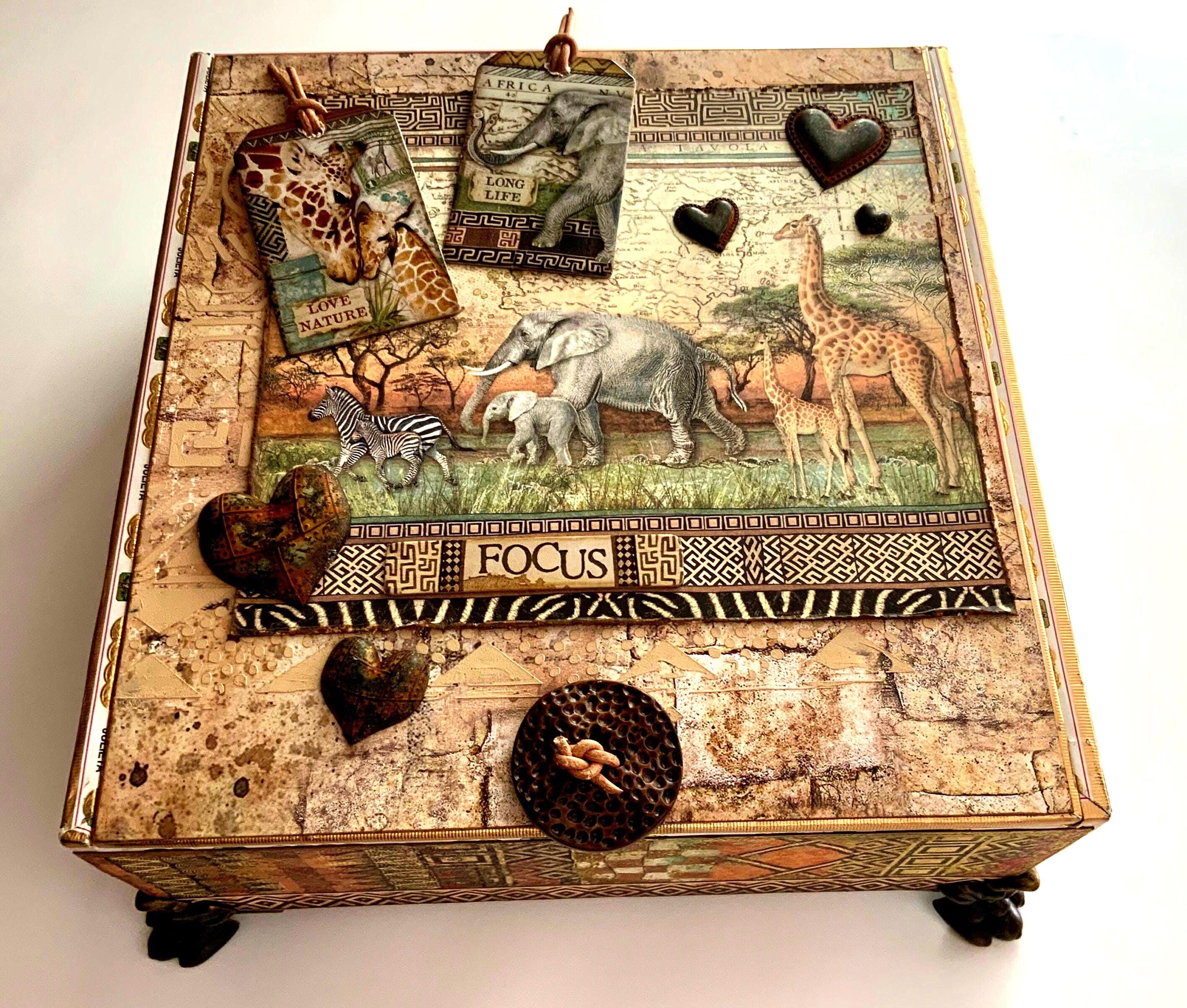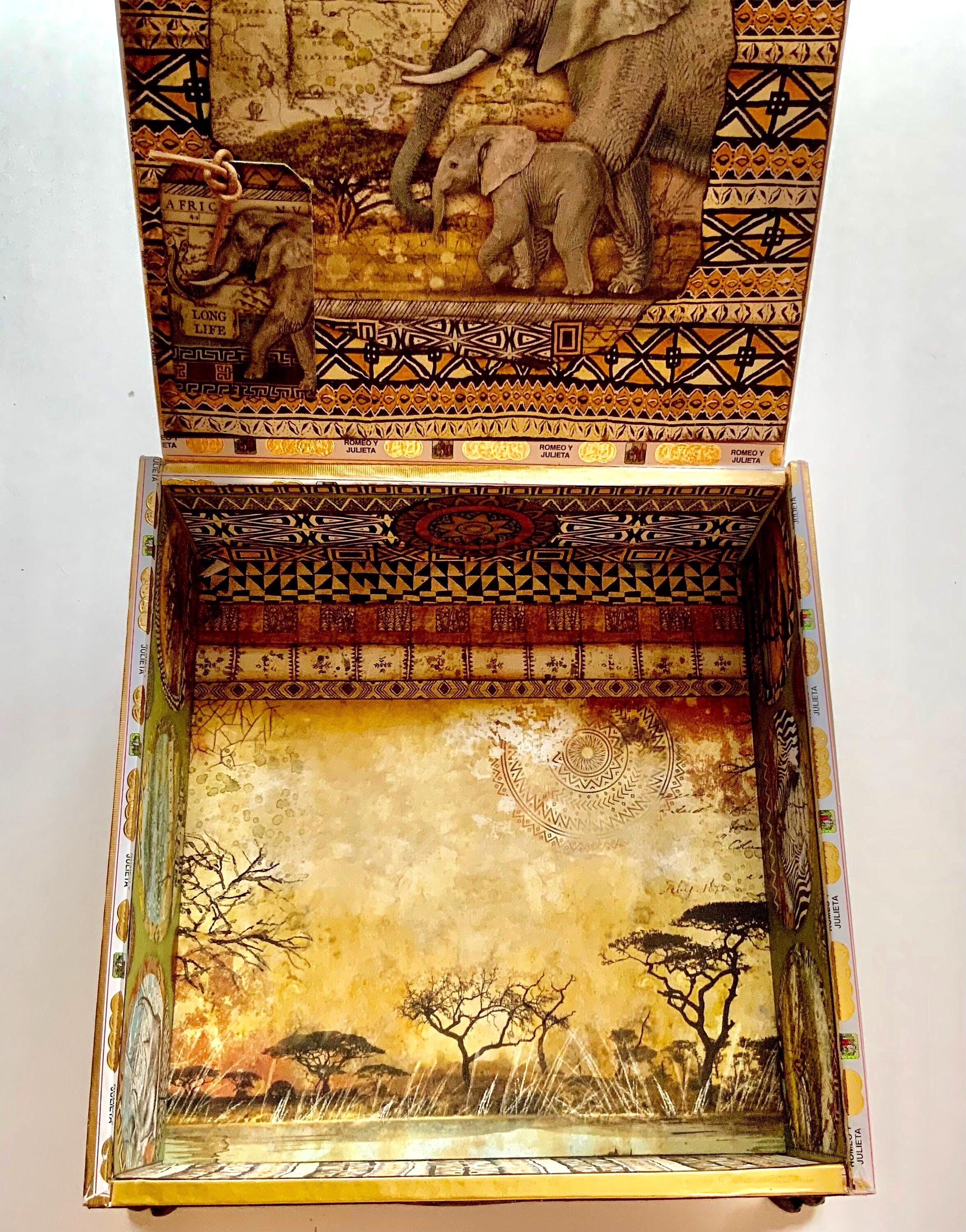 Safari Wildlife Decorated Cigar Box – Handmade Savana Keepsake Storage Box – African Animals, Lion, Elephant, Giraffe – Free Shipping