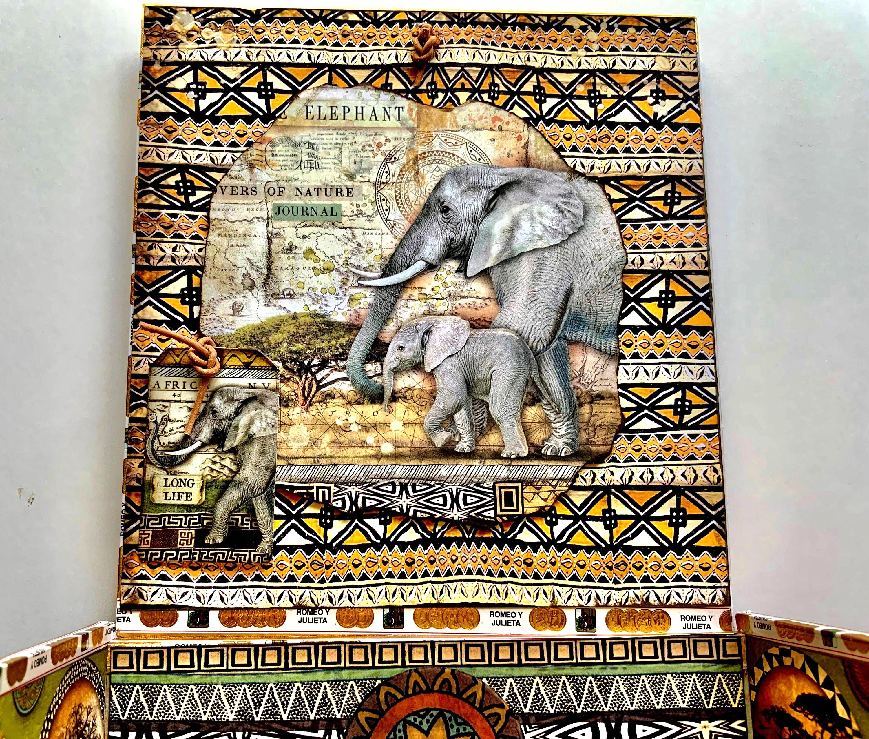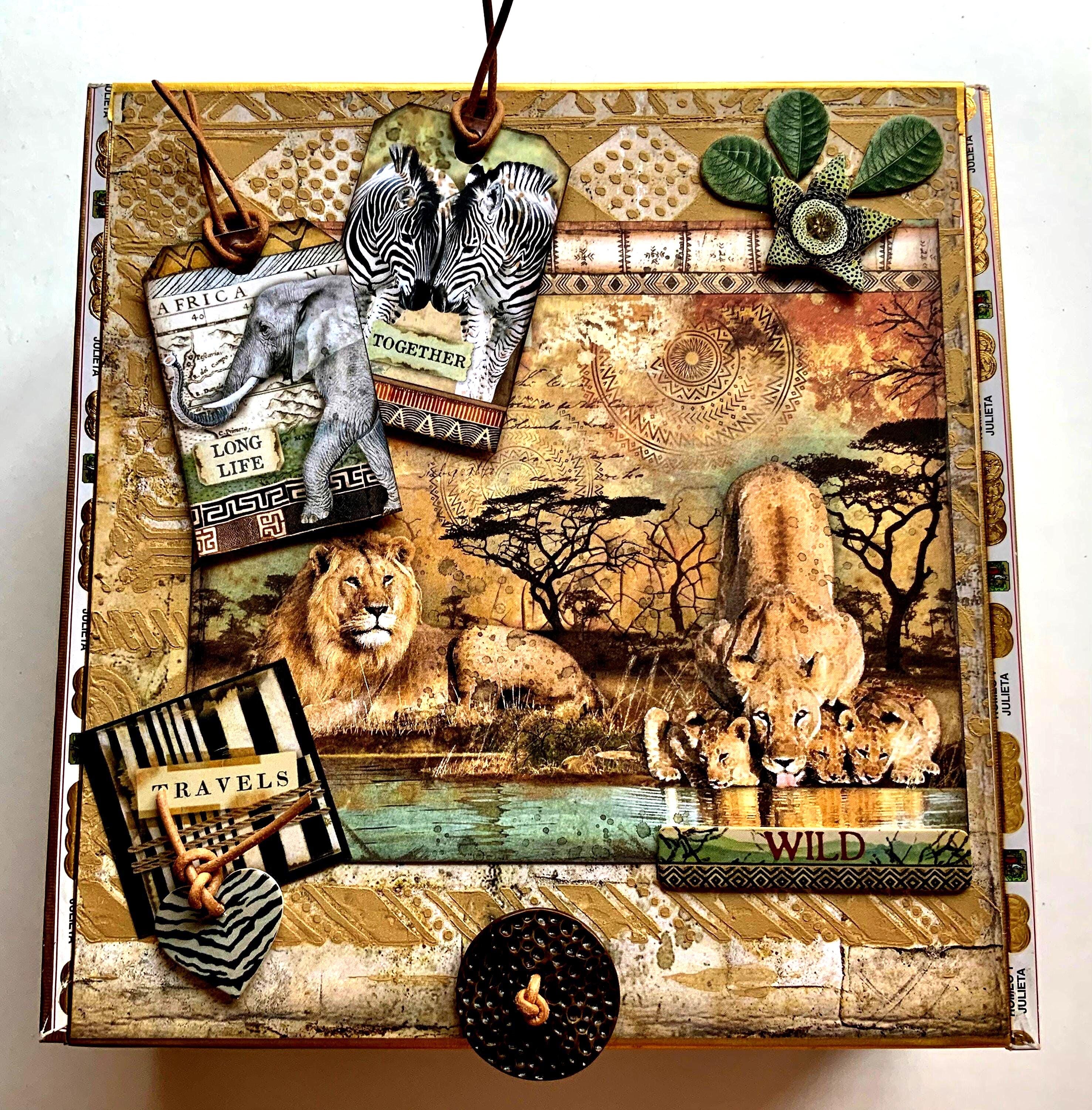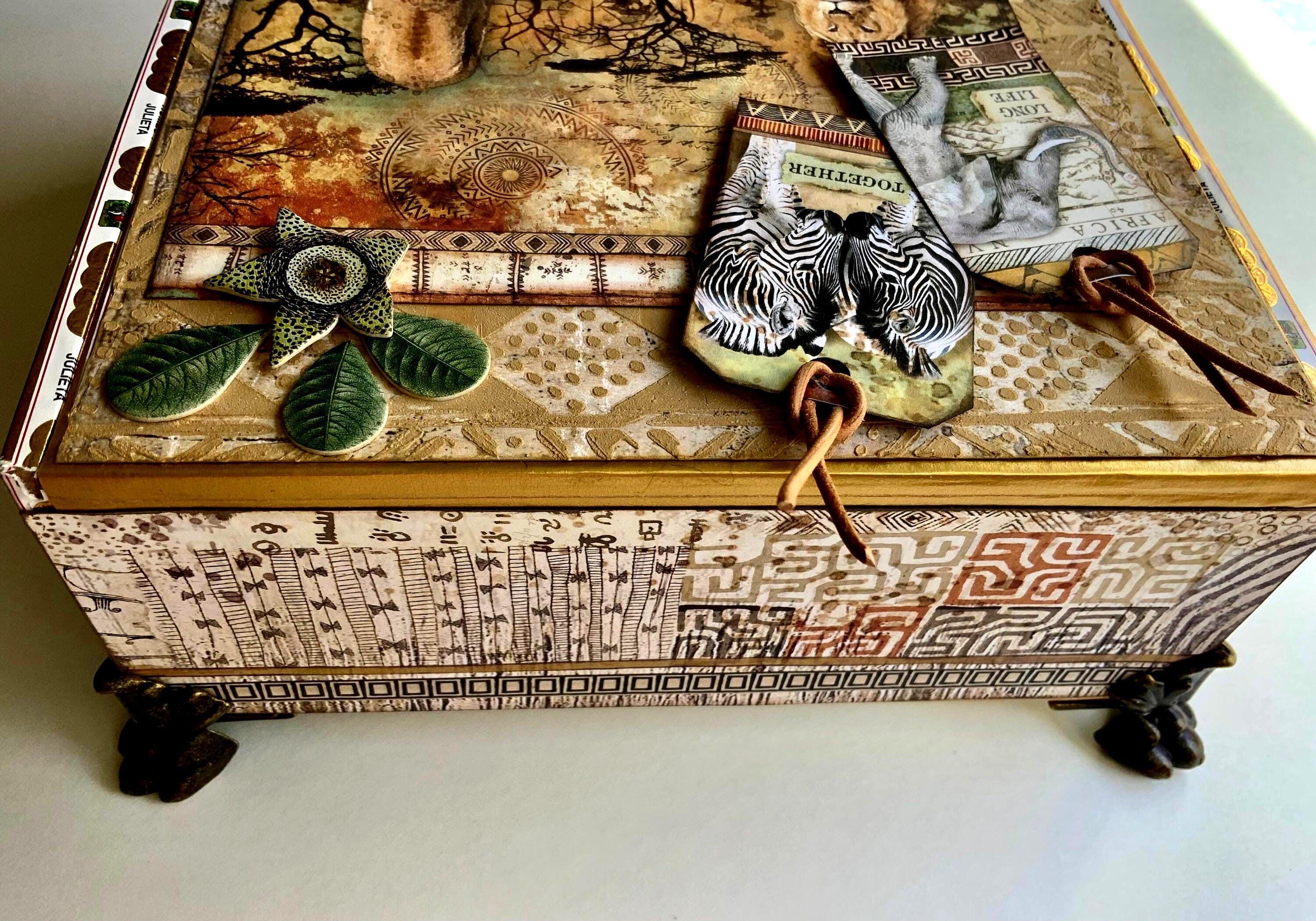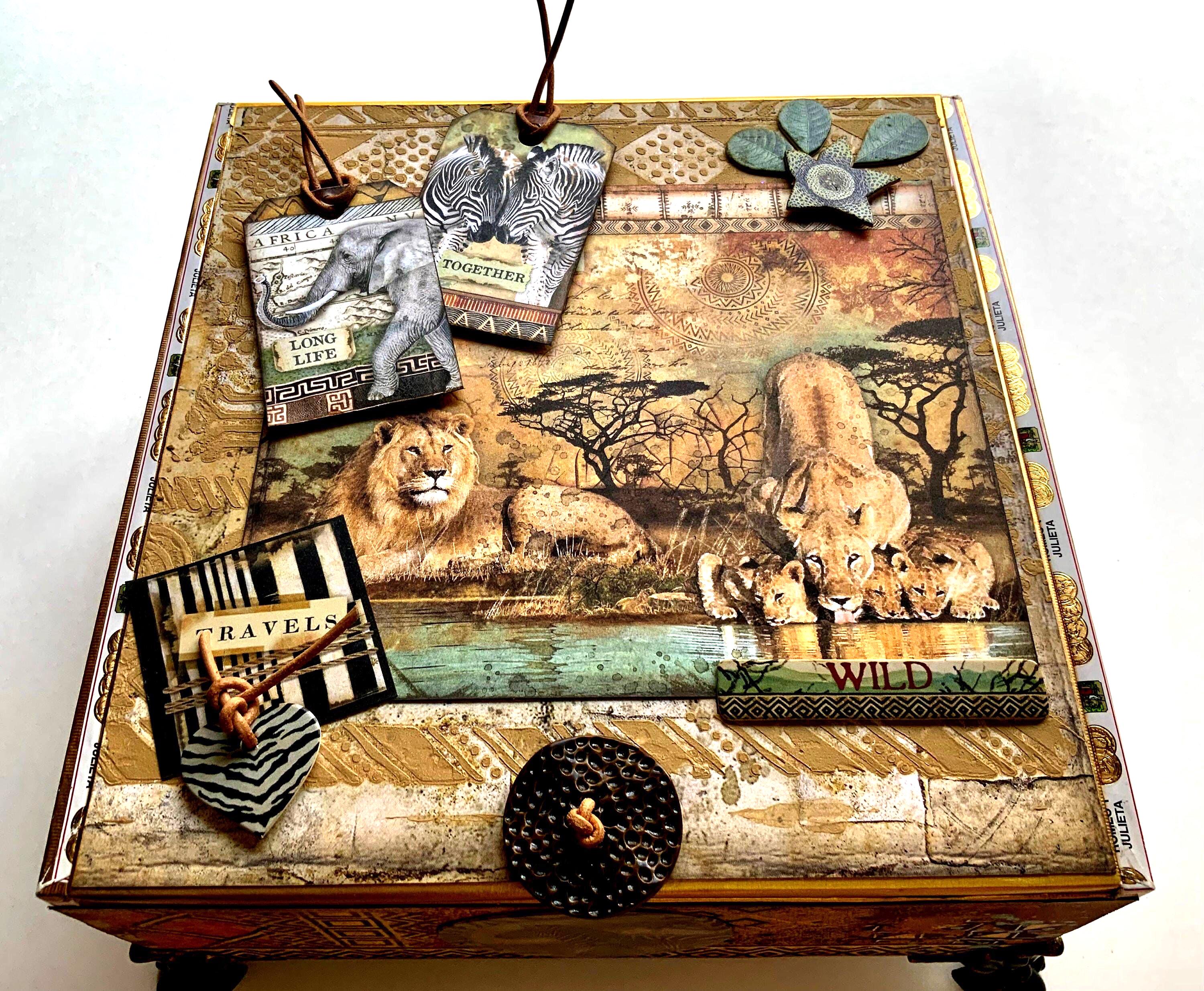 Bring the beauty of Africa’s wild landscapes into your home with this Stamperia Savana decorated cigar box. Handmade from an upcycled cigar box, it is richly adorned with safari animals, tribal motifs, and layered embellishments. The interior continues the theme with savanna scenes, making it as beautiful inside as it is outside.