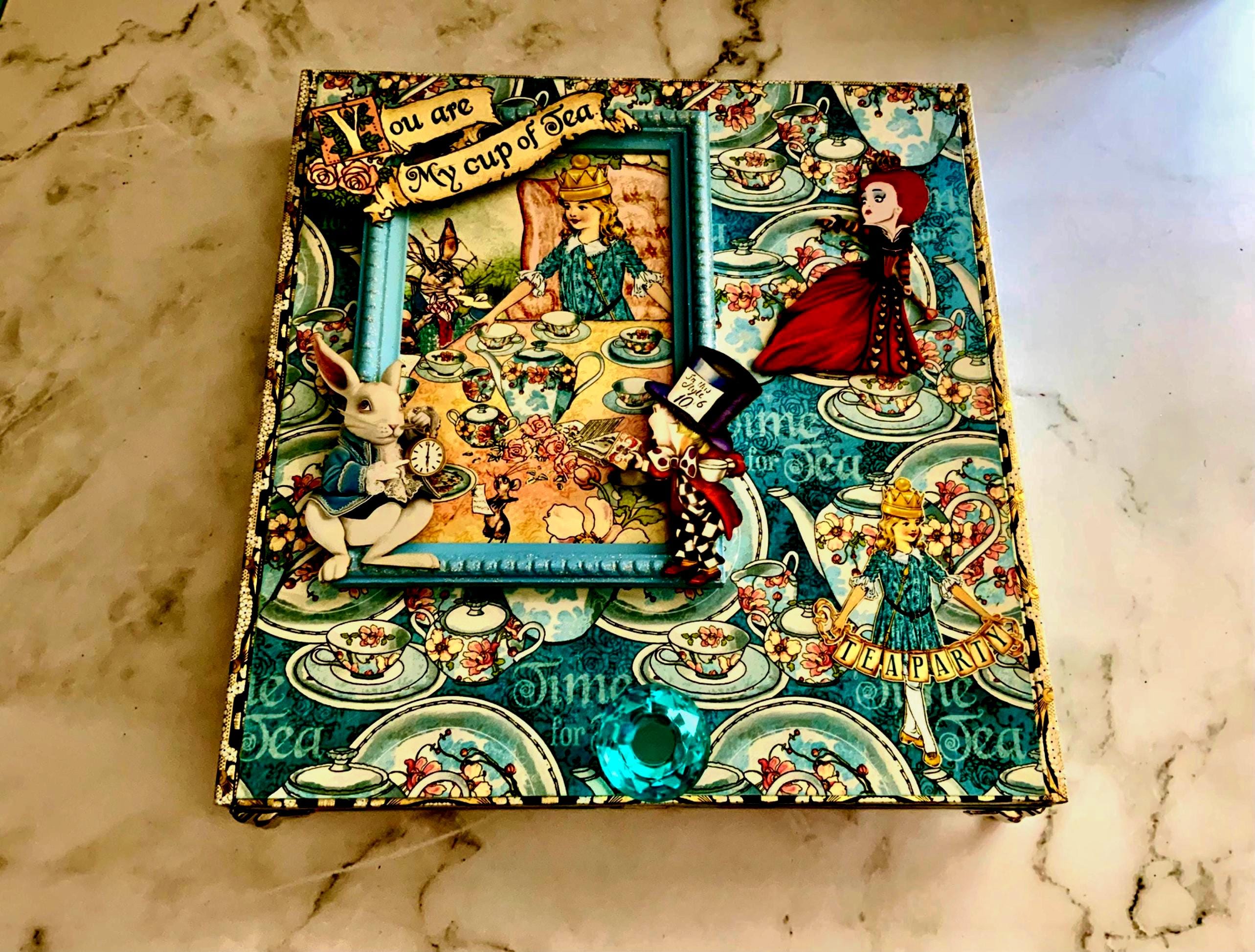 Lg Alice in Wonderland Decorated Cigar Box – Handmade Tea Party Jewelry Box – Upcycled Whimsical Keepsake Gift, Alice Tea Party Altered Box