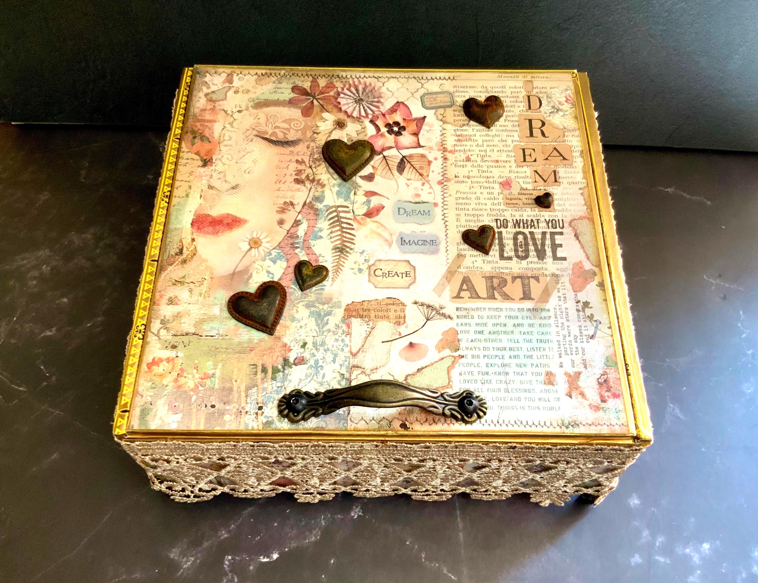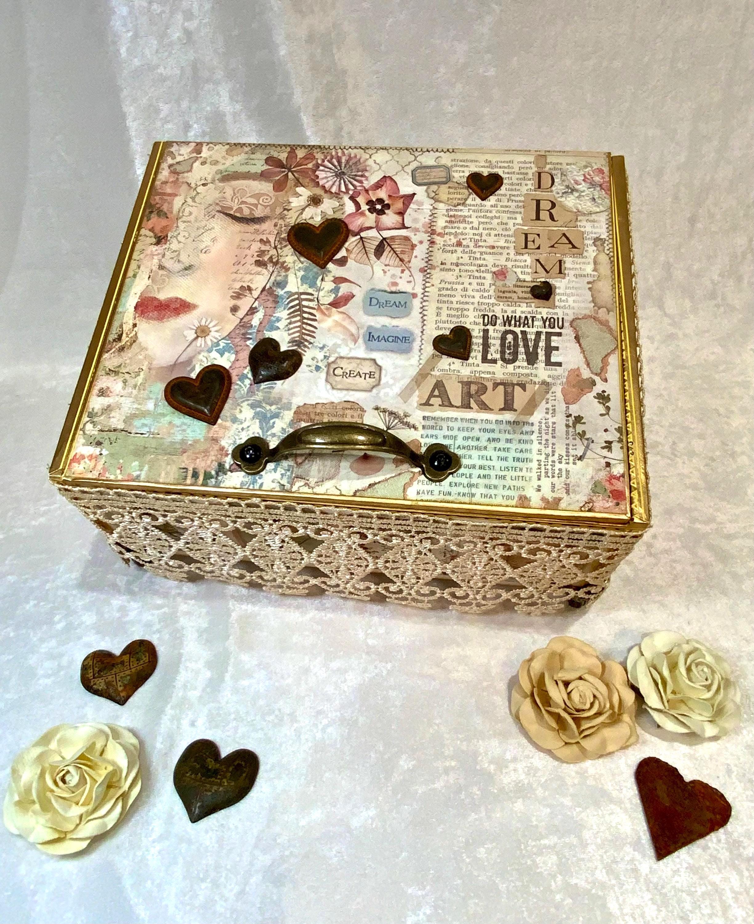 Dreamy Art-Inspired Decorated Cigar Box – Mixed Media Memory Box with Lace, Hearts & Vintage Collage