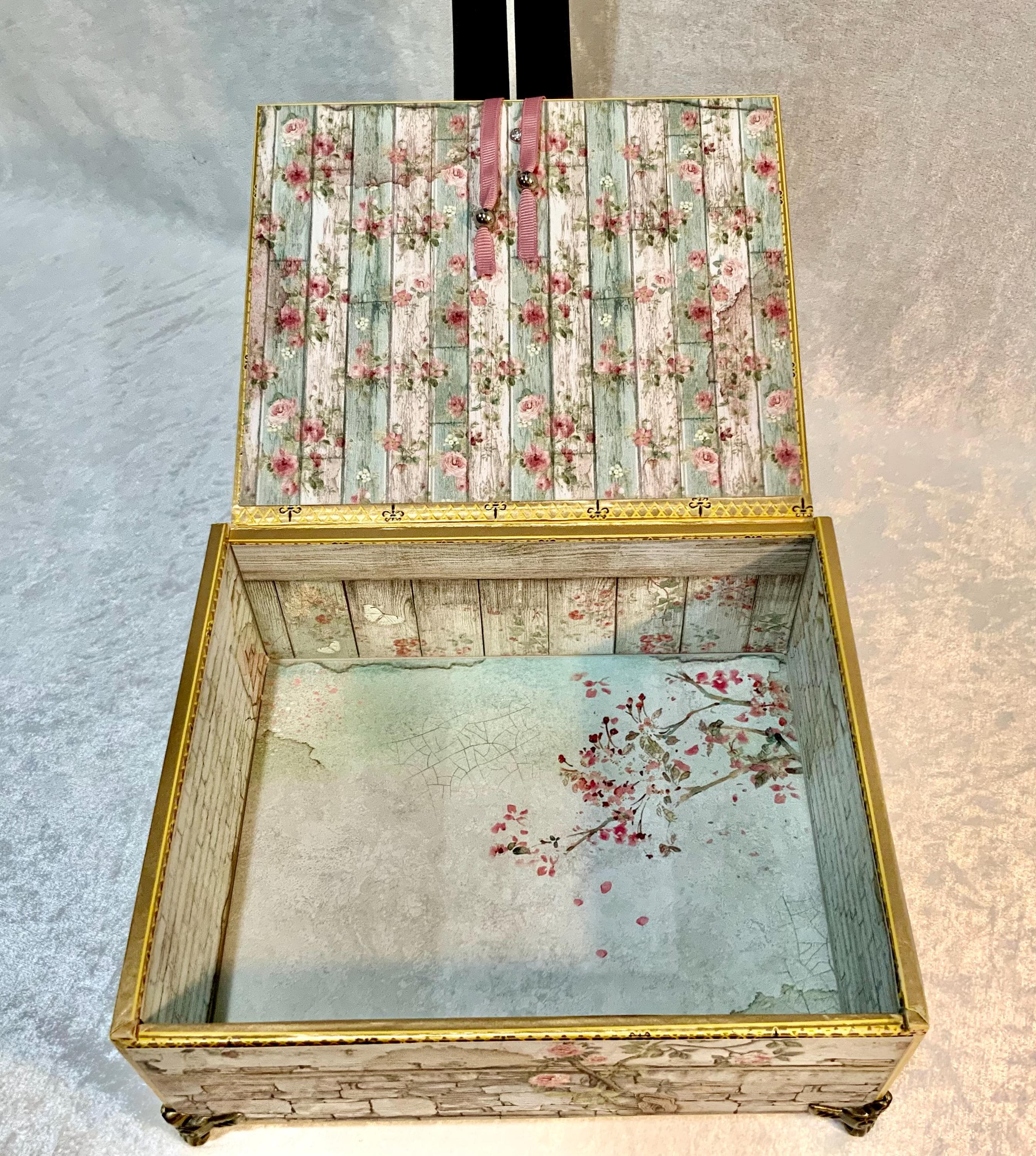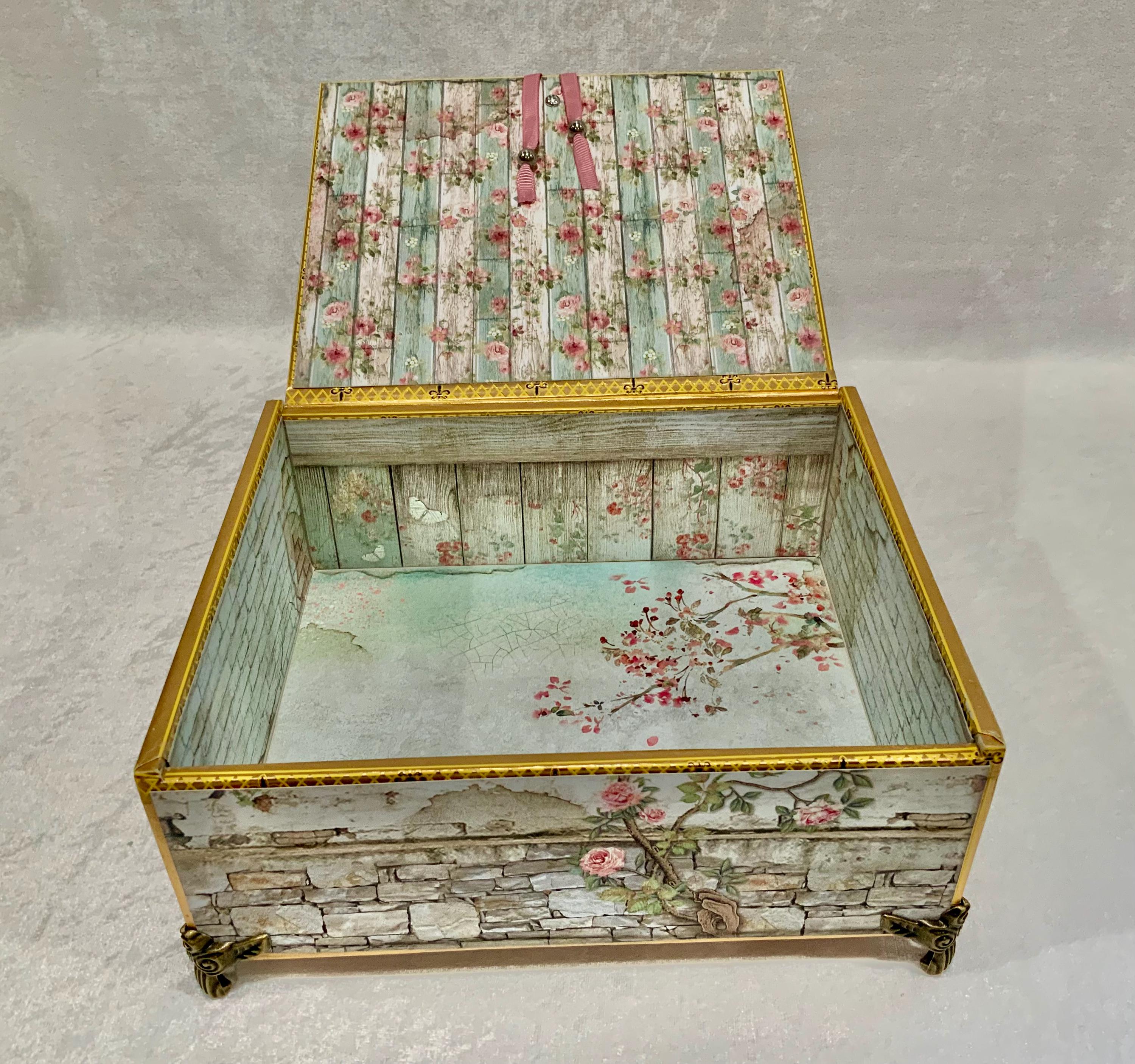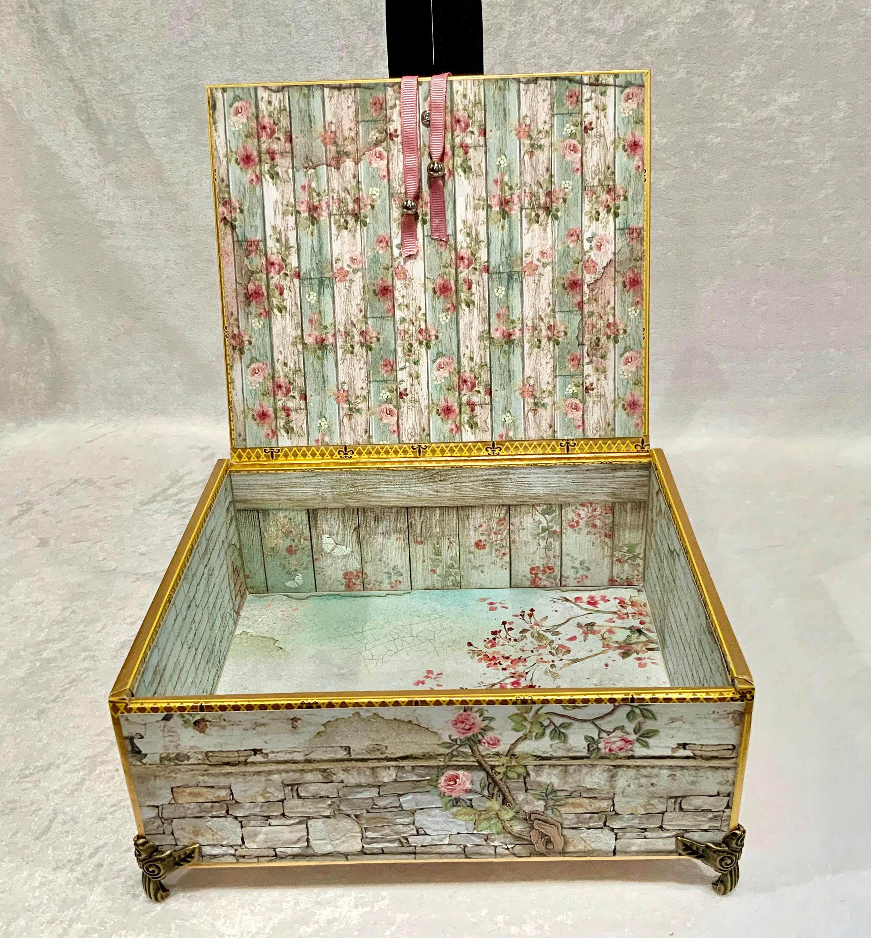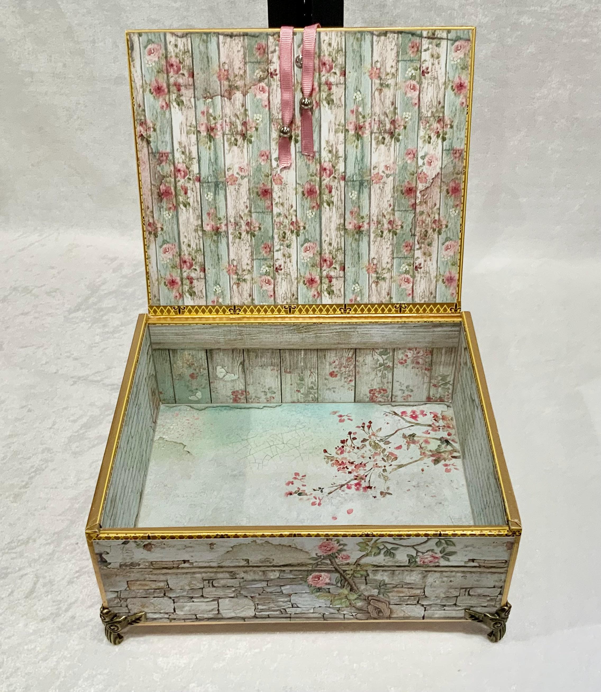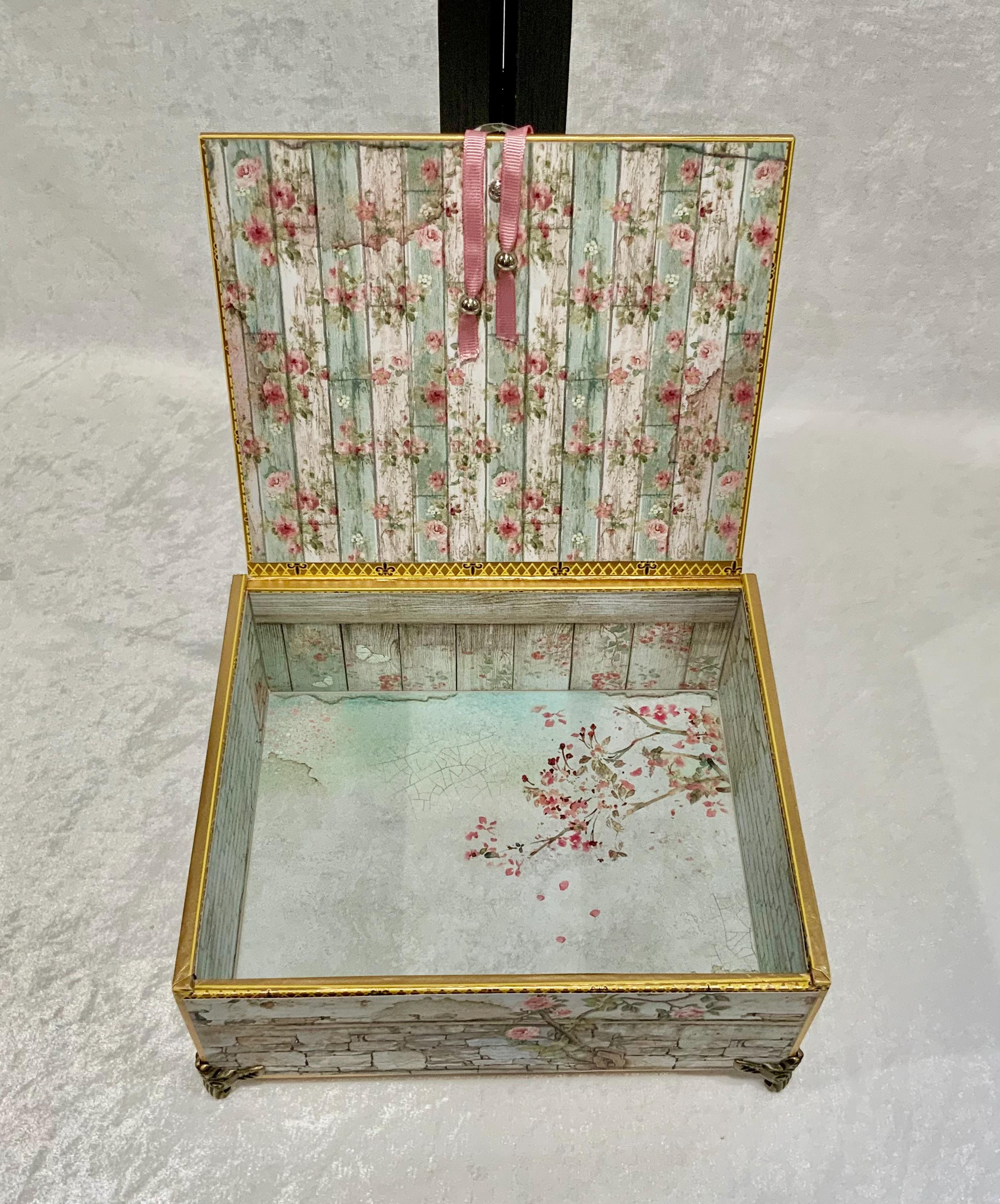 The interior is just as delightful, lined with weathered floral wood textures and soft pastel tones—perfect for storing treasured items, love letters, keepsakes, or jewelry.
